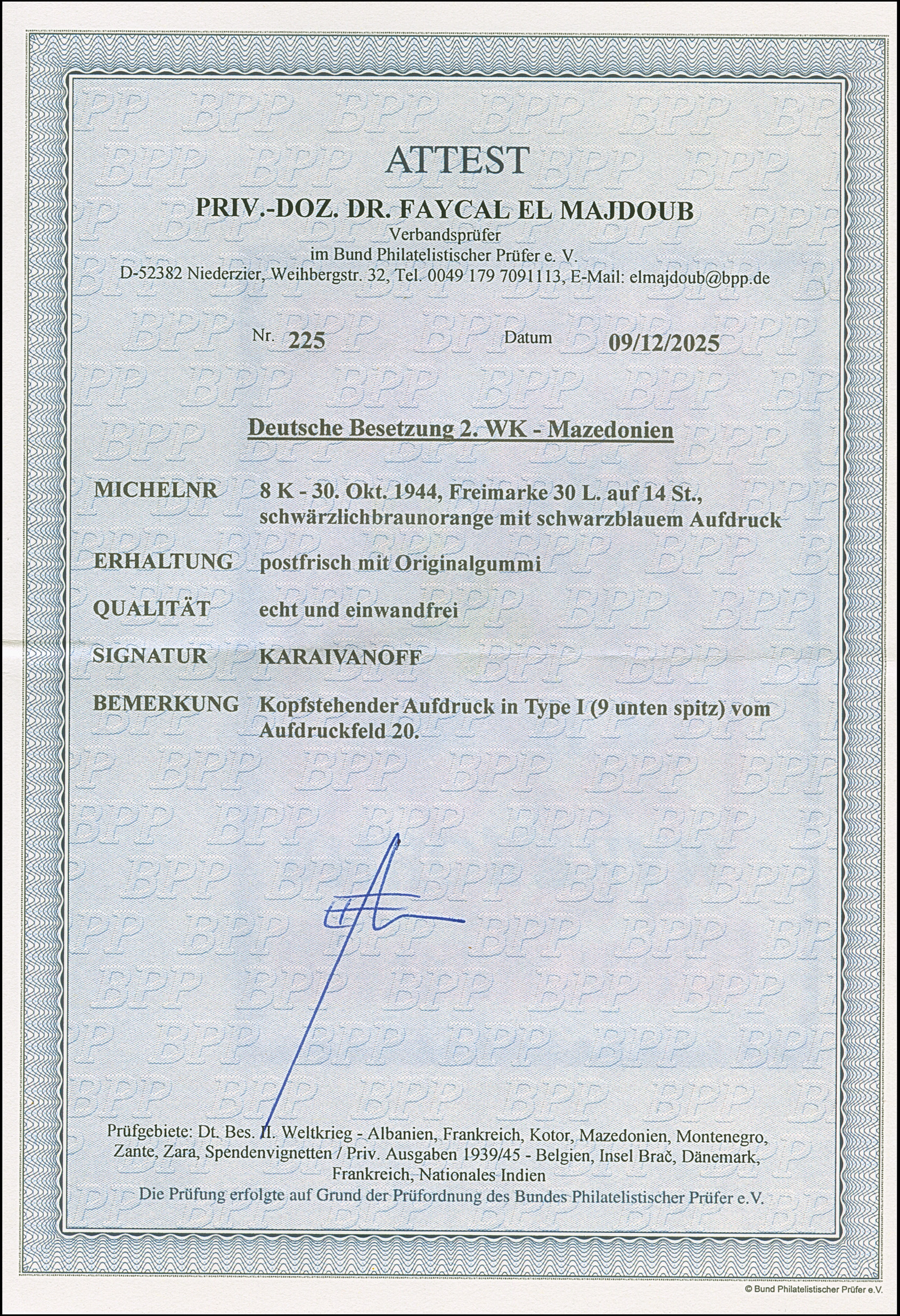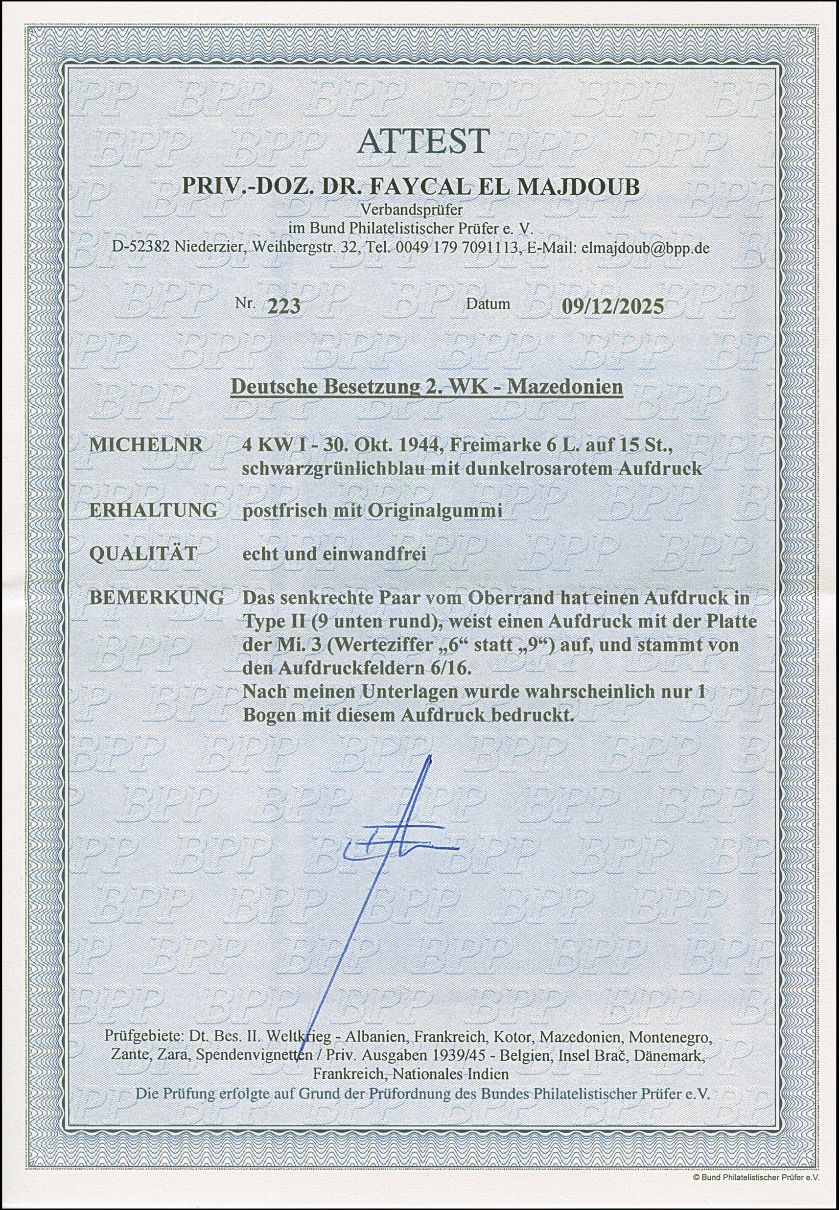 9 L. auf 10 St. mit Aufdruck in Type II mit der Platte der 9 L. auf 15 St. (Wertziffer “9” statt “6”), postfrisch, in tadelloser Erhaltung, Bleistiftsignatur und Besitzter-Zeichen und Fotoattest Dr. EL Majdoub BPP (2025)