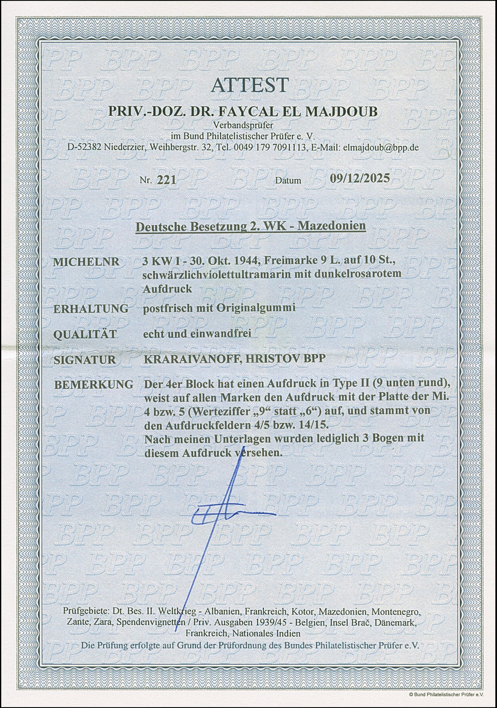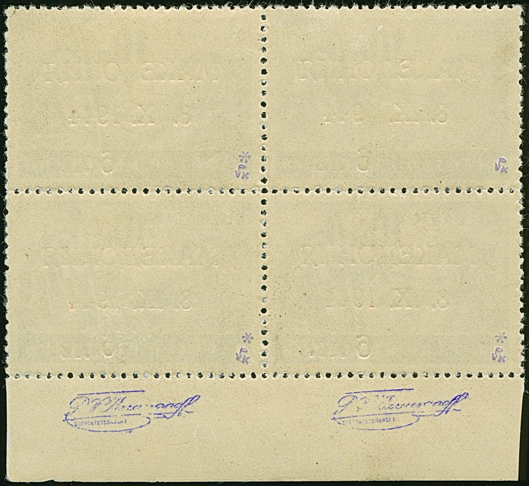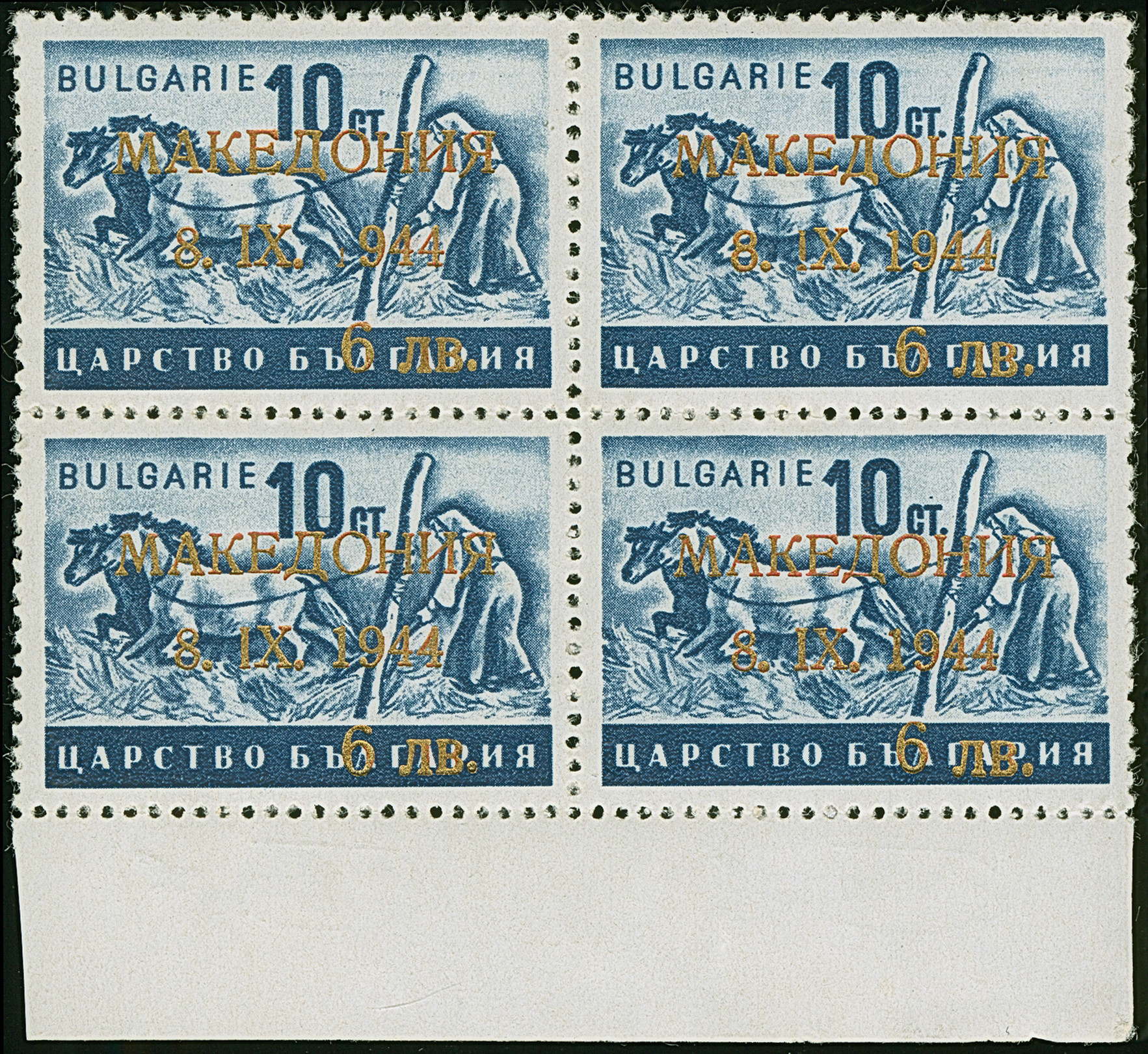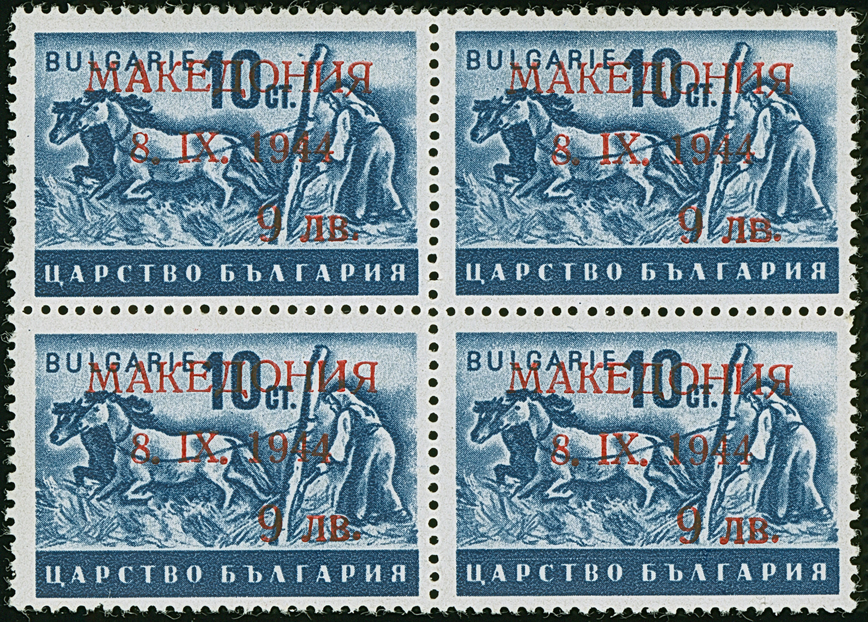 9 L. auf 10 St. mit Aufdruck in Type II mit der Platte der 9 L. auf 15 St. (Wertziffer “9” statt “6”) im Viererblock (Aufdruckfelder 4/5 + 14/15), postfrisch, in tadelloser Erhaltung. Einheiten dieser seltenen Aufdruck-Abart sind außerordentlich selten, sign. Kraraivanoff und Hristov BPP sowie Fotoattest Dr. El Majdoub BPP (2025)