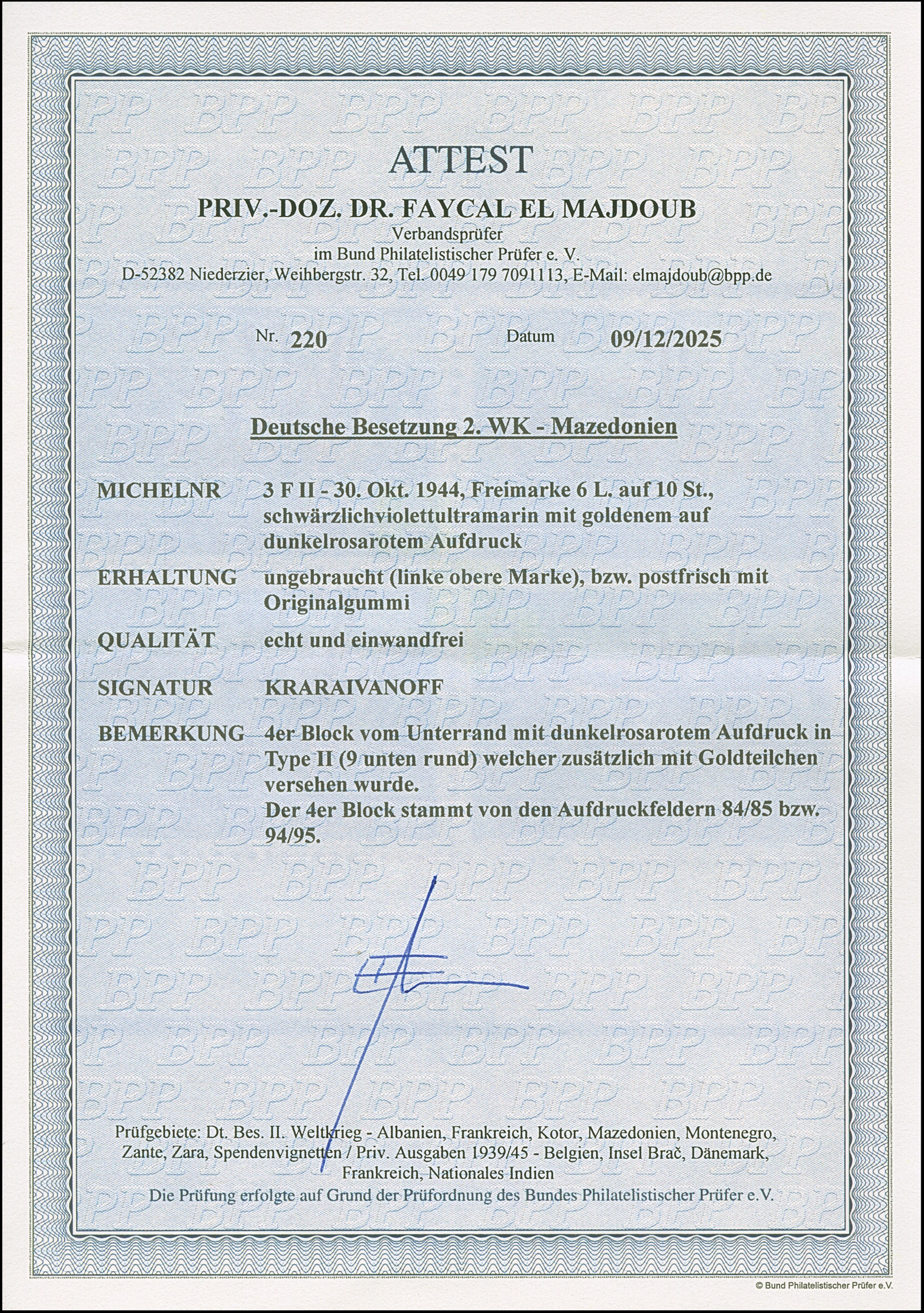 1943, Verwaltungsausschuss 10 L., sauber ungebraucht. Einwandfrei. Signiert Dr. Oertel und Richter, Fotoattest Prof. El Majdoub BPP (2025)
