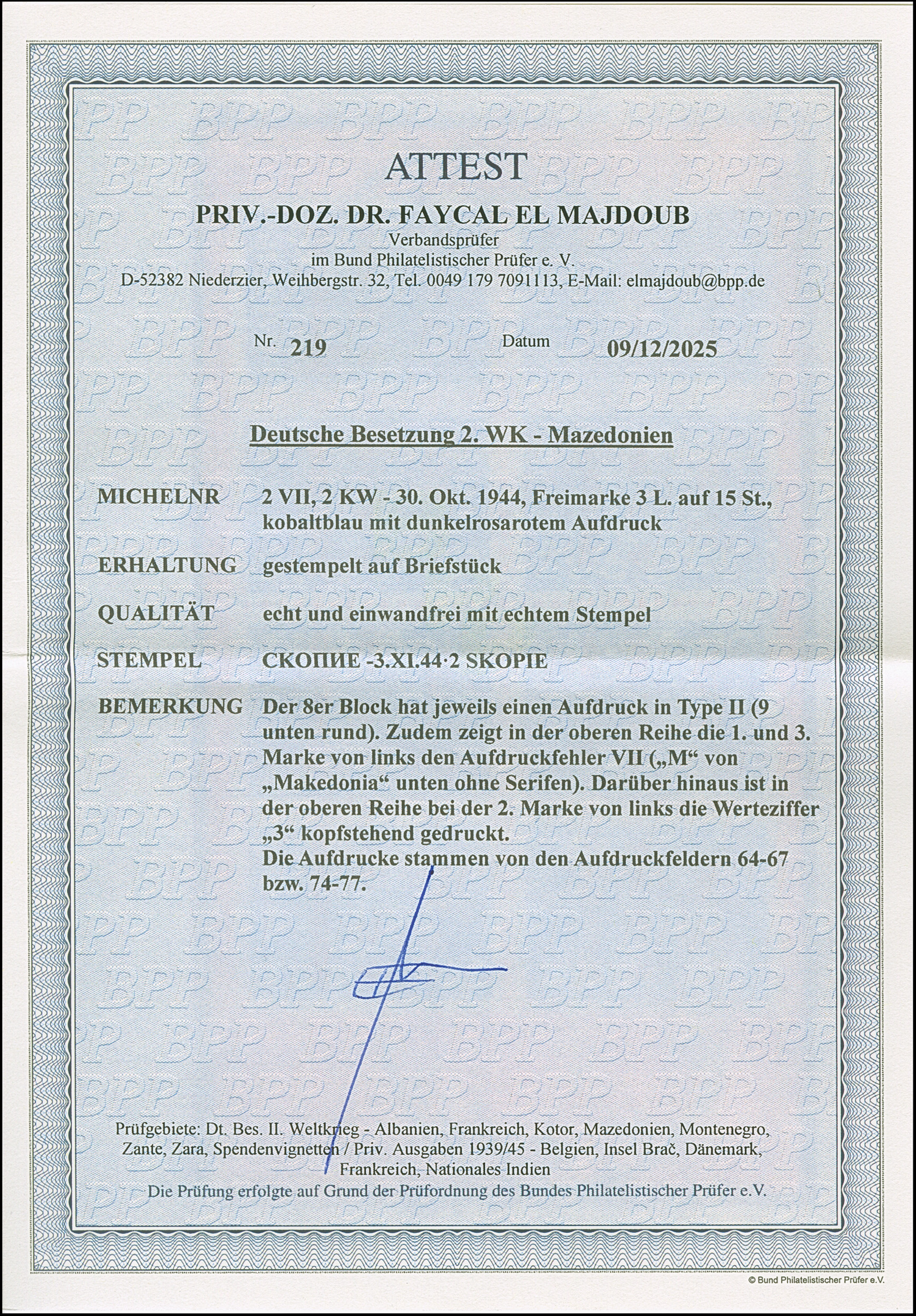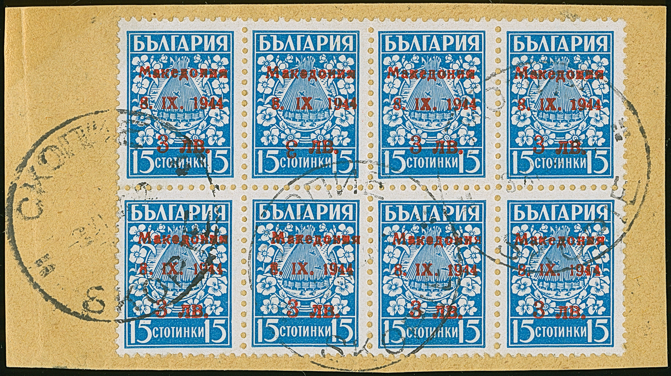 3 L. auf 15 St. mit Aufdruck in Type II im waagerechten 8er-Block, dabei haben die 1. und 3. Marke von links in der oberen Reihe den Aufdruckfehler “M von Makedonia unten ohne Serifen" und die 2. Marke von links die Aufdruckabart ”Wertziffer 3 kopfstehend". Jeweils mit Stempel “SKOPIE 3.XI.44” auf Briefstück und in einwandfreier Erhaltung. Eine in dieser Kombination nicht häufige Einheit, Fotoattest Dr. El Majdoub BPP (2025)
