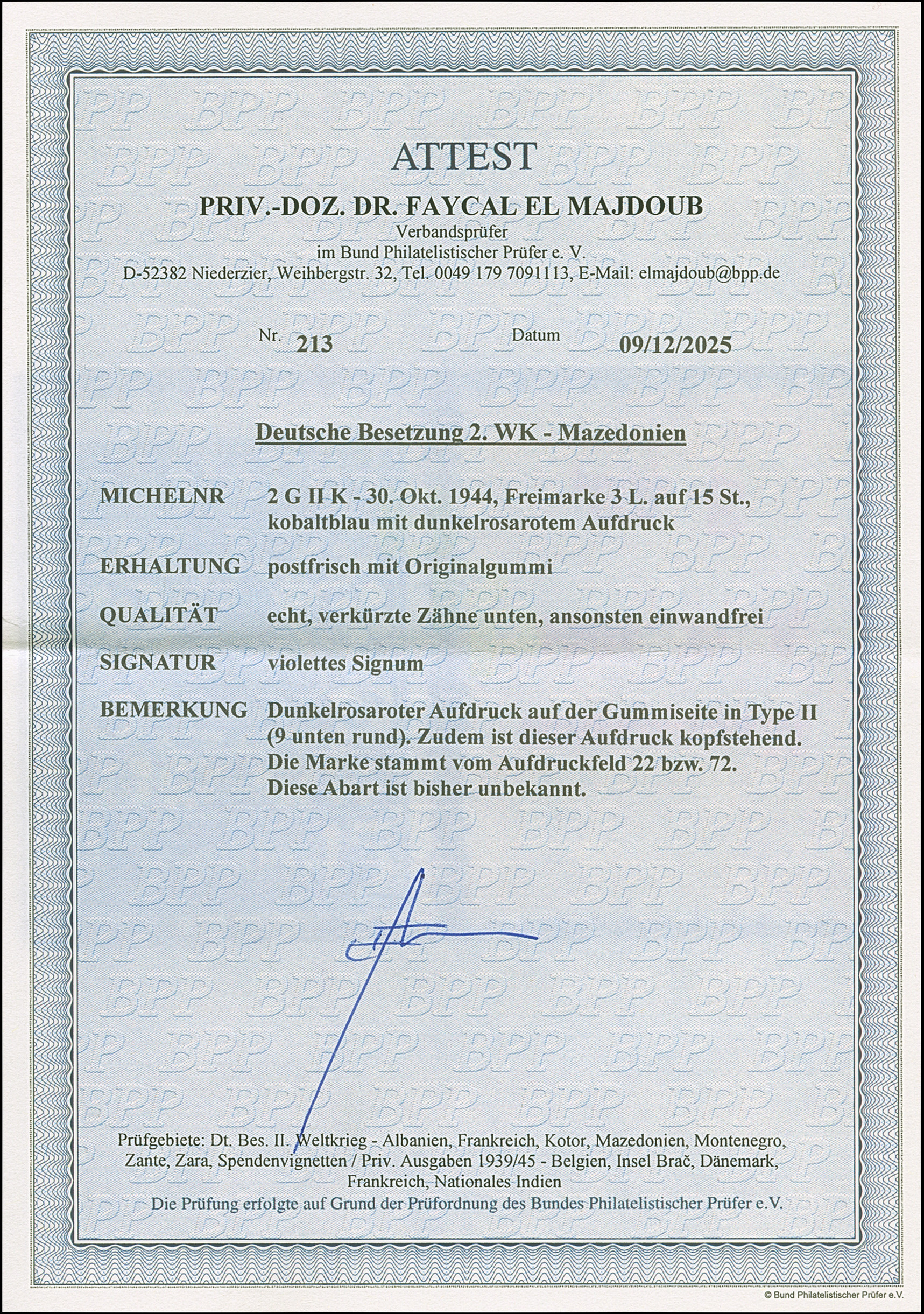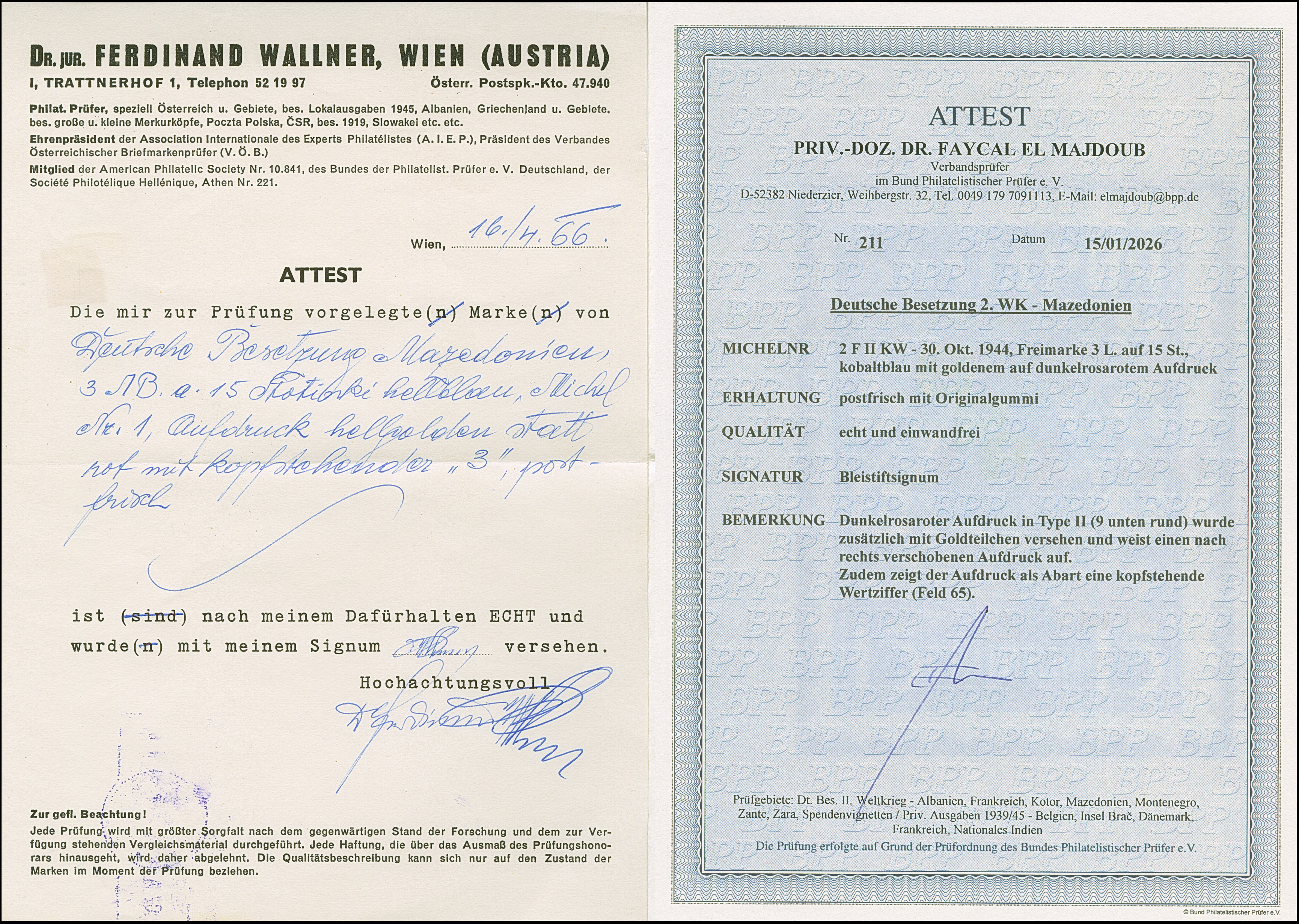 3 L. auf 15 St. mit Gold auf dunkelrosarotem, leicht nach rechts verschobenen Aufdruck in Type II mit zusätzlicher Aufdruck-Abart “Wertziffer 3 kopfstehend” (Feld 65), postfrisch, in tadelloser Erhaltung. In dieser Kombination bisher nicht notiert, ProFi hat kein weiteres Exemplar registriert, violette Signatatur und Bleistiftsignatur Wallner mit Attest (1966) und Fotoattest El Majdoub BPP (2025)