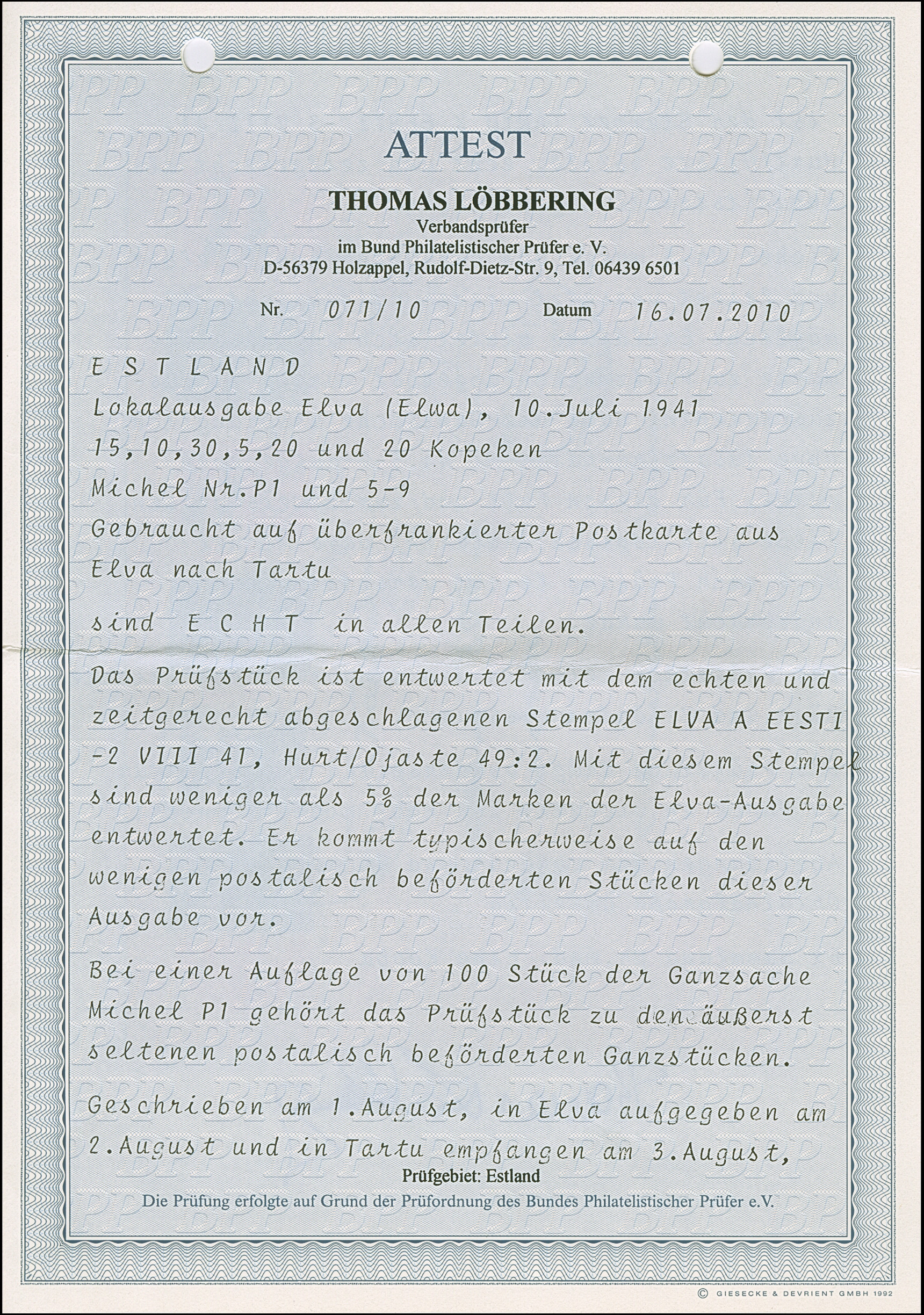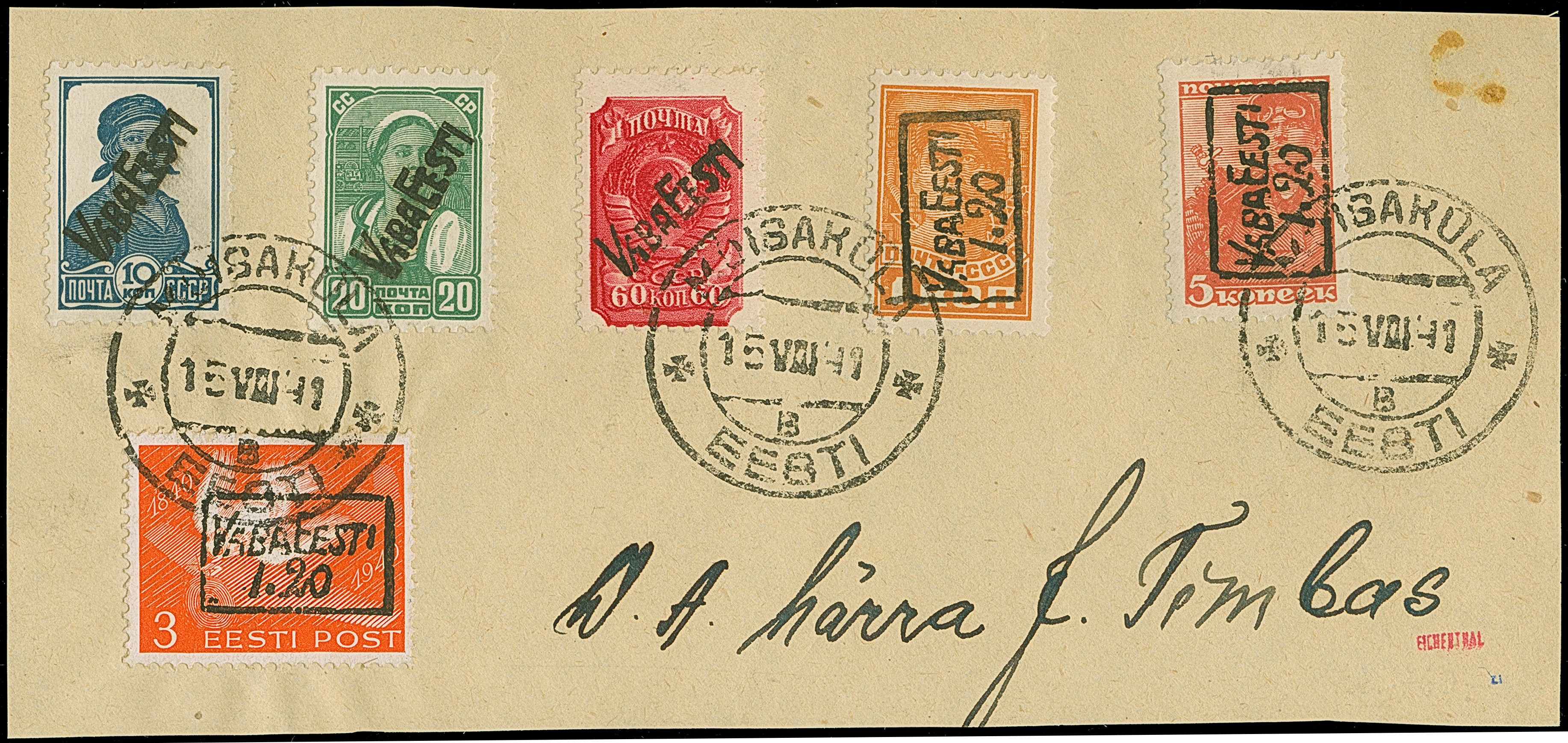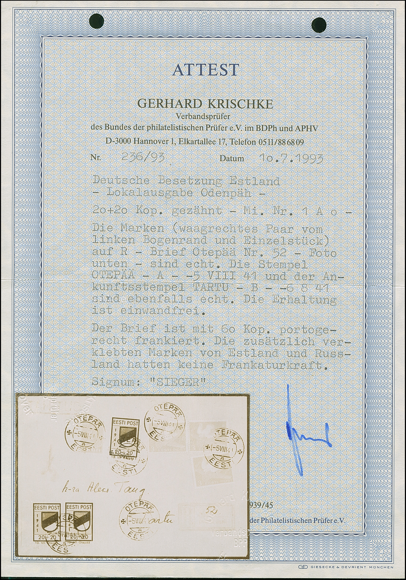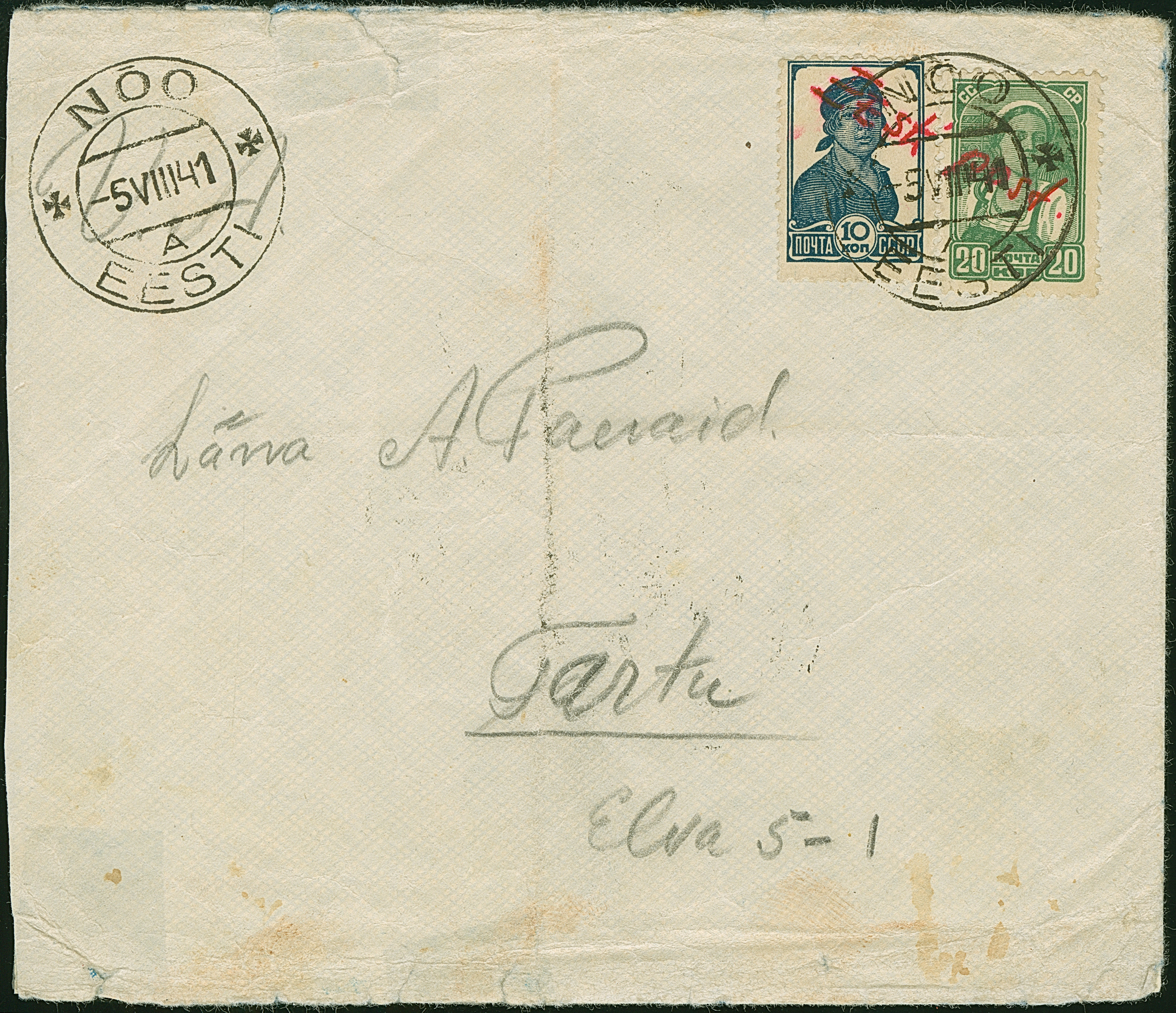 1941, 10 und 20 Kopeken mit gemeinsamem handschriftlichem Aufdruck “Eesti Post” in roter Tinte, sauber mit auf- und nebengesetztem Stempel “NOO -5 VIII 41” auf gering fehlerhaftem, zweiseitig geöffnetem Briefkuvert nach Tartu, rückseitig mit Zensurbanderole “Zur Beförderung zugelassen Der Feldkommandant” sowie auf die Banderole übergehenden Ankunftsstempel “TARTU -7 8 41”. Der 10 Kopeken Wert unbedeutende Zahnverkürzungen, der Brief mit Beförderungsspuren. Rückseitig die Echtheitsbestätigung der Tochter des Absenders dieses Briefes. Eine der spektakulären Seltenheiten der Besetzungs- und Estland-Philatelie, Unikat. Fotoattest Krischke (2008)