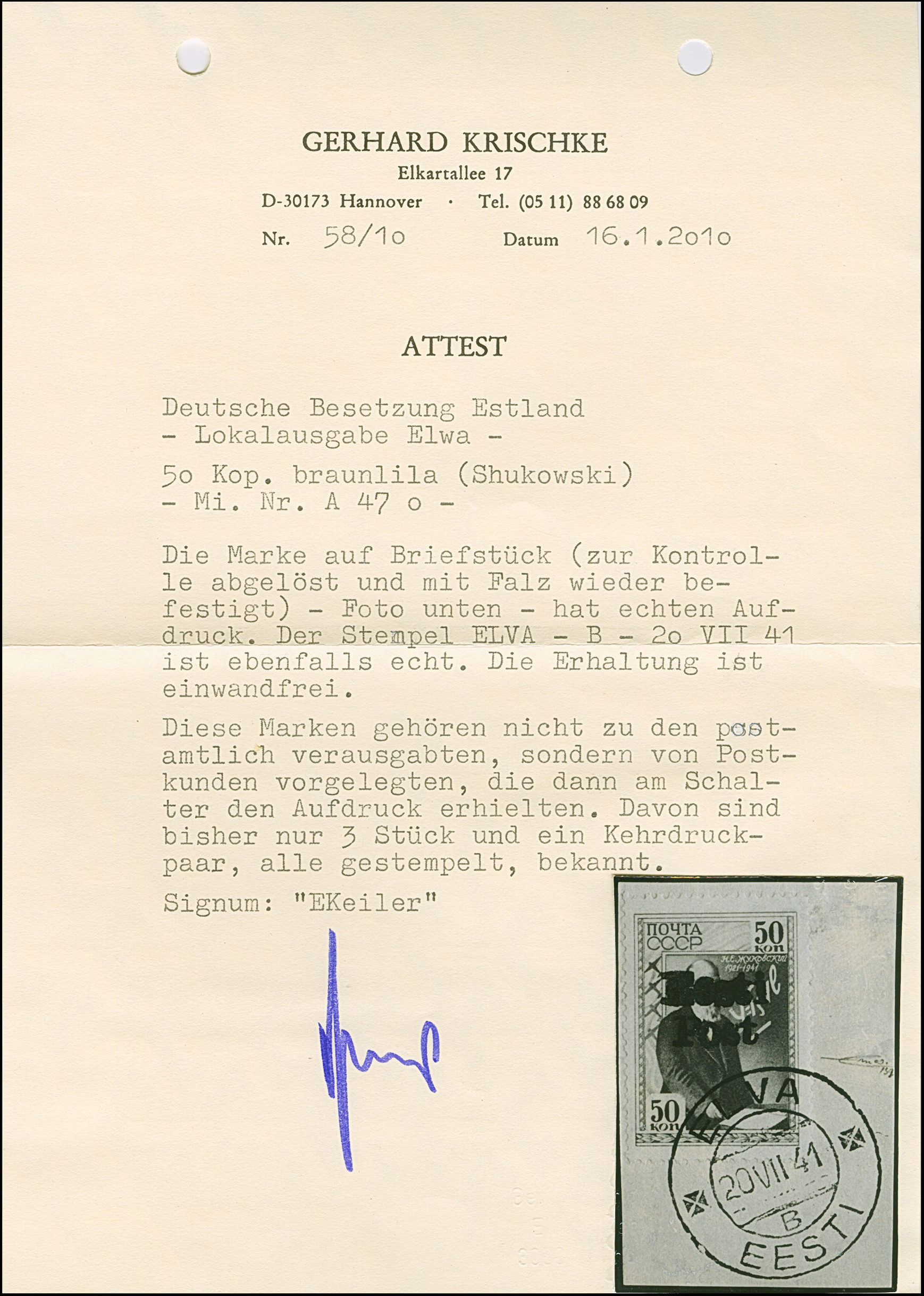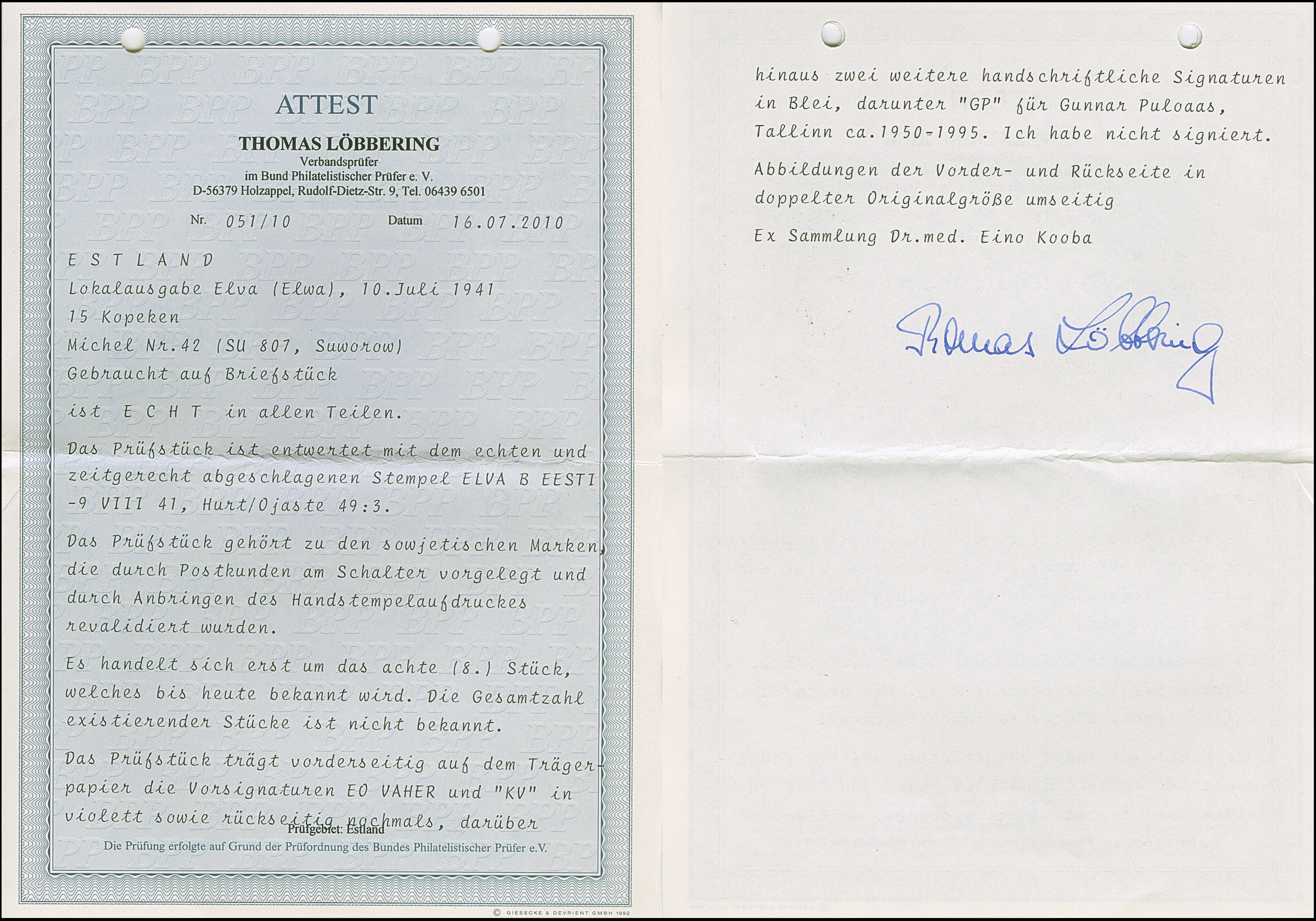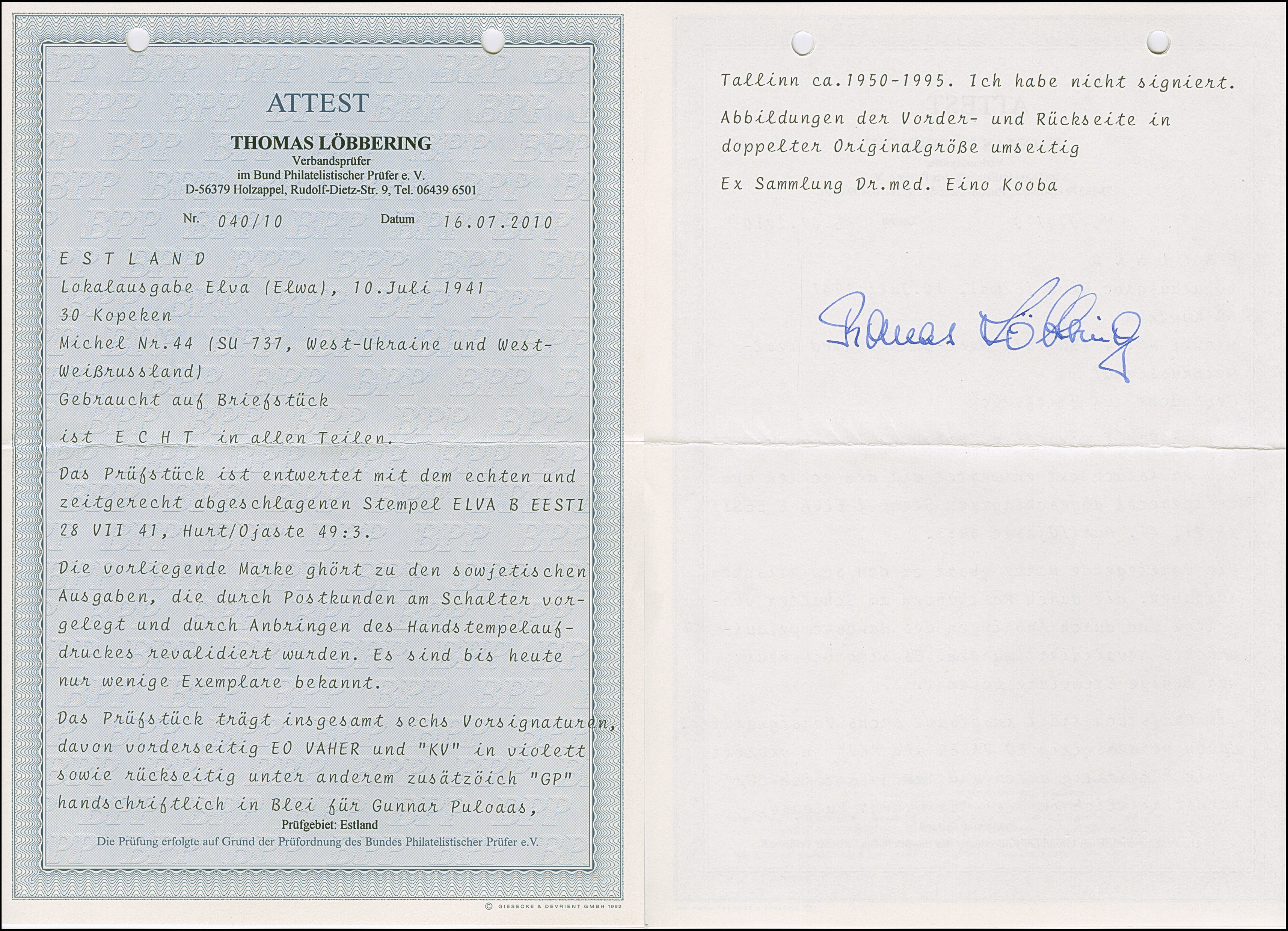 1941, 10 und 20 Kopeken mit gemeinsamem handschriftlichem Aufdruck “Eesti Post” in roter Tinte, sauber mit auf- und nebengesetztem Stempel “NOO -5 VIII 41” auf gering fehlerhaftem, zweiseitig geöffnetem Briefkuvert nach Tartu, rückseitig mit Zensurbanderole “Zur Beförderung zugelassen Der Feldkommandant” sowie auf die Banderole übergehenden Ankunftsstempel “TARTU -7 8 41”. Der 10 Kopeken Wert unbedeutende Zahnverkürzungen, der Brief mit Beförderungsspuren. Rückseitig die Echtheitsbestätigung der Tochter des Absenders dieses Briefes. Eine der spektakulären Seltenheiten der Besetzungs- und Estland-Philatelie, Unikat. Fotoattest Krischke (2008)