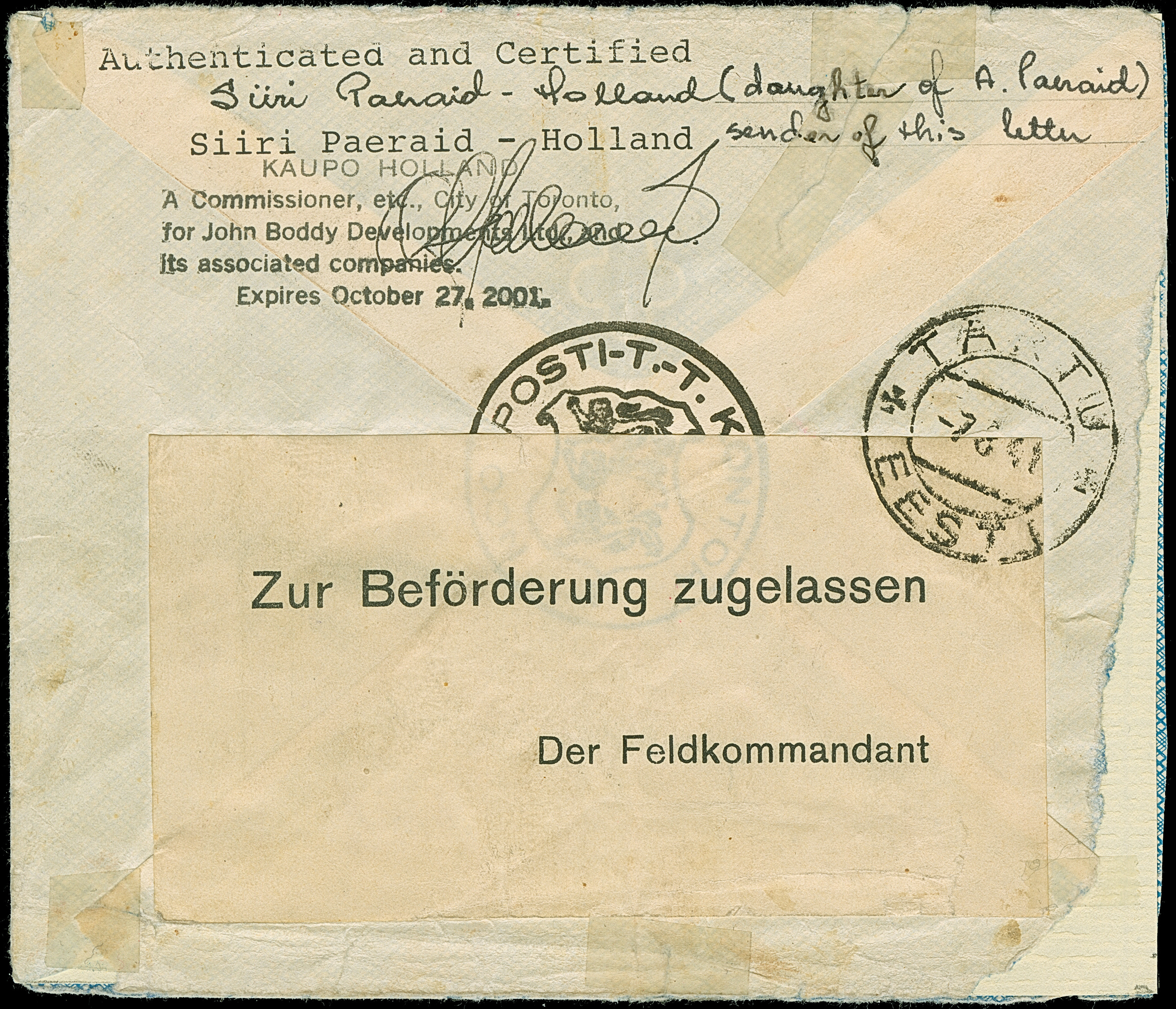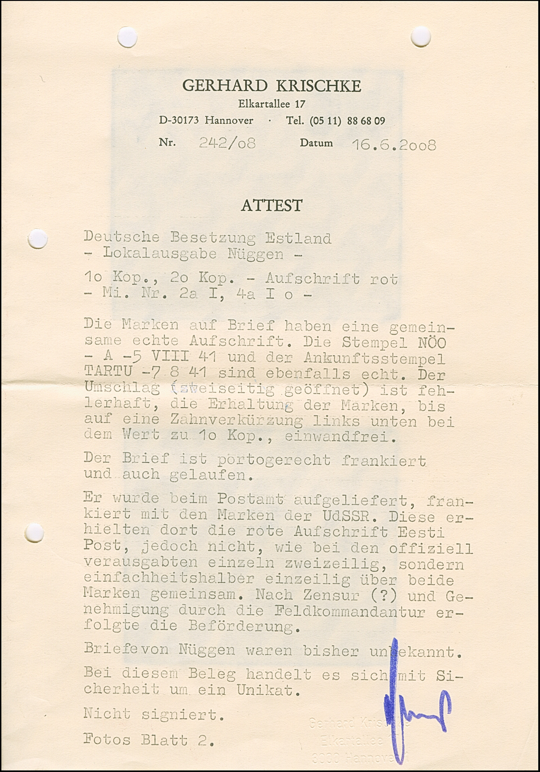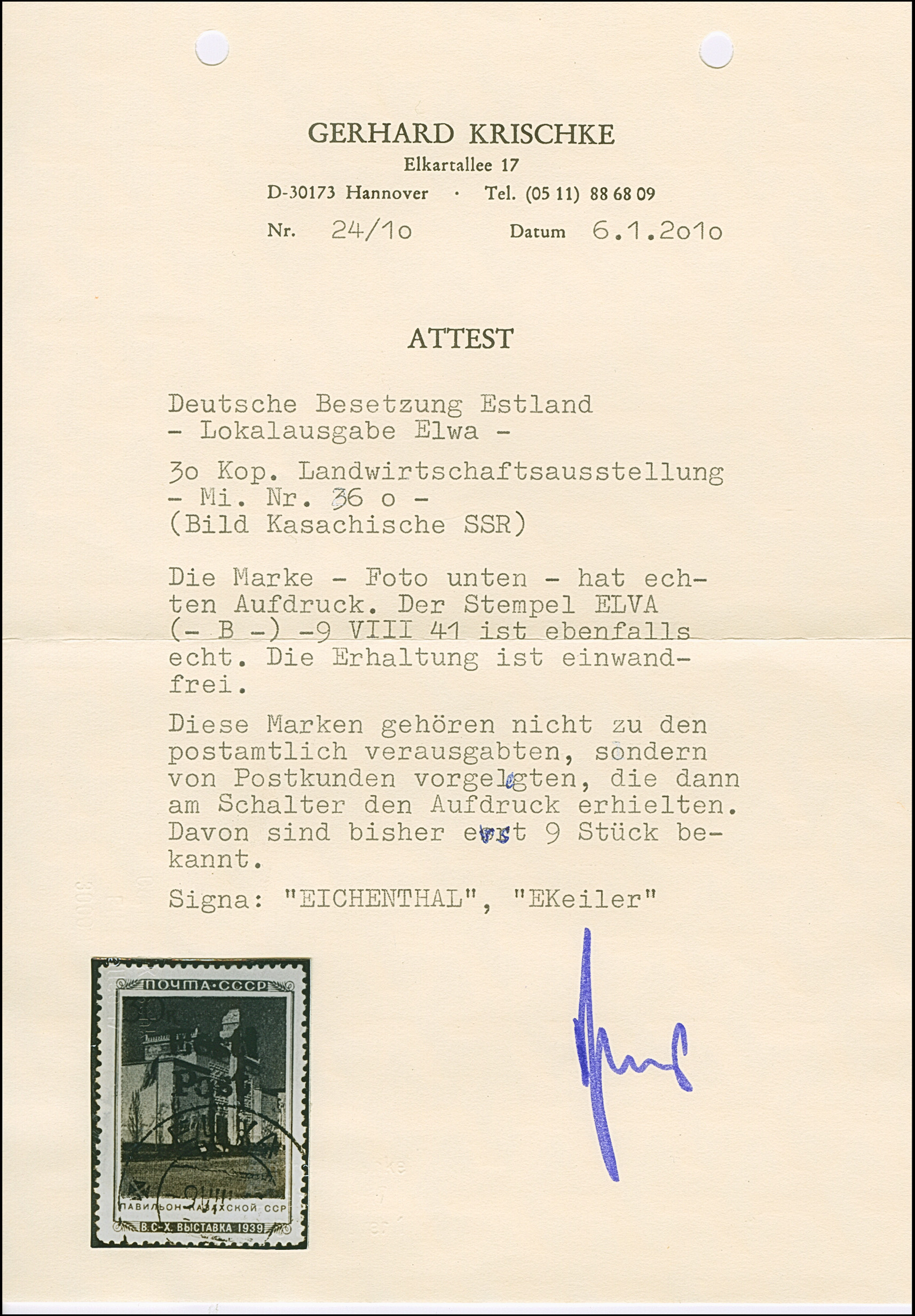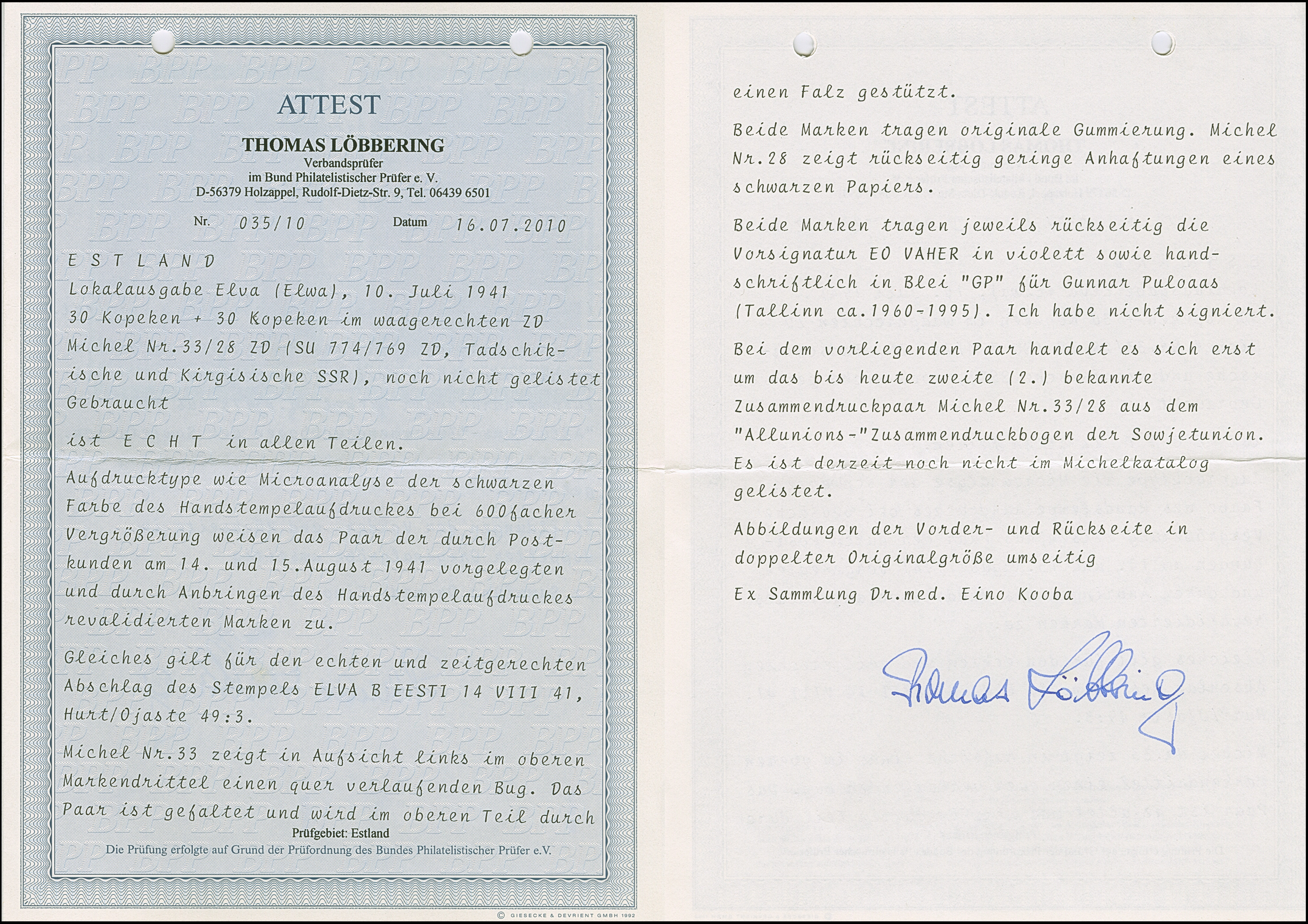 1941, 10 und 20 Kopeken mit gemeinsamem handschriftlichem Aufdruck “Eesti Post” in roter Tinte, sauber mit auf- und nebengesetztem Stempel “NOO -5 VIII 41” auf gering fehlerhaftem, zweiseitig geöffnetem Briefkuvert nach Tartu, rückseitig mit Zensurbanderole “Zur Beförderung zugelassen Der Feldkommandant” sowie auf die Banderole übergehenden Ankunftsstempel “TARTU -7 8 41”. Der 10 Kopeken Wert unbedeutende Zahnverkürzungen, der Brief mit Beförderungsspuren. Rückseitig die Echtheitsbestätigung der Tochter des Absenders dieses Briefes. Eine der spektakulären Seltenheiten der Besetzungs- und Estland-Philatelie, Unikat. Fotoattest Krischke (2008)