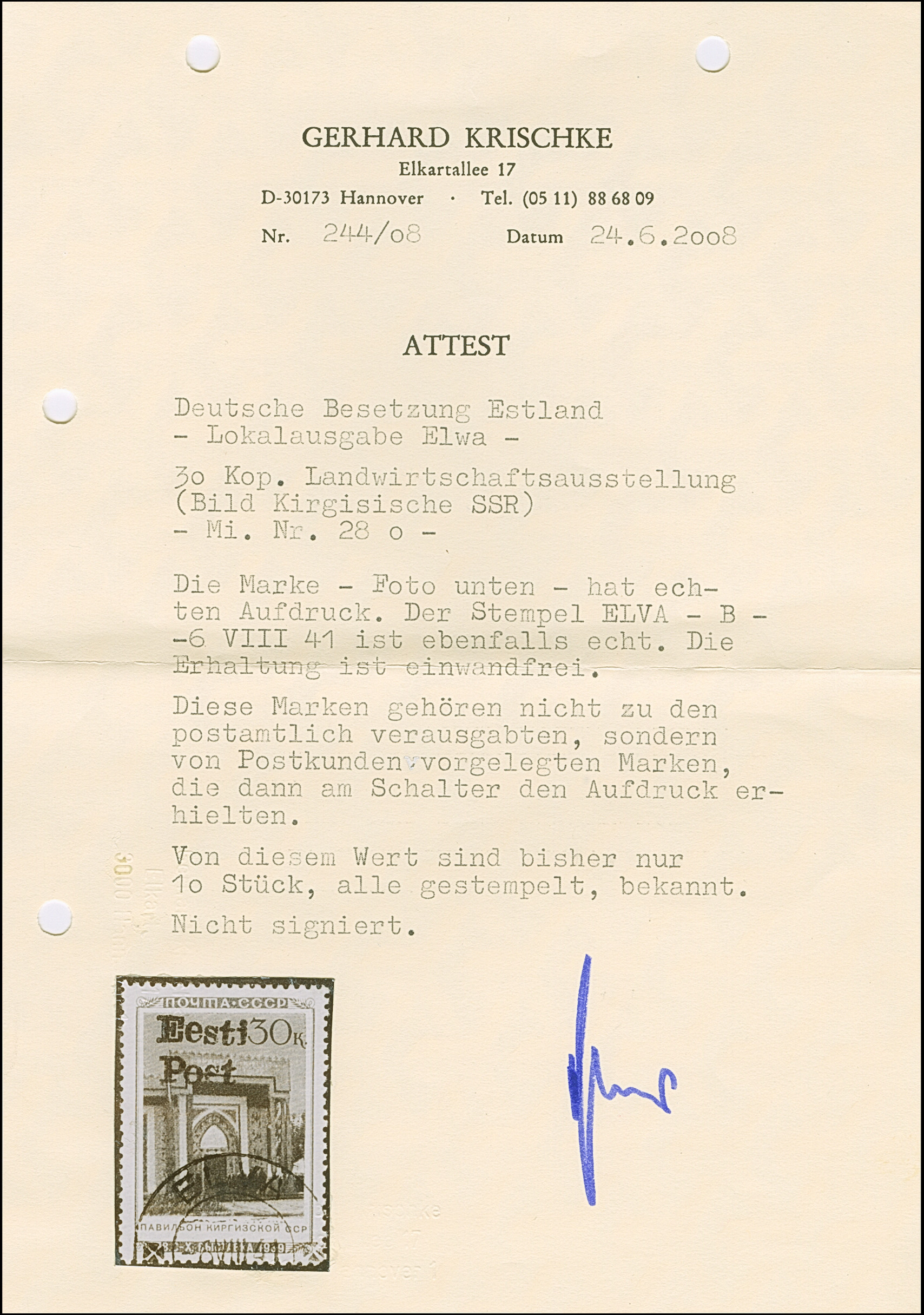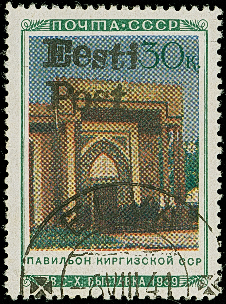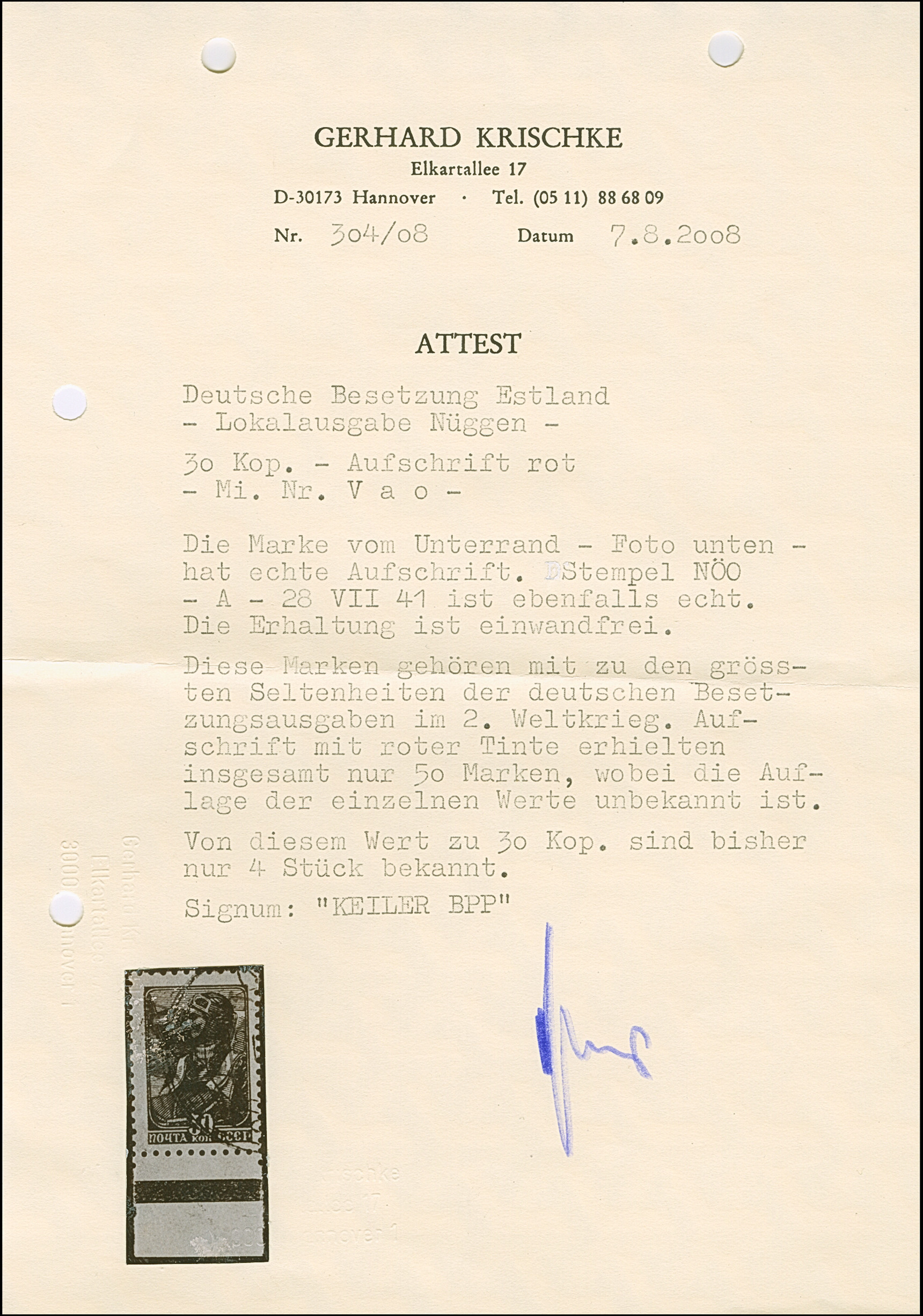 1941, “Eesti post”, handschriftlicher Aufdruck in roter Tinte: 30 Kopeken, Unterrandstück, farbfrisch und gut gezähnt, sauber und klar gestempelt, tadellos, eine der großen Seltenheiten, insgesamt erhielten nur 50 Marken aller Wertstufen die handschriftlichen “Aufdrucke”, ProFi hat von dem Wert zu 30 Kopeken lediglich 4 Stück registriert, sign. Keiler und Fotoattest Krischke BPP (1986)