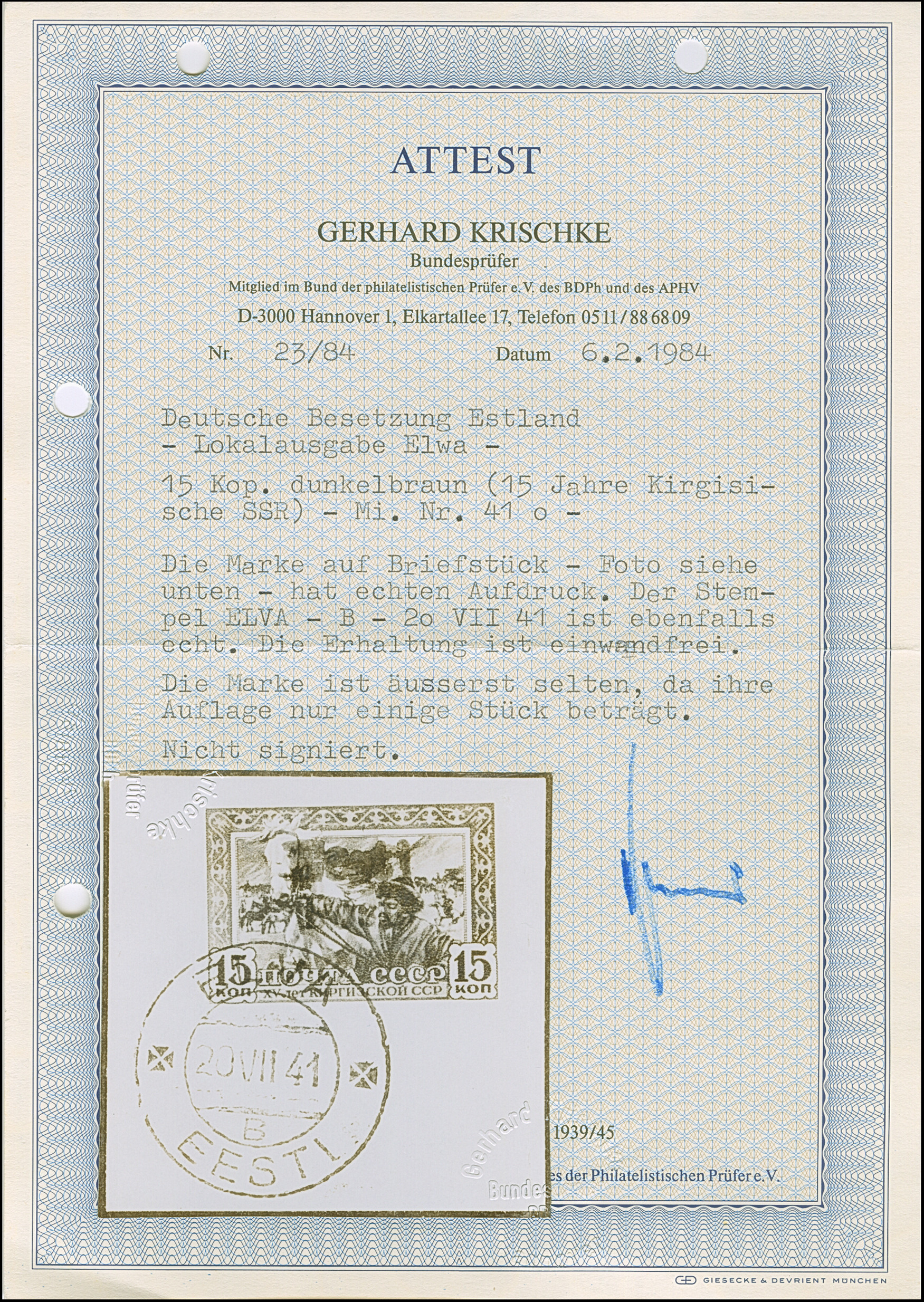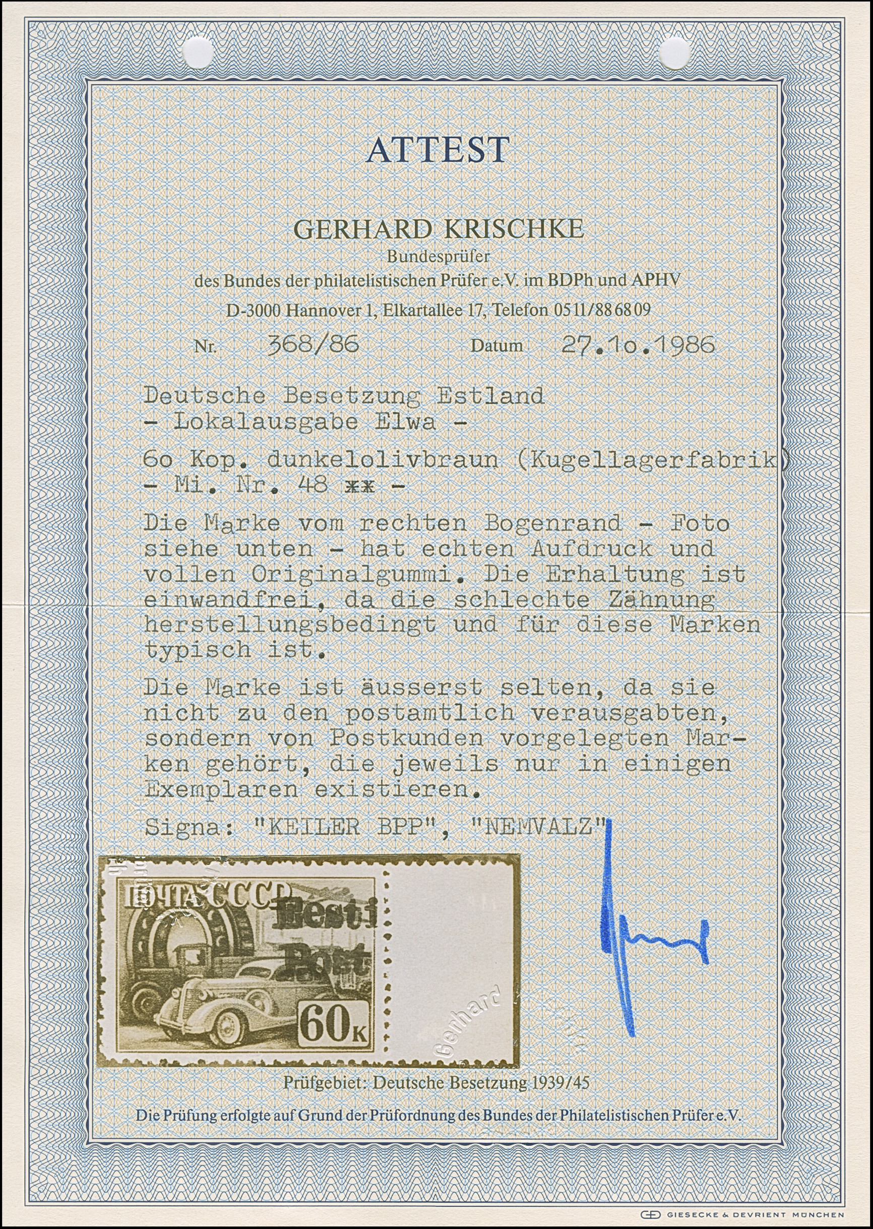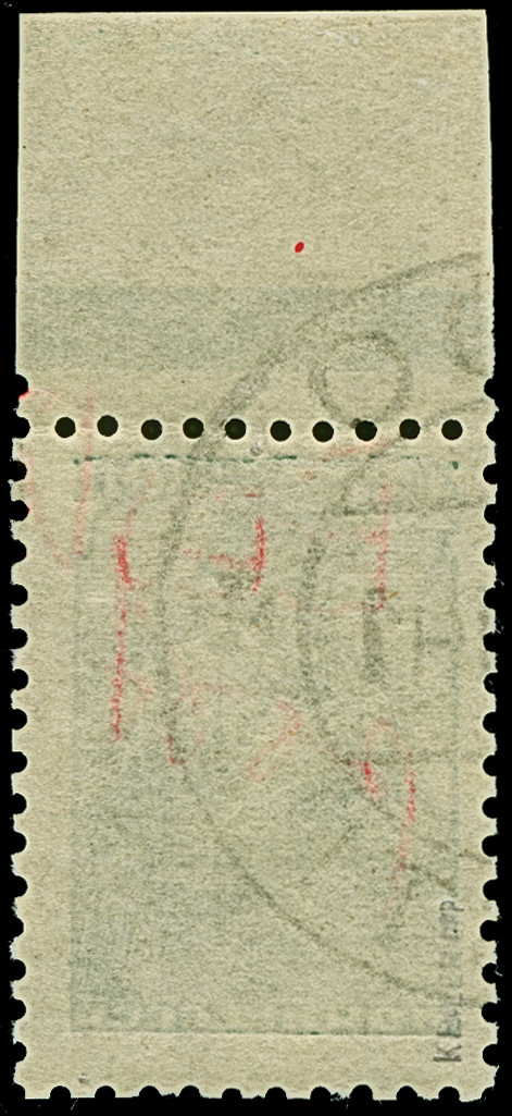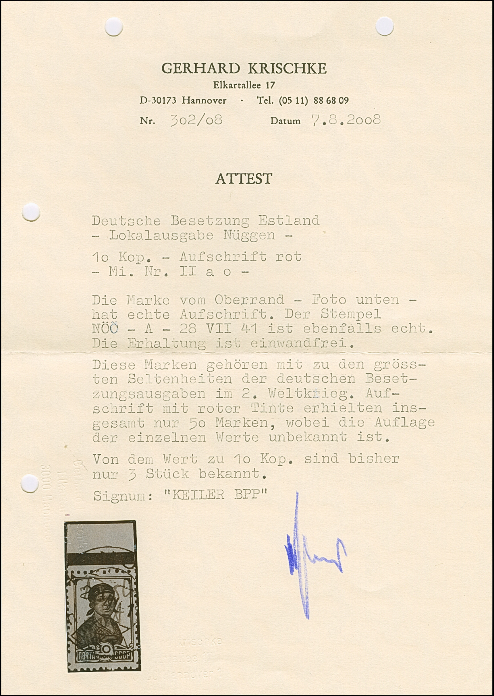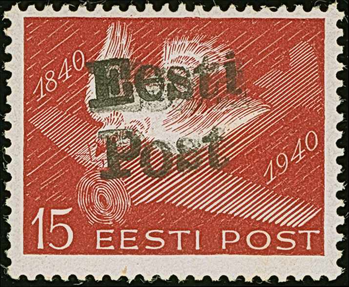 1941, “Eesti post”, handschriftlicher Aufdruck in roter Tinte: 15 Kopeken, Oberrandstück, farbfrisch und gut gezähnt, sauber und klar gestempelt, tadellos, eine der großen Seltenheiten, insgesamt erhielten nur 50 Marken aller Wertstufen die handschriftlichen “Aufdrucke”, ProFi hat von dem Wert zu 15 Kopeken lediglich 5 Stück registriert, sign. Keiler und Fotoattest Krischke BPP (1986)