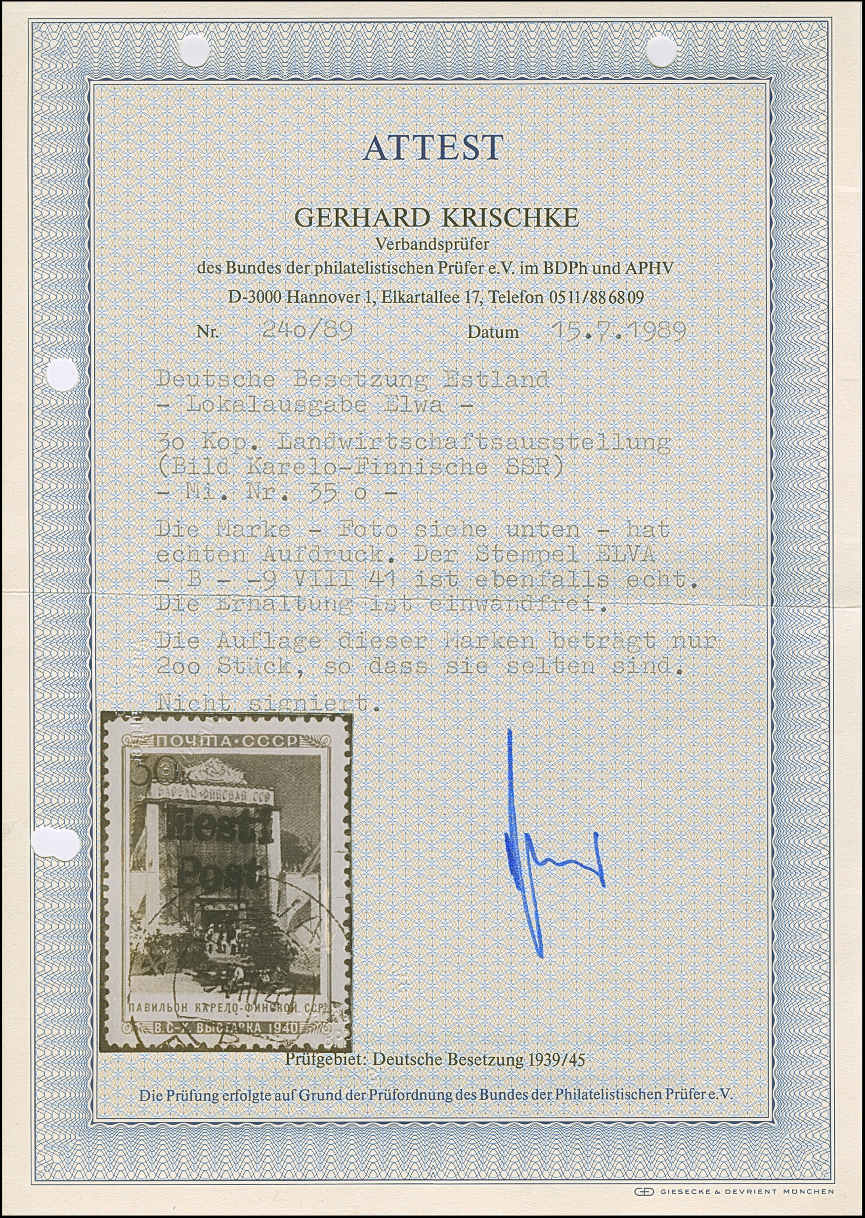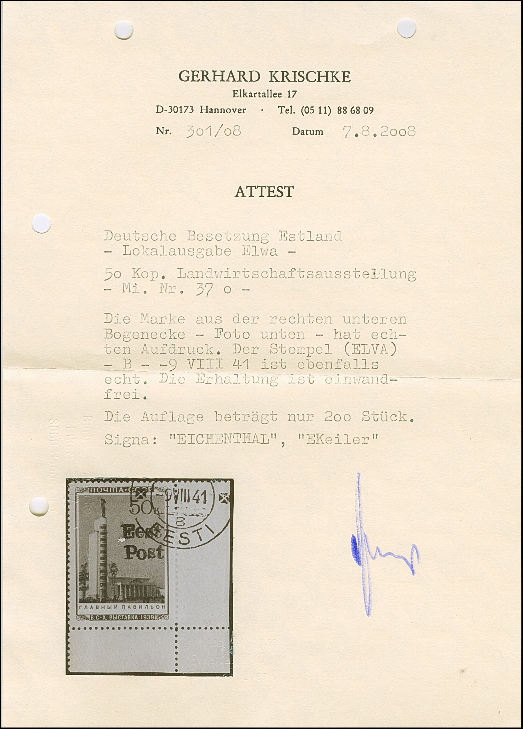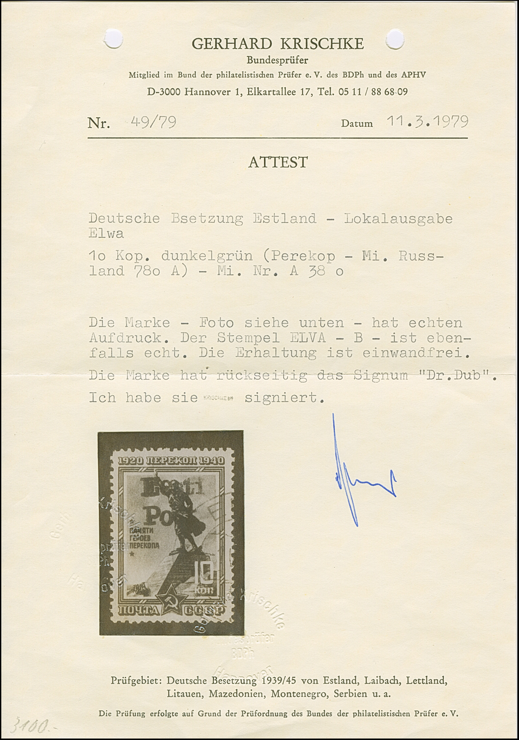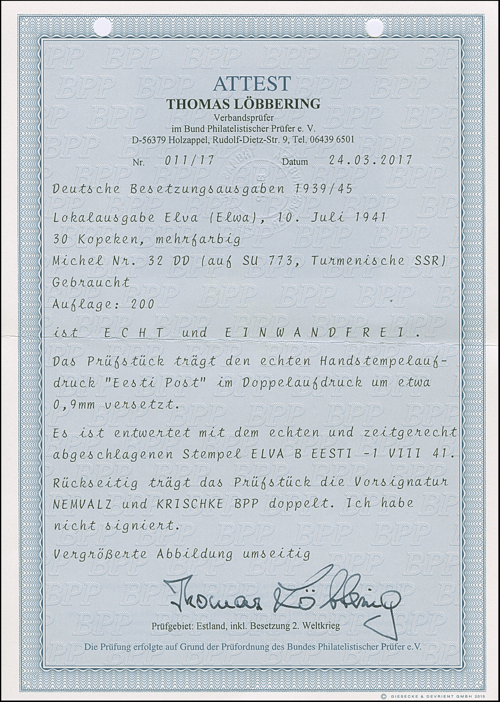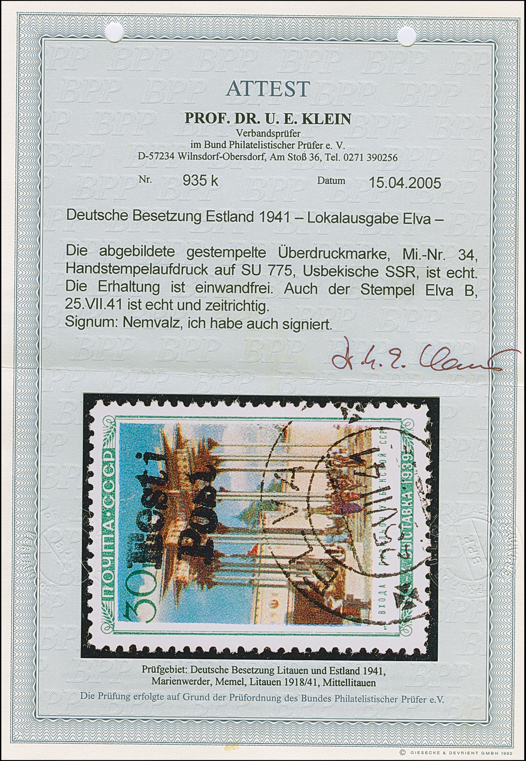 1941, “Eesti post”, handschriftlicher Aufdruck in roter Tinte: 15 Kopeken, Oberrandstück, farbfrisch und gut gezähnt, sauber und klar gestempelt, tadellos, eine der großen Seltenheiten, insgesamt erhielten nur 50 Marken aller Wertstufen die handschriftlichen “Aufdrucke”, ProFi hat von dem Wert zu 15 Kopeken lediglich 5 Stück registriert, sign. Keiler und Fotoattest Krischke BPP (1986)