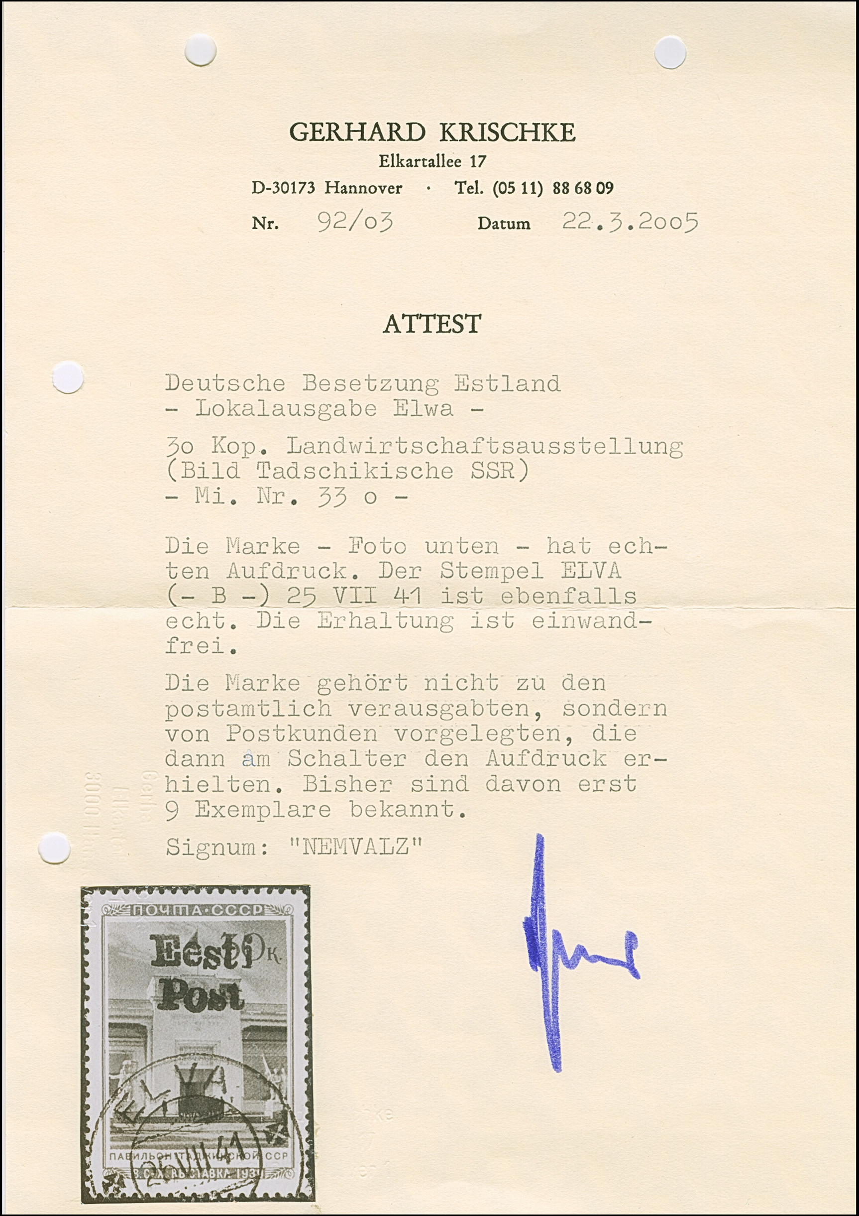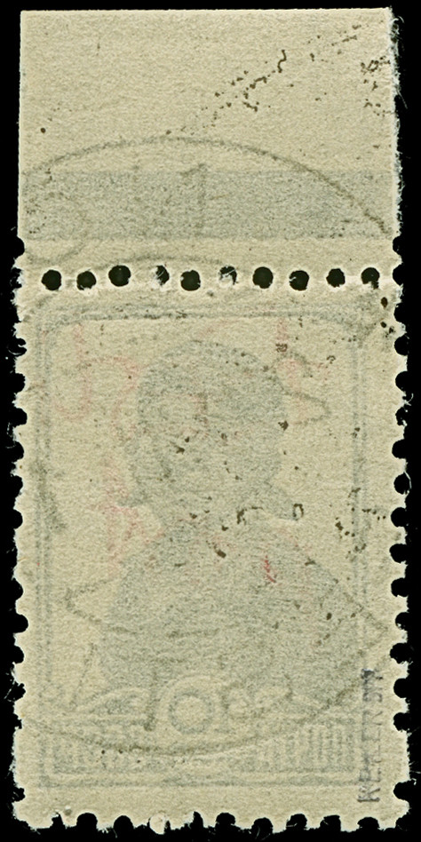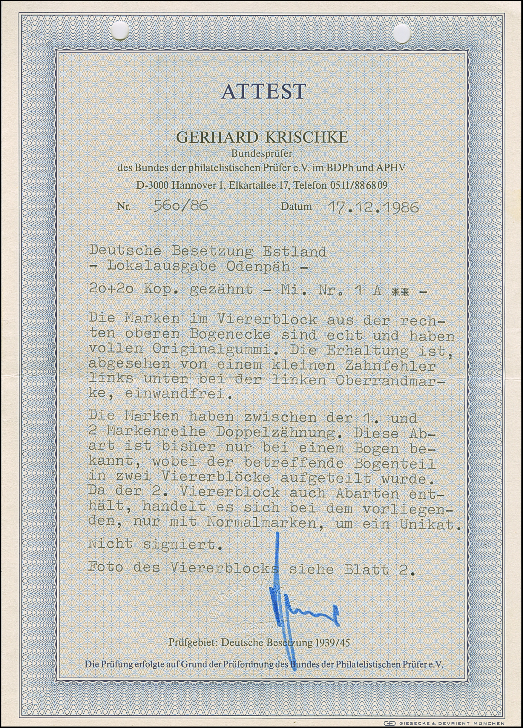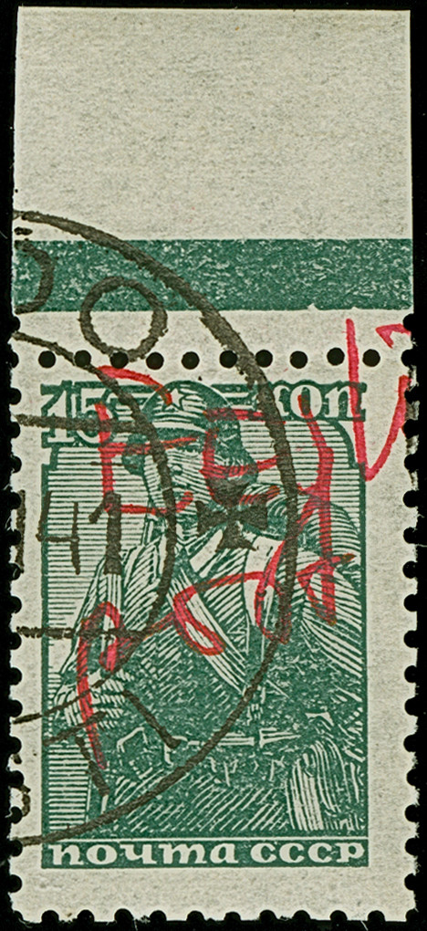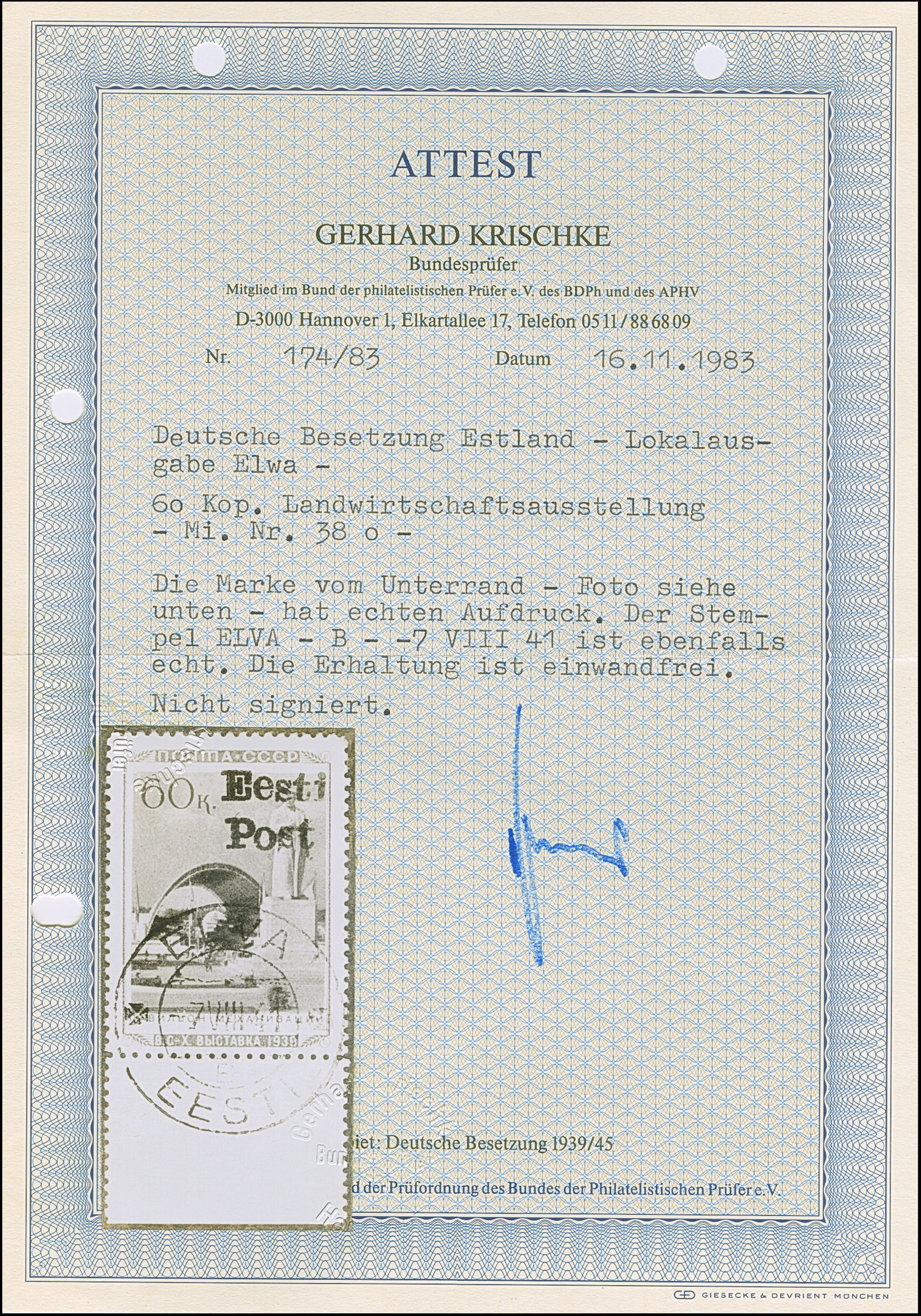 1941, “Eesti post”, handschriftlicher Aufdruck in roter Tinte: 15 Kopeken, Oberrandstück, farbfrisch und gut gezähnt, sauber und klar gestempelt, tadellos, eine der großen Seltenheiten, insgesamt erhielten nur 50 Marken aller Wertstufen die handschriftlichen “Aufdrucke”, ProFi hat von dem Wert zu 15 Kopeken lediglich 5 Stück registriert, sign. Keiler und Fotoattest Krischke BPP (1986)