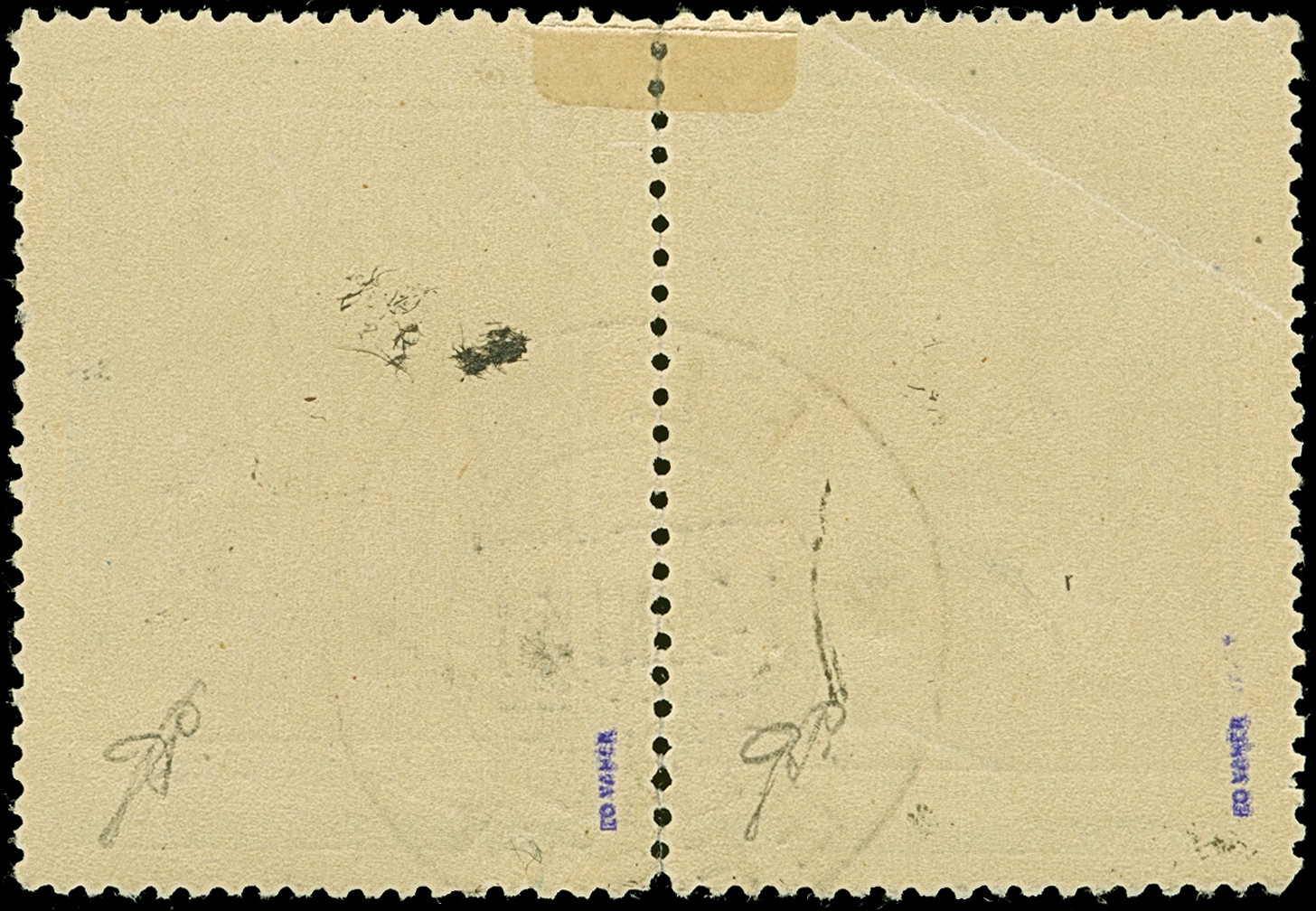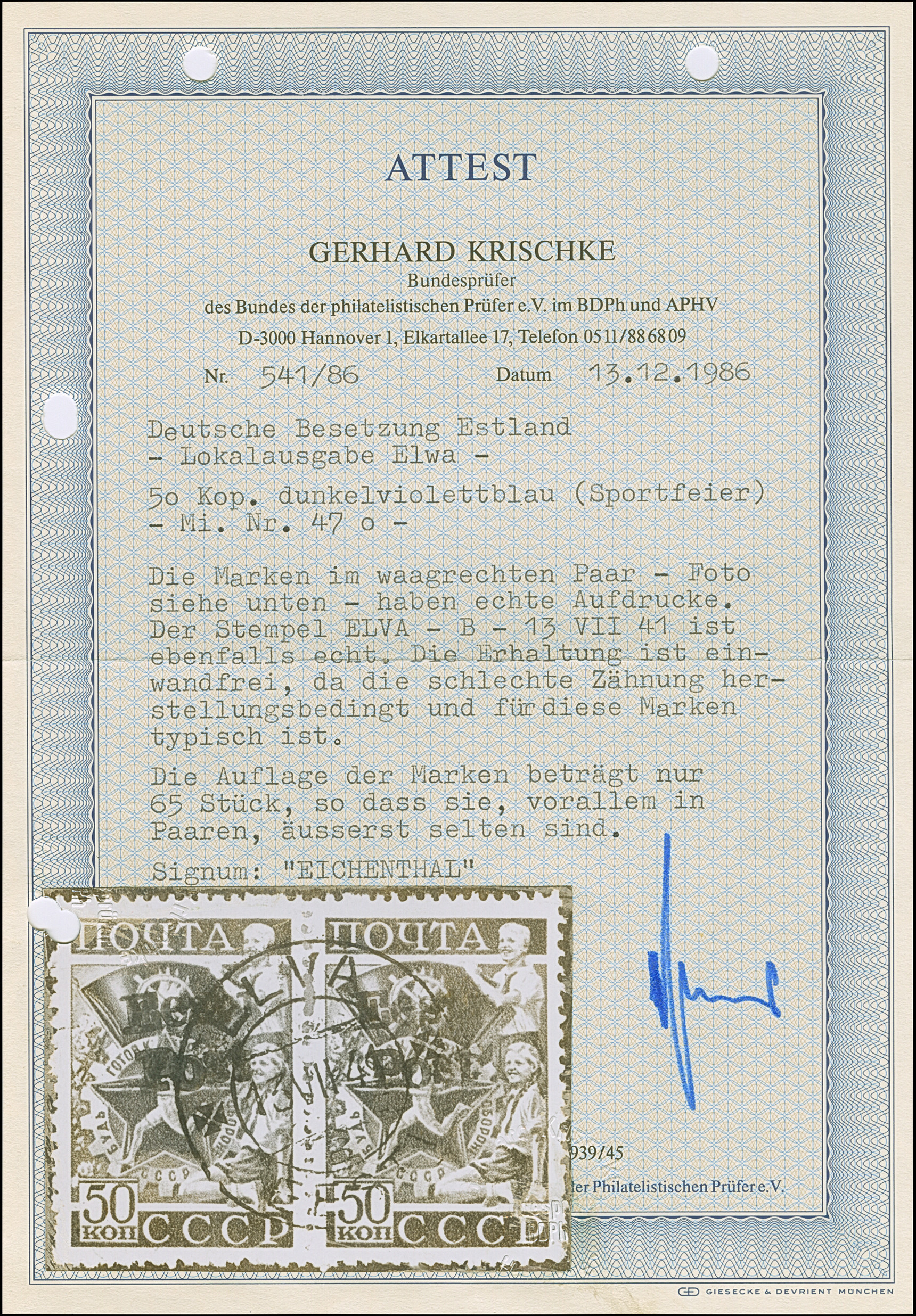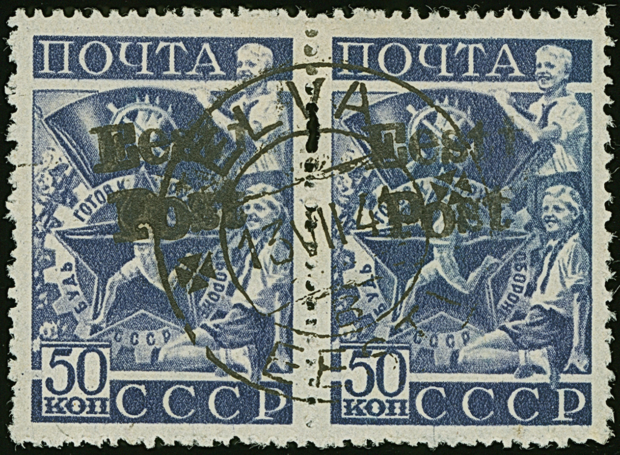 1941, Sportabzeichen GTO 50 Kopeken dunkelviolettblau, waagerechtes Paar, farbfrisch und gut gezähnt, sauber gestempelt “ELVA 13 VII 41”, tadellos. Eine sehr seltene Marke mit einer Auflage von nur 65 Stück, ProFi hat keine weitere Einheit registriert, sign. Eichenthal und Fotoattest Krischke BPP (1986)