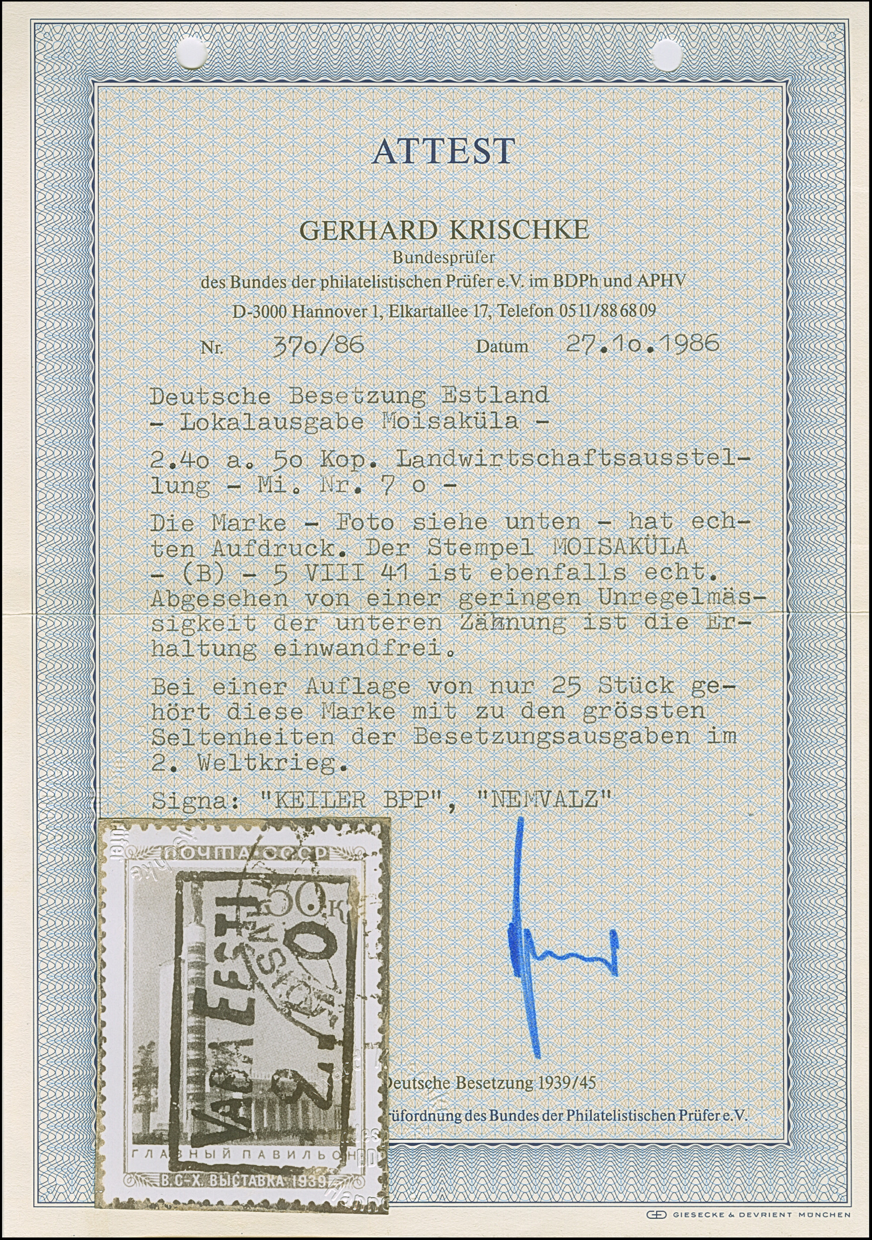 2,40 auf 50 Kopeken, farbfrisch und gut gezähnt, sauber gestempelt, tadellos. Eine der großen Seltenheiten von Estland und der gesamten Besetzungsausgaben mit einer Auflage von nur 25 Stück, sign. Keiler BPP sowie Nemvalz und Fotoattest Krischke BPP (1986)