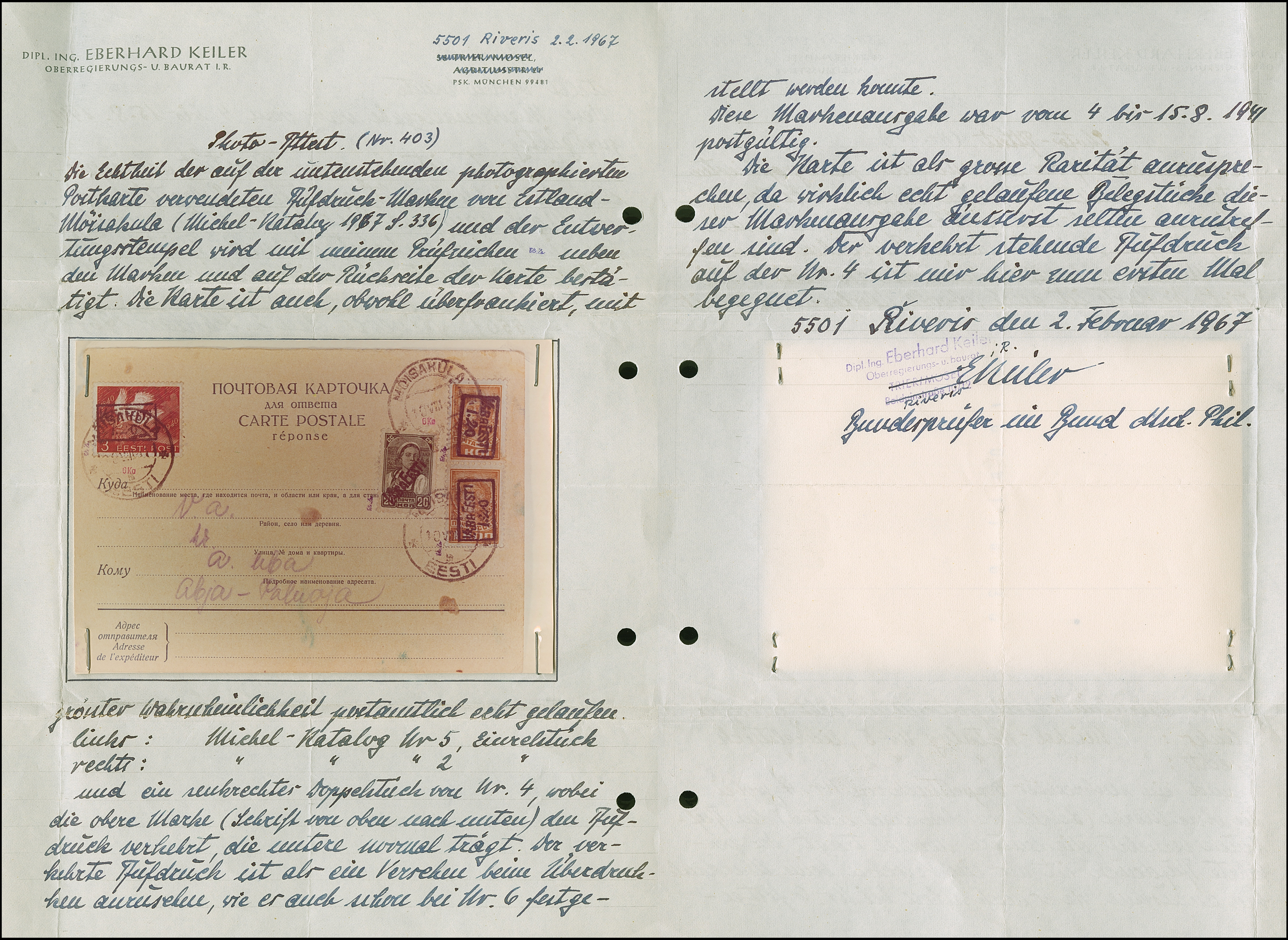 1941, 1,20 auf 1 Kopek orange, senkrechtes Kehrdruckpaar, zusammen mit 1,20 auf 3 S. orange und 20 Kopeken grün, mit Stempel “MOISAKÜLA 10 VIII 41” auf russischer Ganzsachenkarte, rückseitig datiert “Moiseküla 10.08” mit interessantem Text “…Ich bin mit dem Fahrrad an der lettischen Grenze im Norden….Wenn die Umstände sich bessern, komme ich zu Besuch.”, die Ganzsachenkarte kleiner Eckfehler, leichte Altersspuren, sonst tadellos, eine der ganz großen Seltenheiten, die 3 S. mit nur einer Auflage von 80 Stück, ProFi hat keinen weiteren senkrechten Kehrdruck registriert, sign. EKeiler mit Fotoattest (1967)