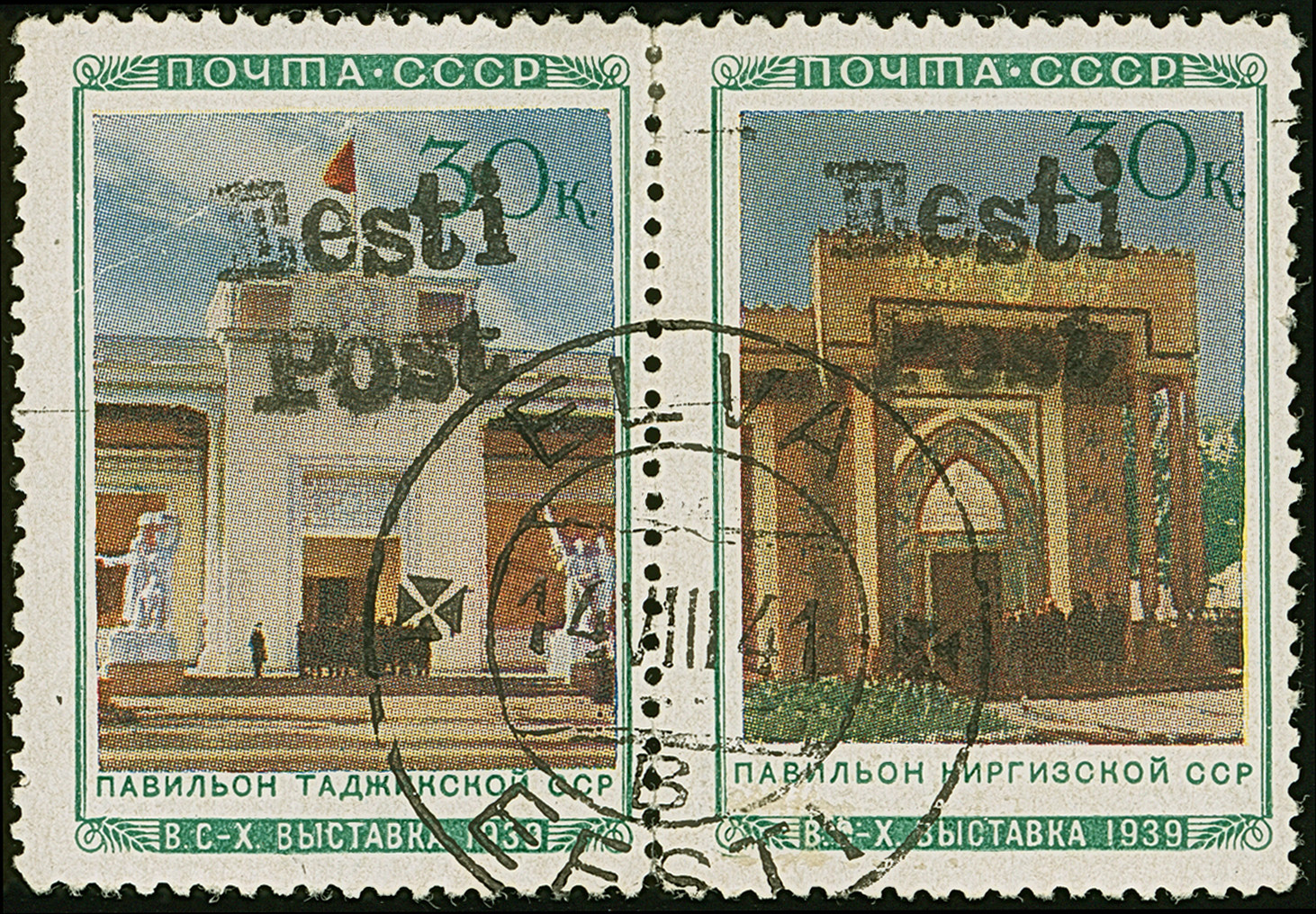 1941, Tadschikische SSR und Kirgisische SSR 30 Kopeken mehrfarbig, waagerechter Zusammendruck, farbfrisch und meist gut gezähnt, sauber gestempelt "ELVA B 14 VIII 41", die linke Marke mit Querbug im oberen Markendrittel, oben zwei Zähne angetrennt, diese durch Falz gestützt, sonst tadellos. Eine große Seltenheit, nur eine weitere derartige Kombination aus dem “Allunions-Bogen” bekannt, sign. Puloaas sowie Vaher und Fotoattest Löbbering BPP (2010)