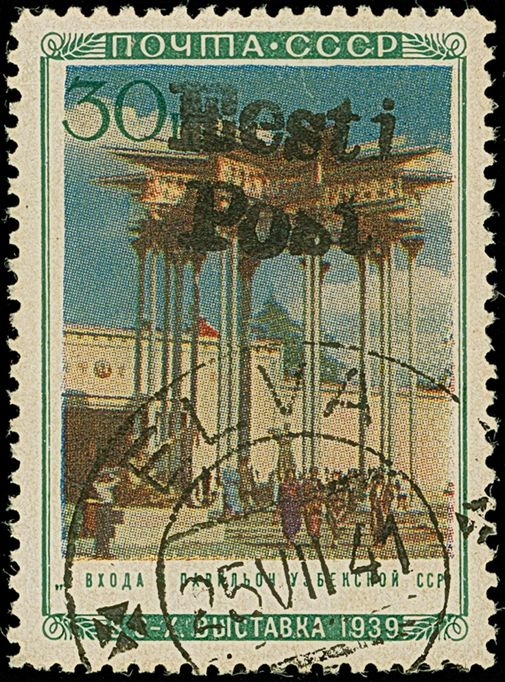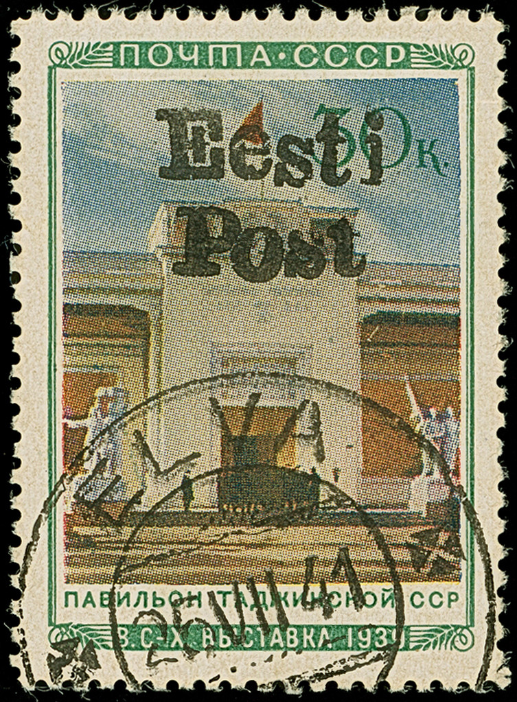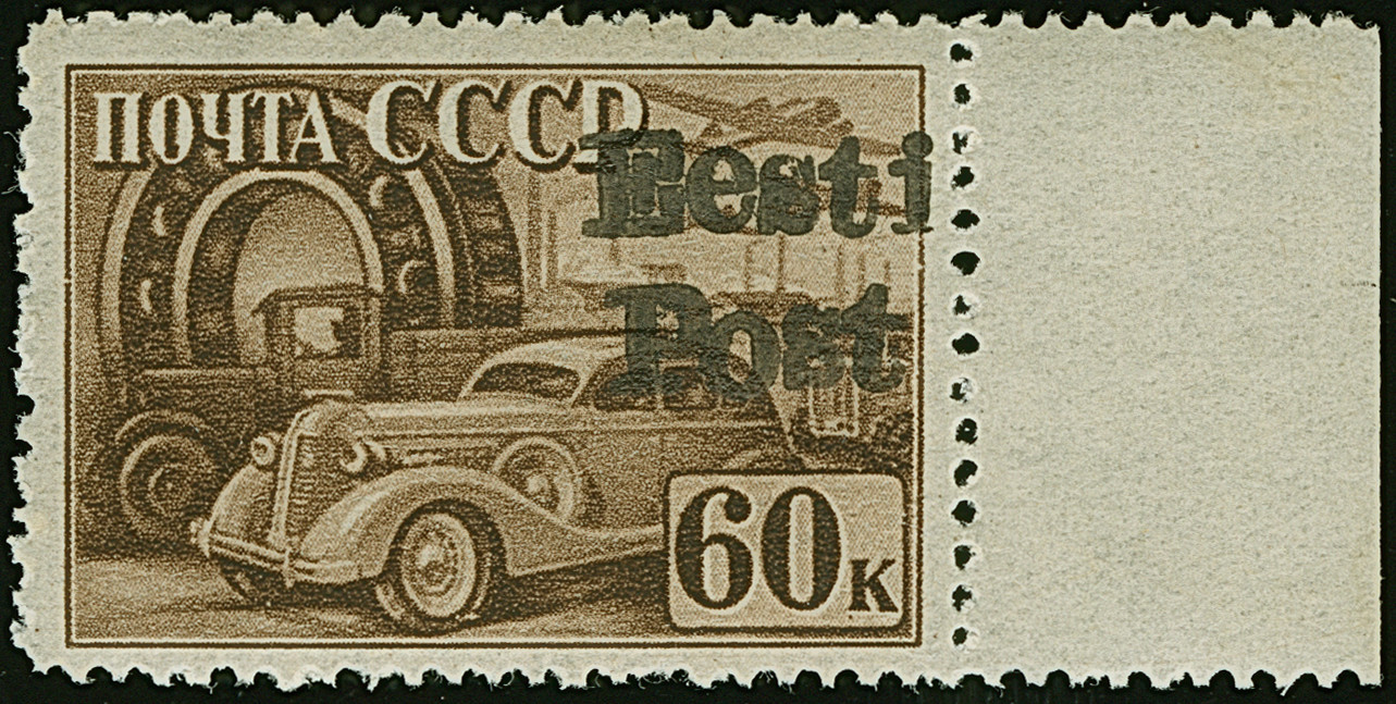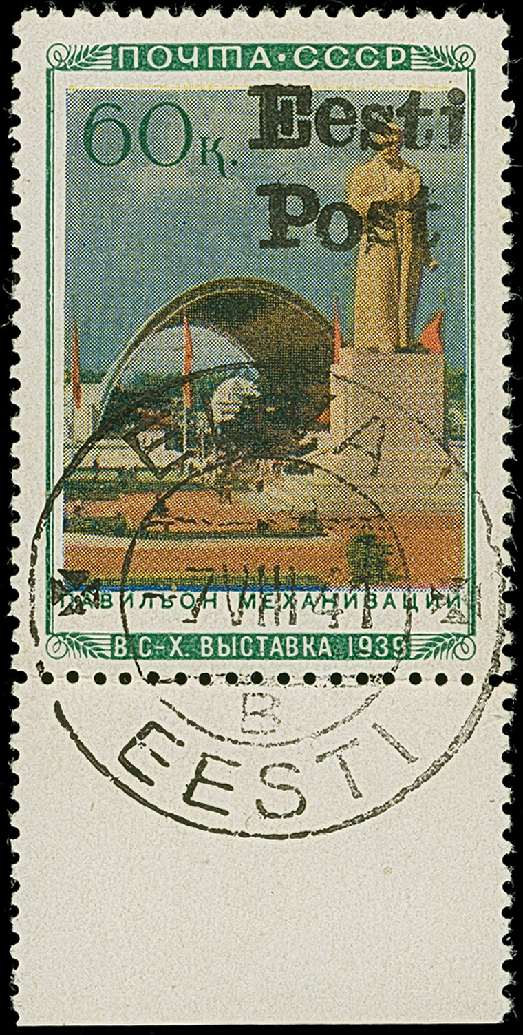 1941, “Eesti post”, handschriftlicher Aufdruck in roter Tinte: 10 Kopeken, Oberrandstück, farbfrisch und gut gezähnt, sauber und klar gestempelt, tadellos, eine der großen Seltenheiten, sign. Keiler BPP sowie Fotoattest Krischke (2008)