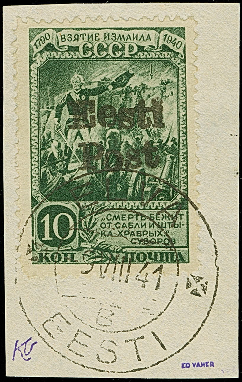 1941, Erstürmung Ismails 10 Kopeken dunkelgraugrün, farbfrisch und gut gezähnt, sauber mit Stempel “ELVA -9.VIII 41” auf Briefstück, tadellos. Eine der großen Seltenheiten, ProFi hat lediglich 4 Exemplare registriert, davon dürfte das vorliegende das schönste Stück sein, u.a. sign. Vaher und Puloaas sowie Fotoattest Löbbering BPP (2010)
