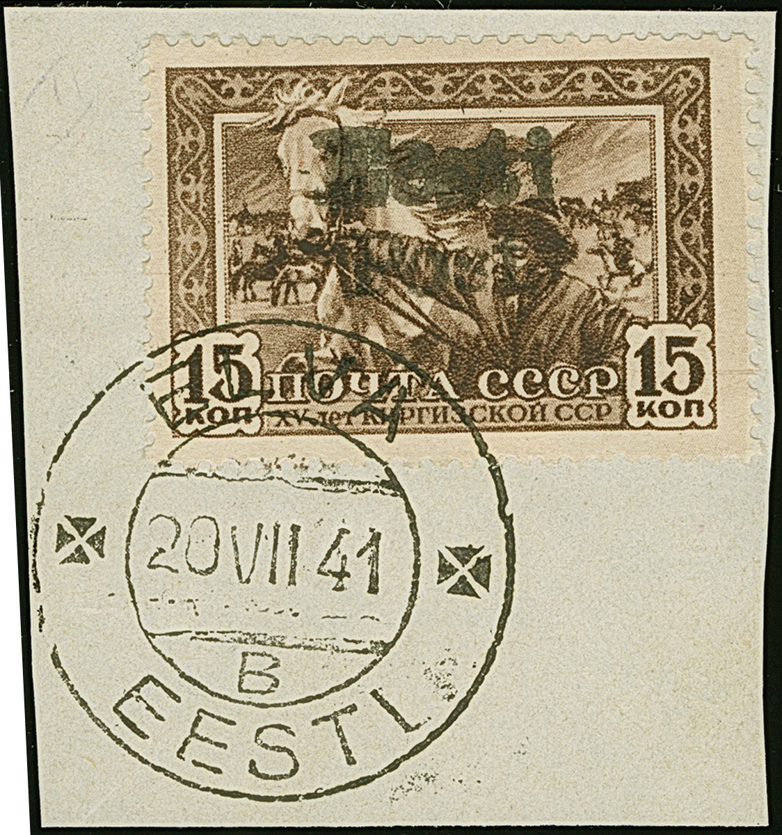 1941, Kirgisische SSR 15 Kopeken schwarzorangebraun, farbfrisch und gut gezähnt, sauber mit Stempel “ELVA 20.VII 41” auf Briefstück, tadellos. Eine der großen Seltenheiten, ProFi hat lediglich 5 Exemplare registriert, davon dürfte das vorliegende das schönste Stück sein, sign. Puloaas sowie Fotoattest Krischke BPP (1984)