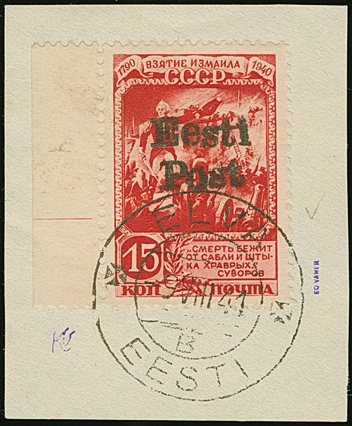 1941, Erstürmung Ismails 15 Kopeken schwärzlichrosarot, linkes Seitenrandstück, farbfrisch und gut gezähnt, sauber mit Stempel “ELVA -9.VIII 41” auf Briefstück, tadellos. Eine sehr seltene Marke, ProFi hat lediglich 11 Exemplare registriert, davon dürfte das vorliegende das schönste Stück sein, u.a. sign. Vaher und Puloaas sowie Fotoattest Löbbering BPP (2010)