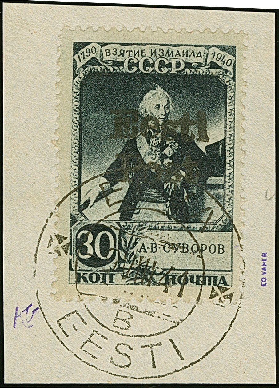 1941, Suworow 30 Kopeken blauschwarz, farbfrisch und gut gezähnt, sauber mit Stempel “ELVA -9.VII 41” auf Briefstück, tadellos. Eine der ganz großen Seltenheiten, ProFi hat nur ein weiteres Exemplar registriert, kein ungebrauchtes Stück bekannt. Das schönste verfügbare Exemplar, u.a. sign. Vaher und Puloaas sowie Fotoattest Löbbering BPP (2010)