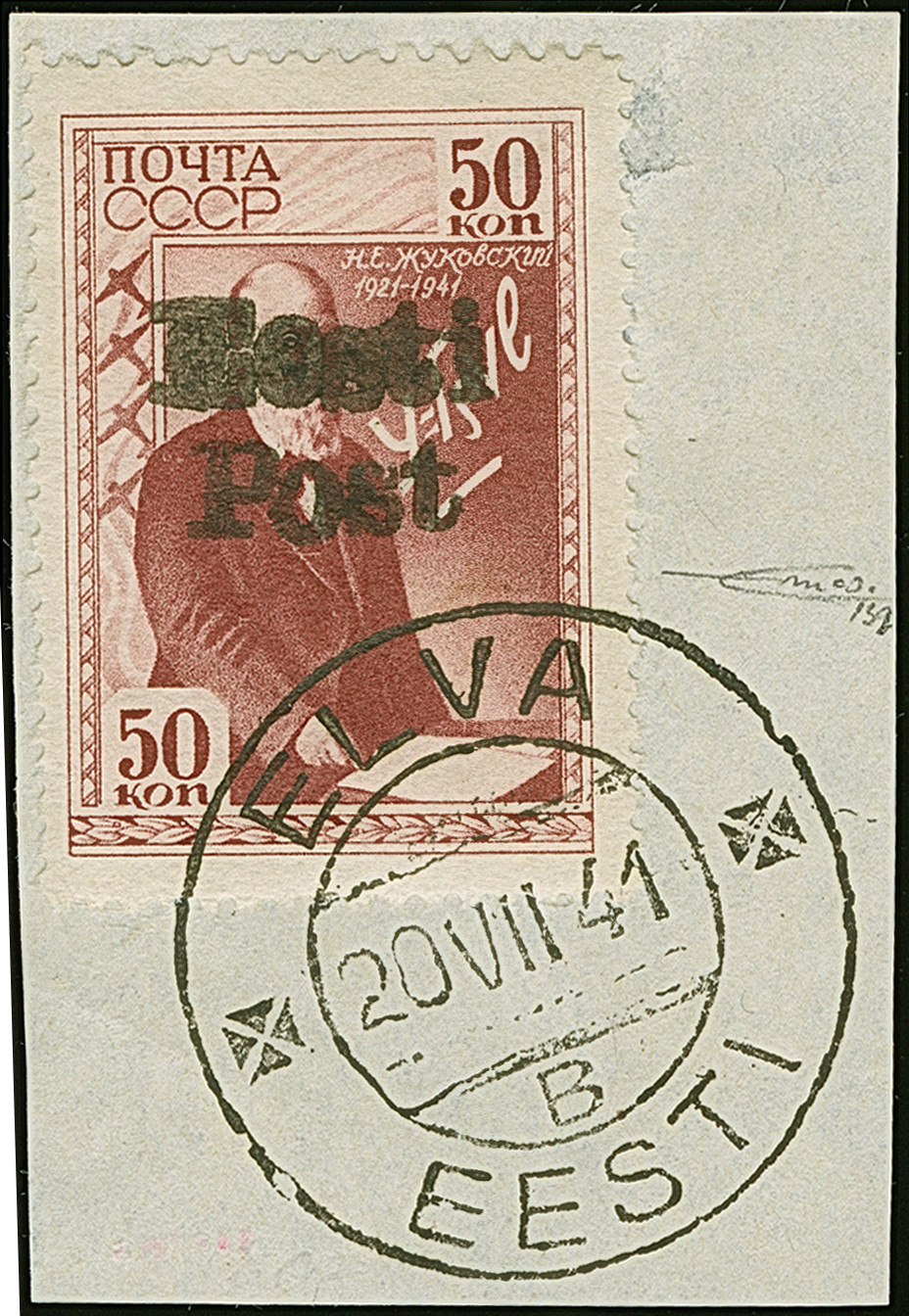 1941, Shukowski 50 Kopeken braunlila, farbfrisch und gut gezähnt, sauber mit Stempel “ELVA 20.VUII 41” auf Briefstück, tadellos. Eine der großen Seltenheiten, ProFi hat nur 7 Stück registriert, davon dies eines der schönsten, sign. EKeiler sowie Fotoattest Krischke BPP (2010)