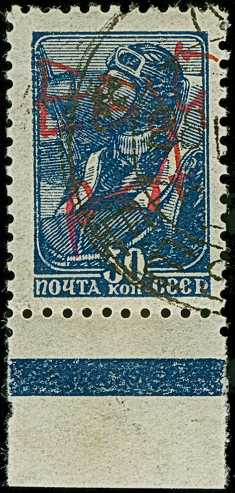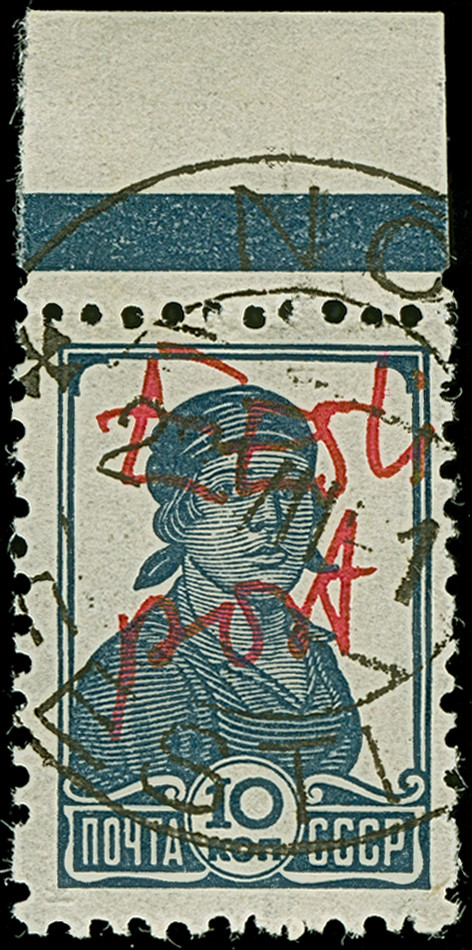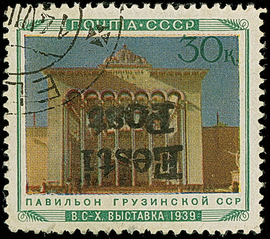 1941, Georgische SSR 30 Kopeken mehrfarbig, winzig unfrisch, gut gezähnt, sauber gestempelt, einige kleine dünne Stellen, sonst in guter Erhaltung. Eine sehr seltene Marke, ProFi hat nur einen weiteren kopfstehenden Aufdruck, innerhalb eines Kehrdruckpaares, registriert. Doppelt sign. Nemvalz