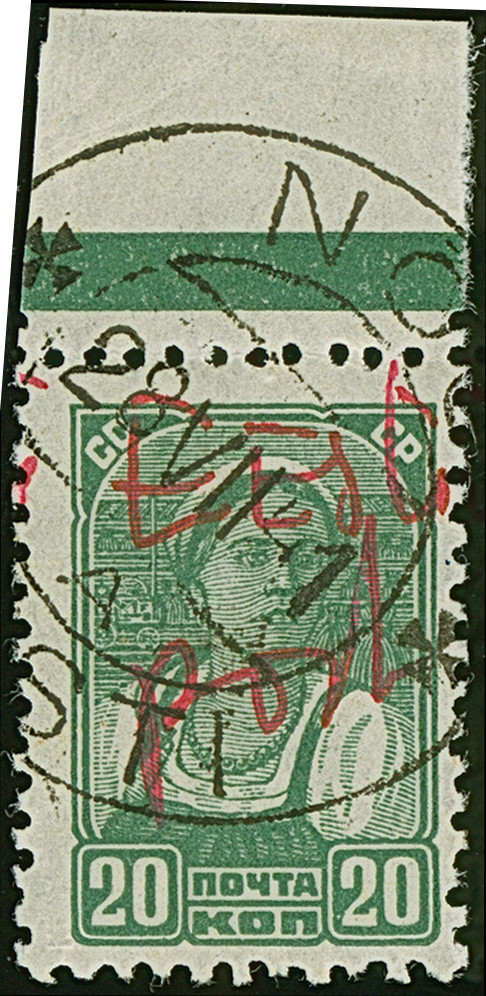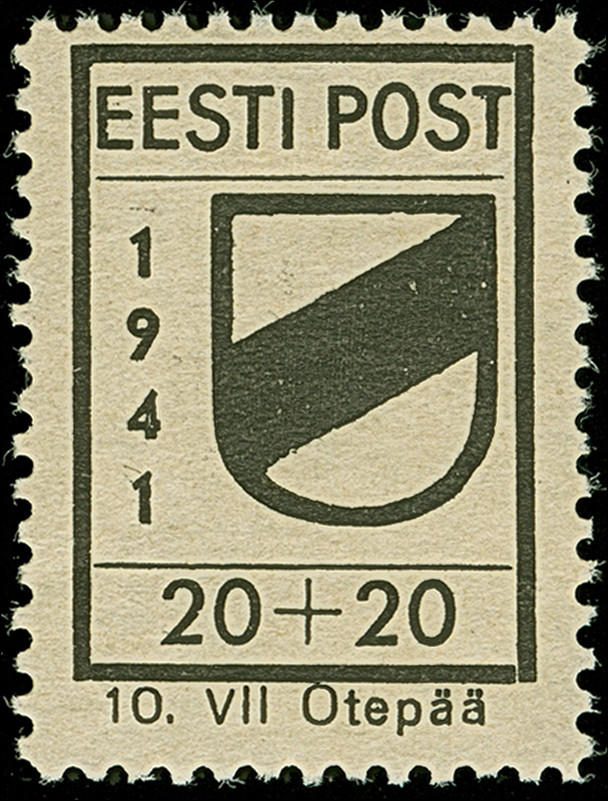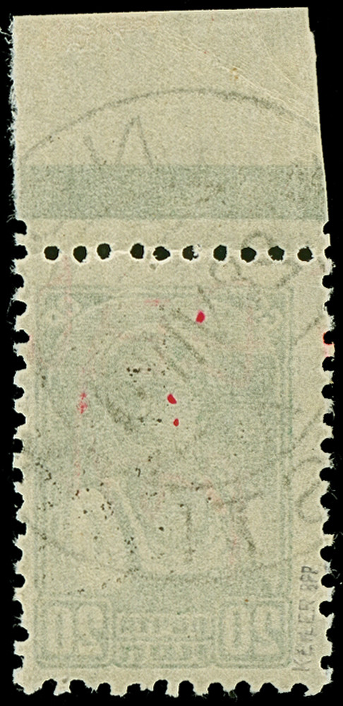 1941, “Eesti post”, handschriftlicher Aufdruck in roter Tinte: 20 Kopeken, Oberrandstück, farbfrisch und gut gezähnt, sauber und klar gestempelt, tadellos, eine der großen Seltenheiten, sign. Keiler BPP sowie Fotoattest Krischke (2008)