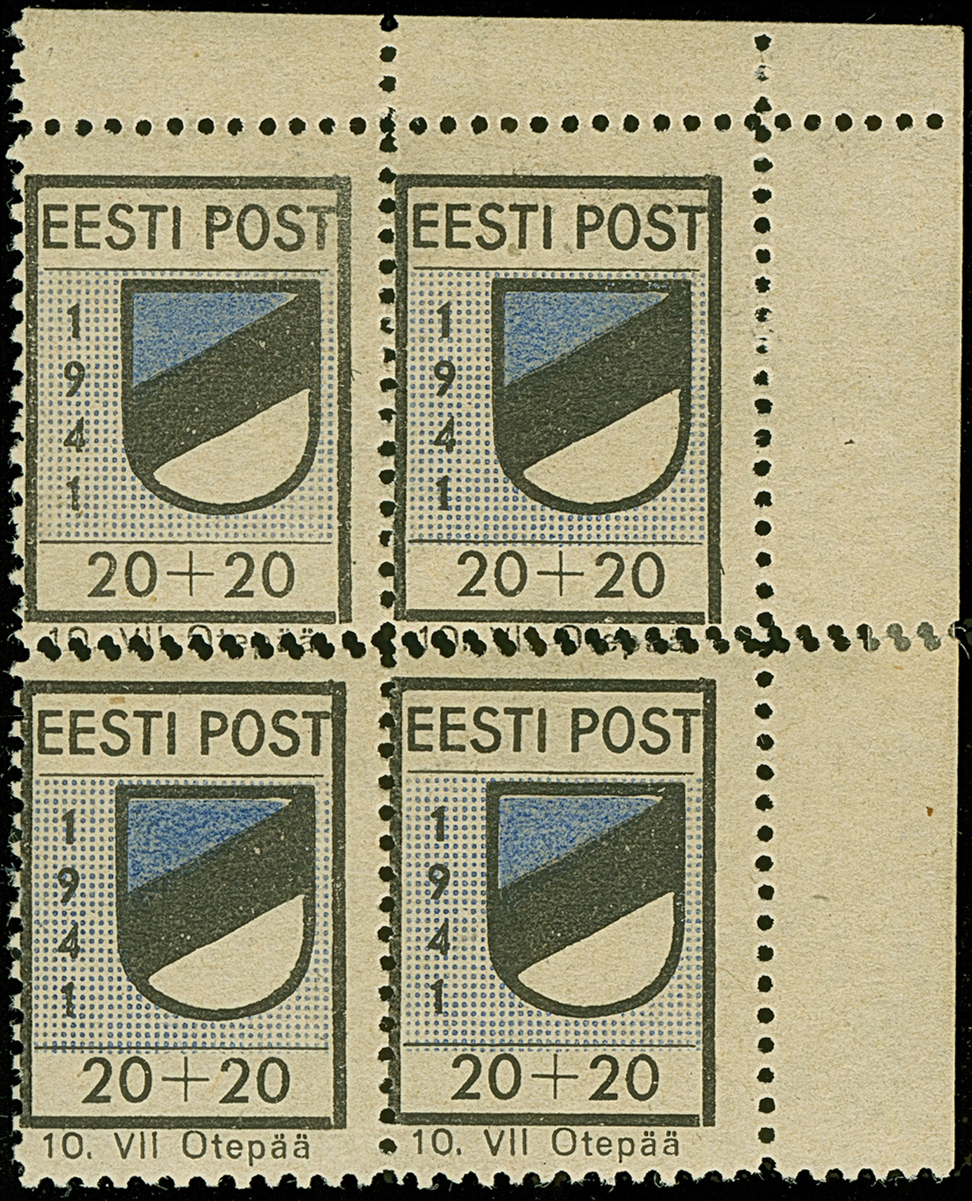 1941, Wappenschild 20 Kopeken, gezähnt, Type II, Viererblock aus der rechten oberen Bogenecke, zwischen beiden Markenreihen Doppelzähnung, postfrisch bzw. im Rand durch Falz gestützt, die linke obere Marken unten links einen kurzen Zahn, ansonsten in tadelloser Erhaltung. In dieser Form sehr selten, ProFi hat nur einen weiteren Viererblock in dieser Form registriert, Fotoattest Krischke BPP (1986)