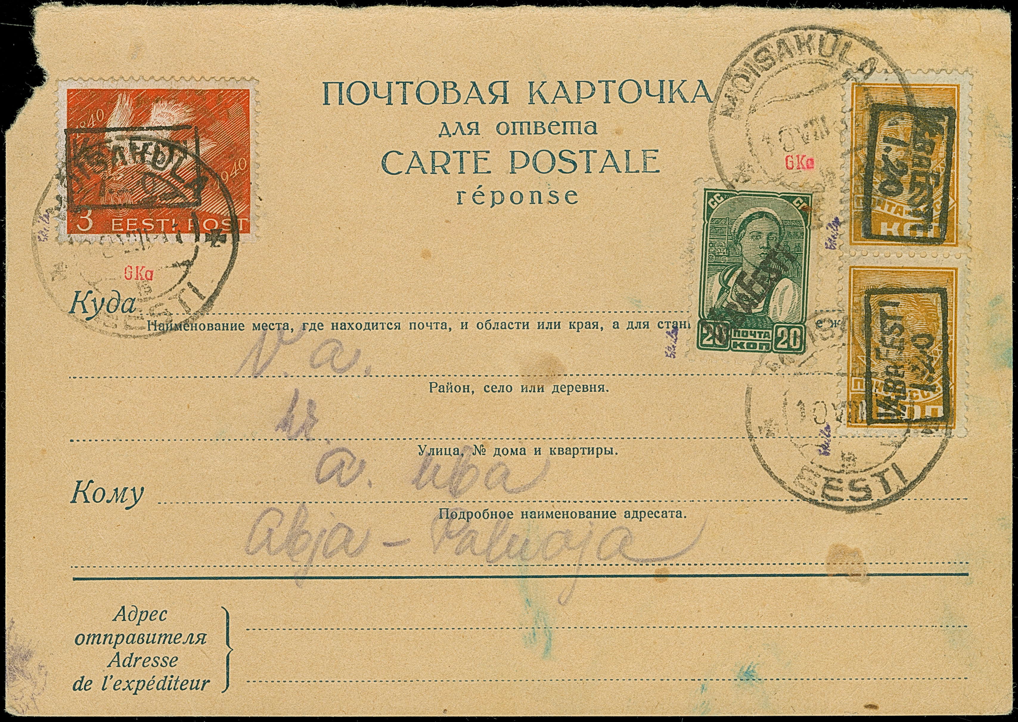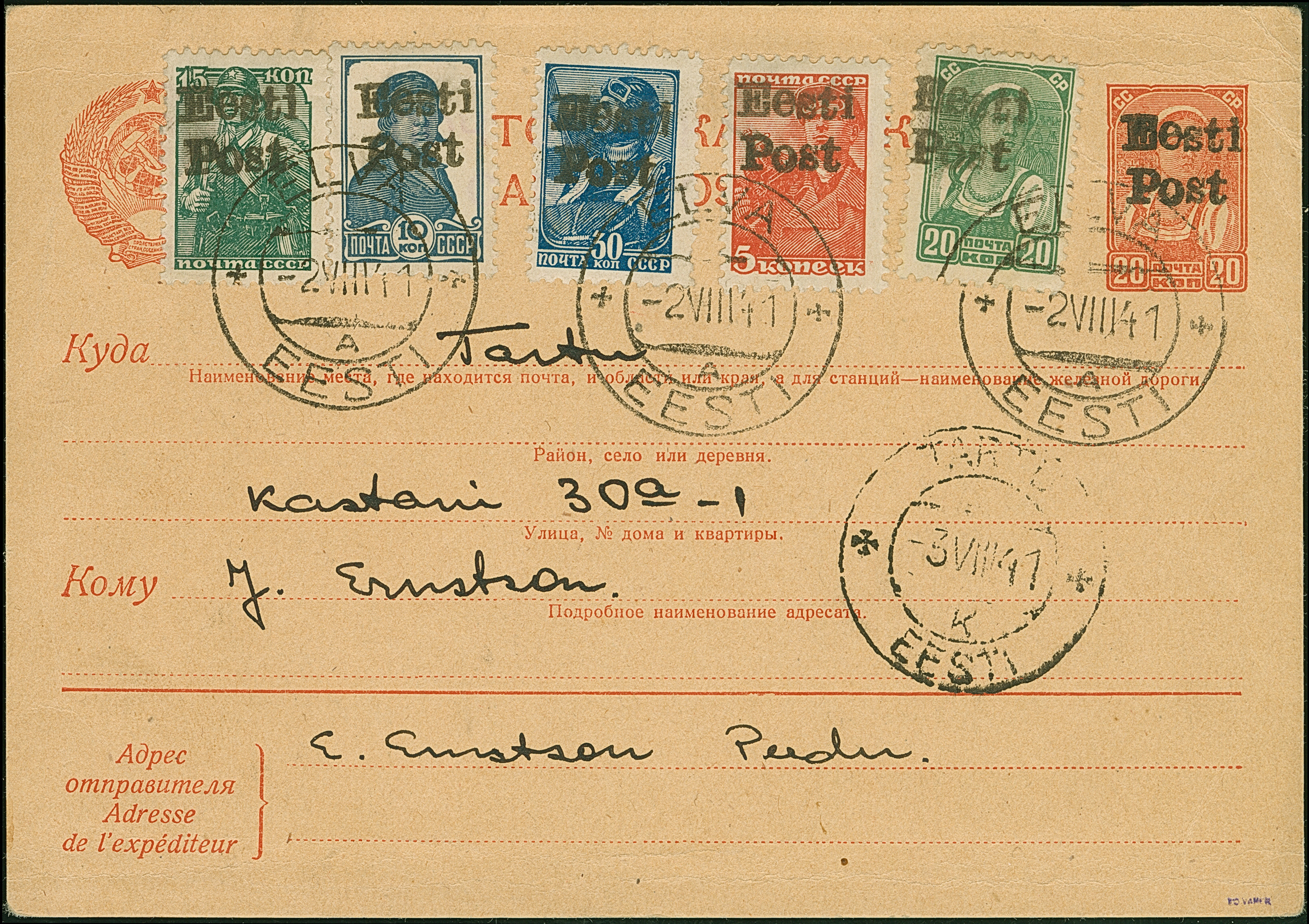 Ganszachenkarte 20 Kopeken mit 5-30 Kopeken als Zufrankatur, sauber ab “ELVA -2 VIII 41” nach Tartu mit vorderseitigem Ankunftsstempel "TARTU -3 VIII 41", die 20 Kopeken war vermutlich zur Kontrolle gelöst und ist leicht versetzt wieder aufgeklebt worden, die Karte rückseitig mit viel Text, bis auf die üblichen leichten Beförderungsspuren in einwandfreier Erhaltung, Bedarfspost aus Elwa ist nur in ganz wenigen Stücken bekannt, sign. Vaher und Fotoattest Löbbering BPP (2010)