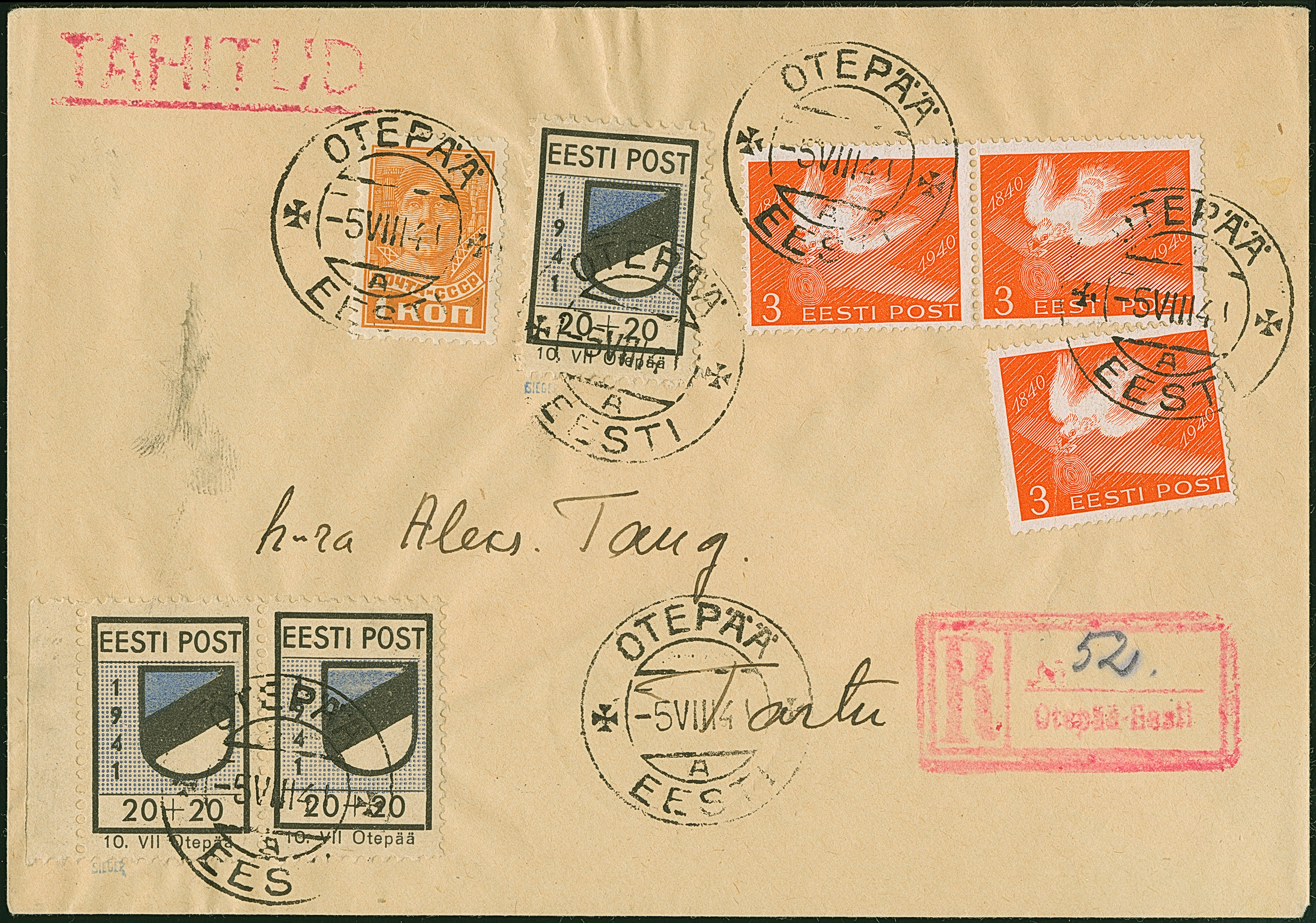 1941, Wappenschild 30 Kopeken, gezähnt, Type II, waagerechtes Seitenrandpaar und Einzelmarke, zusammen mit nicht gültiger russischer und estnischer Frankatur, mit Stempel “OTEPÄÄ -5 VIII 41” auf portogerechtem R-Brief nach Tartu mit Ankunftsstempel, tadellos, ein außergewöhnlicher und attraktiver Brief, sign. Sieger sowie Fotoattest Krischke BPP (1993)