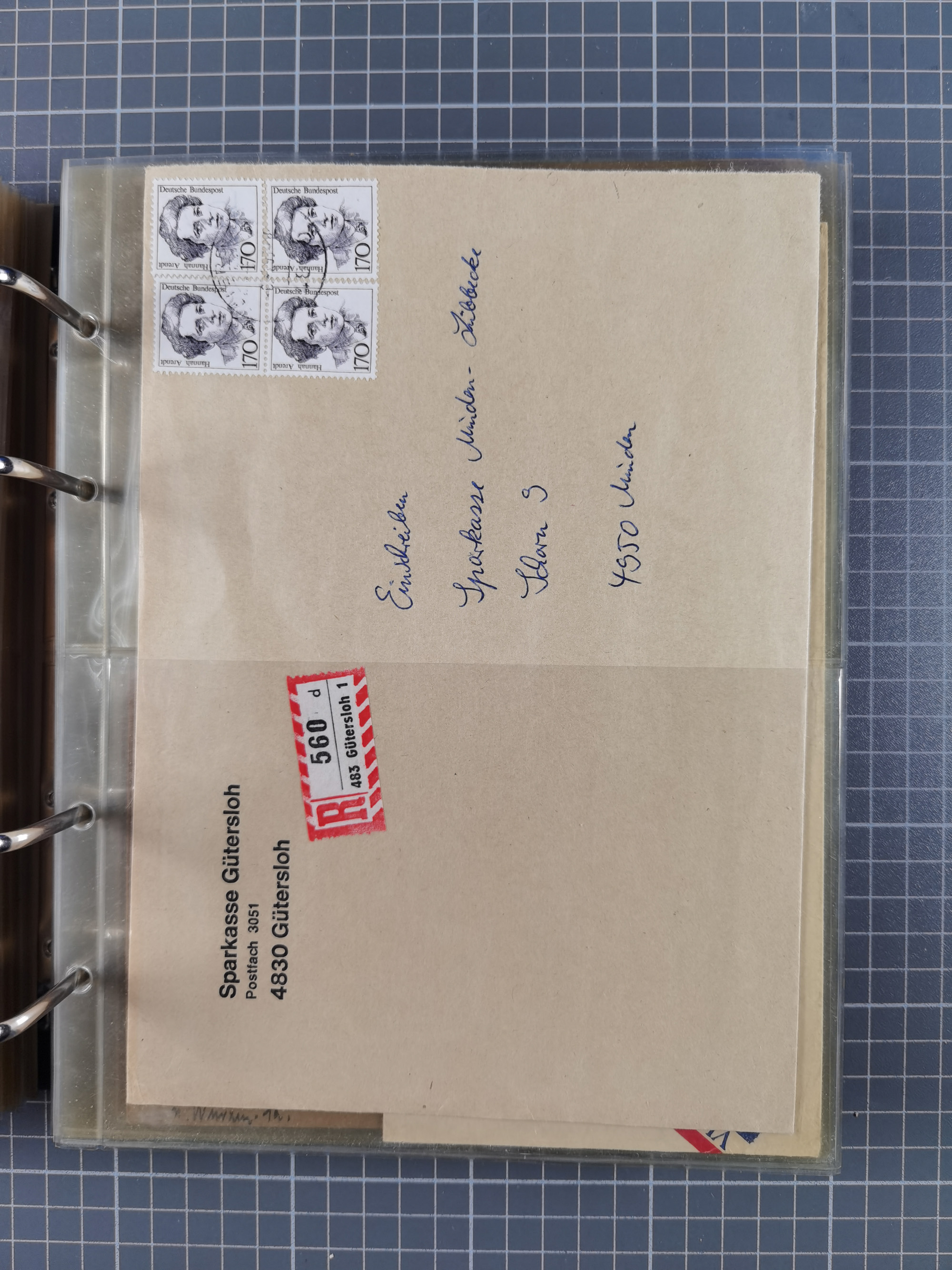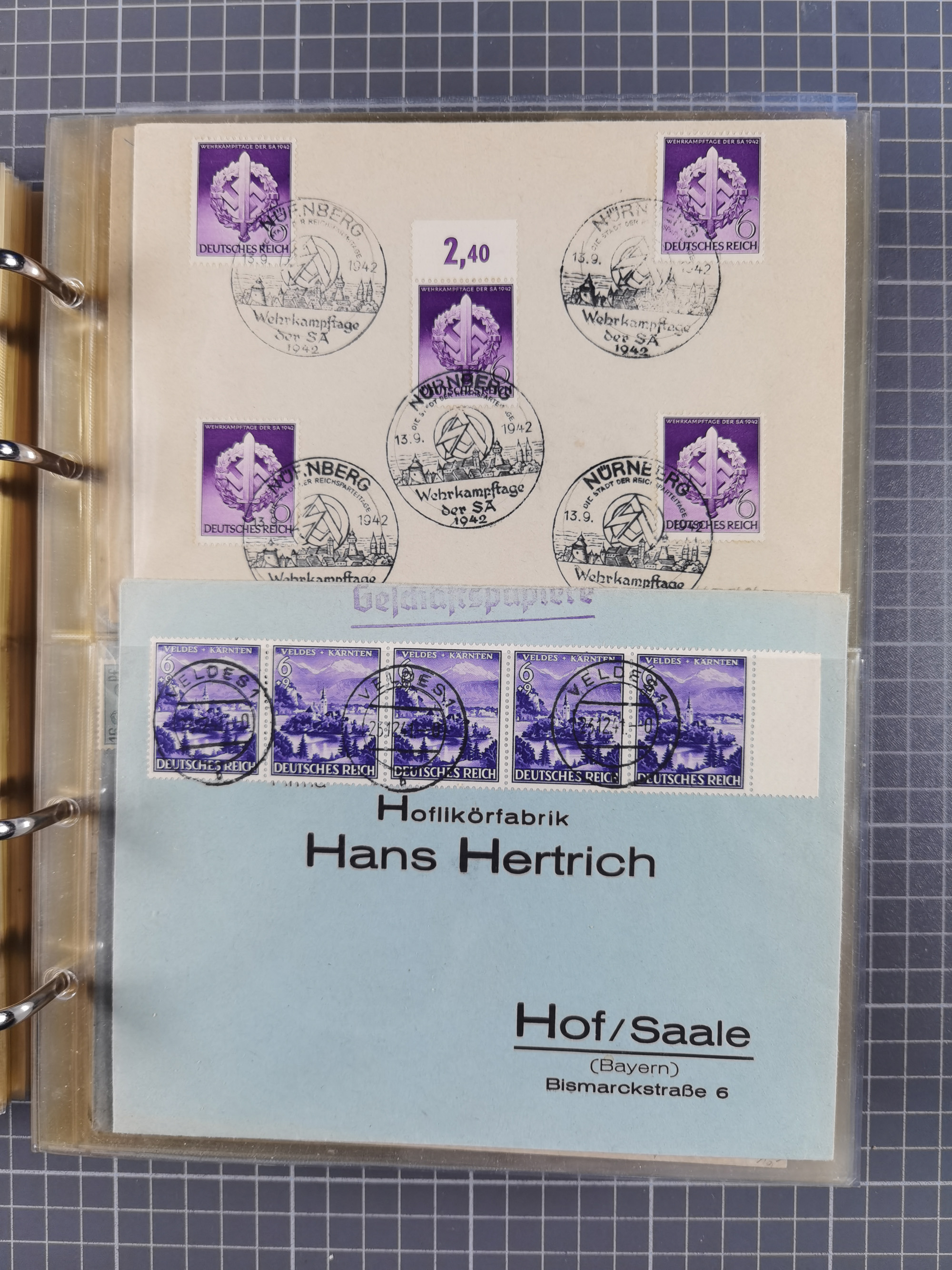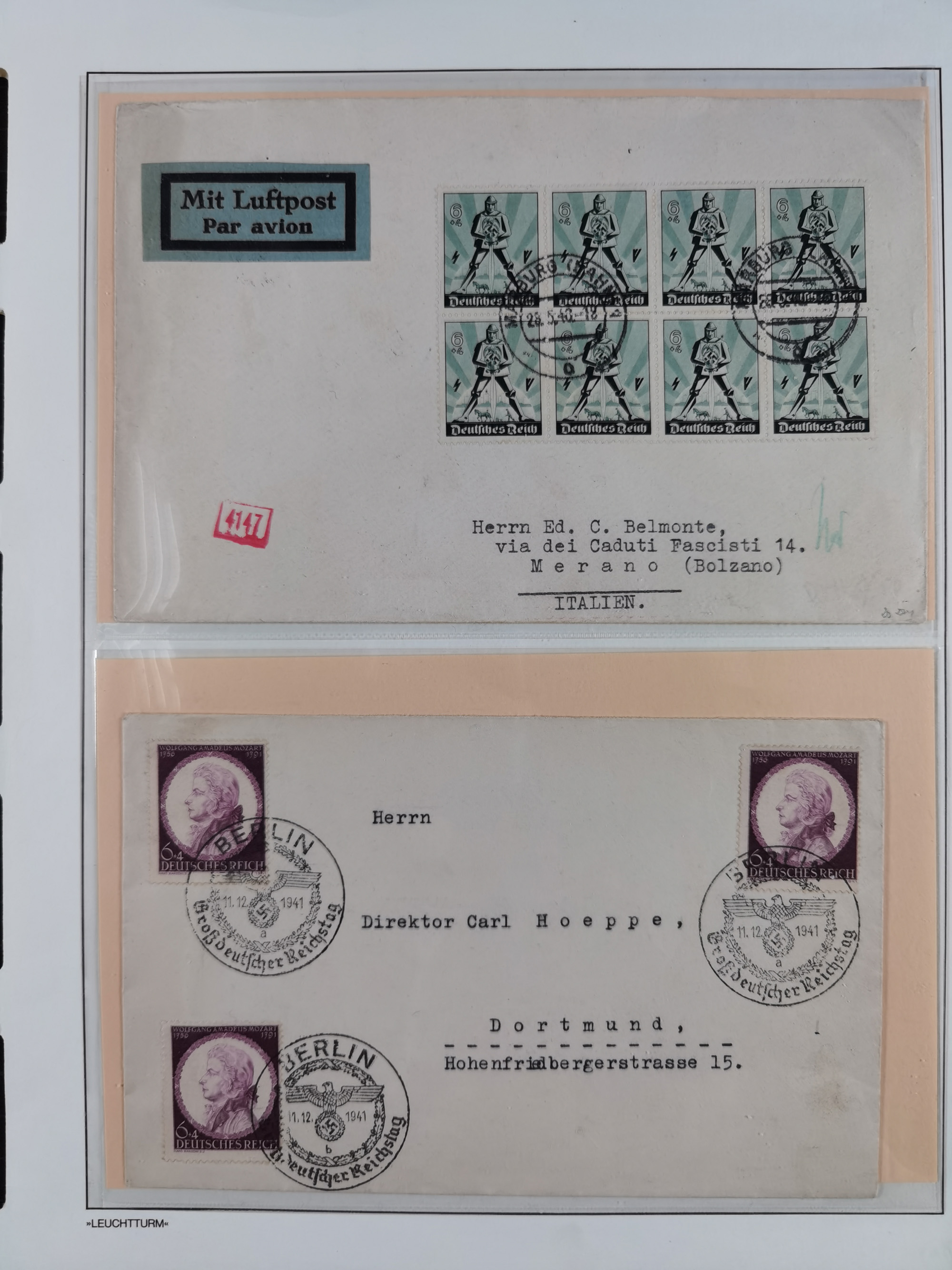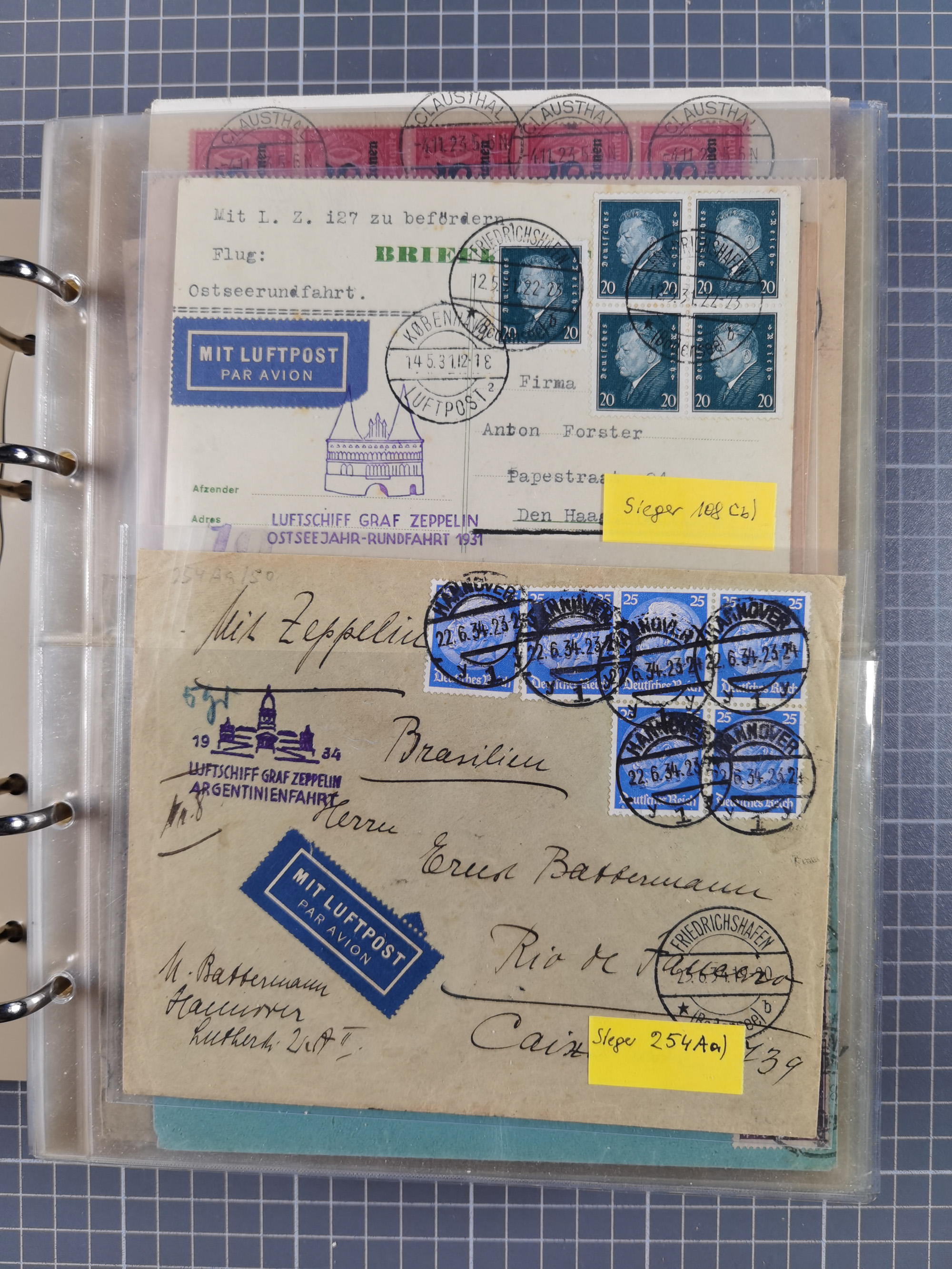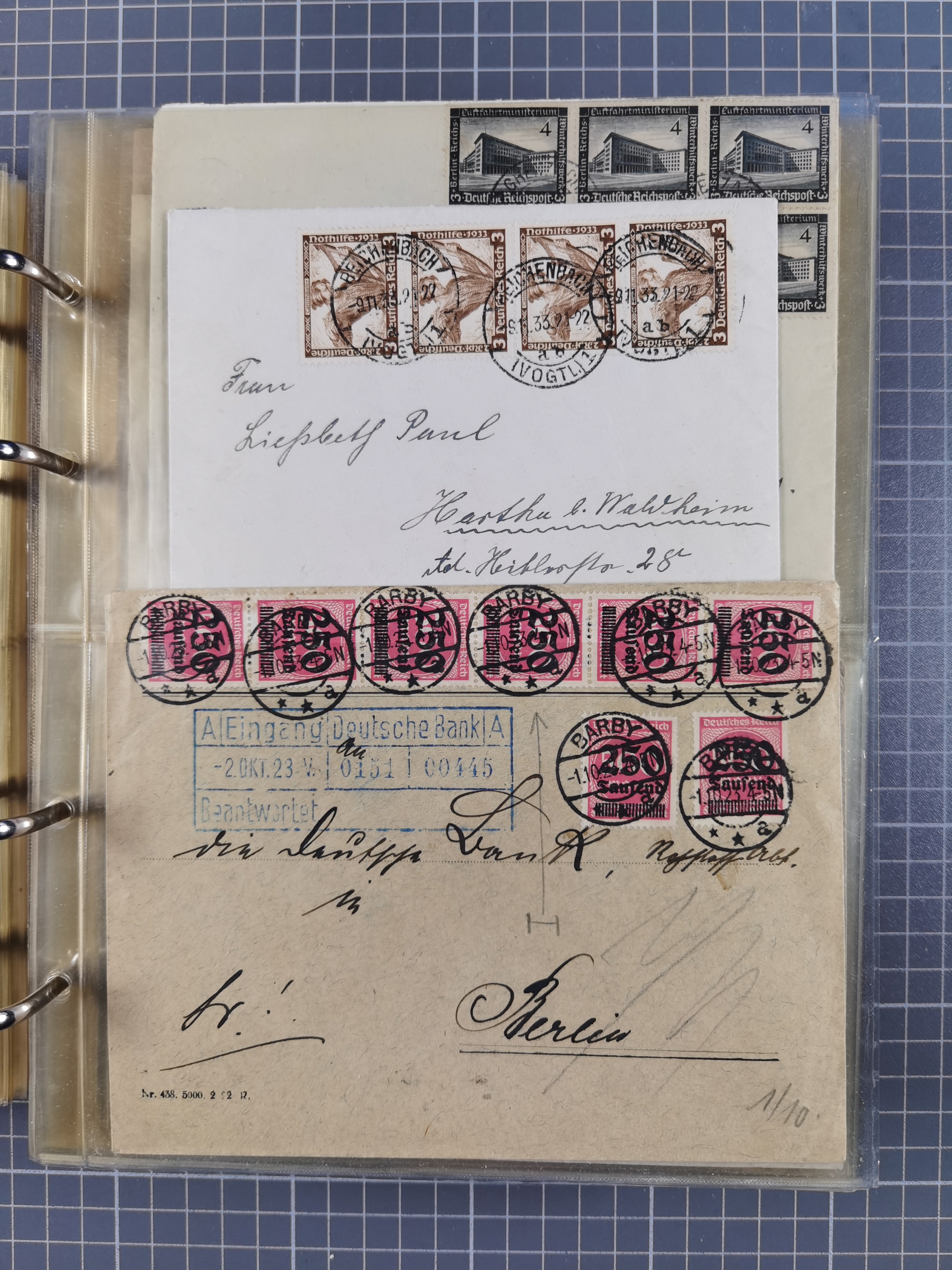 1903/80, Album mit 128 Mehrfachfrankaturen mit mindestens vier Marken, meistens aber mit mehr Marken (48 St. Ausland) dabei auch bessere Ausgaben z. B. Zepp-Brief Argentinienfahrt 1934 mit 5 x 35 Pf. Hindenburg und Zeppelin- Englandfahrt 1930 mit 6 x 25 Pf. Hindenburg, etwas unterschiedliche Erhaltung