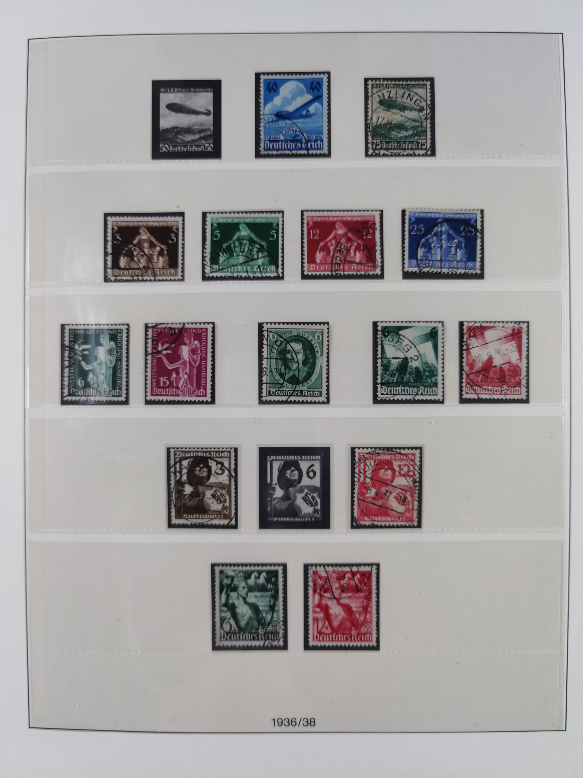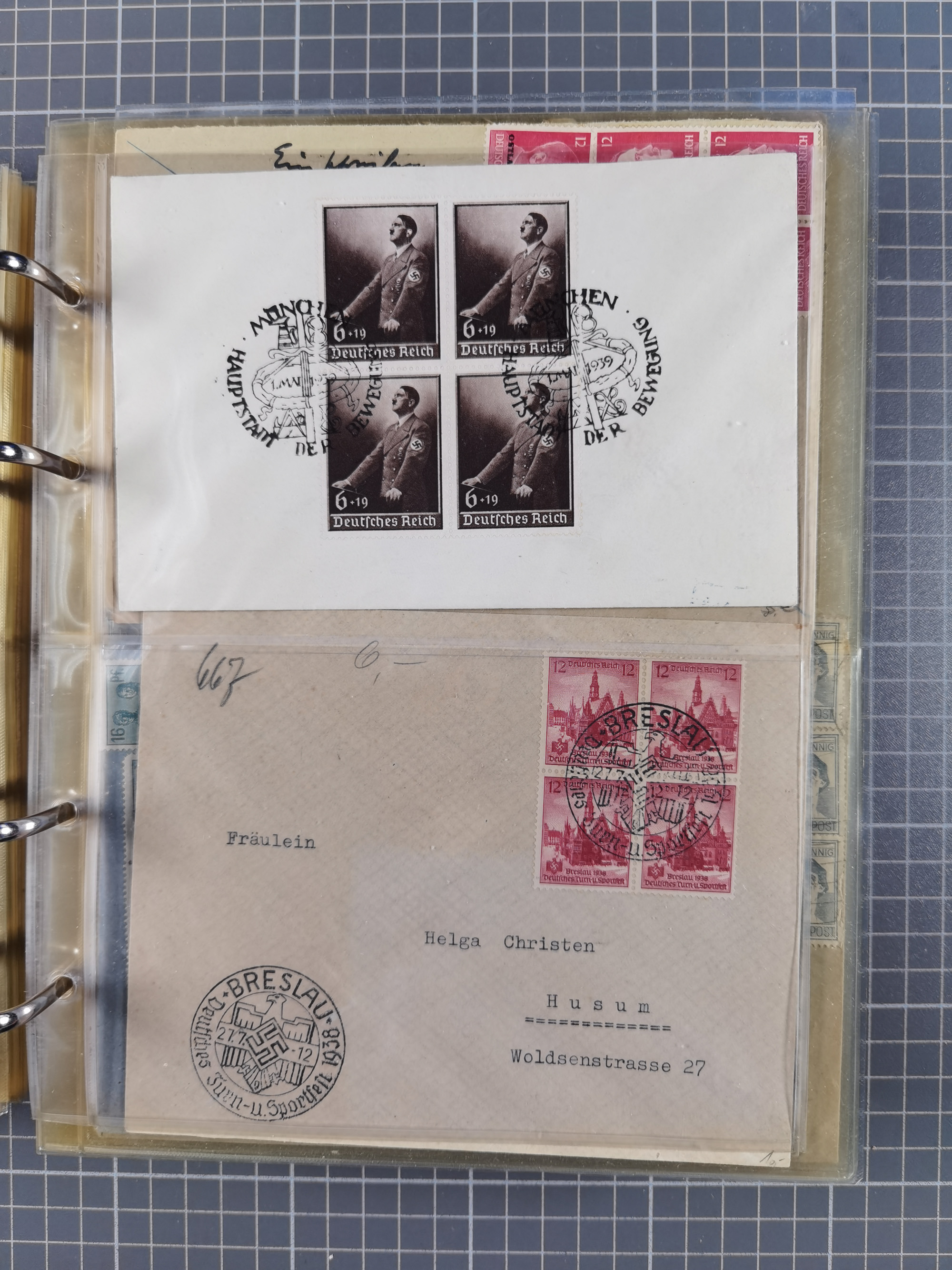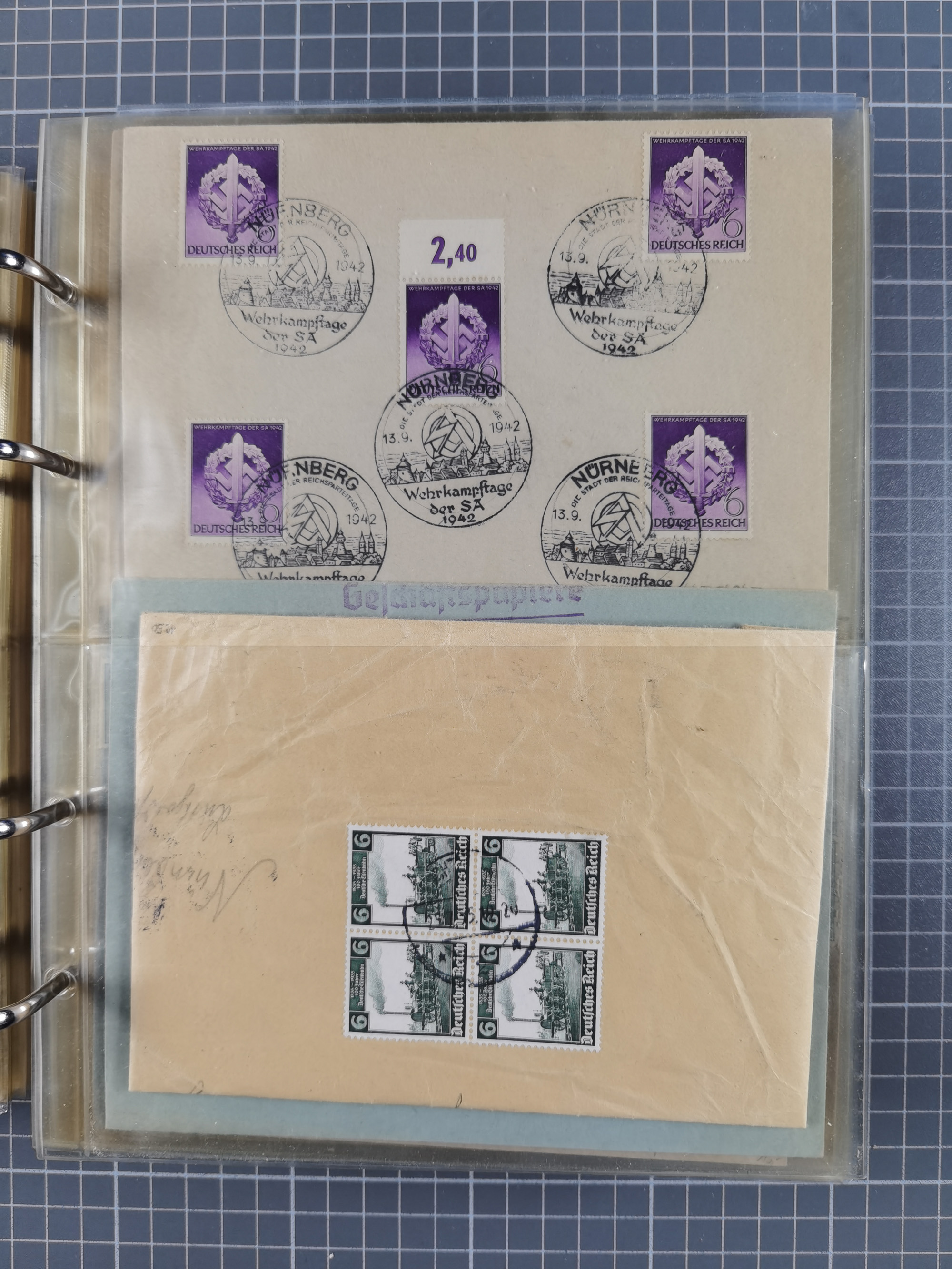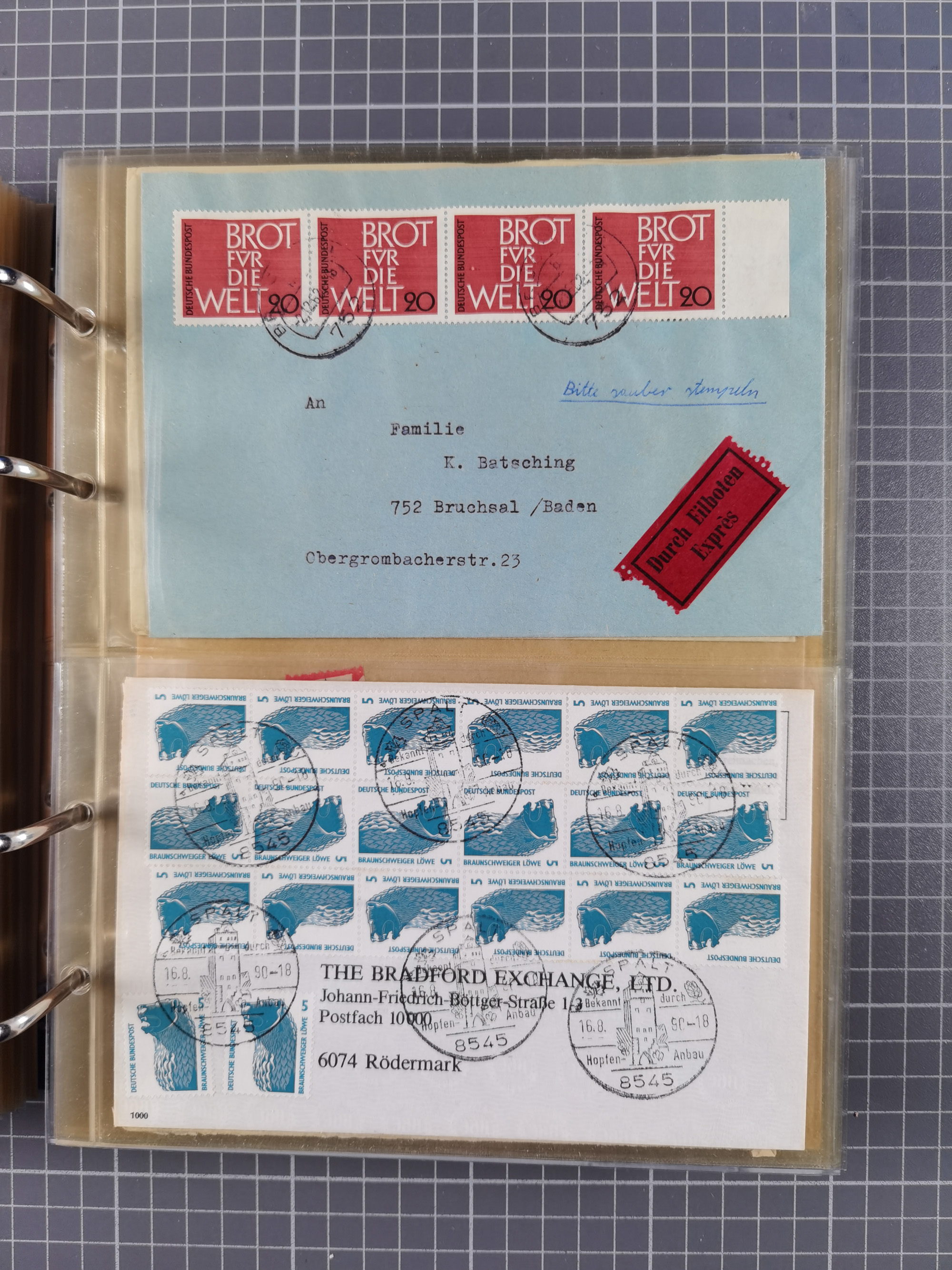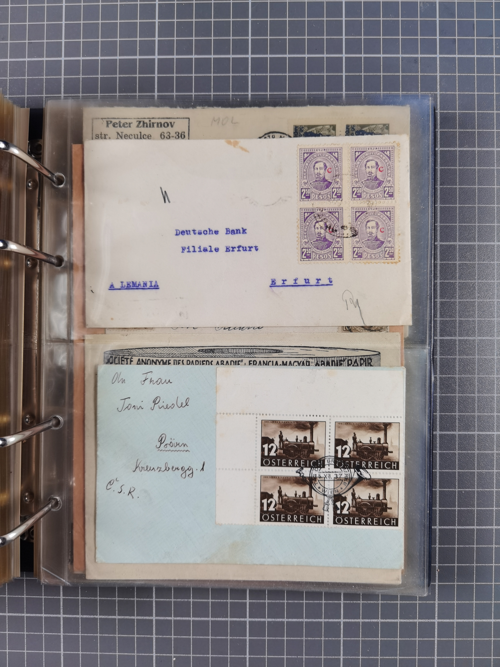 1903/80, Album mit 128 Mehrfachfrankaturen mit mindestens vier Marken, meistens aber mit mehr Marken (48 St. Ausland) dabei auch bessere Ausgaben z. B. Zepp-Brief Argentinienfahrt 1934 mit 5 x 35 Pf. Hindenburg und Zeppelin- Englandfahrt 1930 mit 6 x 25 Pf. Hindenburg, etwas unterschiedliche Erhaltung