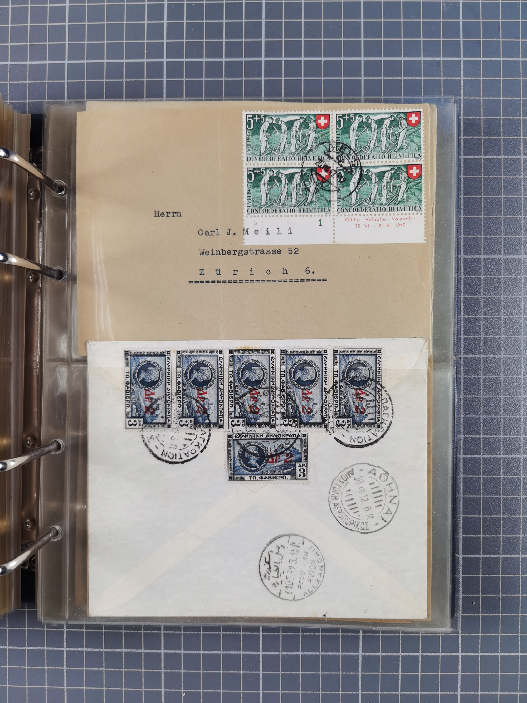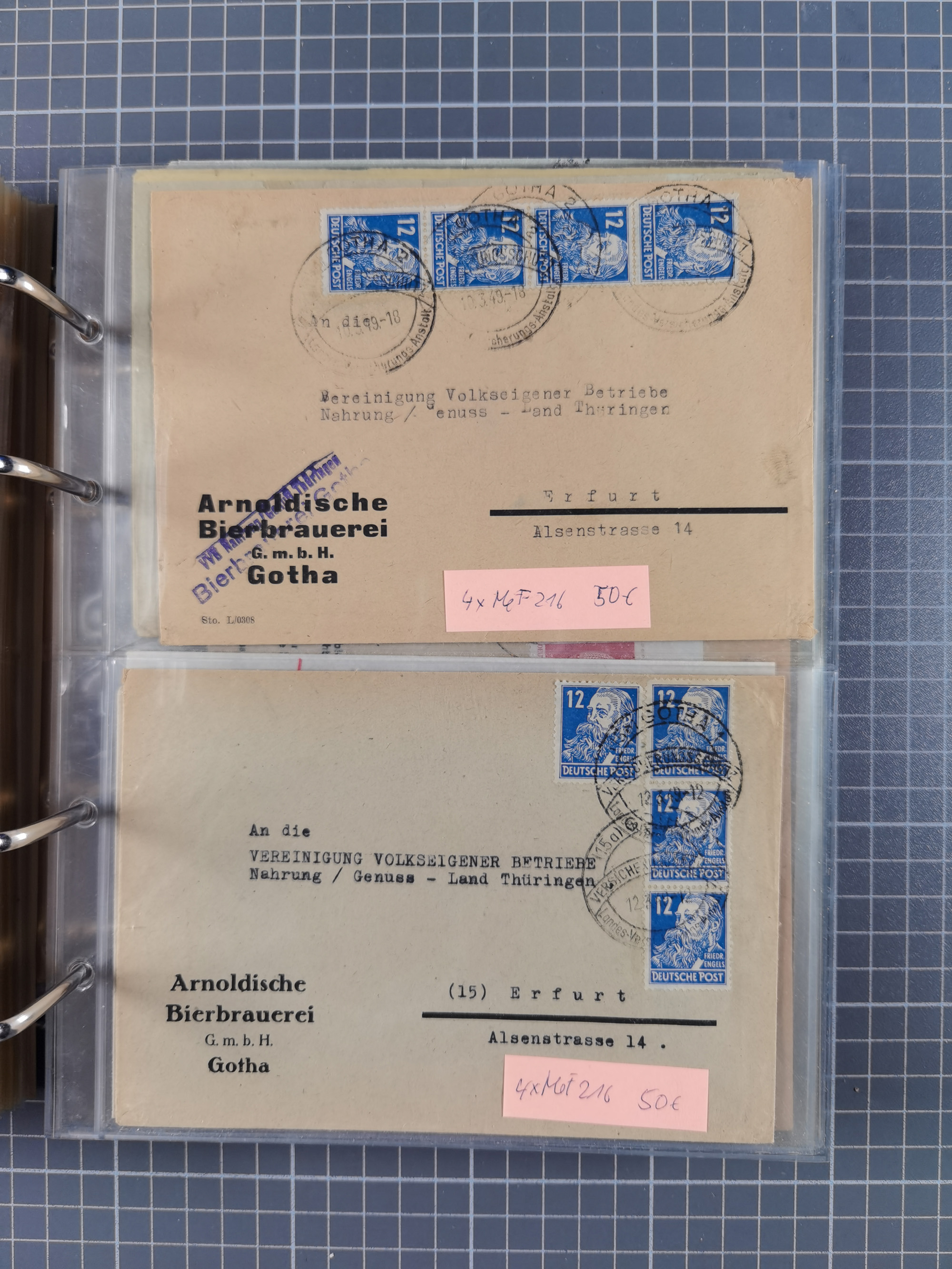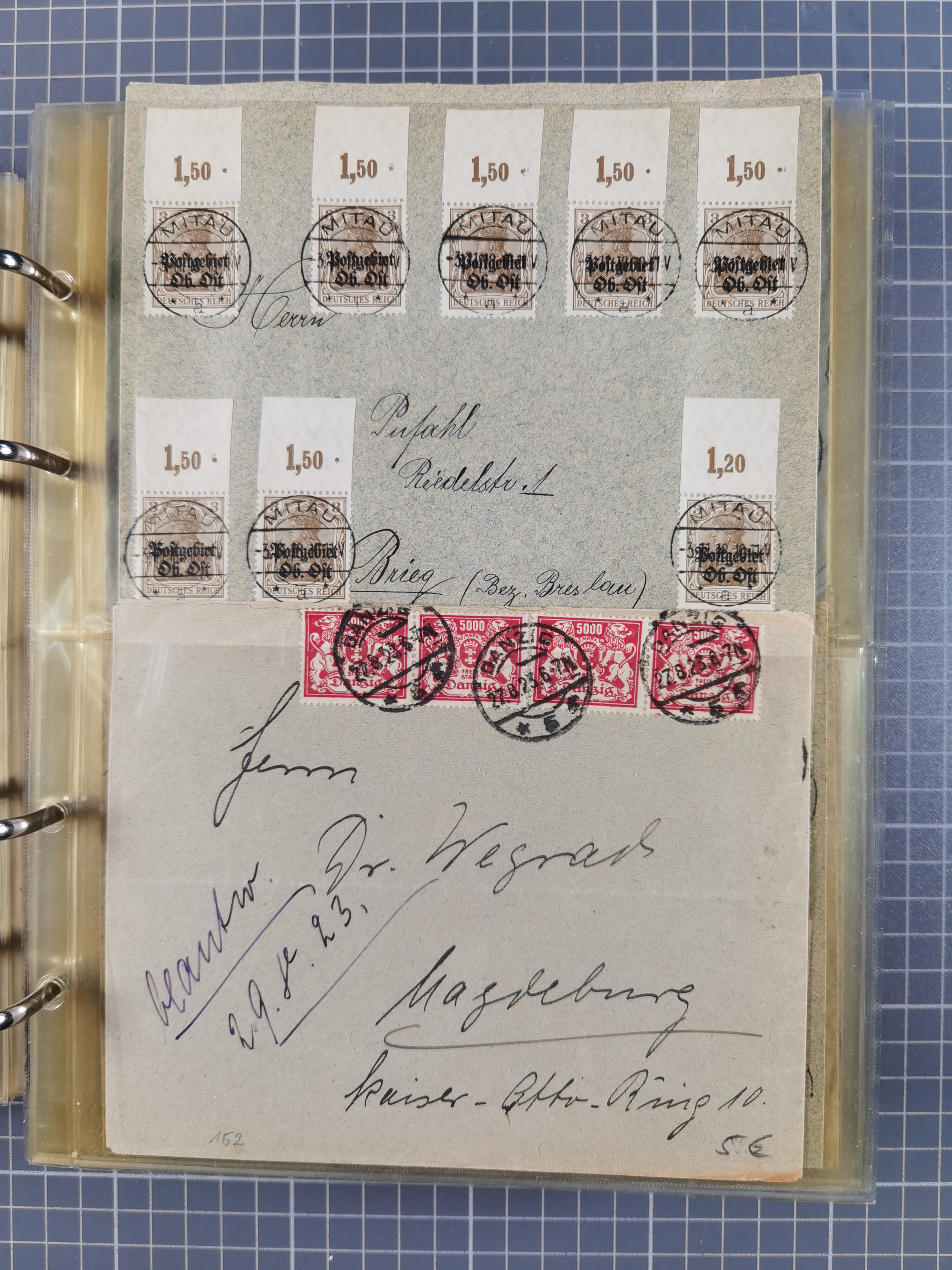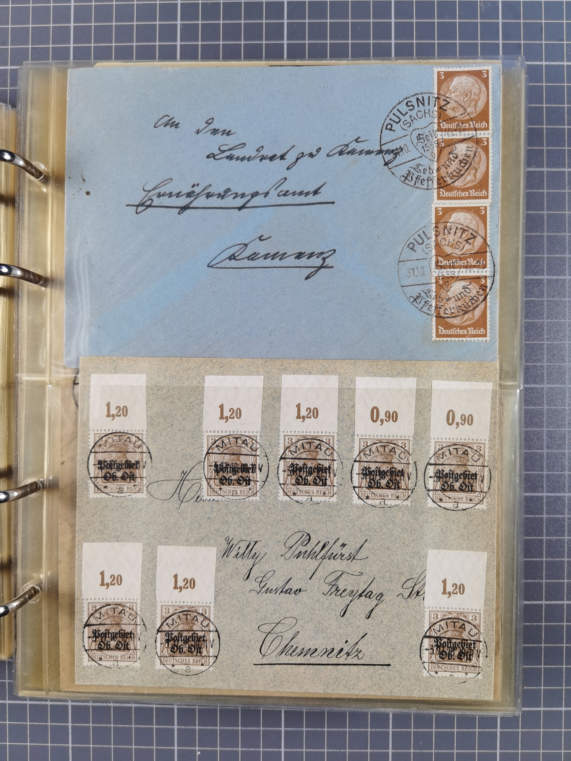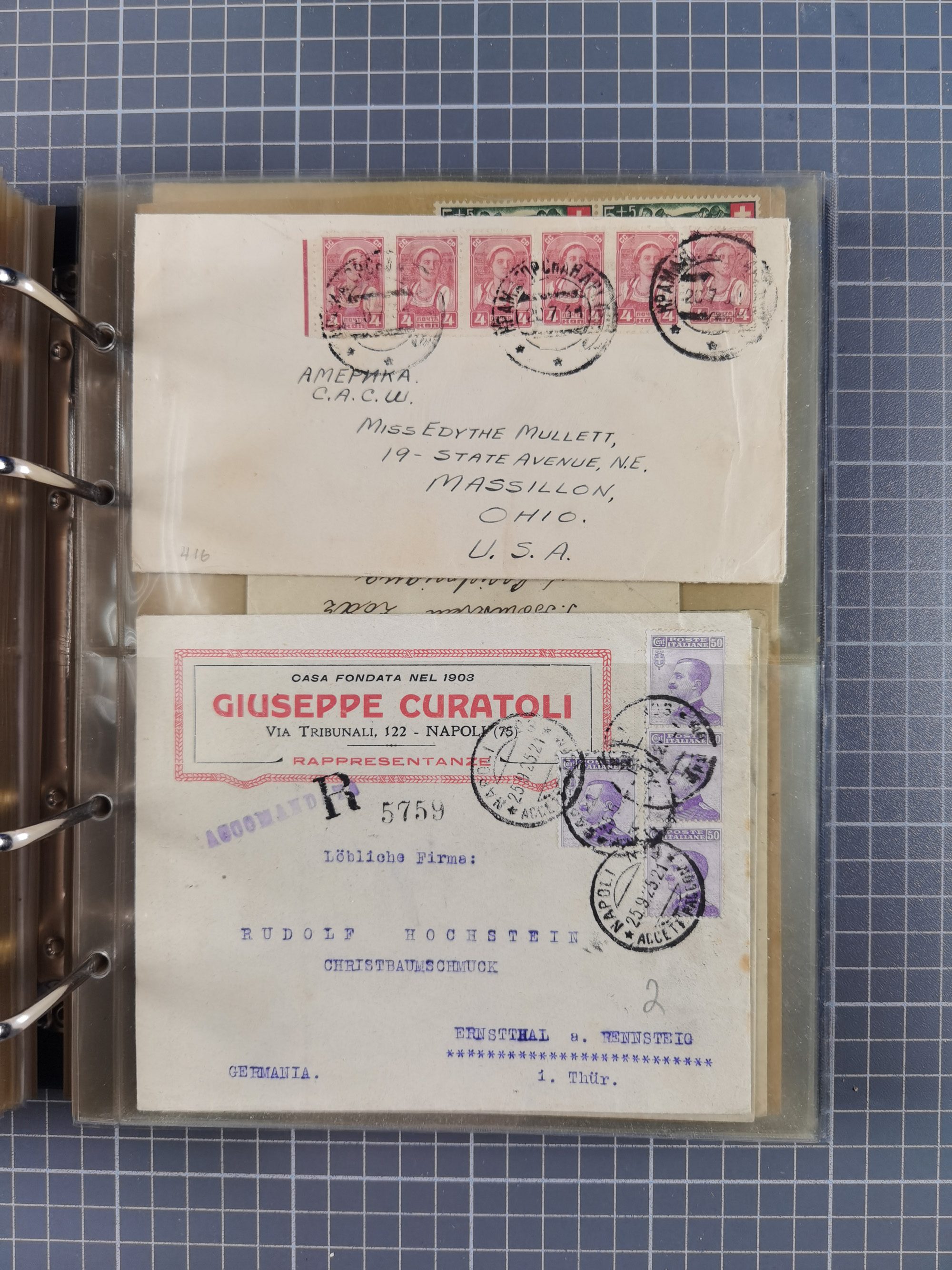 1903/80, Album mit 128 Mehrfachfrankaturen mit mindestens vier Marken, meistens aber mit mehr Marken (48 St. Ausland) dabei auch bessere Ausgaben z. B. Zepp-Brief Argentinienfahrt 1934 mit 5 x 35 Pf. Hindenburg und Zeppelin- Englandfahrt 1930 mit 6 x 25 Pf. Hindenburg, etwas unterschiedliche Erhaltung