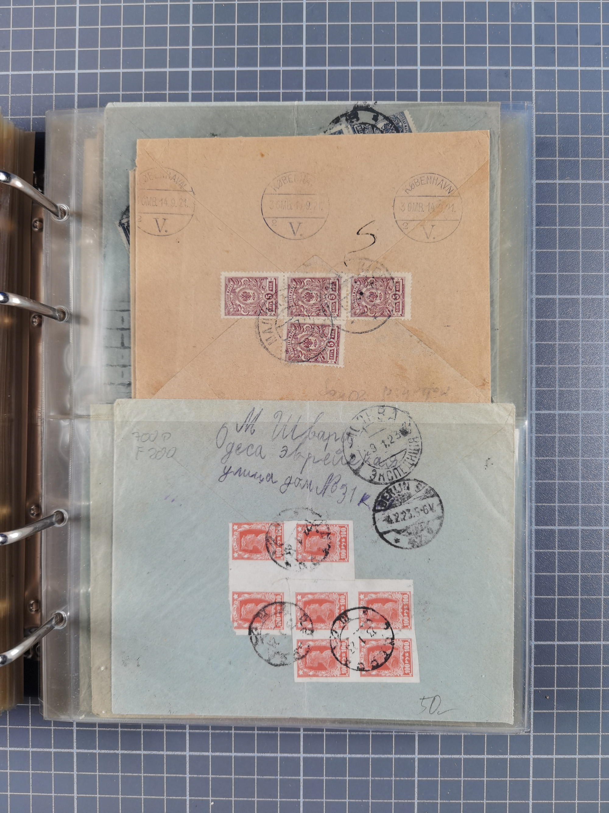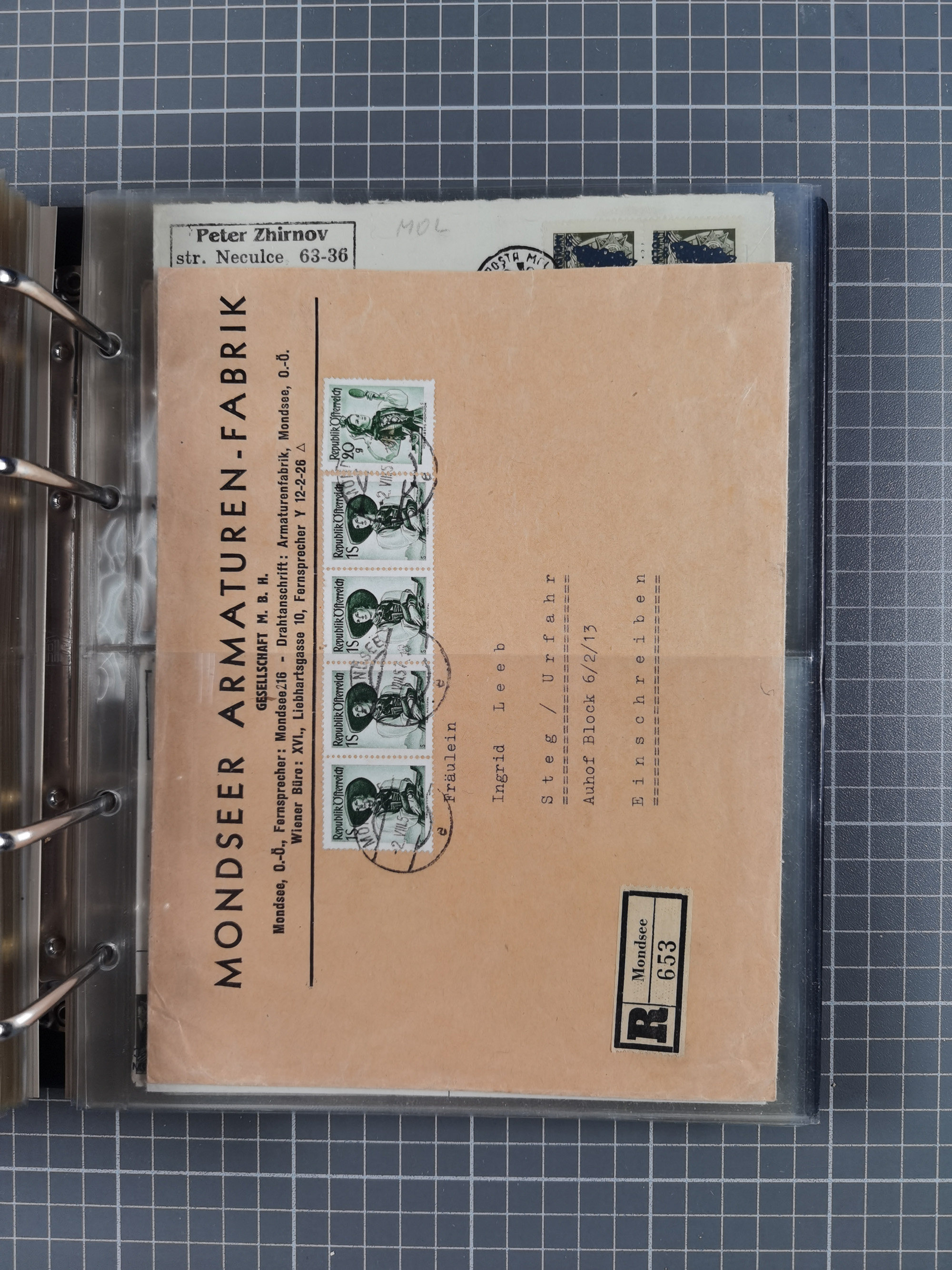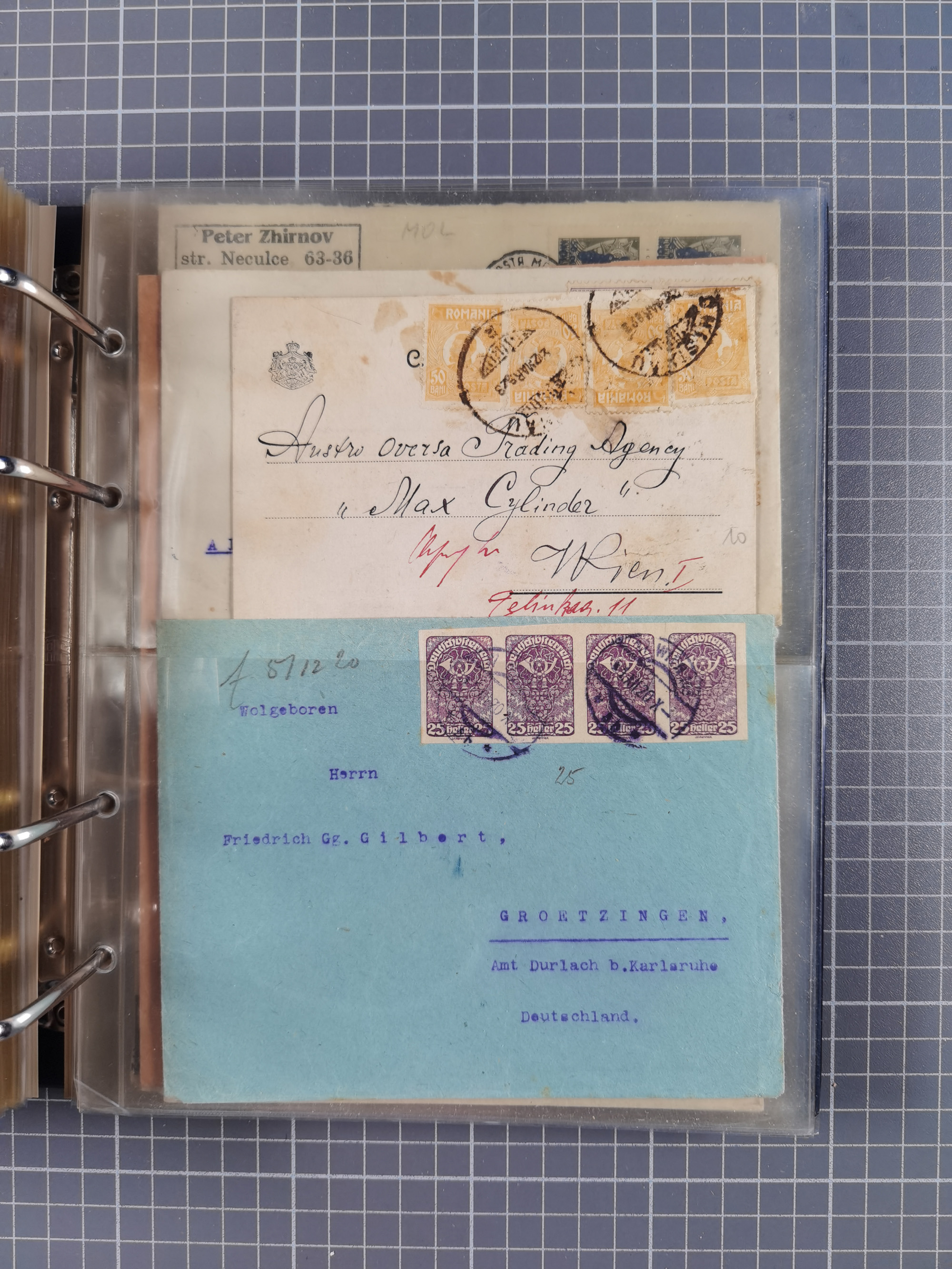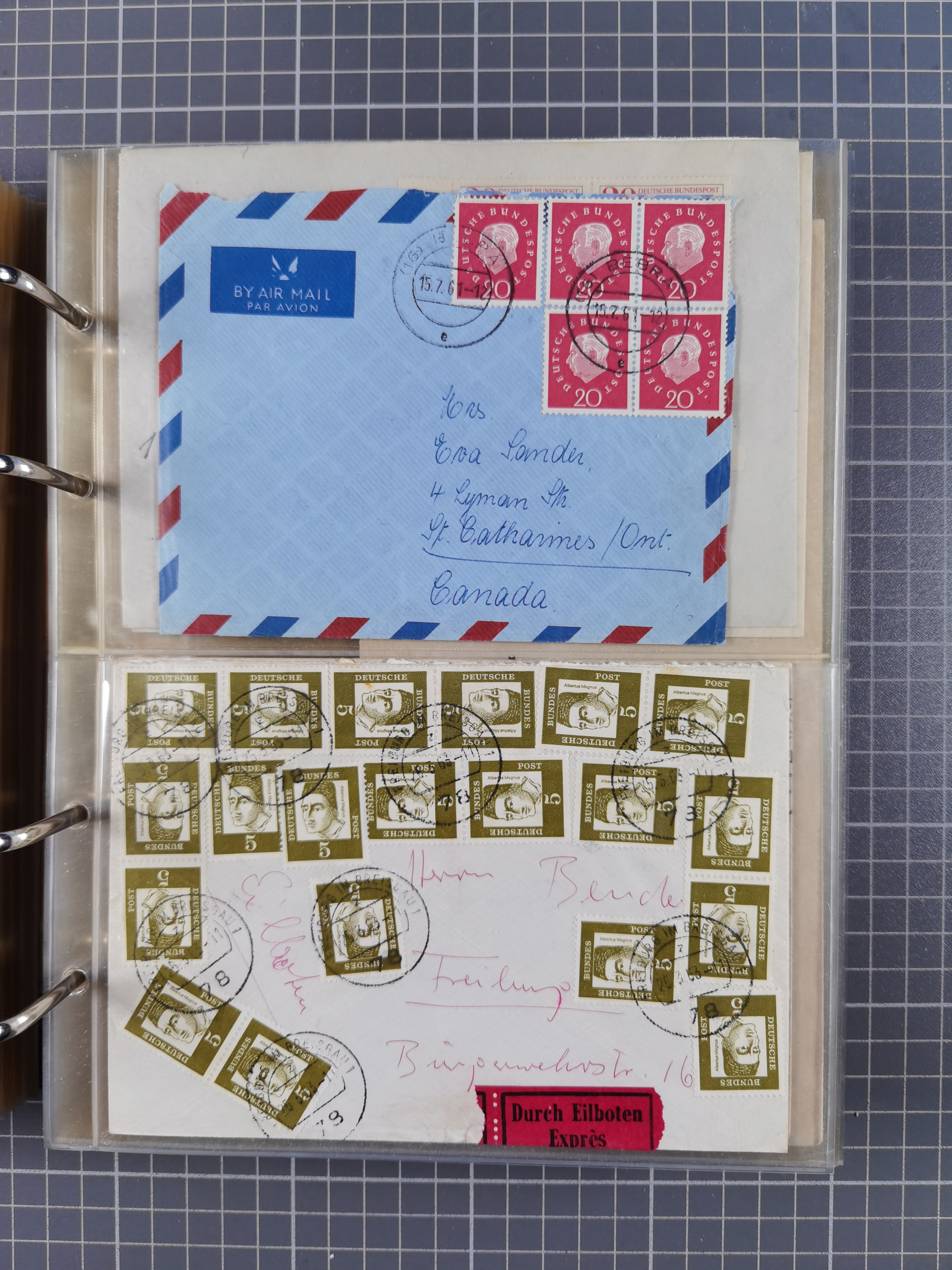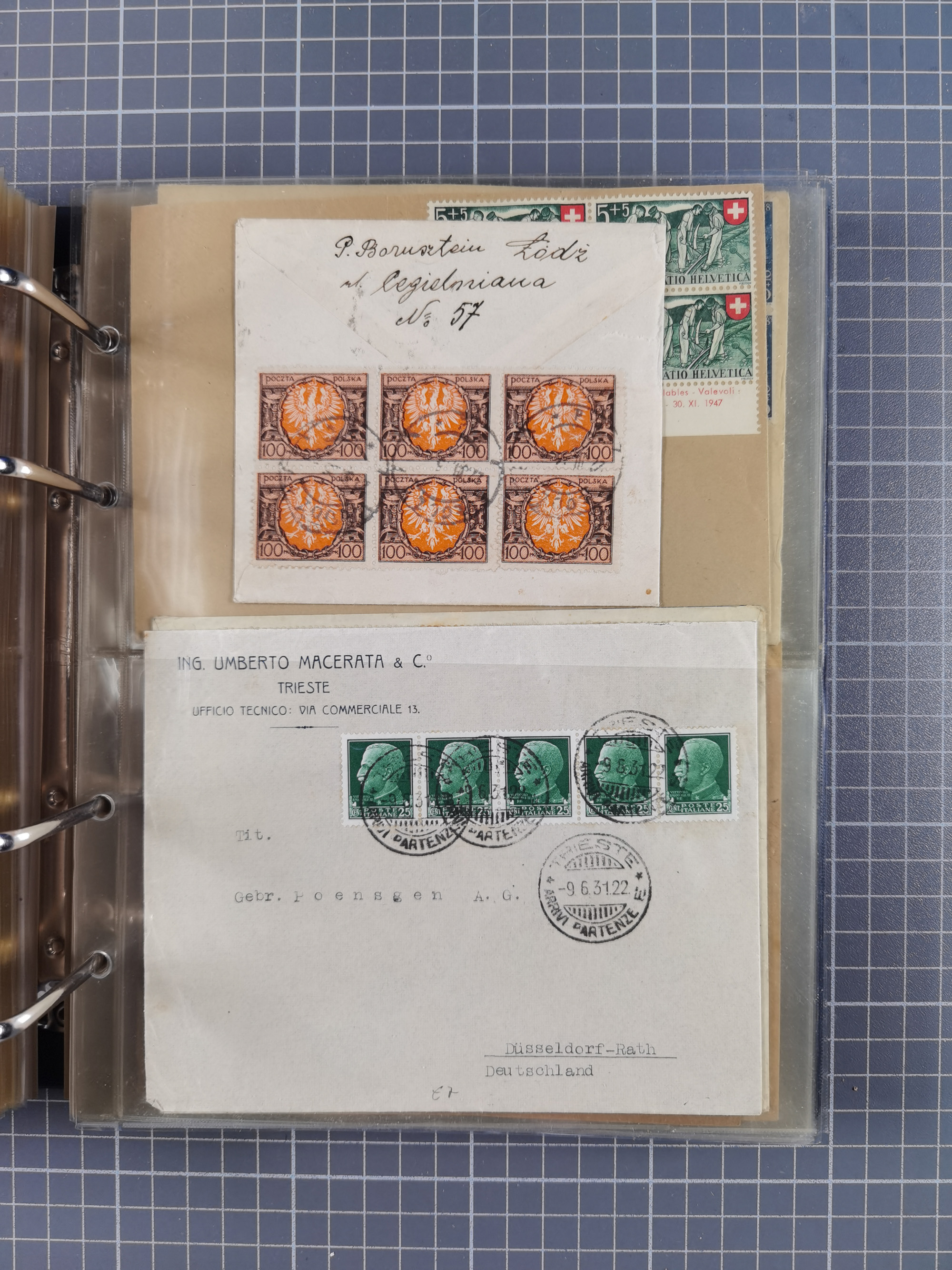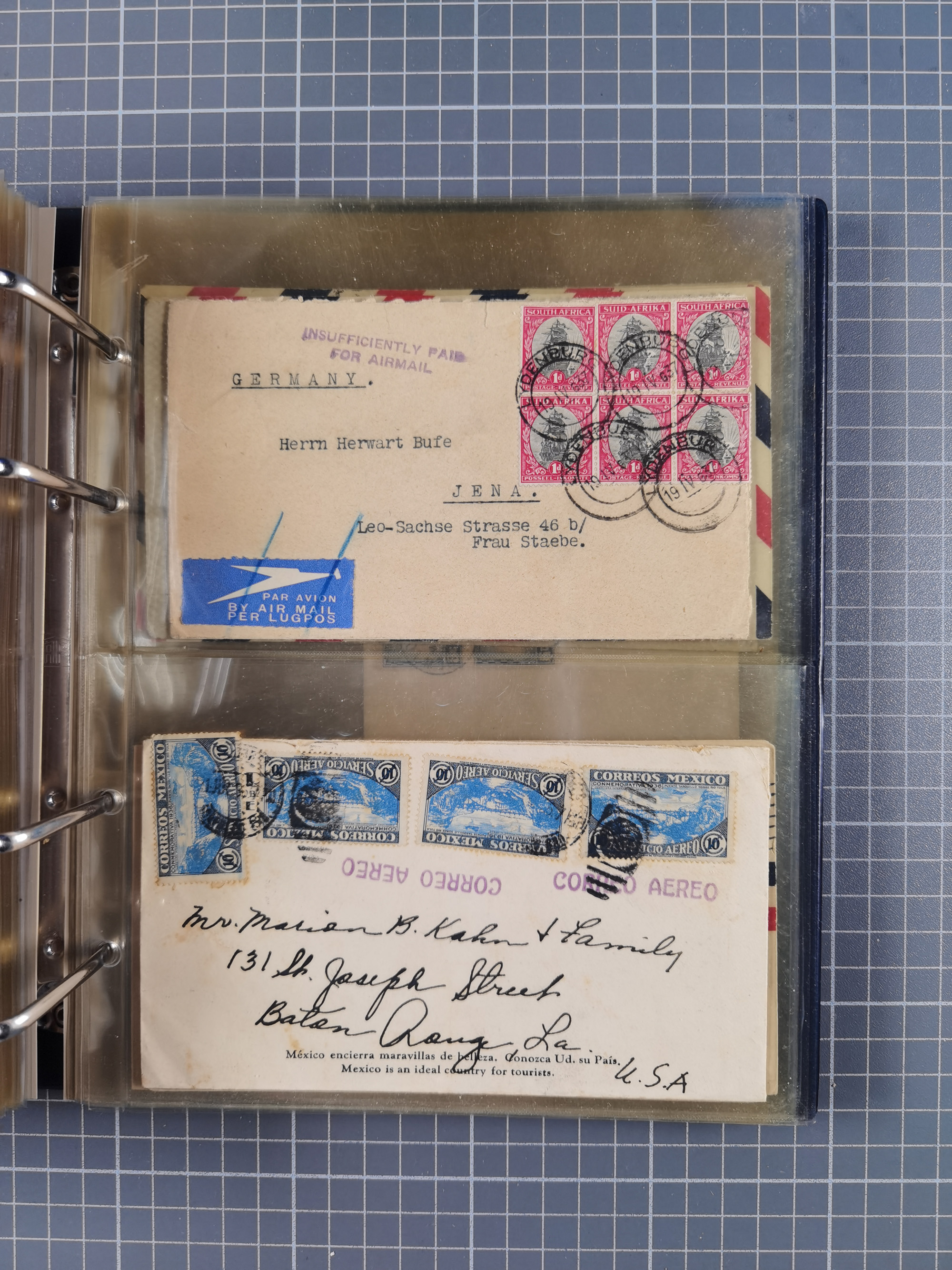 1903/80, Album mit 128 Mehrfachfrankaturen mit mindestens vier Marken, meistens aber mit mehr Marken (48 St. Ausland) dabei auch bessere Ausgaben z. B. Zepp-Brief Argentinienfahrt 1934 mit 5 x 35 Pf. Hindenburg und Zeppelin- Englandfahrt 1930 mit 6 x 25 Pf. Hindenburg, etwas unterschiedliche Erhaltung