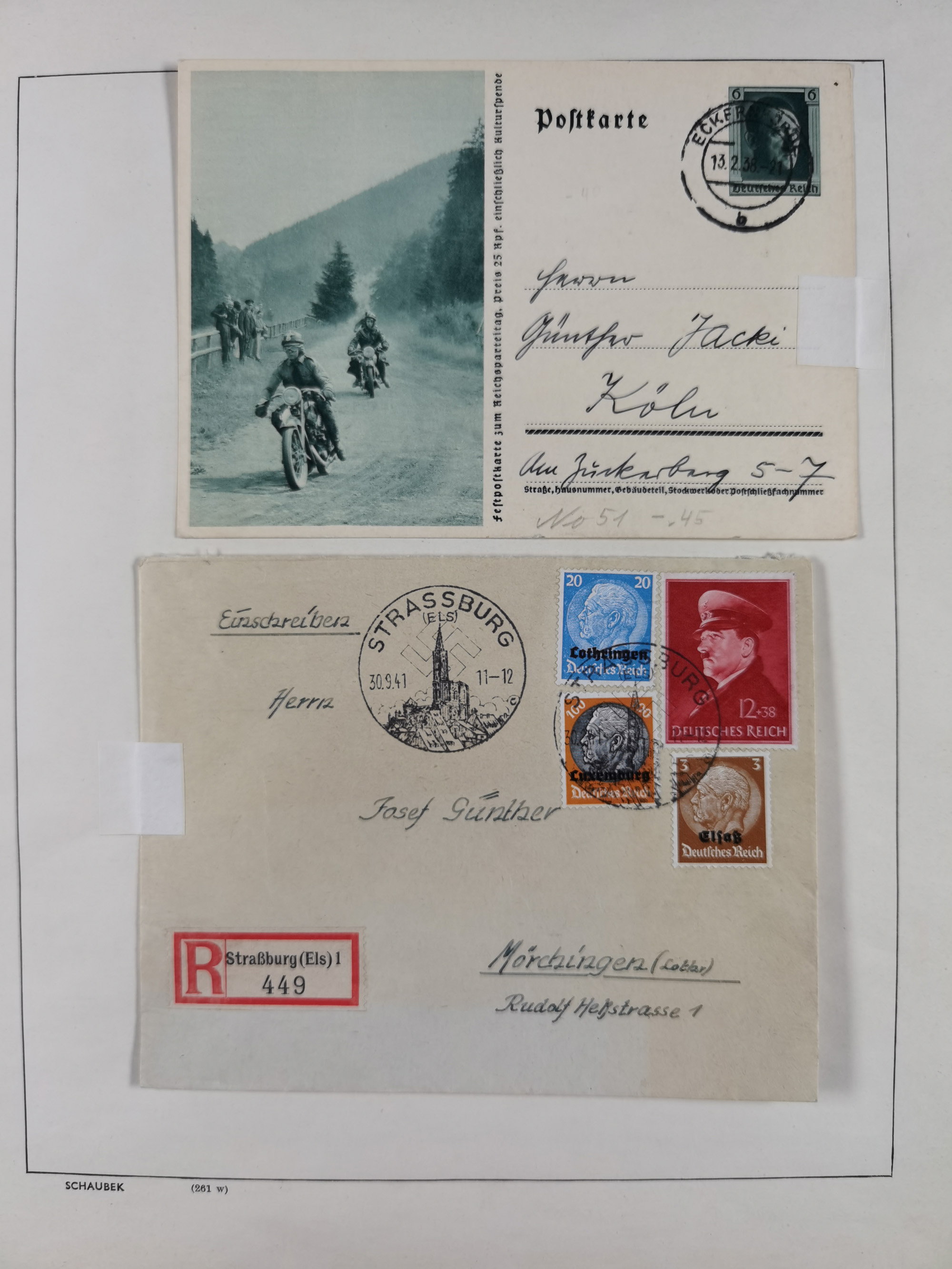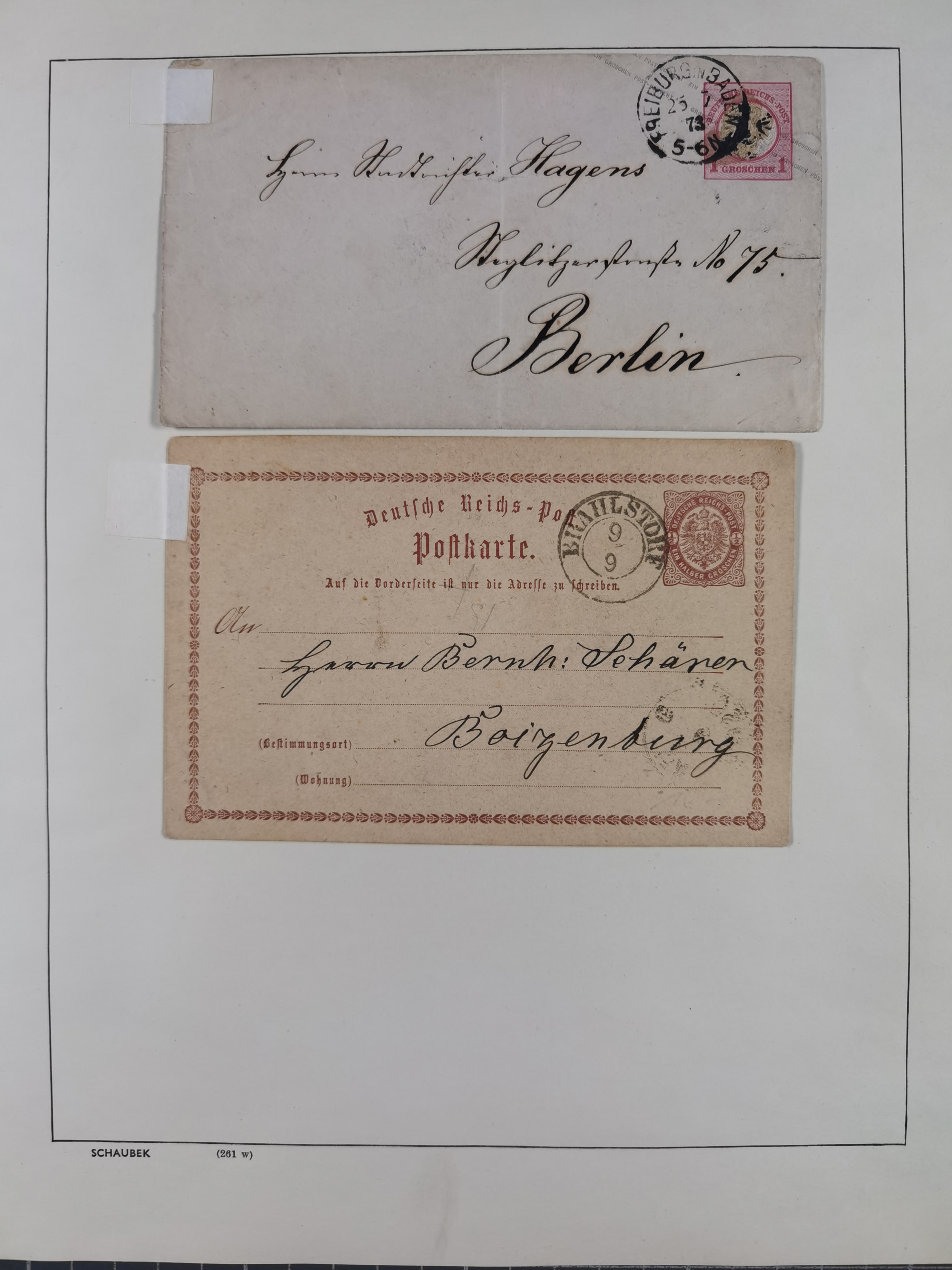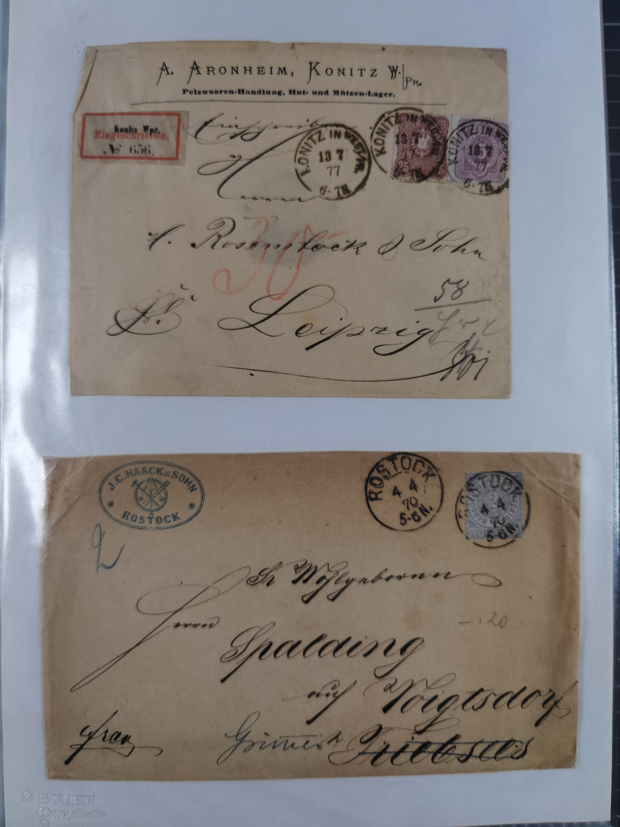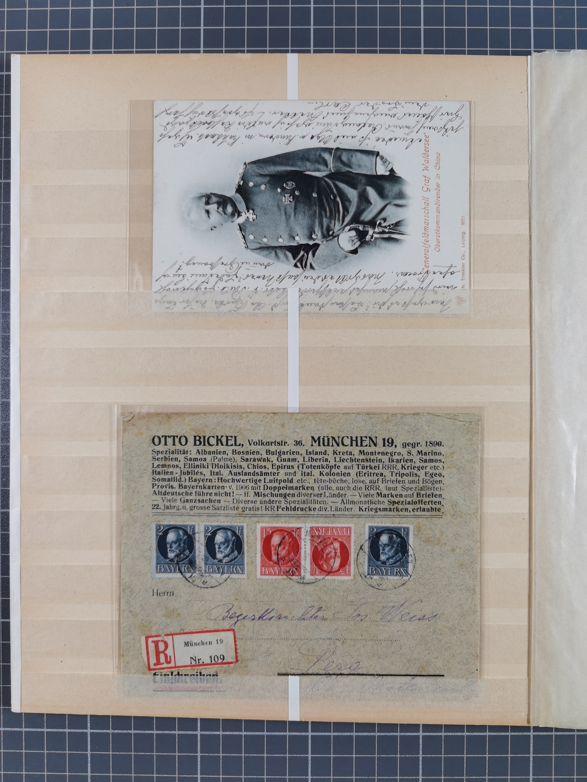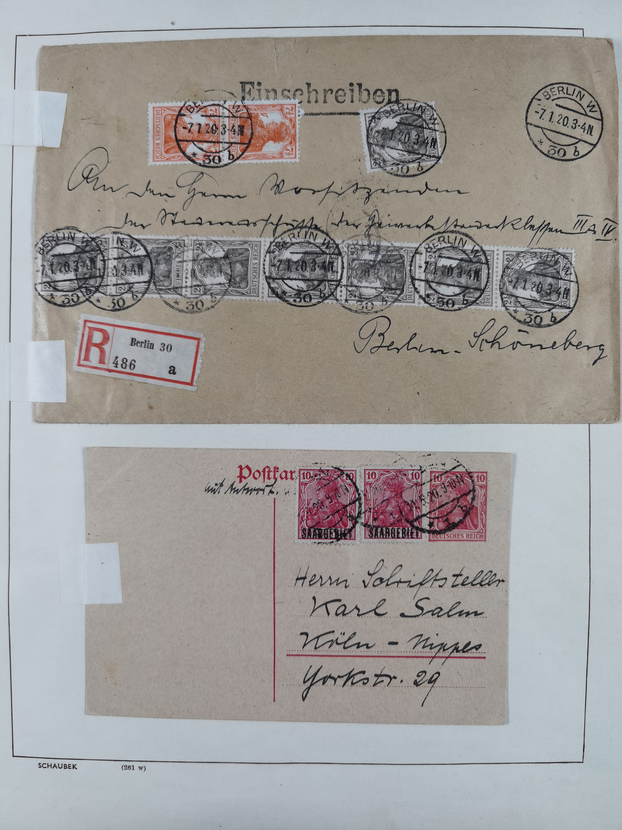 1865/1950 (ca.), Album mit 122 hochwertigen Belegen, diese einzeln vom Einlieferer beschrieben und nach Michel bewertet 15.000 €. Dazu ein Karton mit über 170 Briefen, Karten und Ganzsachen, dabei etliche interessante Belege, meist gute Erhaltung