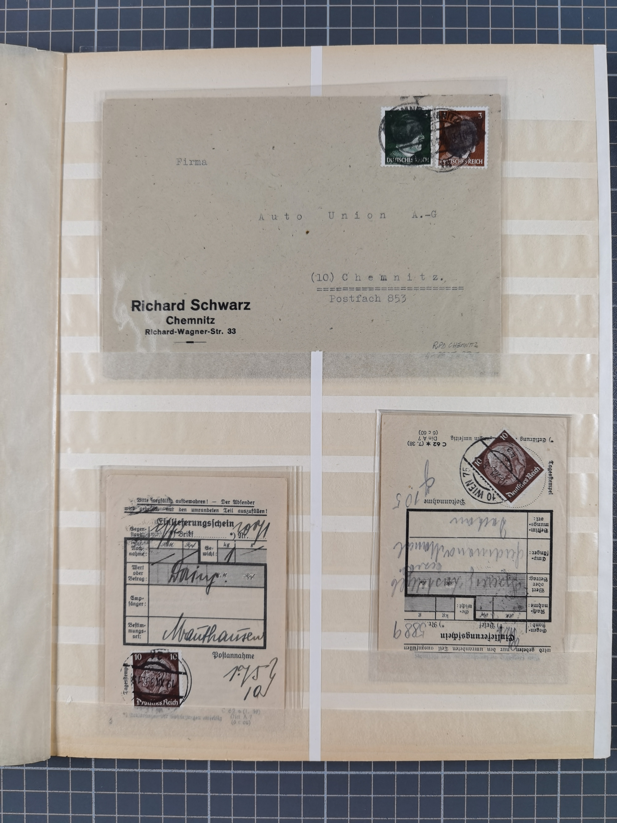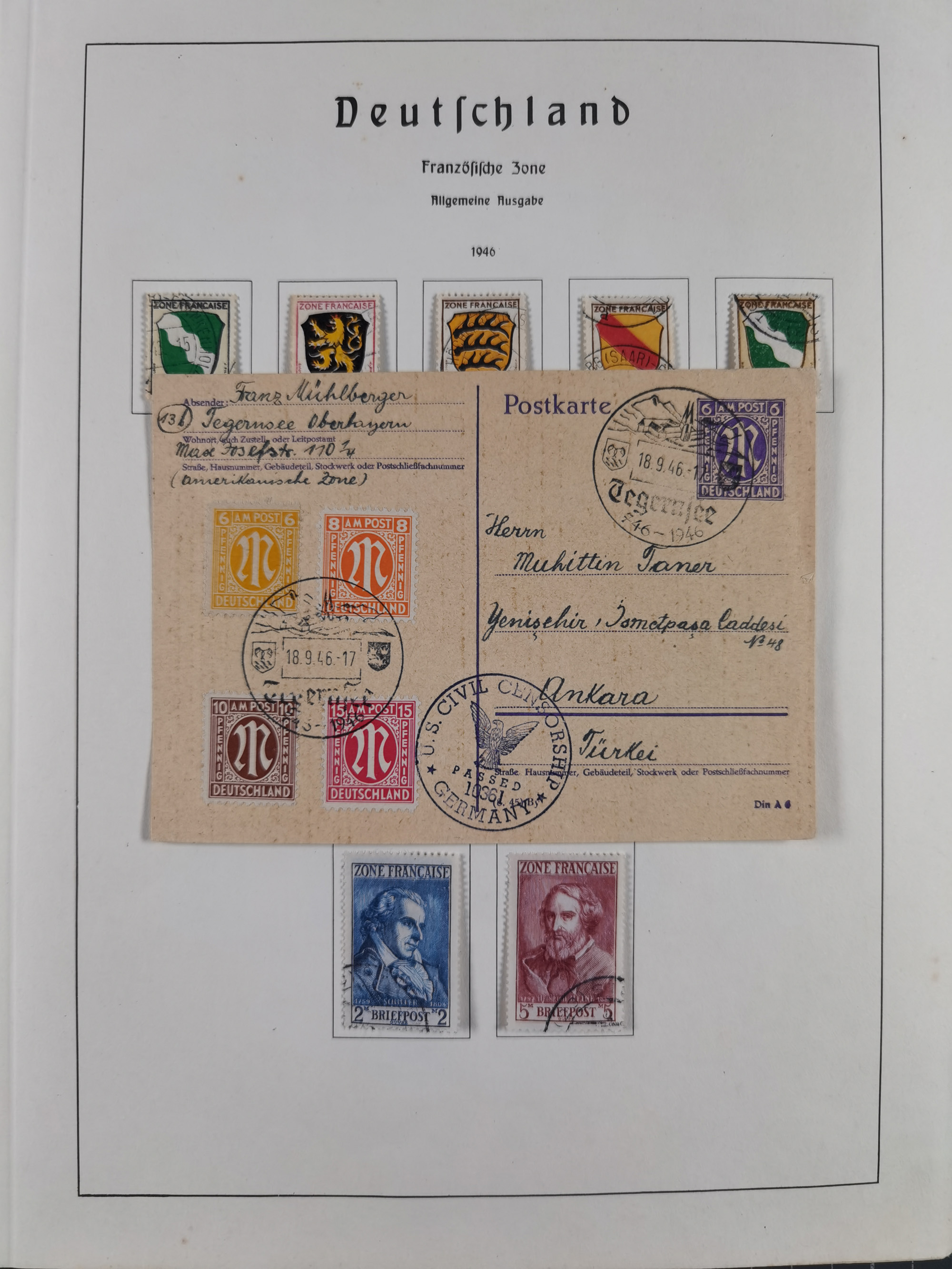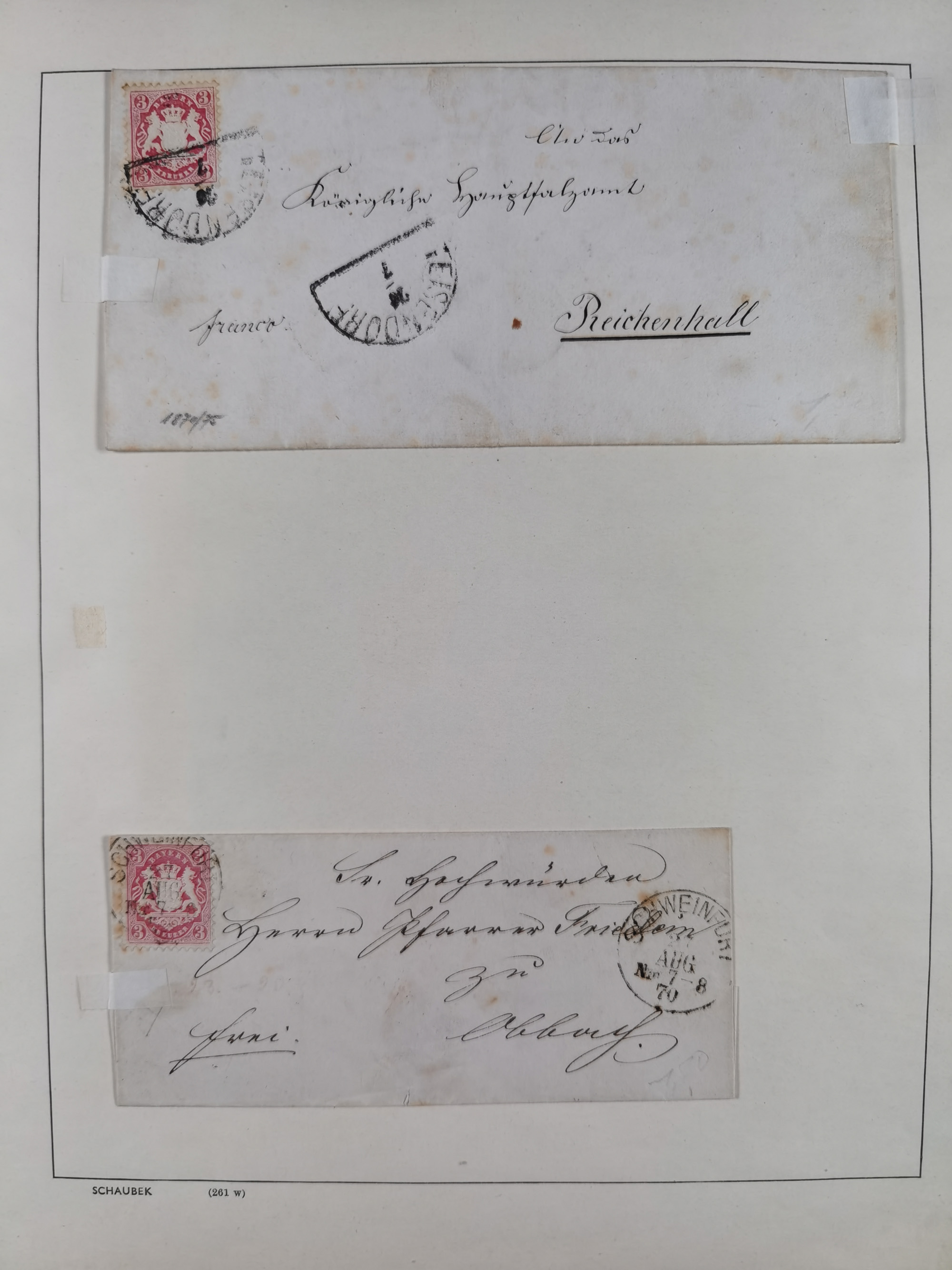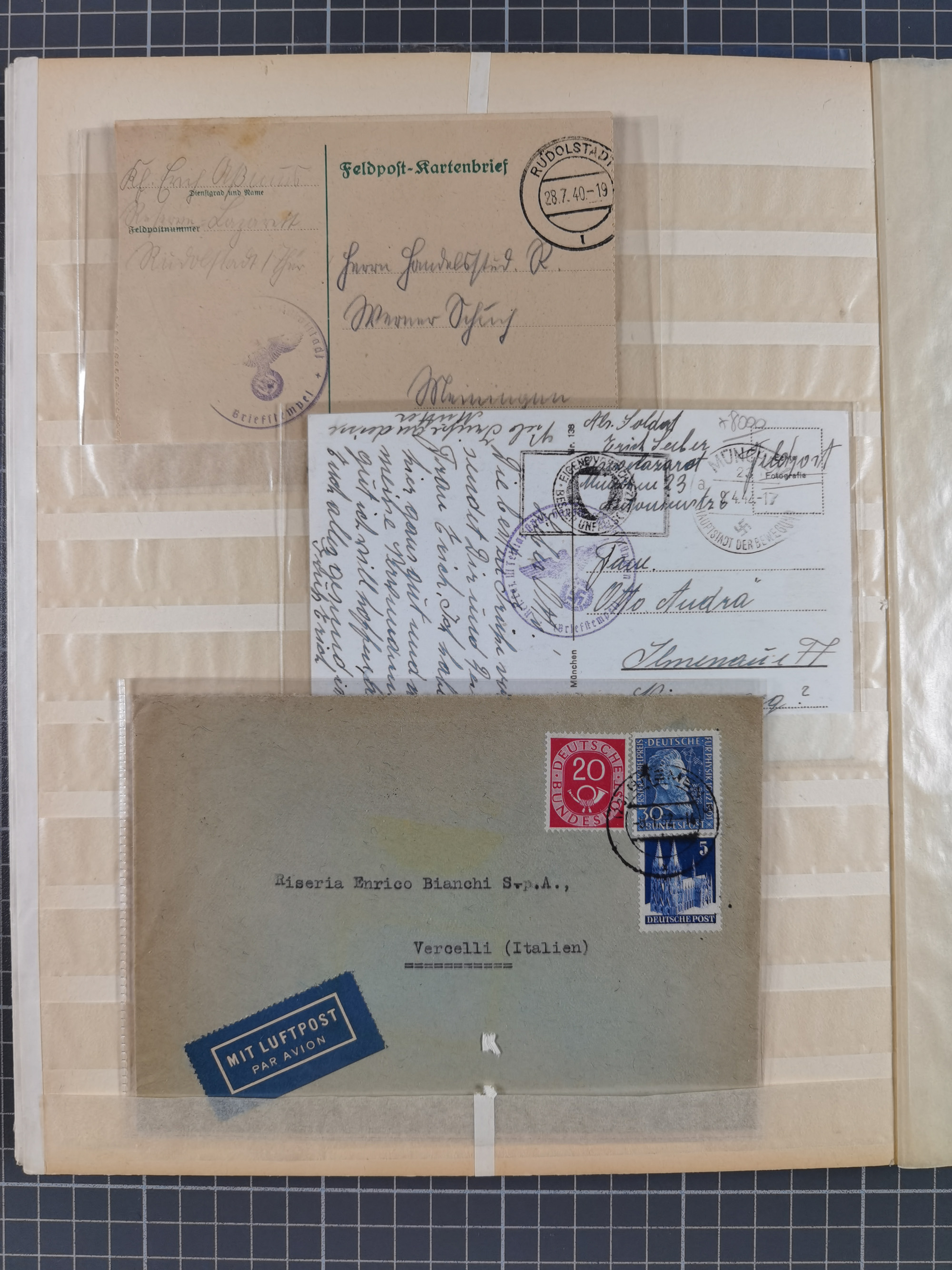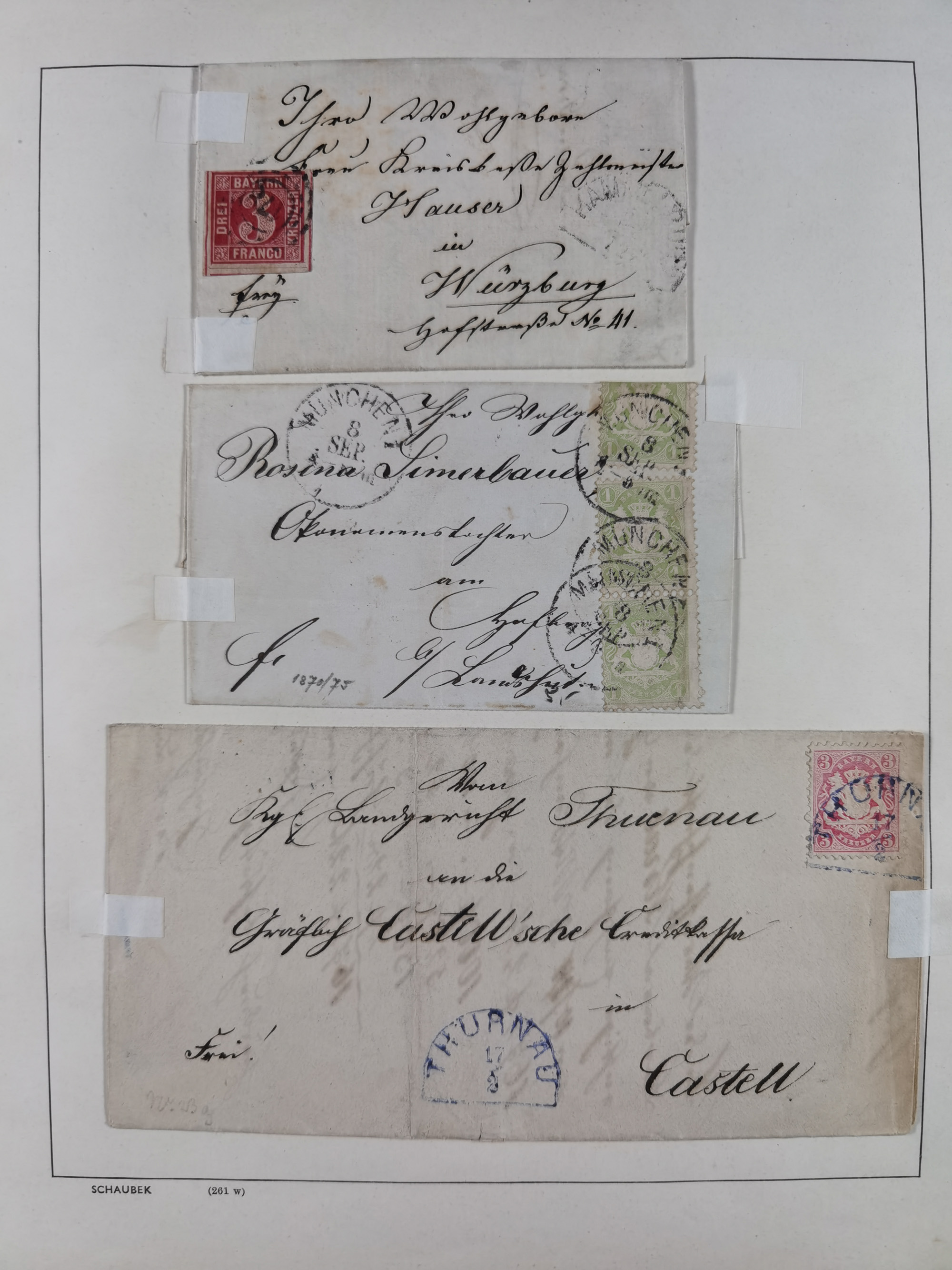1865/1950 (ca.), Album mit 122 hochwertigen Belegen, diese einzeln vom Einlieferer beschrieben und nach Michel bewertet 15.000 €. Dazu ein Karton mit über 170 Briefen, Karten und Ganzsachen, dabei etliche interessante Belege, meist gute Erhaltung