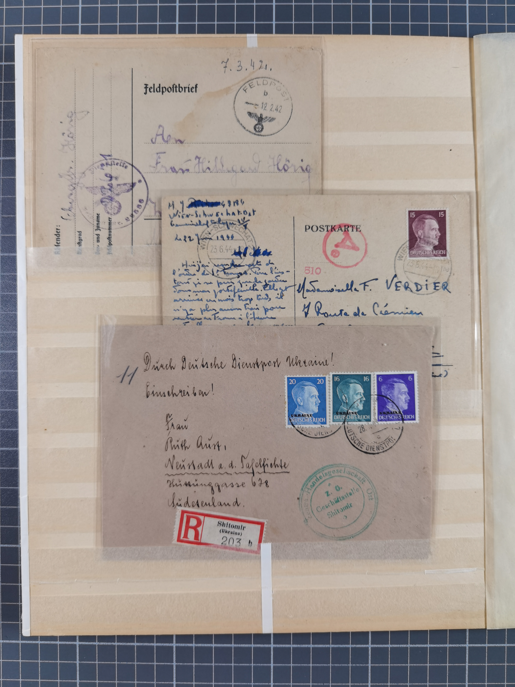 1709/1950, über 130 Briefe, Karten und Ganzsachen mit früher Botenpost, ca. 35 KZ- und Ghettopost-Belege mit u.a. zwei Kartenbriefen von Stutthof, Brief mit Stempel “BAYRISCHER KURIER-FLUGPOSTDIENST” 1919 und weitere Besonderheiten