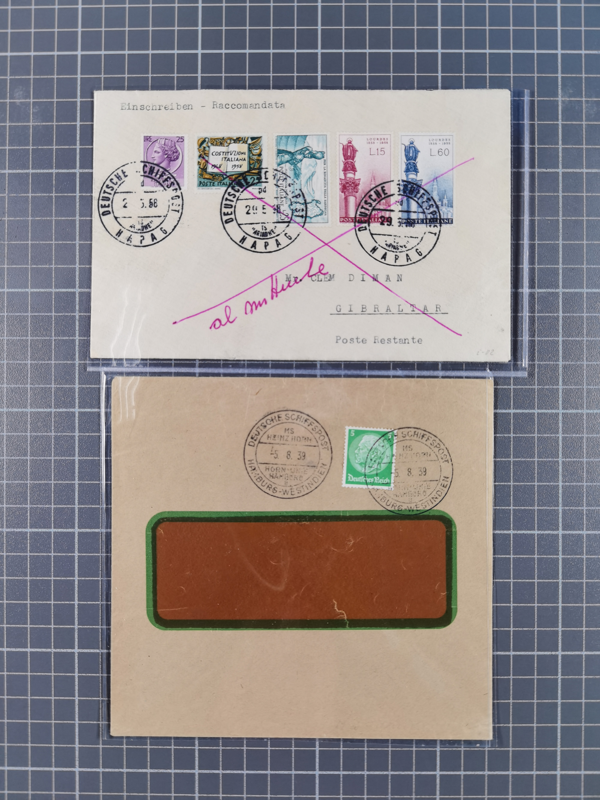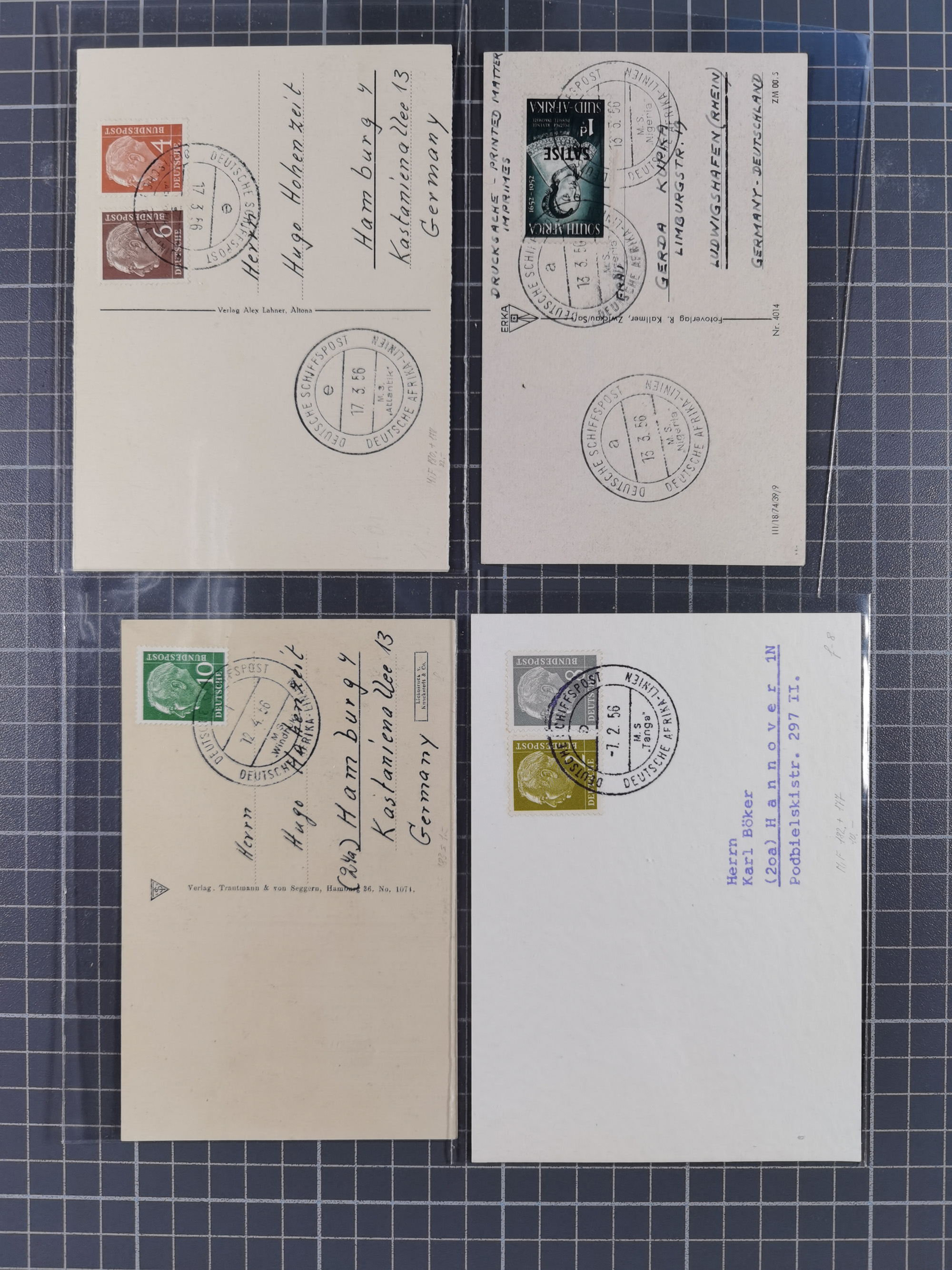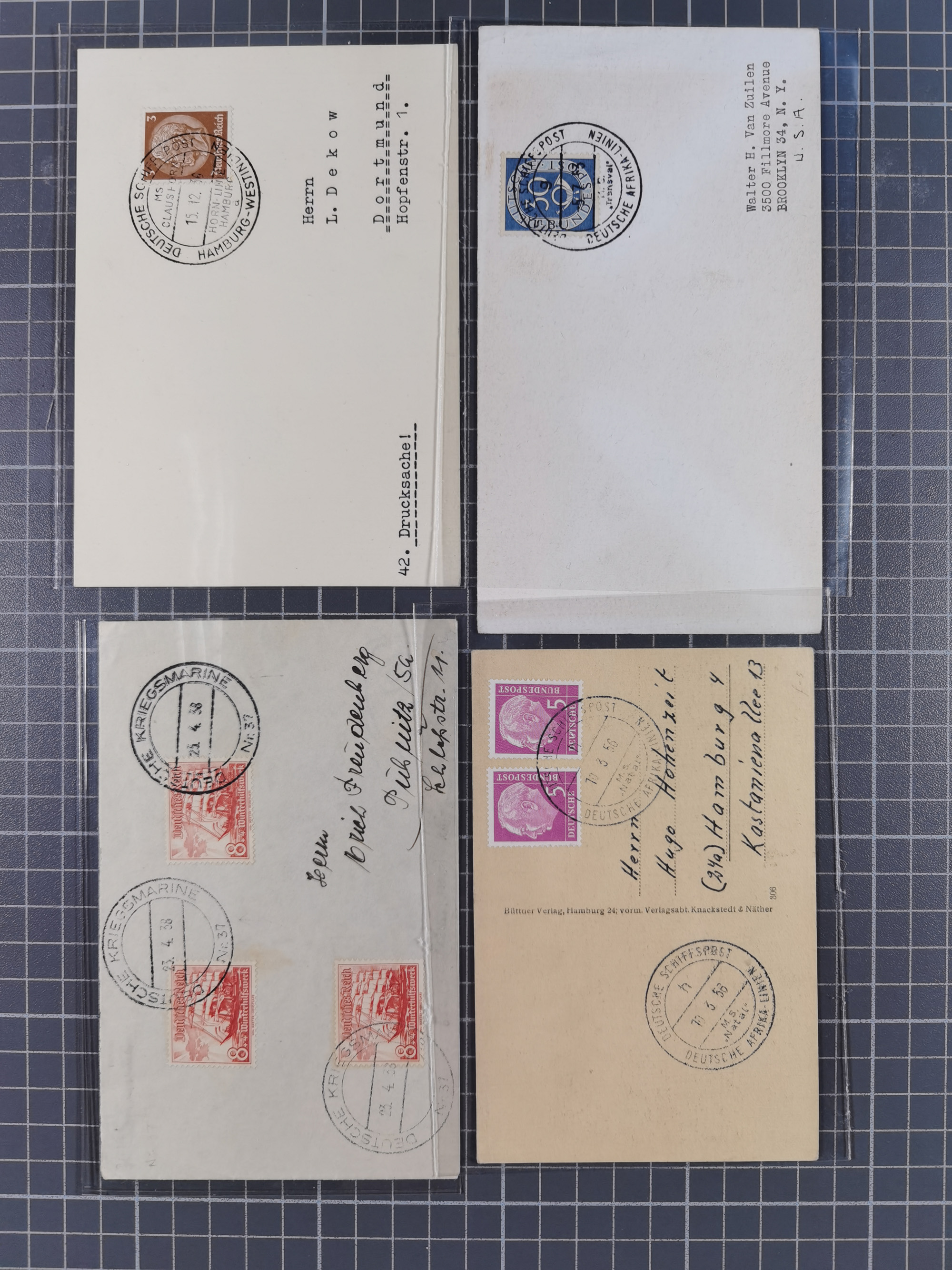 1892/1956, kleine Partie Schiffspost, Schwerpunkt nach 1930, dabei u.a. 1892 Entlassungs-Zeugniss von “Hamburg-Amerikanische Packetfahrt-Actien-Gesellschaft”, etc., teils etwas leicht unterschiedlich, meist aber in sehr schöner Gesamterhaltung