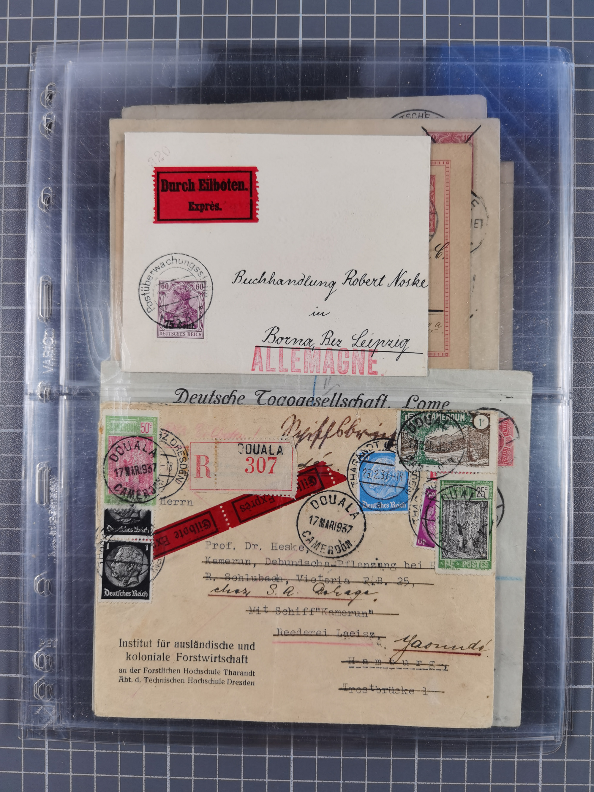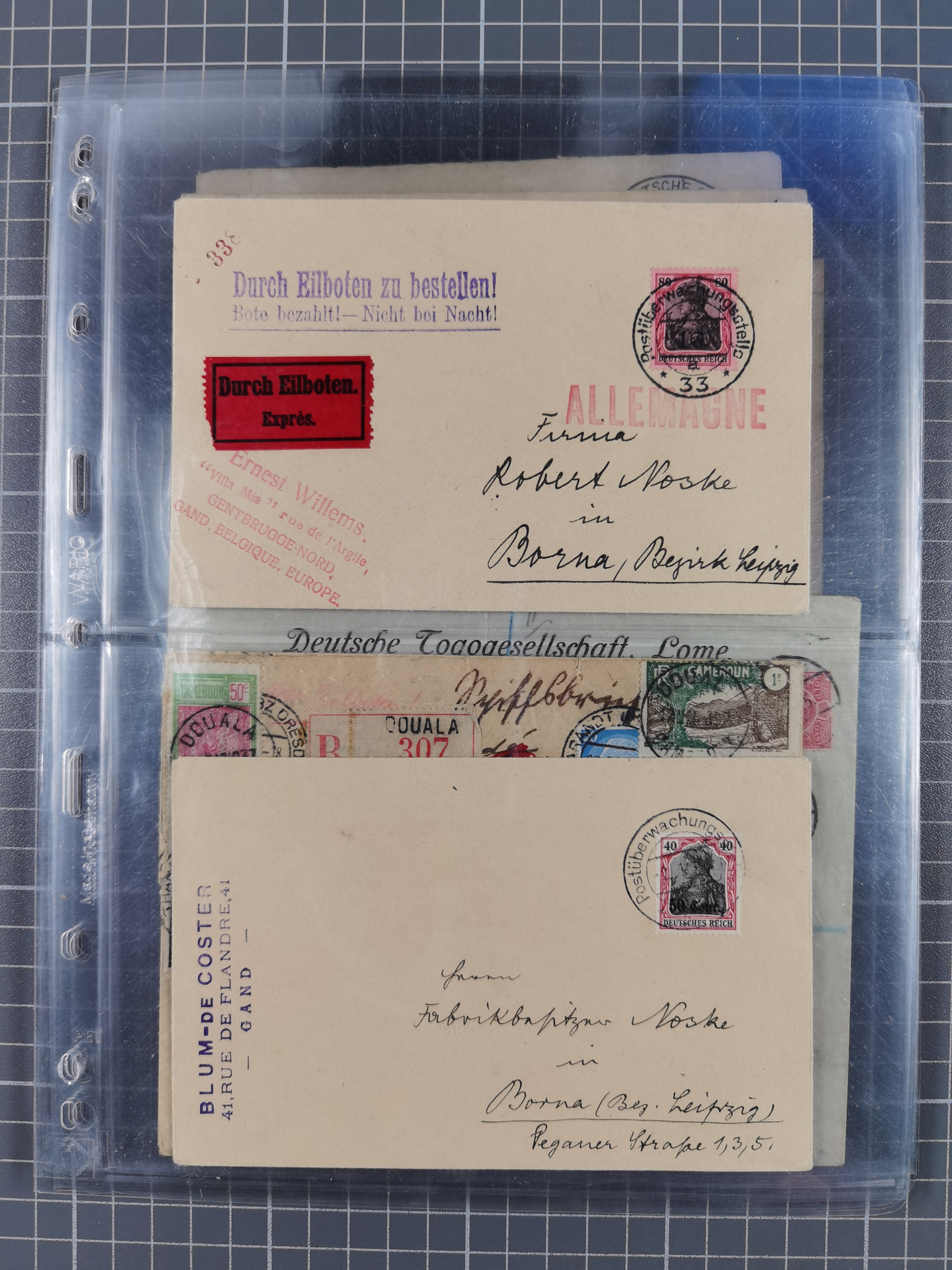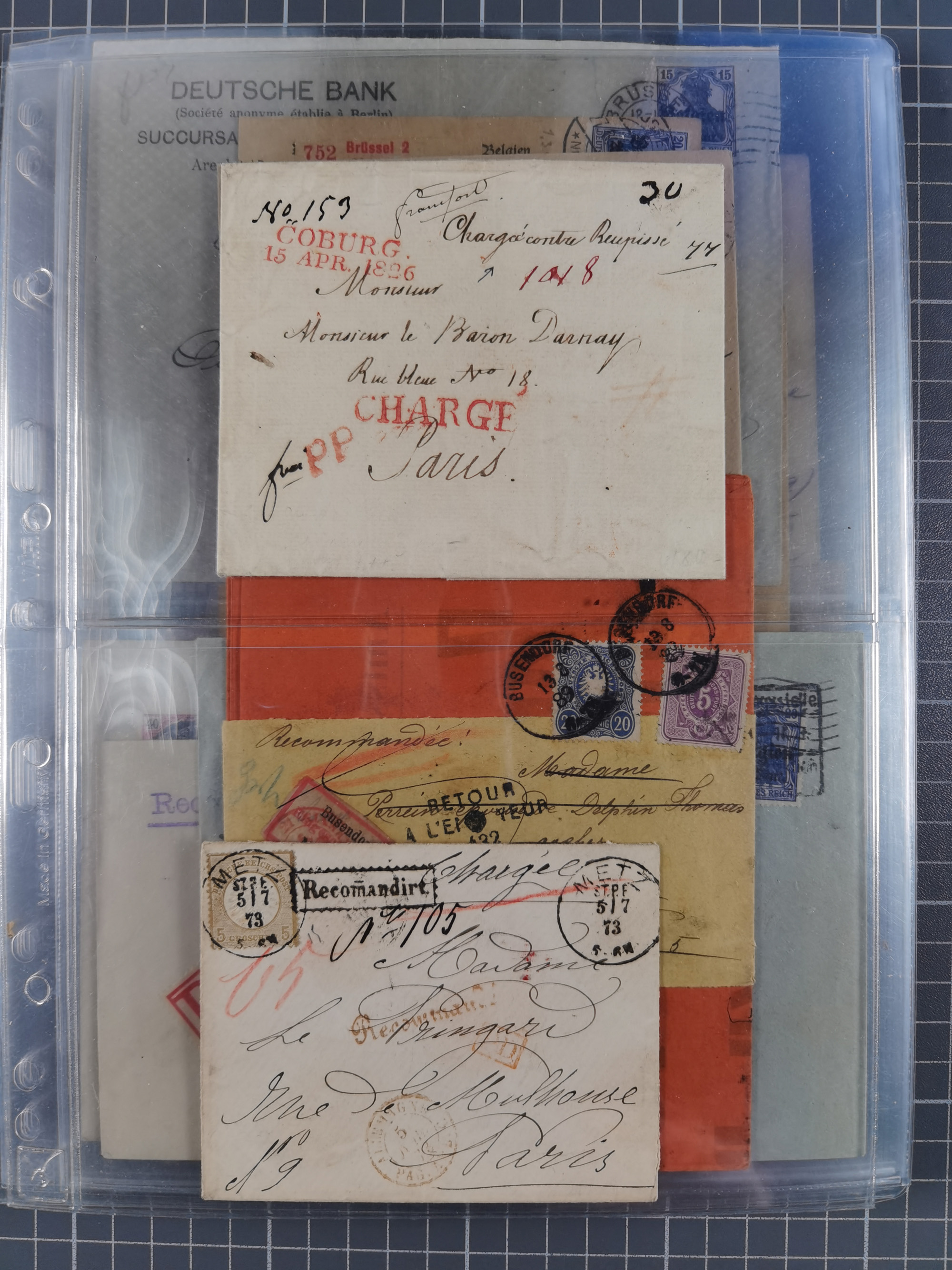 1826/1937 (ca.), umfangreiche Partie mit rund 40 Belegen, inkl. Deutsche Kolonie und WWI Besetzungen, interessante Einzel-, Mehrfach- und Mischfrankaturen, dabei u.a. Brustschild + Frankreich auf Faltbrief, Teil Stempel mit blauem “AUS DAENEMARK”, “LINIE HAMBURG WESTAFRIKA”, “LOME”, etc., etwas unterschiedlich, meist in guter Gesamterhaltung