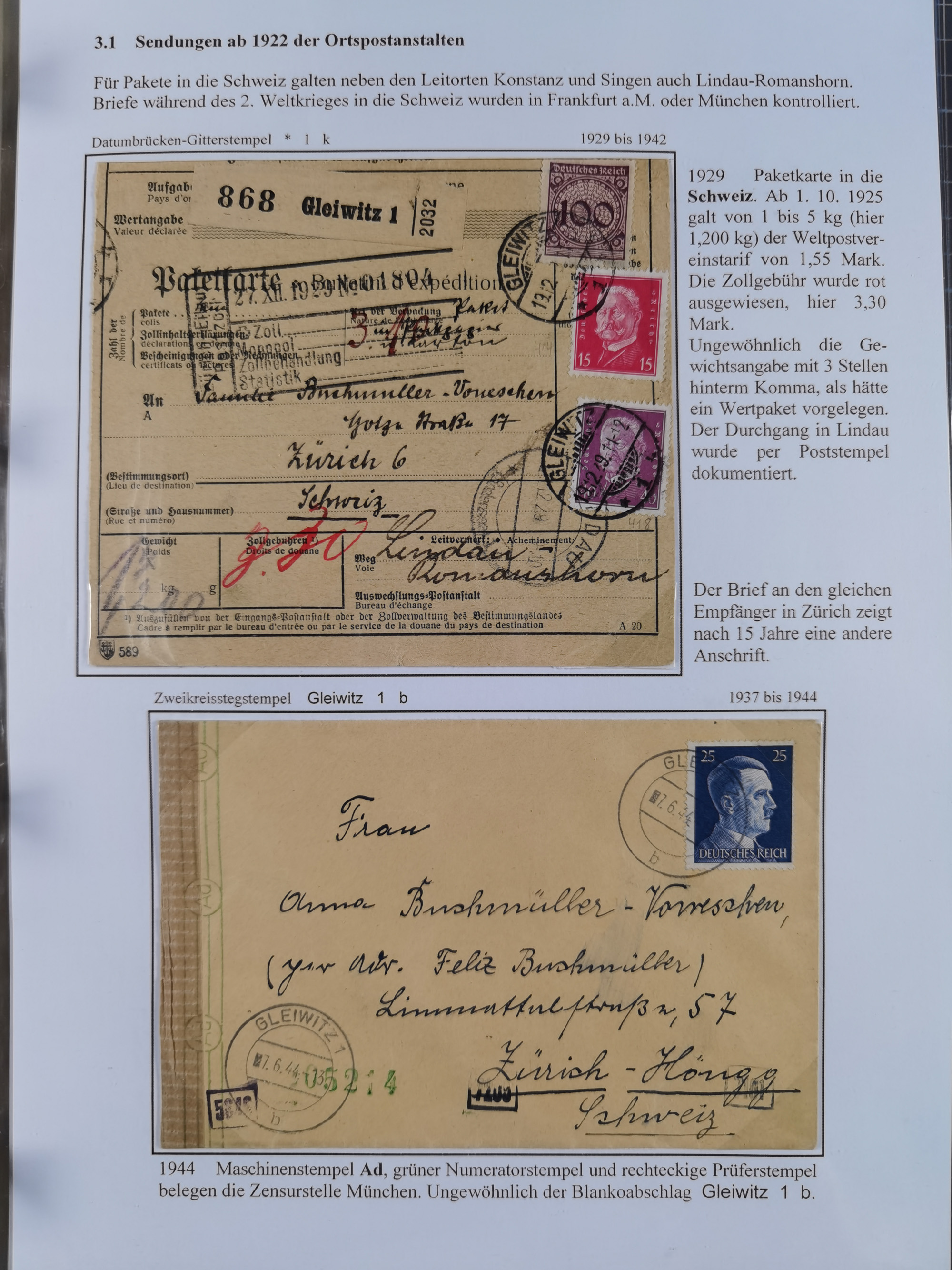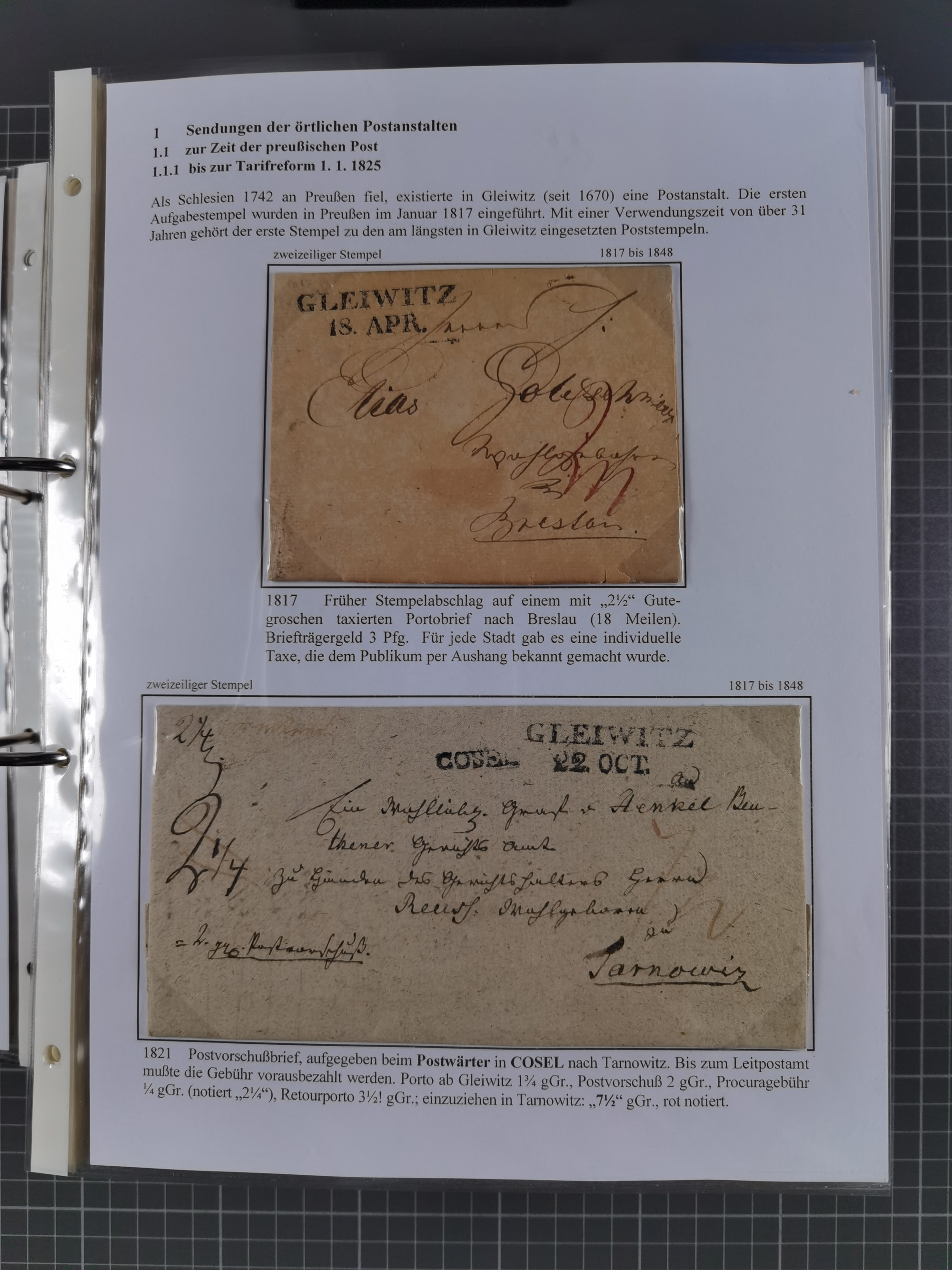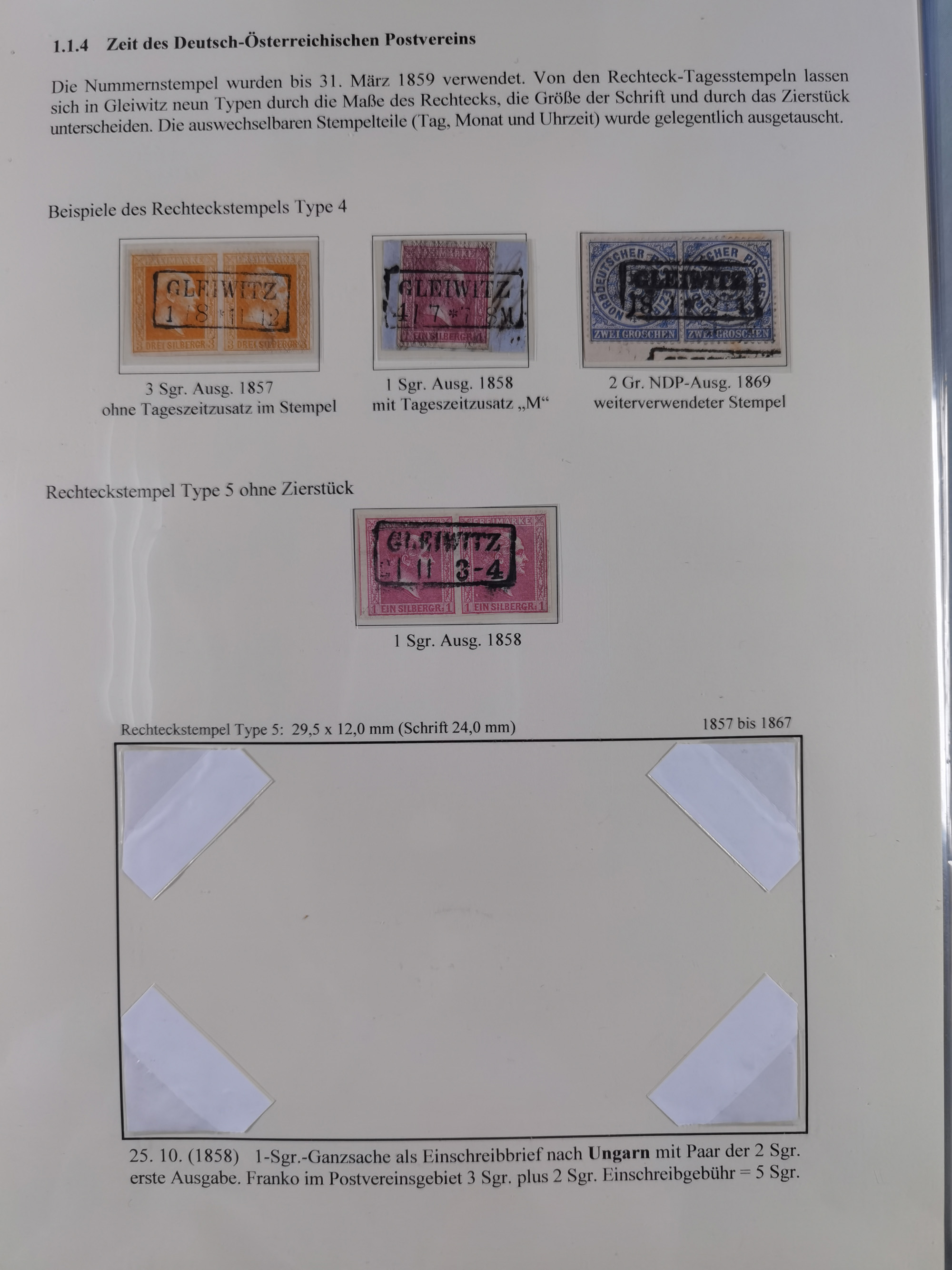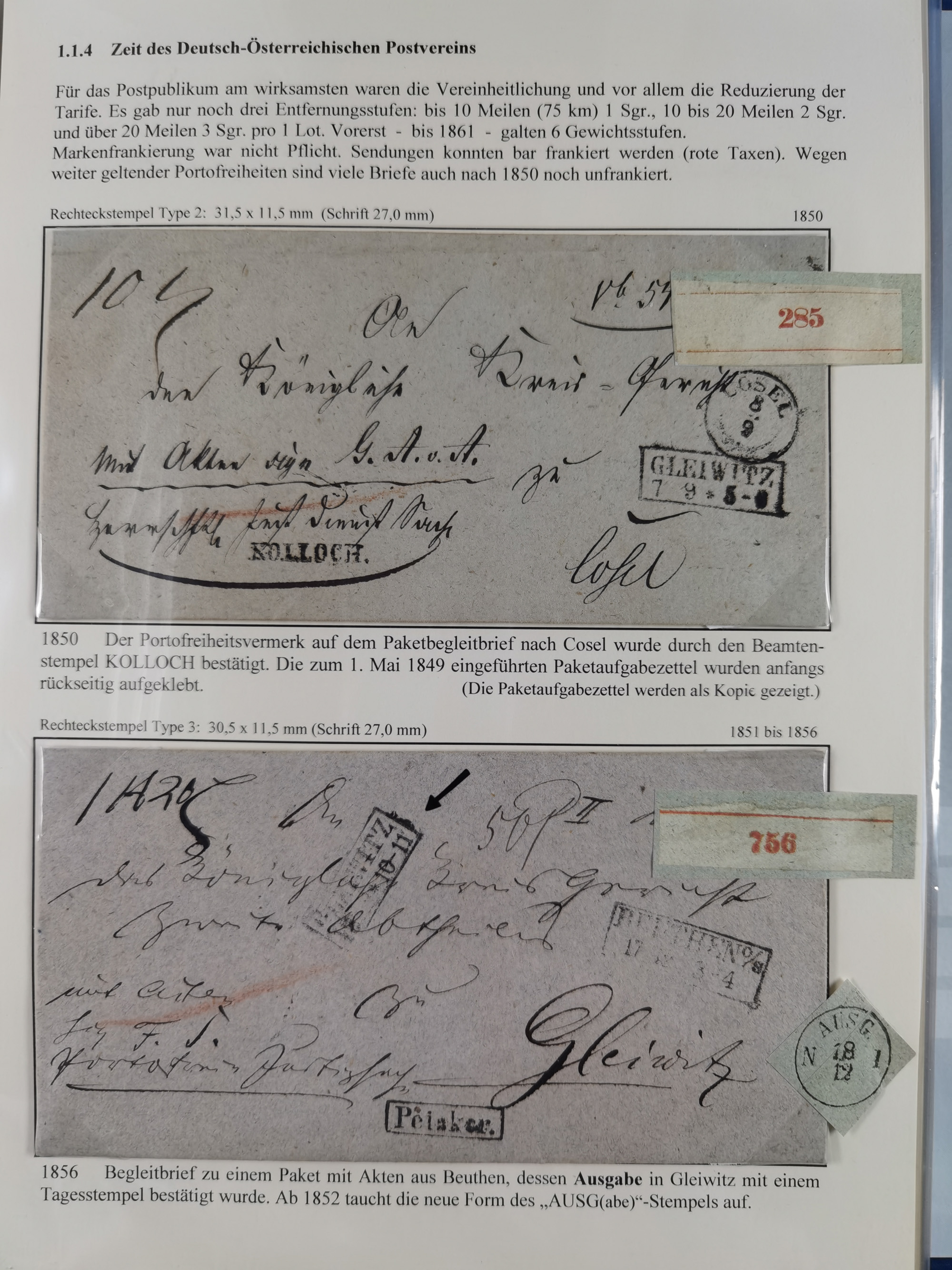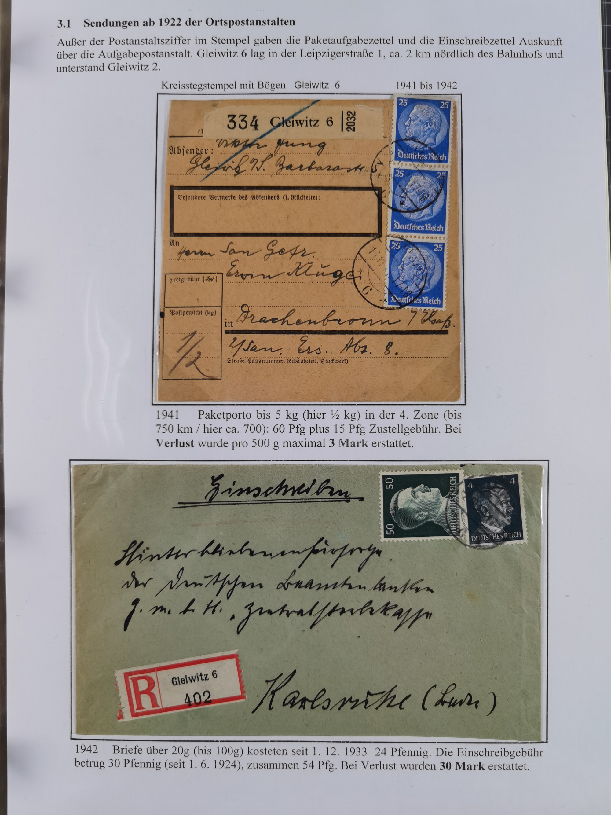 GLEIWITZ: 1817/1950 (ca.), ausstellungsmäßig aufgezogene Sammlung mit reichhaltig zusätzlichem Material, überschlägig rund 350 Belege, dabei Preußen-Nummernstempel auf GSU, Teilfranco-Belege, NDP GAA6 auf Brief, Auslandspost, viel Oberschlesien mit Paketkarten, Flug- und Zeppelin Post, etc. etc. Ein schönes und interessantes Objekt