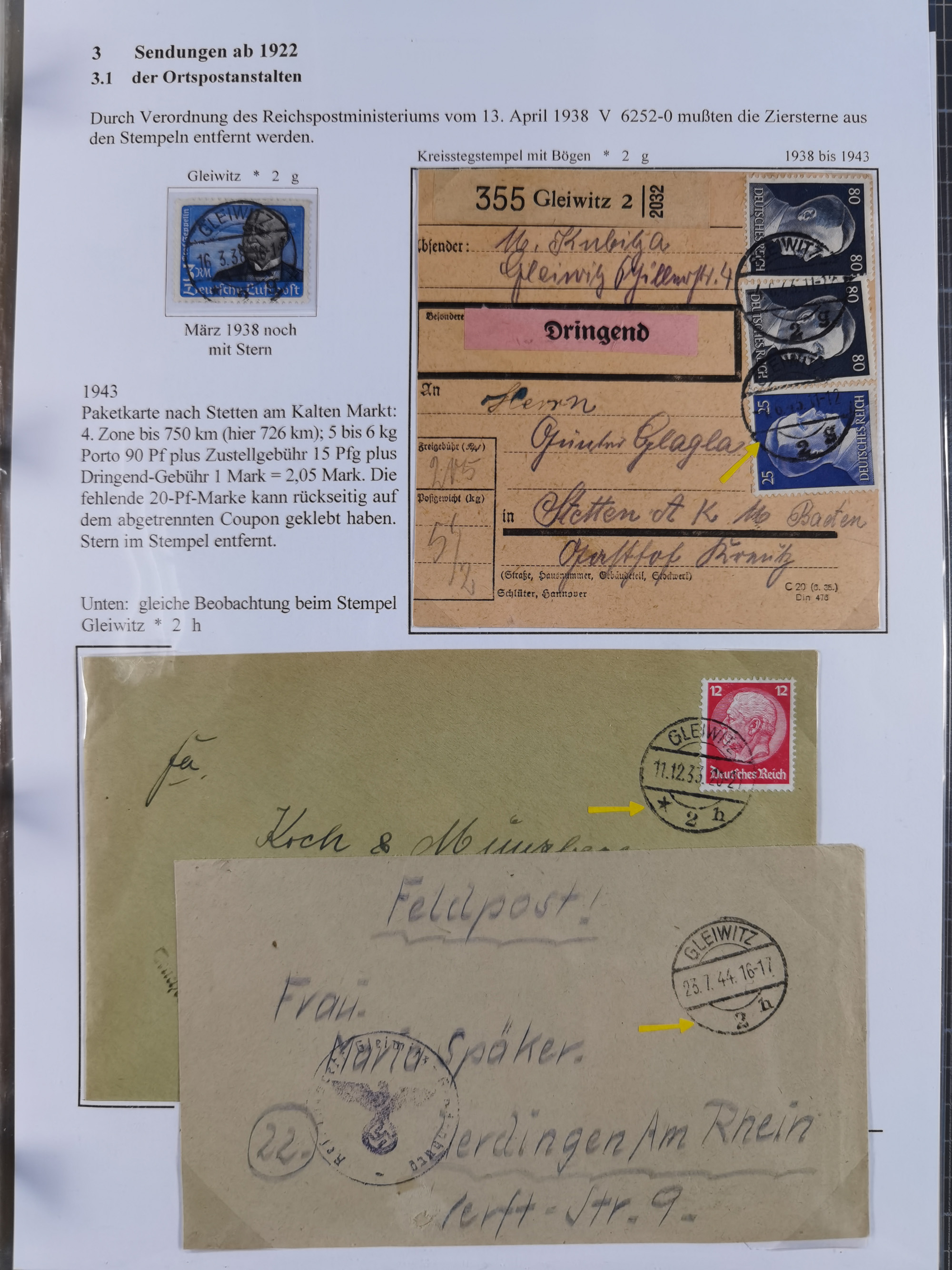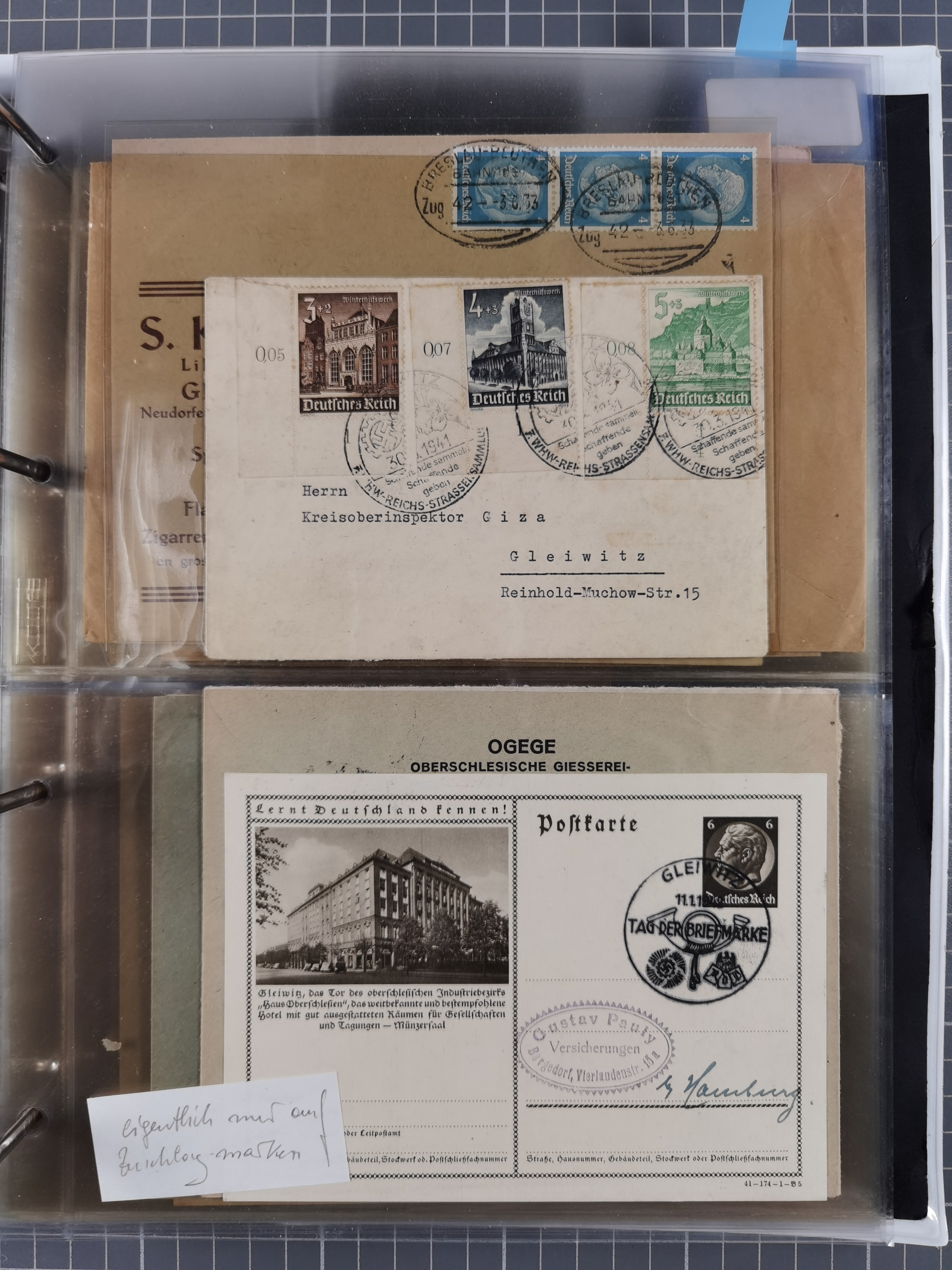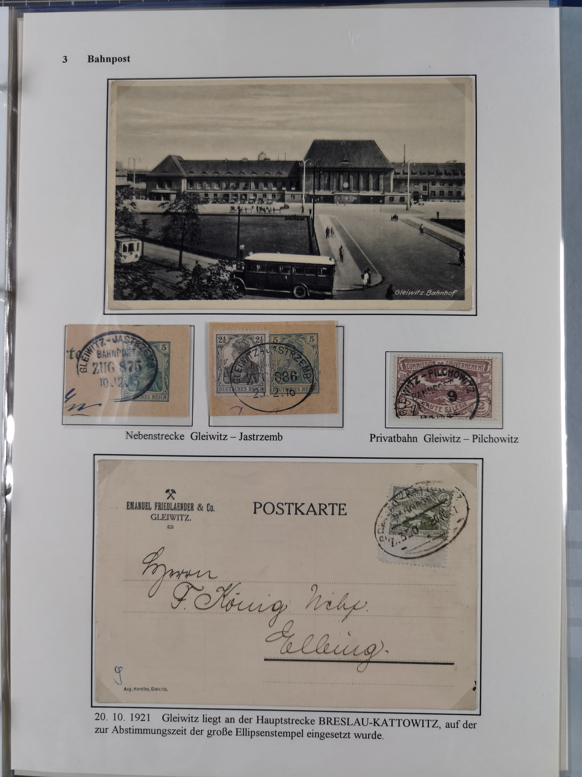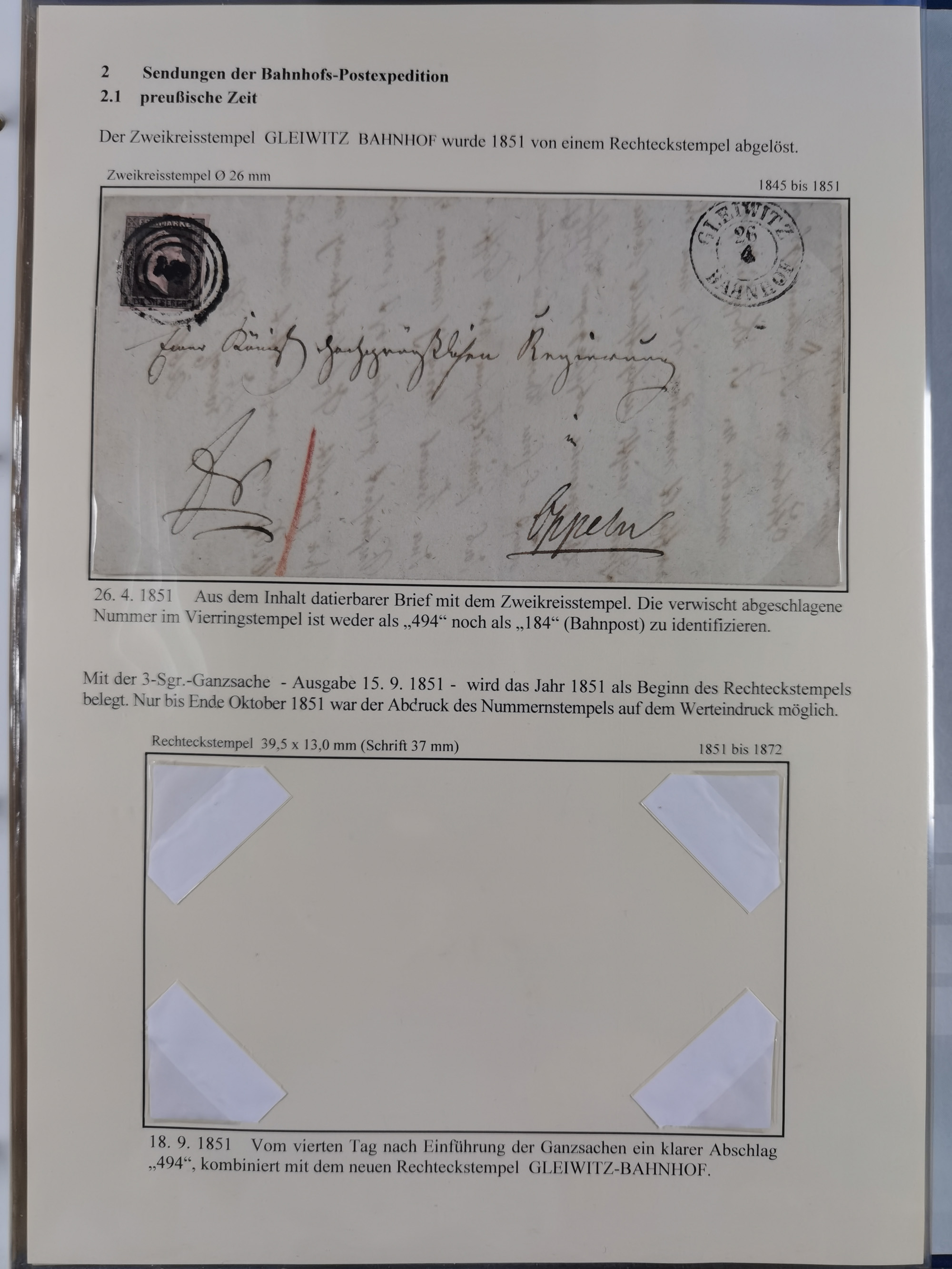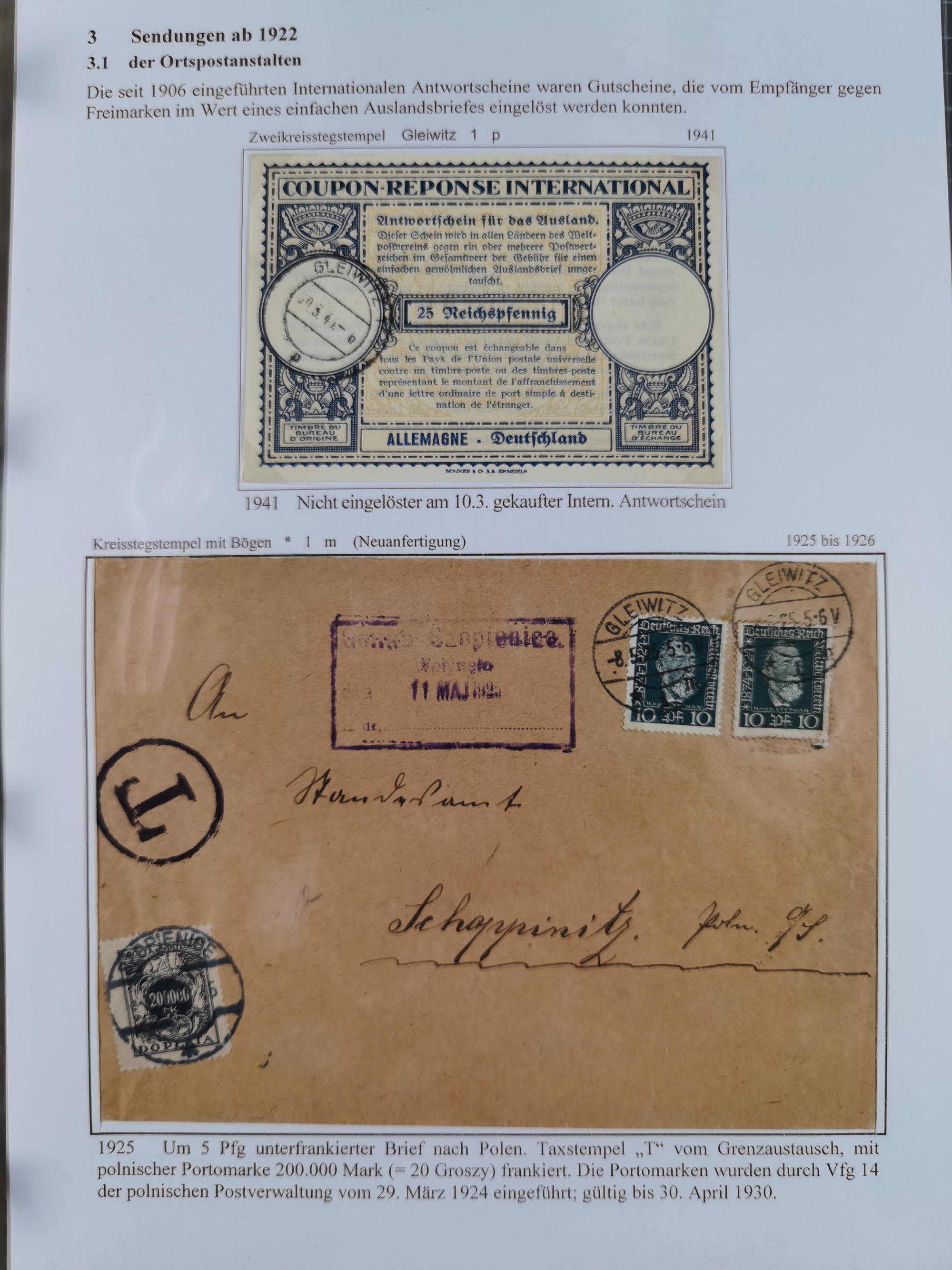 GLEIWITZ: 1817/1950 (ca.), ausstellungsmäßig aufgezogene Sammlung mit reichhaltig zusätzlichem Material, überschlägig rund 350 Belege, dabei Preußen-Nummernstempel auf GSU, Teilfranco-Belege, NDP GAA6 auf Brief, Auslandspost, viel Oberschlesien mit Paketkarten, Flug- und Zeppelin Post, etc. etc. Ein schönes und interessantes Objekt