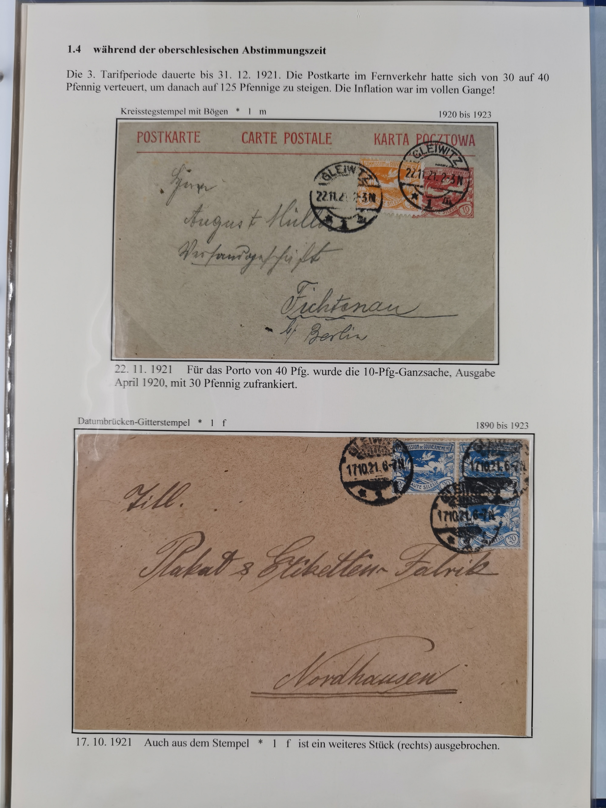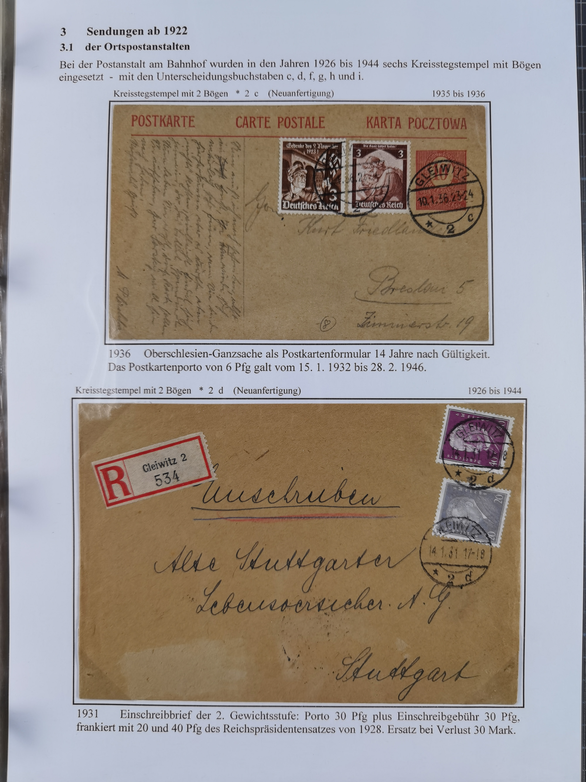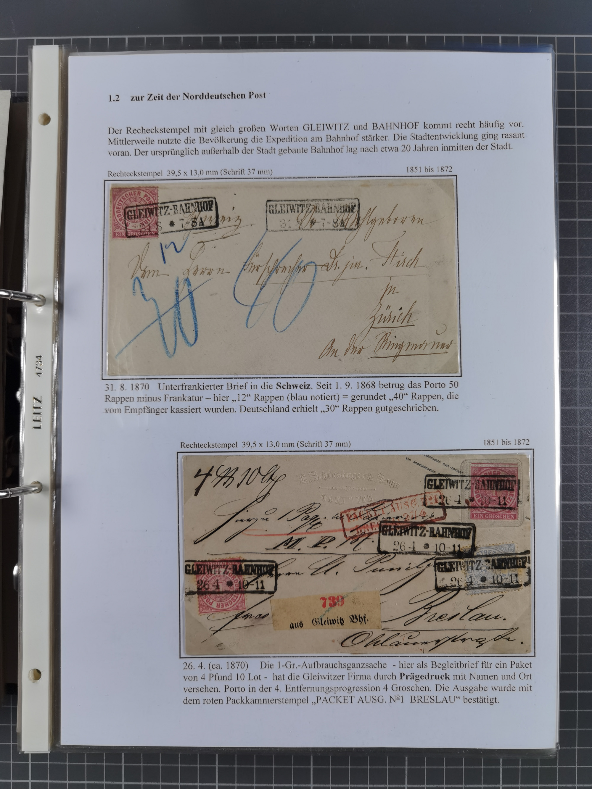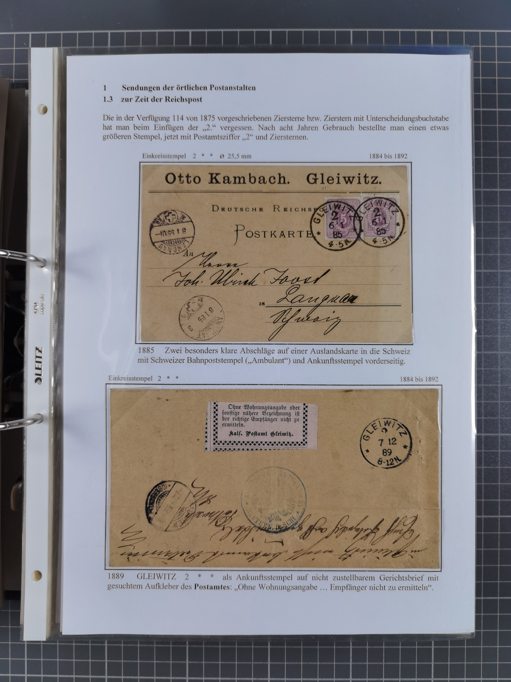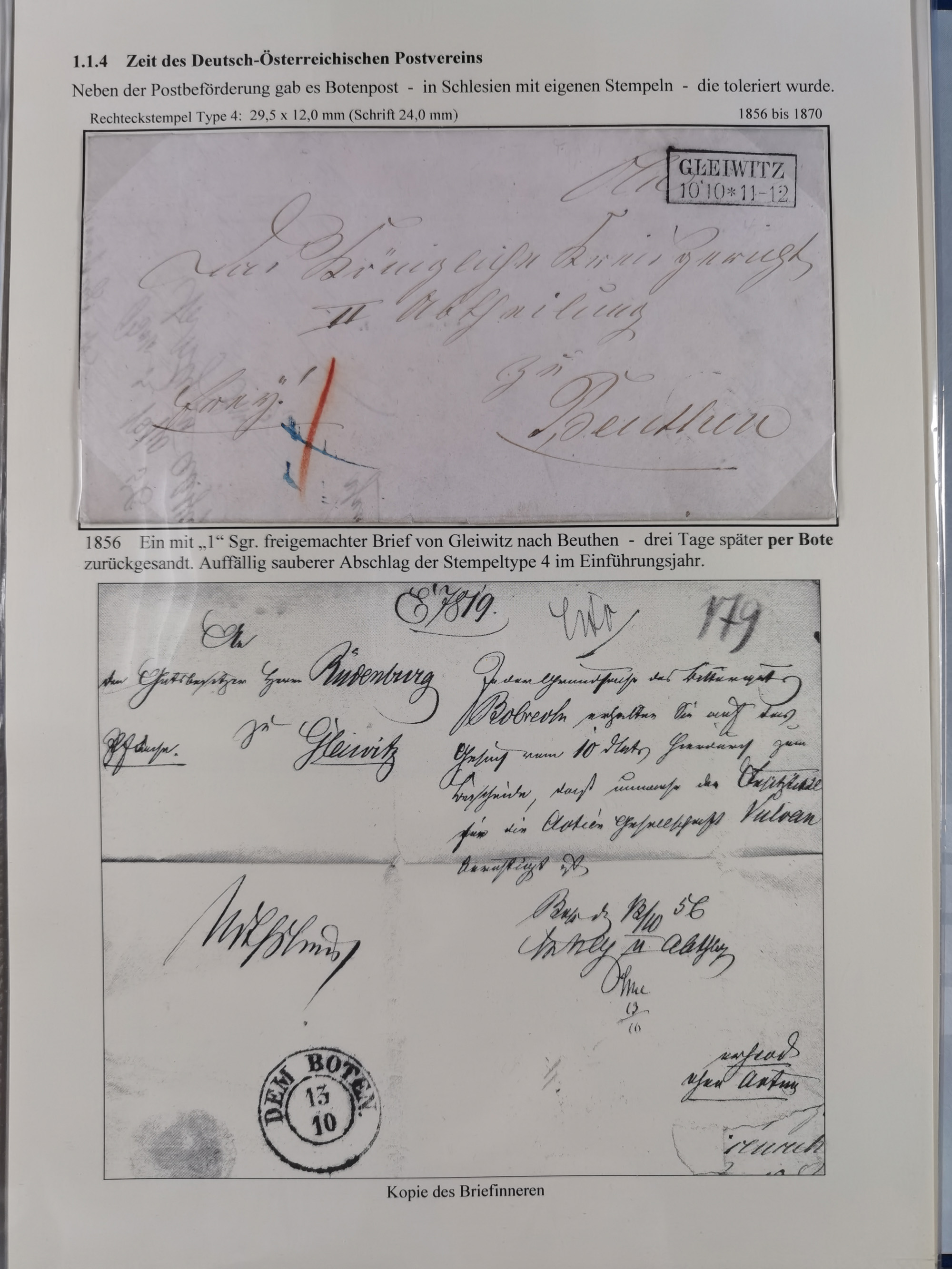 GLEIWITZ: 1817/1950 (ca.), ausstellungsmäßig aufgezogene Sammlung mit reichhaltig zusätzlichem Material, überschlägig rund 350 Belege, dabei Preußen-Nummernstempel auf GSU, Teilfranco-Belege, NDP GAA6 auf Brief, Auslandspost, viel Oberschlesien mit Paketkarten, Flug- und Zeppelin Post, etc. etc. Ein schönes und interessantes Objekt