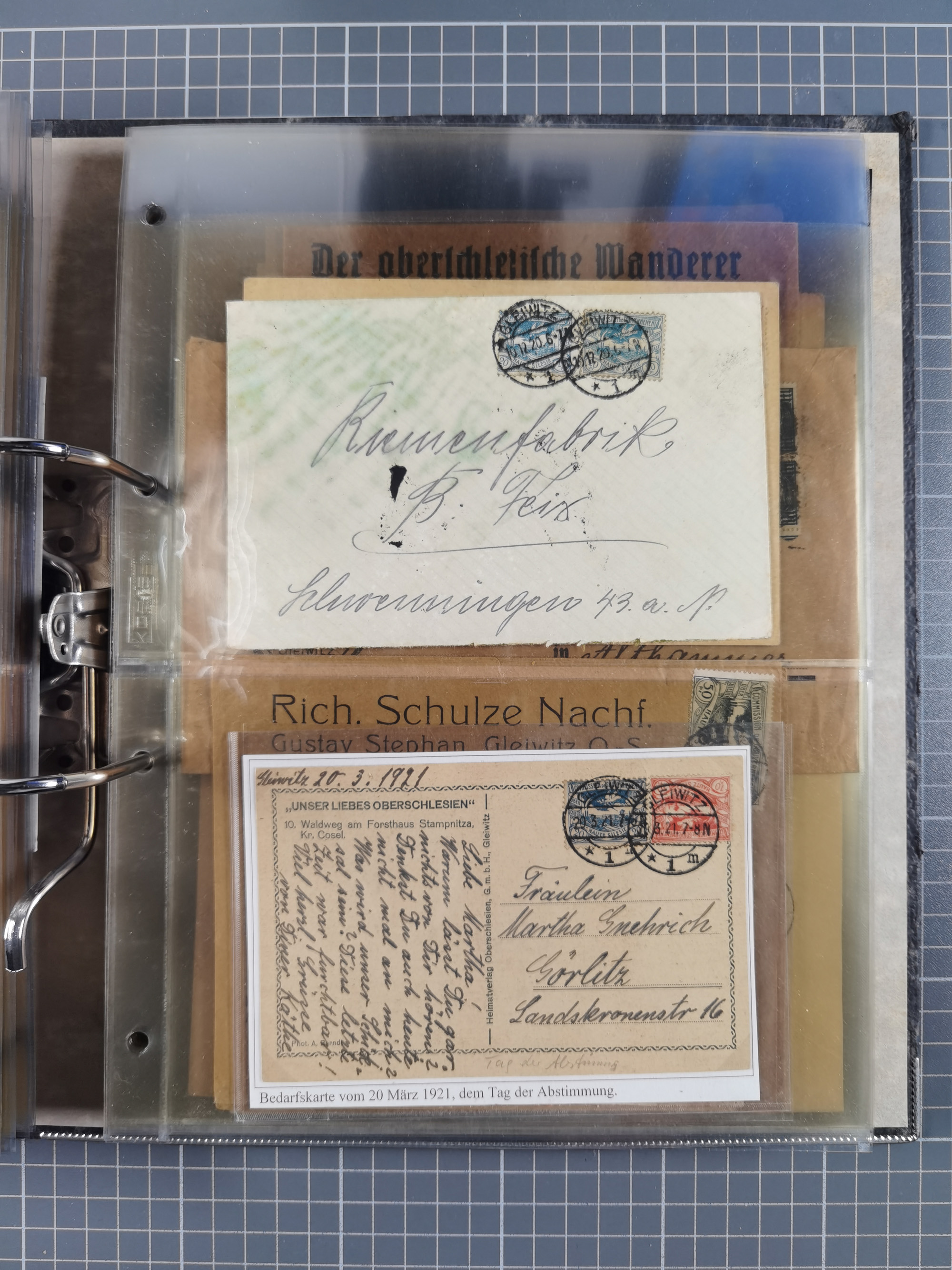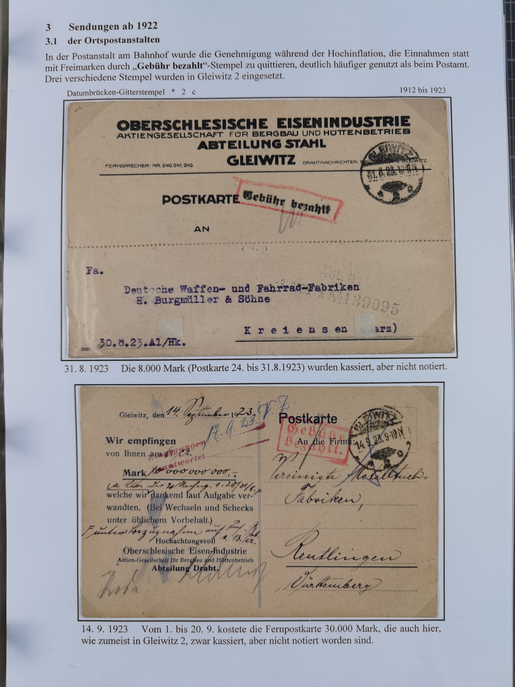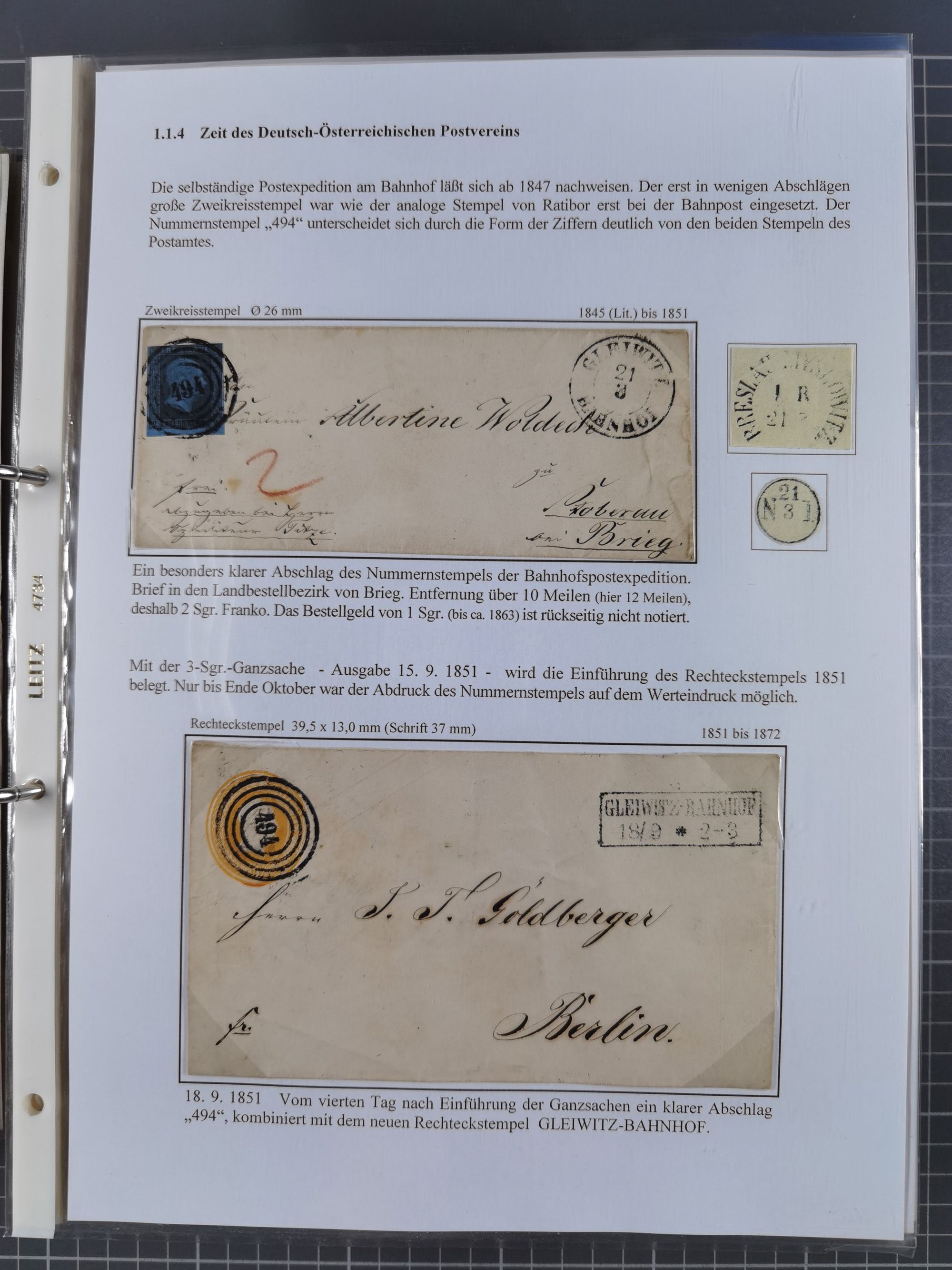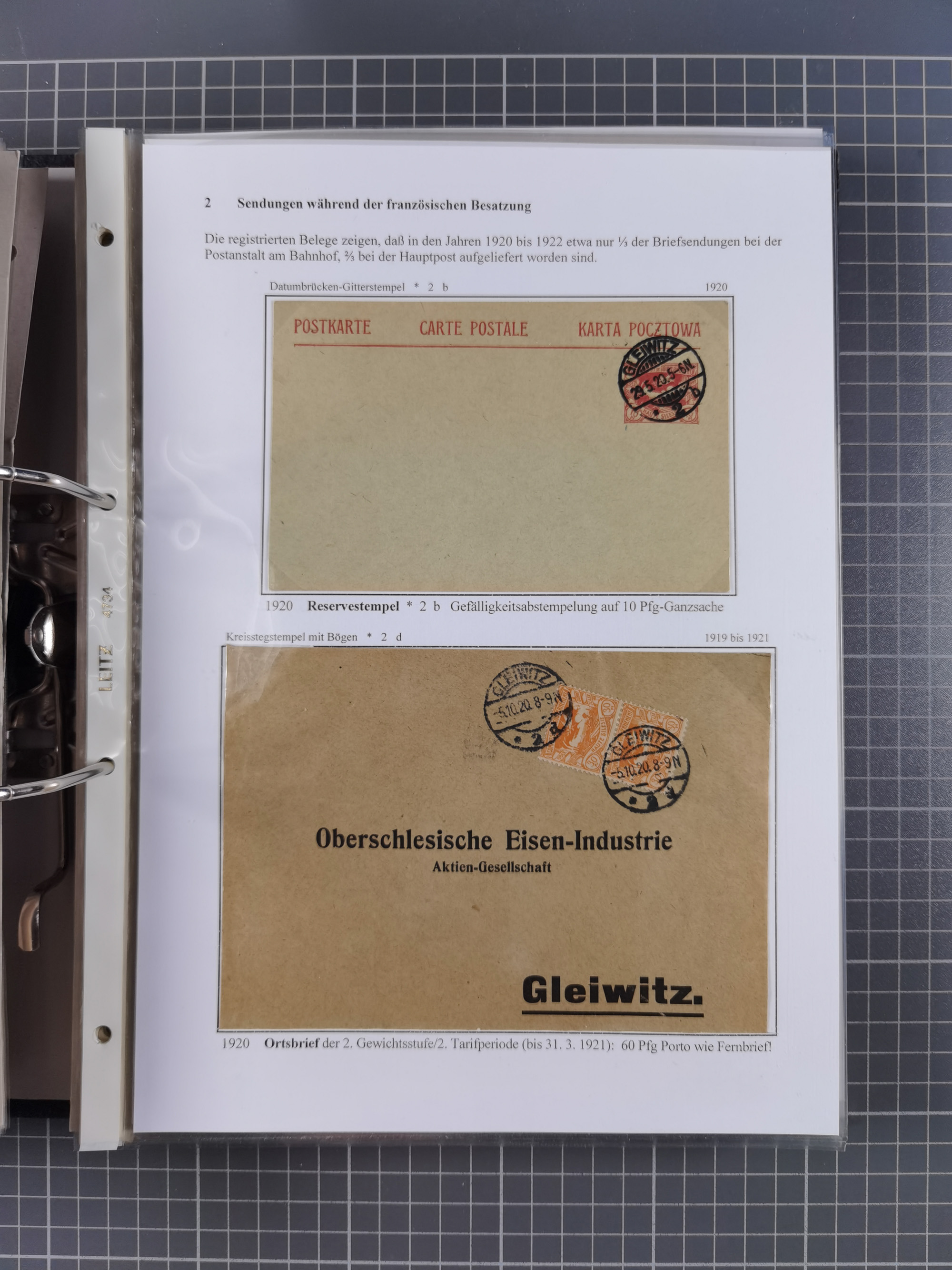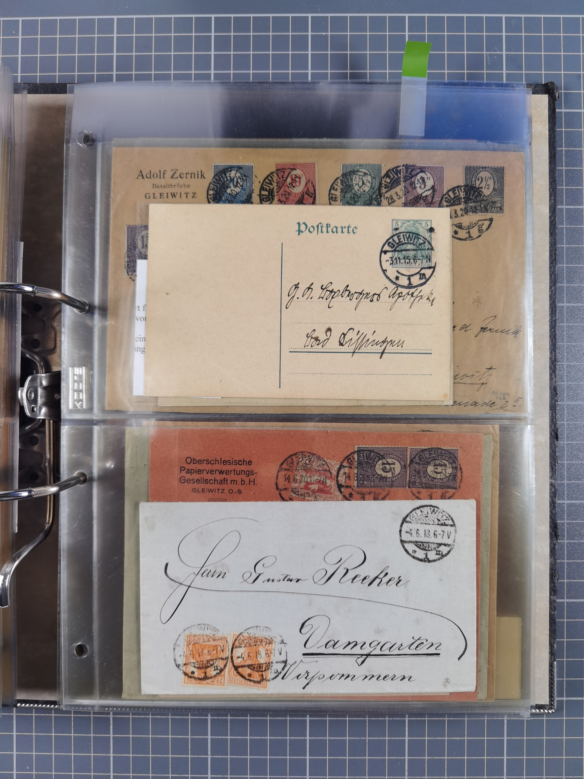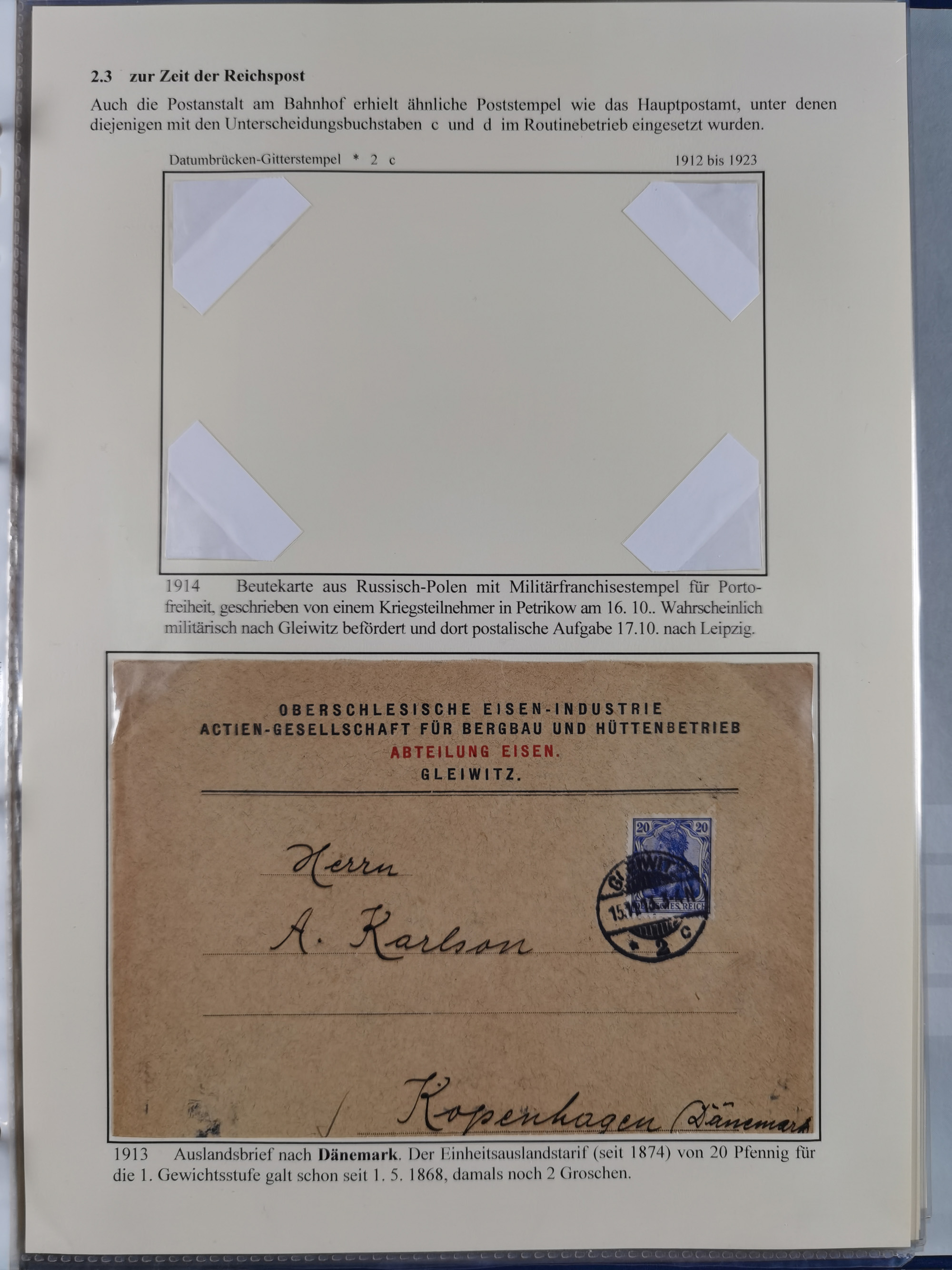 GLEIWITZ: 1817/1950 (ca.), ausstellungsmäßig aufgezogene Sammlung mit reichhaltig zusätzlichem Material, überschlägig rund 350 Belege, dabei Preußen-Nummernstempel auf GSU, Teilfranco-Belege, NDP GAA6 auf Brief, Auslandspost, viel Oberschlesien mit Paketkarten, Flug- und Zeppelin Post, etc. etc. Ein schönes und interessantes Objekt