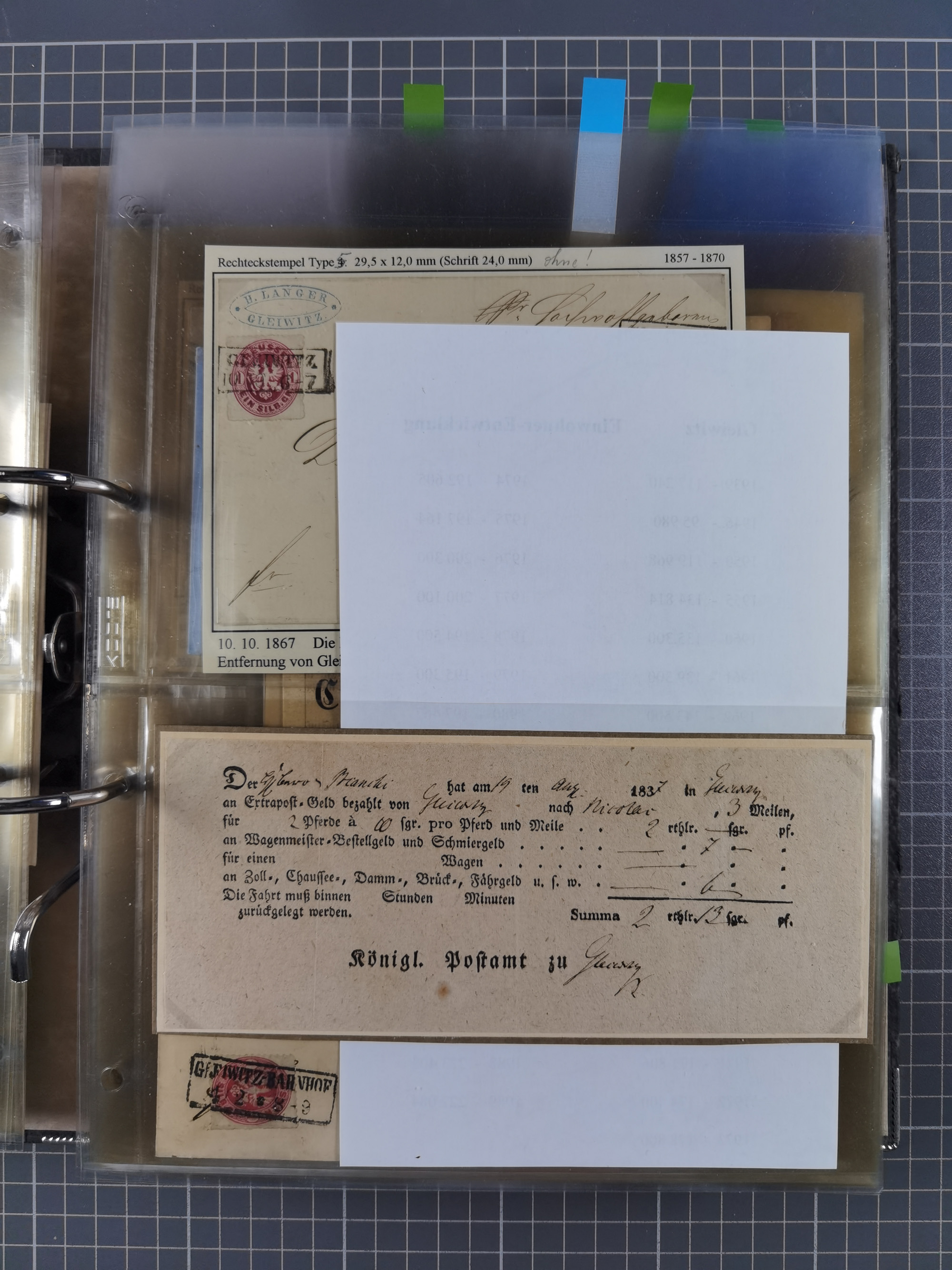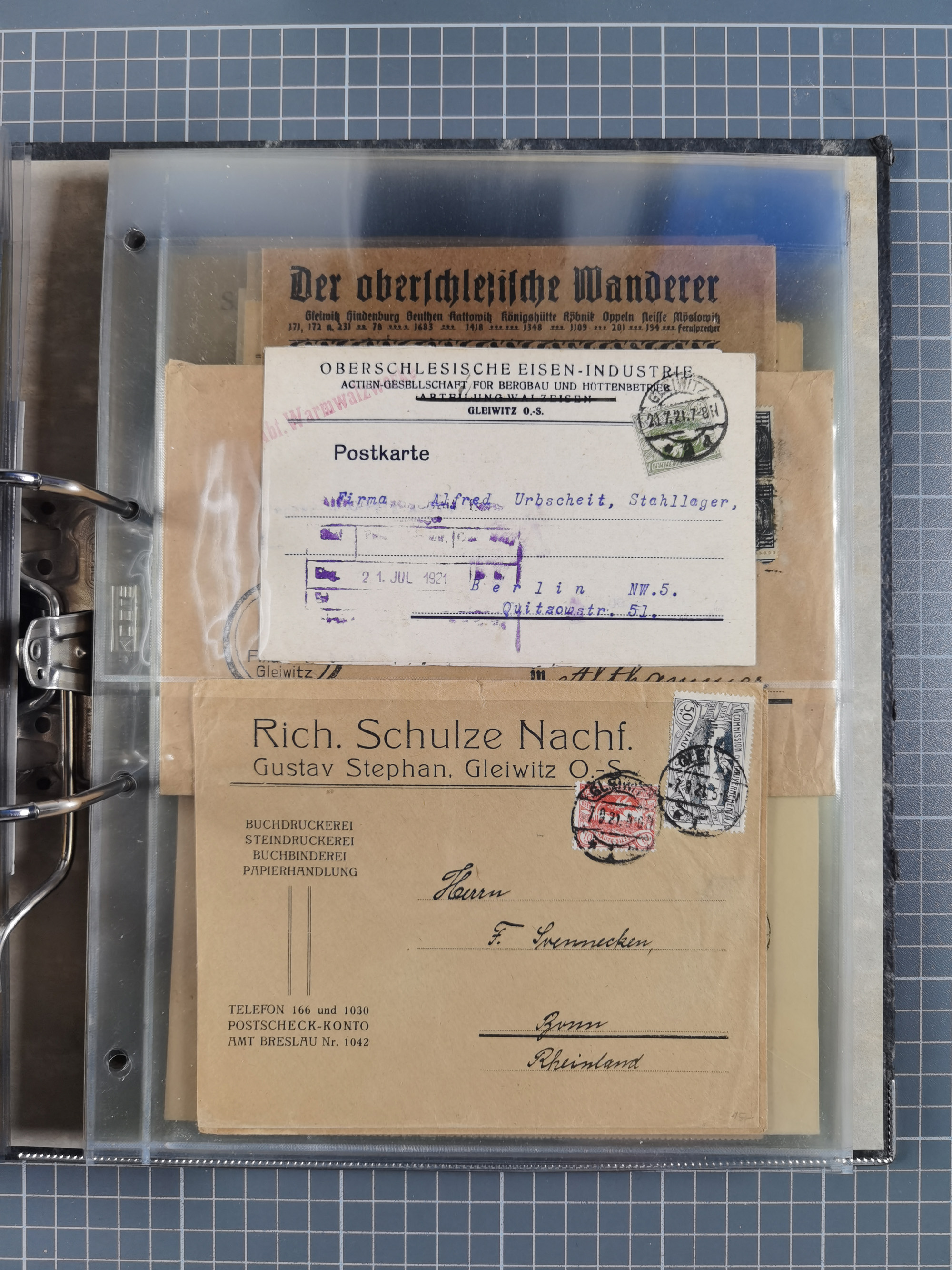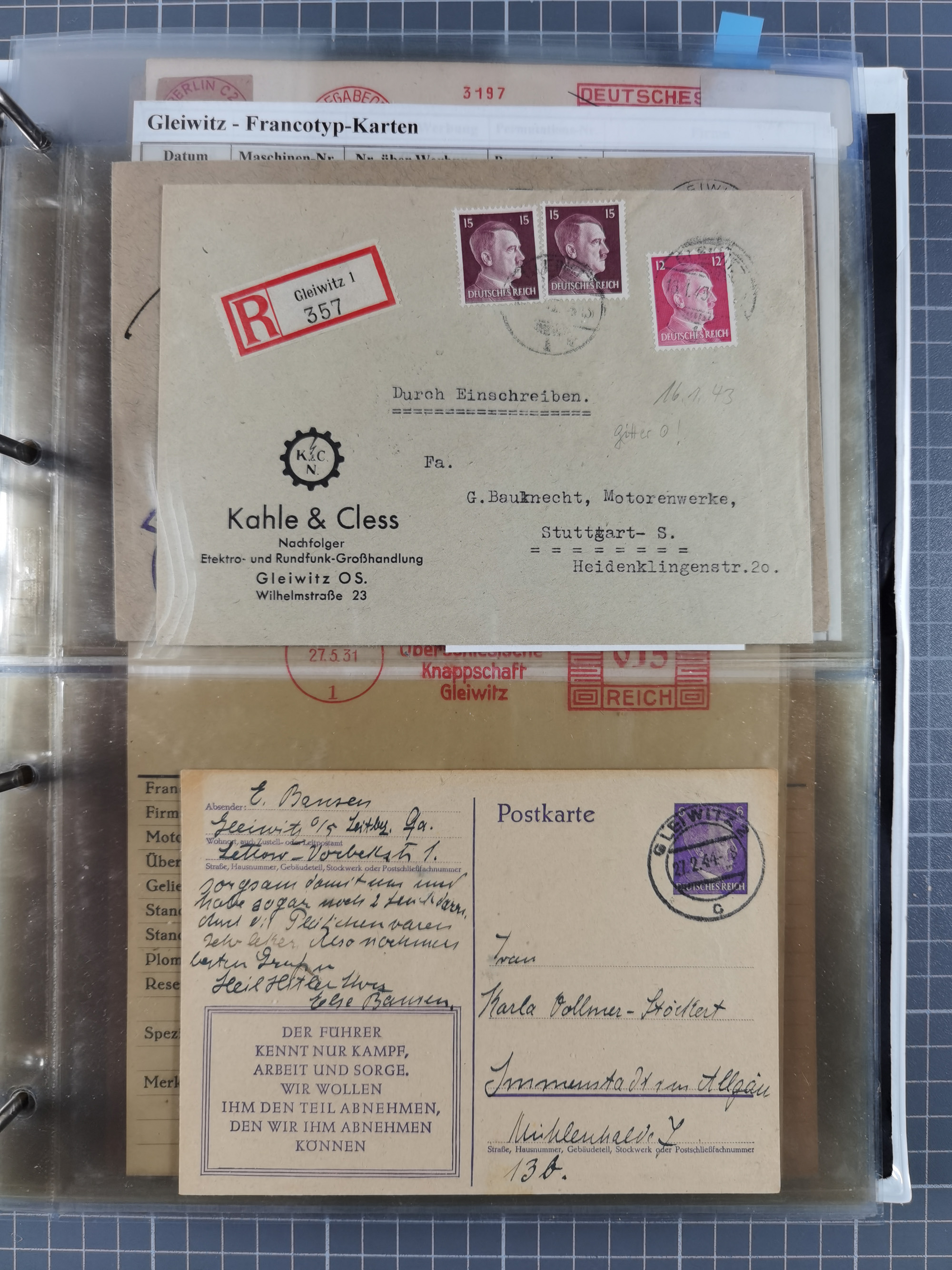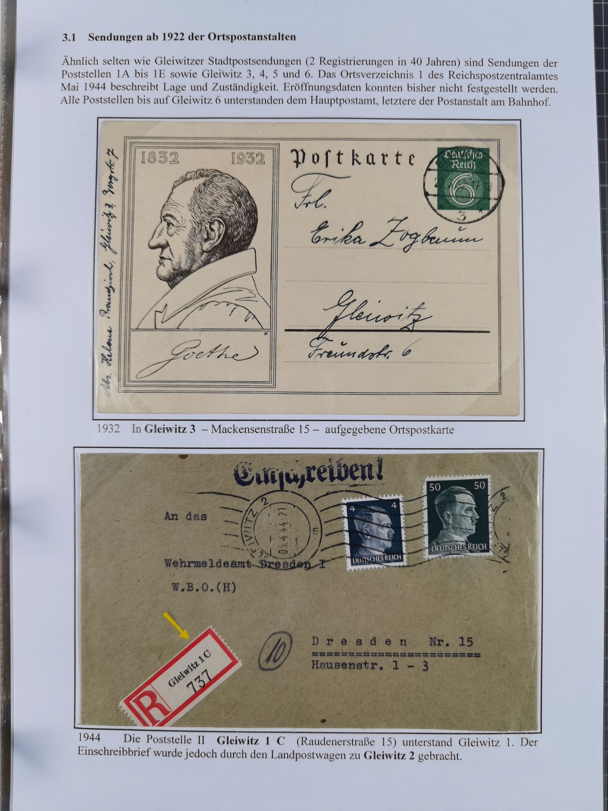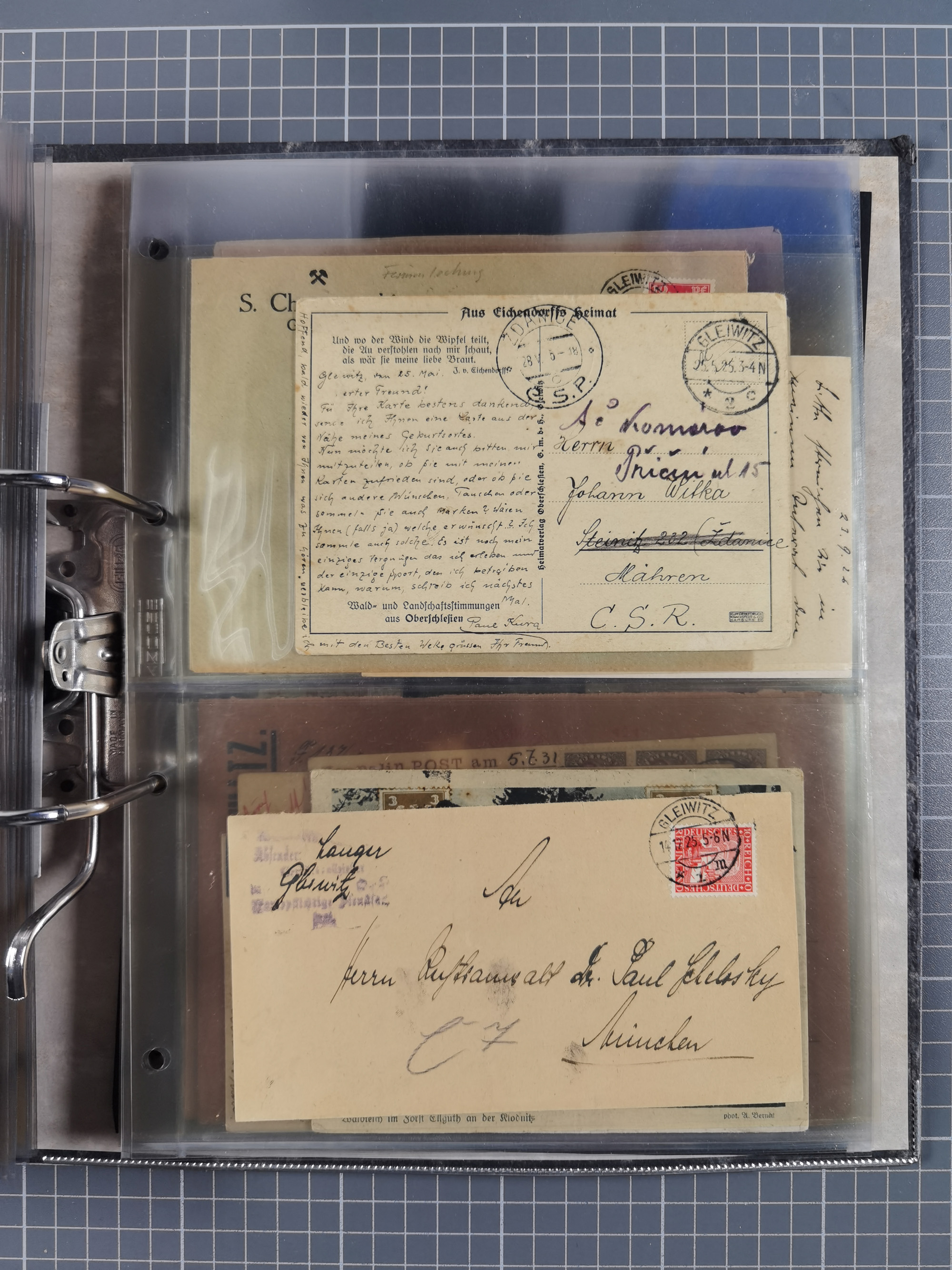 GLEIWITZ: 1817/1950 (ca.), ausstellungsmäßig aufgezogene Sammlung mit reichhaltig zusätzlichem Material, überschlägig rund 350 Belege, dabei Preußen-Nummernstempel auf GSU, Teilfranco-Belege, NDP GAA6 auf Brief, Auslandspost, viel Oberschlesien mit Paketkarten, Flug- und Zeppelin Post, etc. etc. Ein schönes und interessantes Objekt