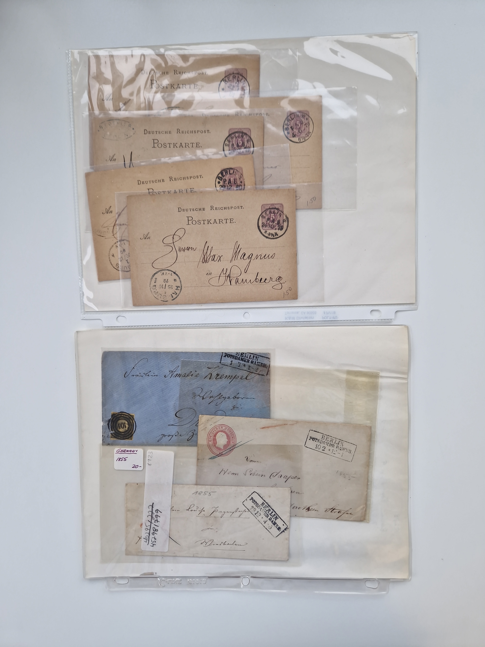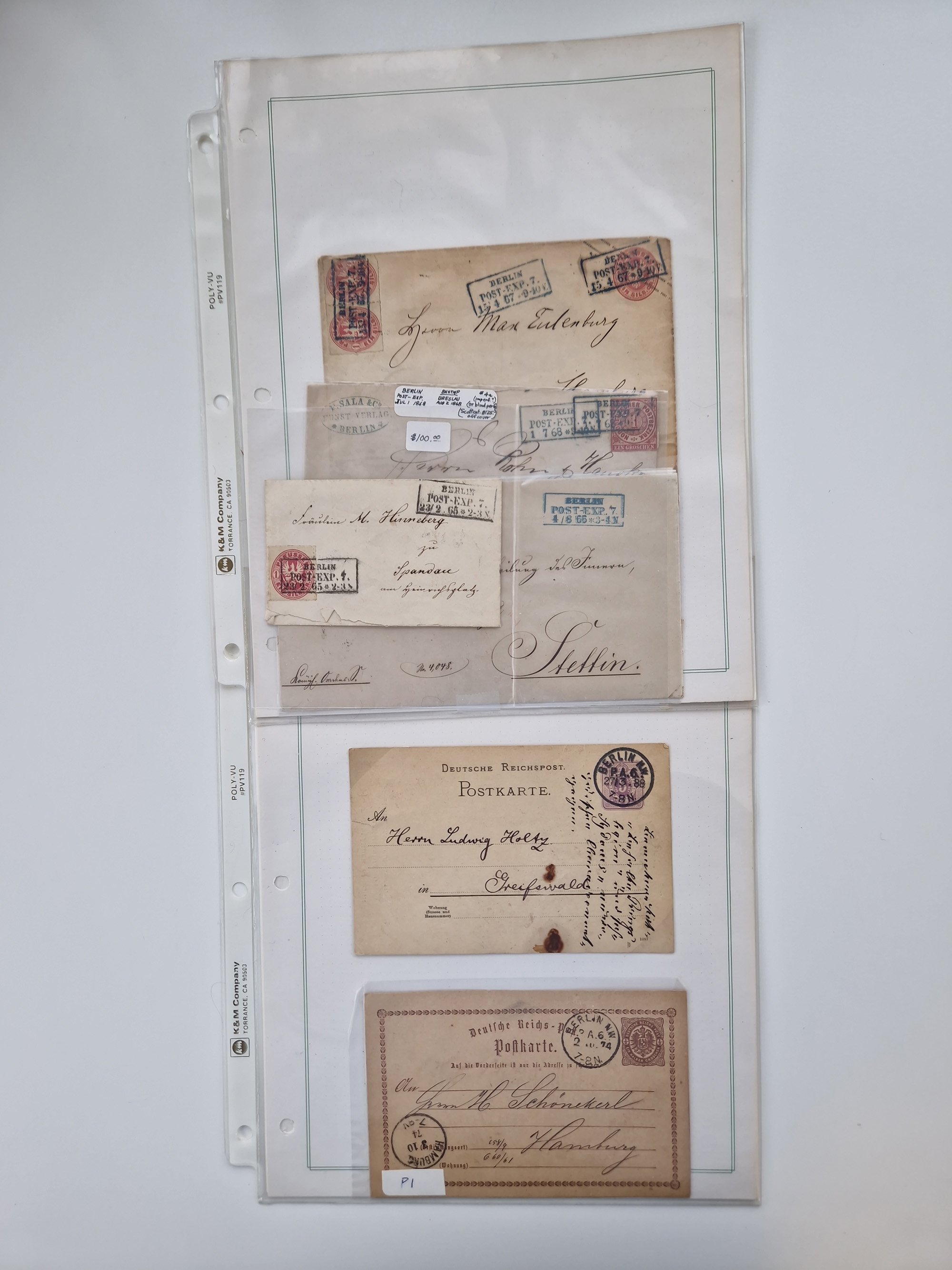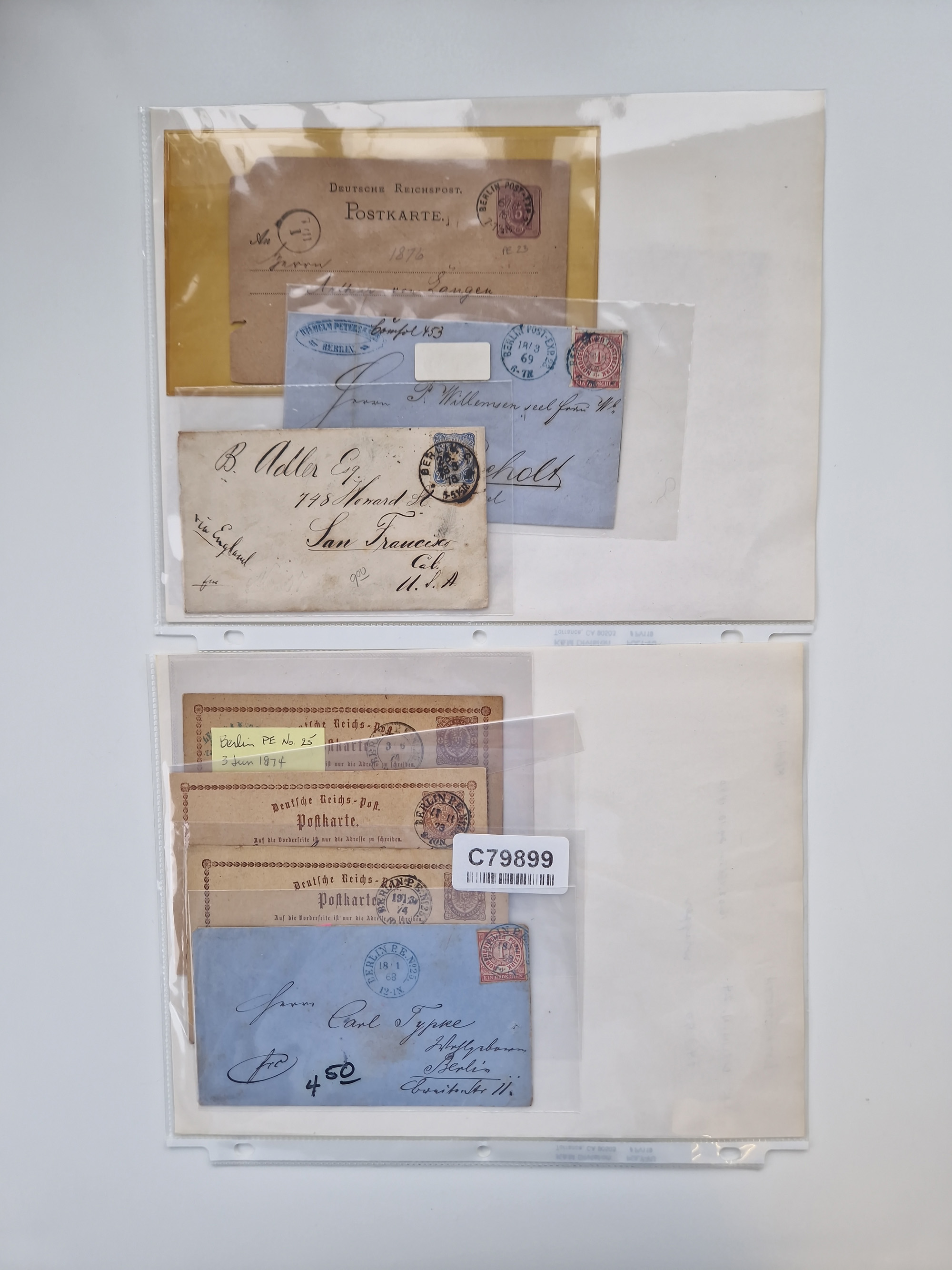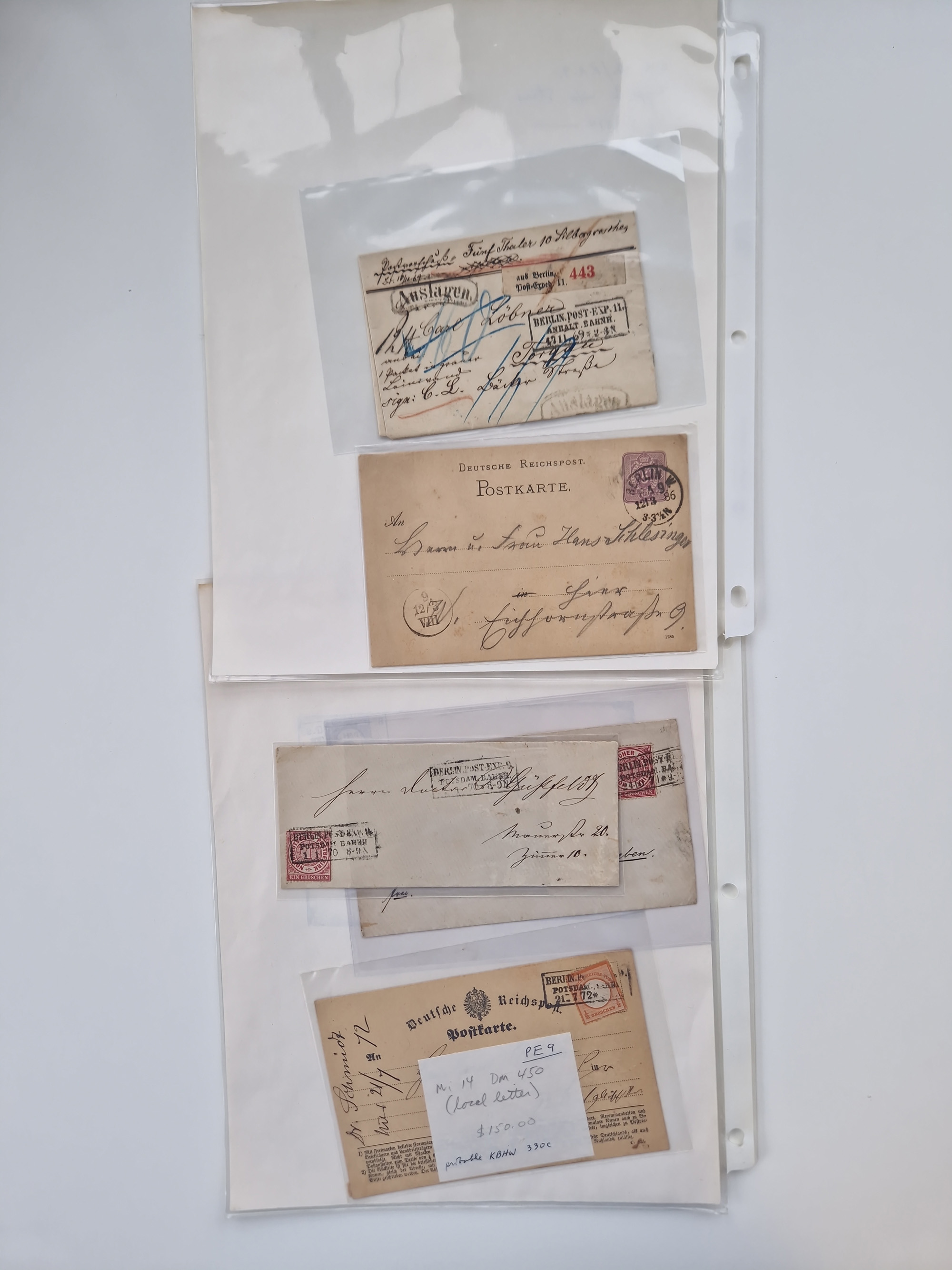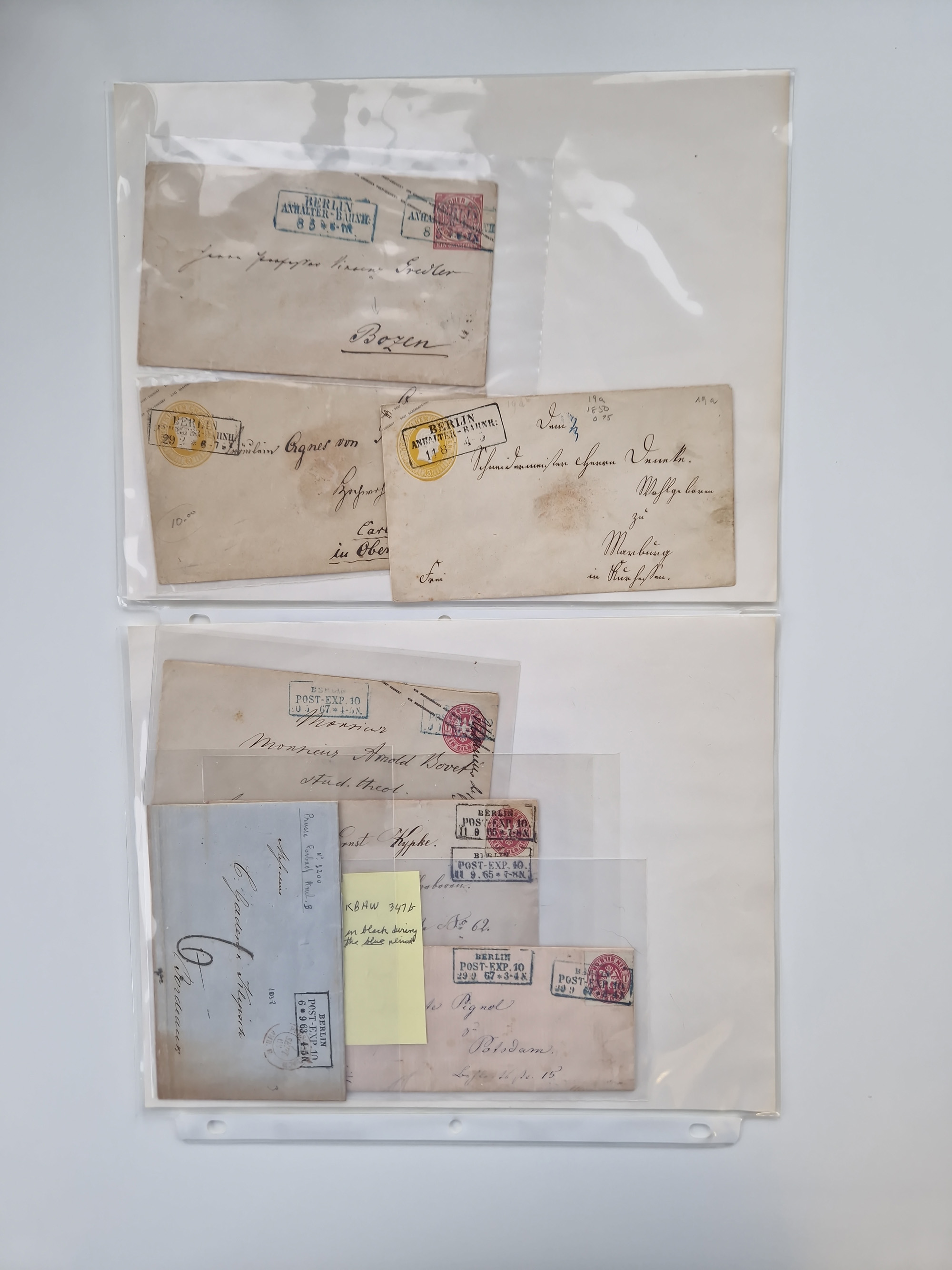Berlin: 1817/1904,Stempel-Sammlung ab Vorphila mit ca. 280 Briefen, Karten und Ganzsachen mit vielen verschiedenen Stempeln inkl. Bahnpost- und Hufeisenstempeln mit besseren, Schwerpunkt ab Preußen bis ca. 1875. Dabei auch u.a. Nummernstempel “106” auf Brief, “BERLIN P.E.7 F. ” auf Paketbegleitbrief, Rahmenstempel “BERLIN CABINETS-EXPEDITION” auf Brief 1871 und Destinationen ab Preußen mit u.a. Italien, Kanada, Polen und USA. Meist klare Abschläge