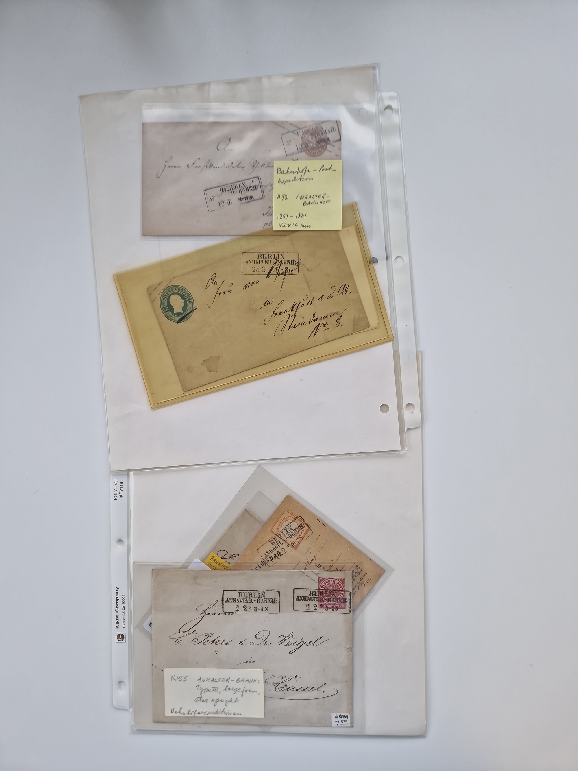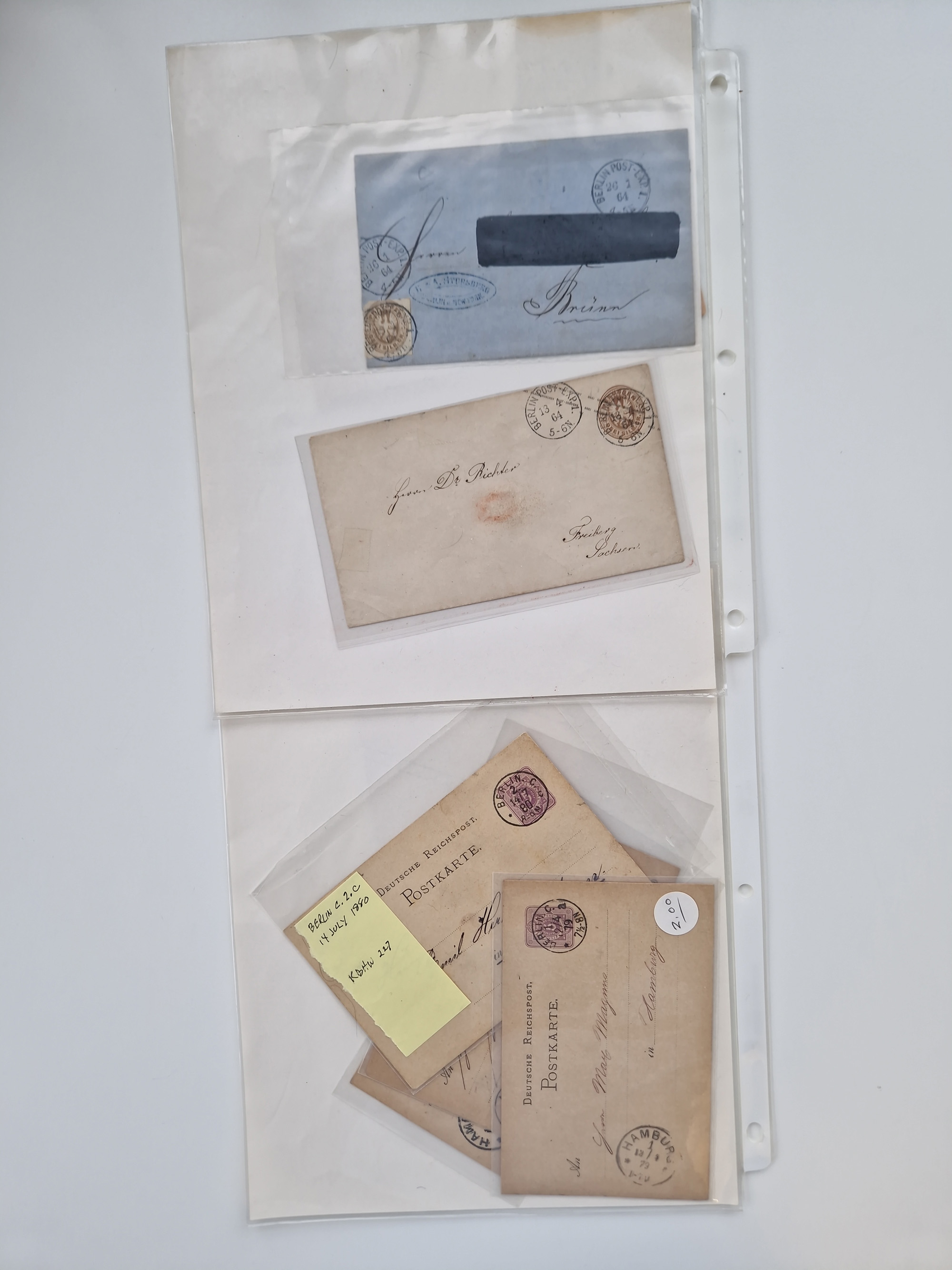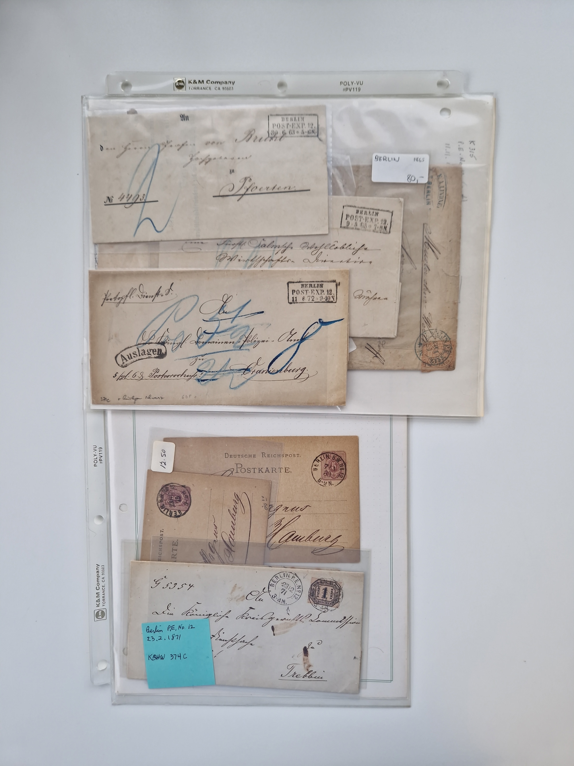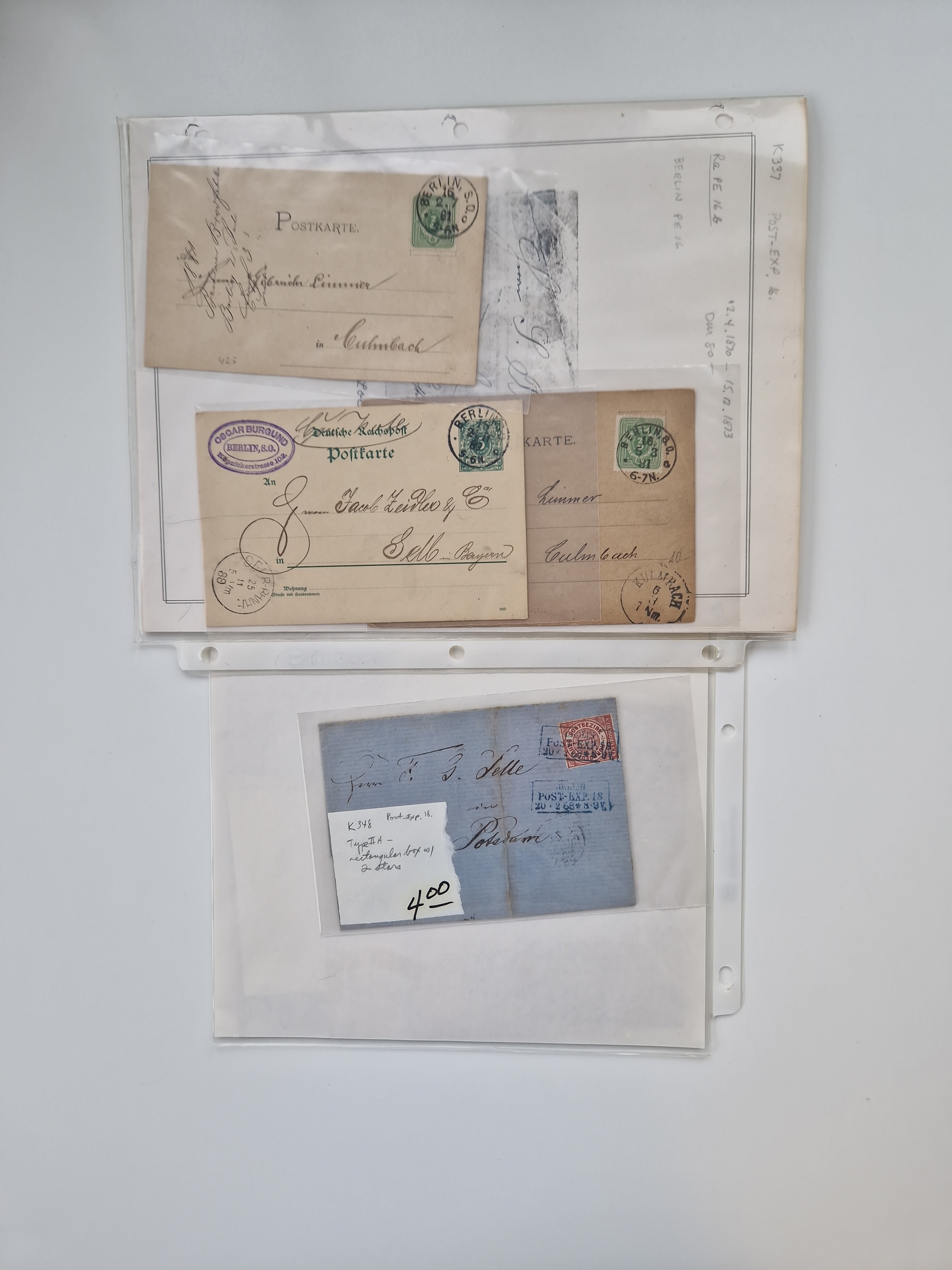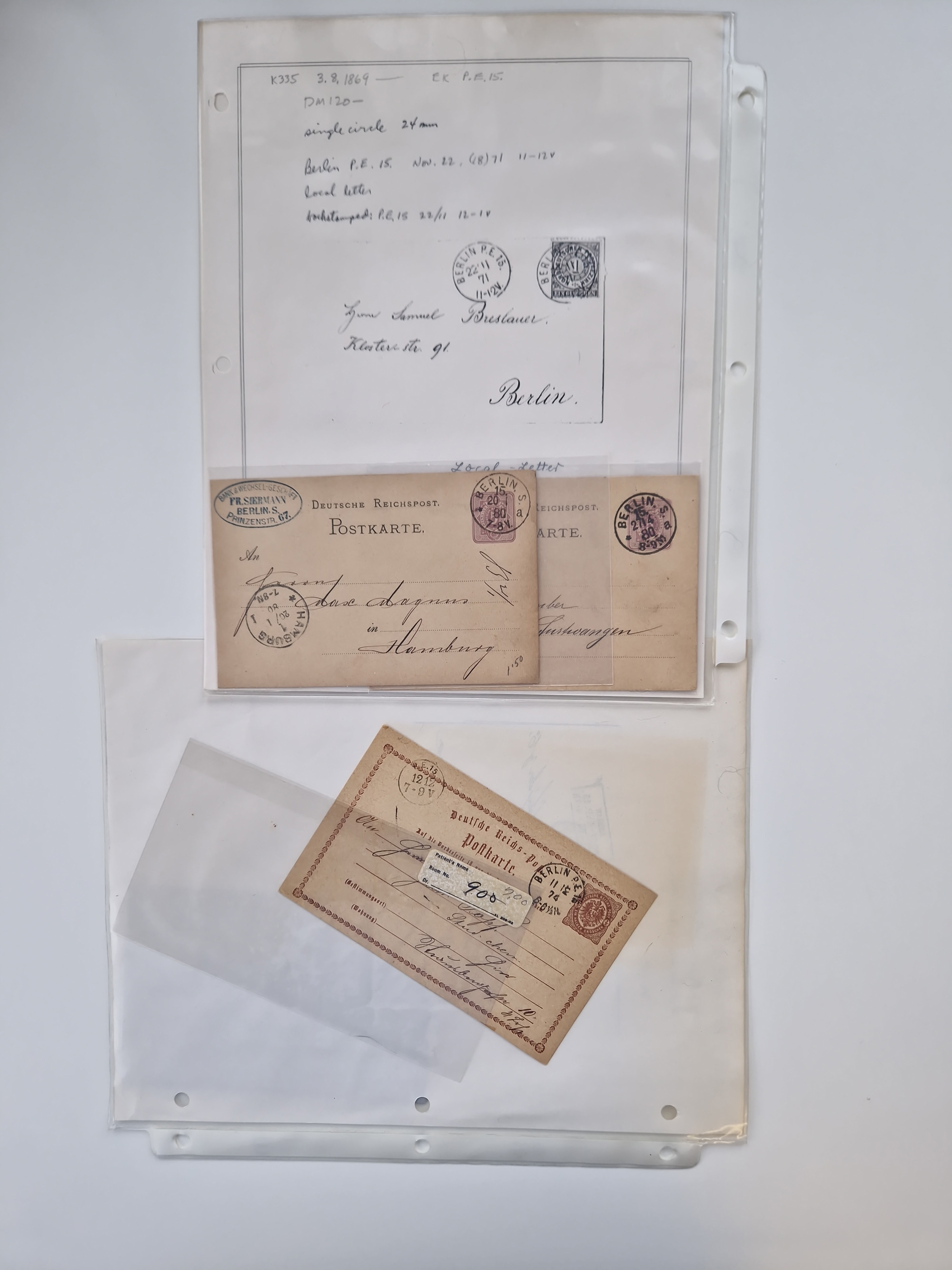 Berlin: 1817/1904,Stempel-Sammlung ab Vorphila mit ca. 280 Briefen, Karten und Ganzsachen mit vielen verschiedenen Stempeln inkl. Bahnpost- und Hufeisenstempeln mit besseren, Schwerpunkt ab Preußen bis ca. 1875. Dabei auch u.a. Nummernstempel “106” auf Brief, “BERLIN P.E.7 F. ” auf Paketbegleitbrief, Rahmenstempel “BERLIN CABINETS-EXPEDITION” auf Brief 1871 und Destinationen ab Preußen mit u.a. Italien, Kanada, Polen und USA. Meist klare Abschläge