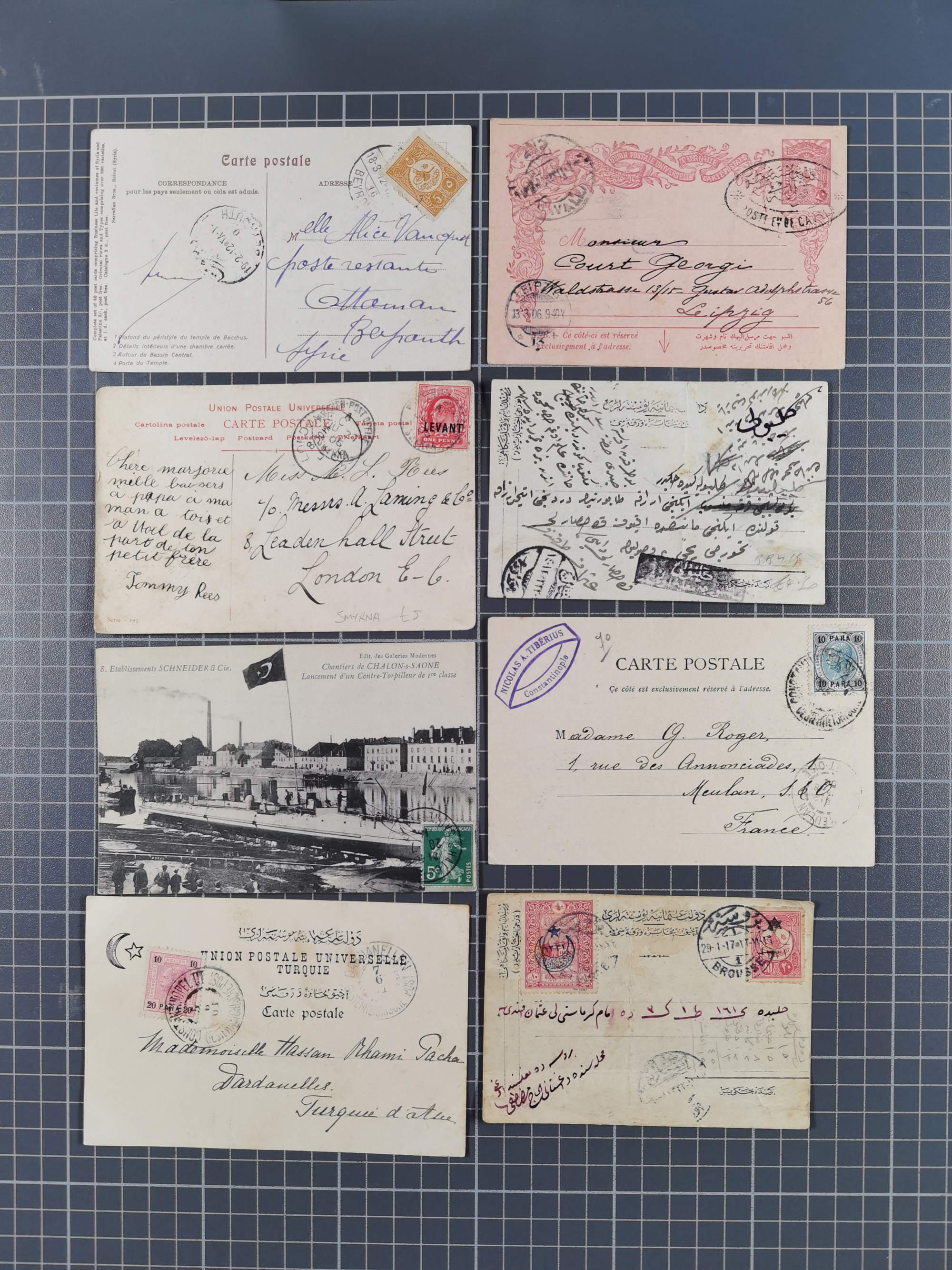 1856/1918, Postal History of Ottoman Syria (7), including prefilatelic cover Alep, Tatar post document with cancellations of Damas and Beyrouth, postcard 1890 from Aleppo via Alexandrette and Port-Said via french ship to France, censor marks of Aleppo and Damas,