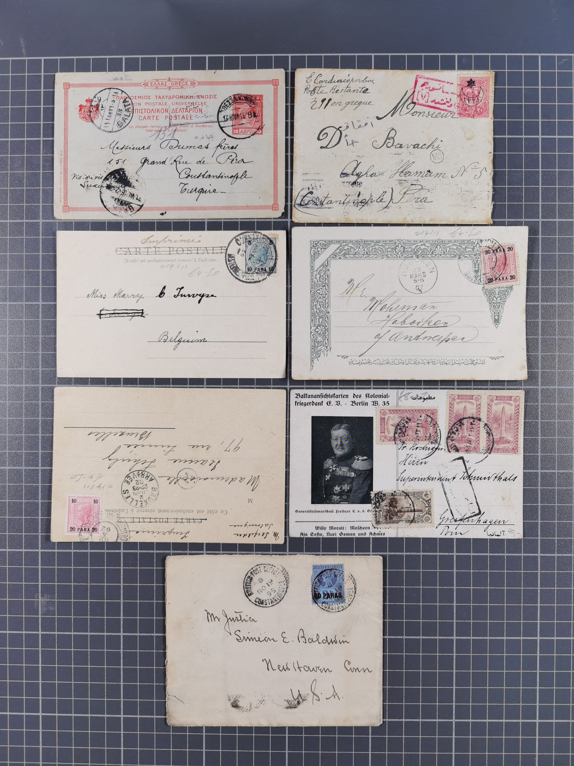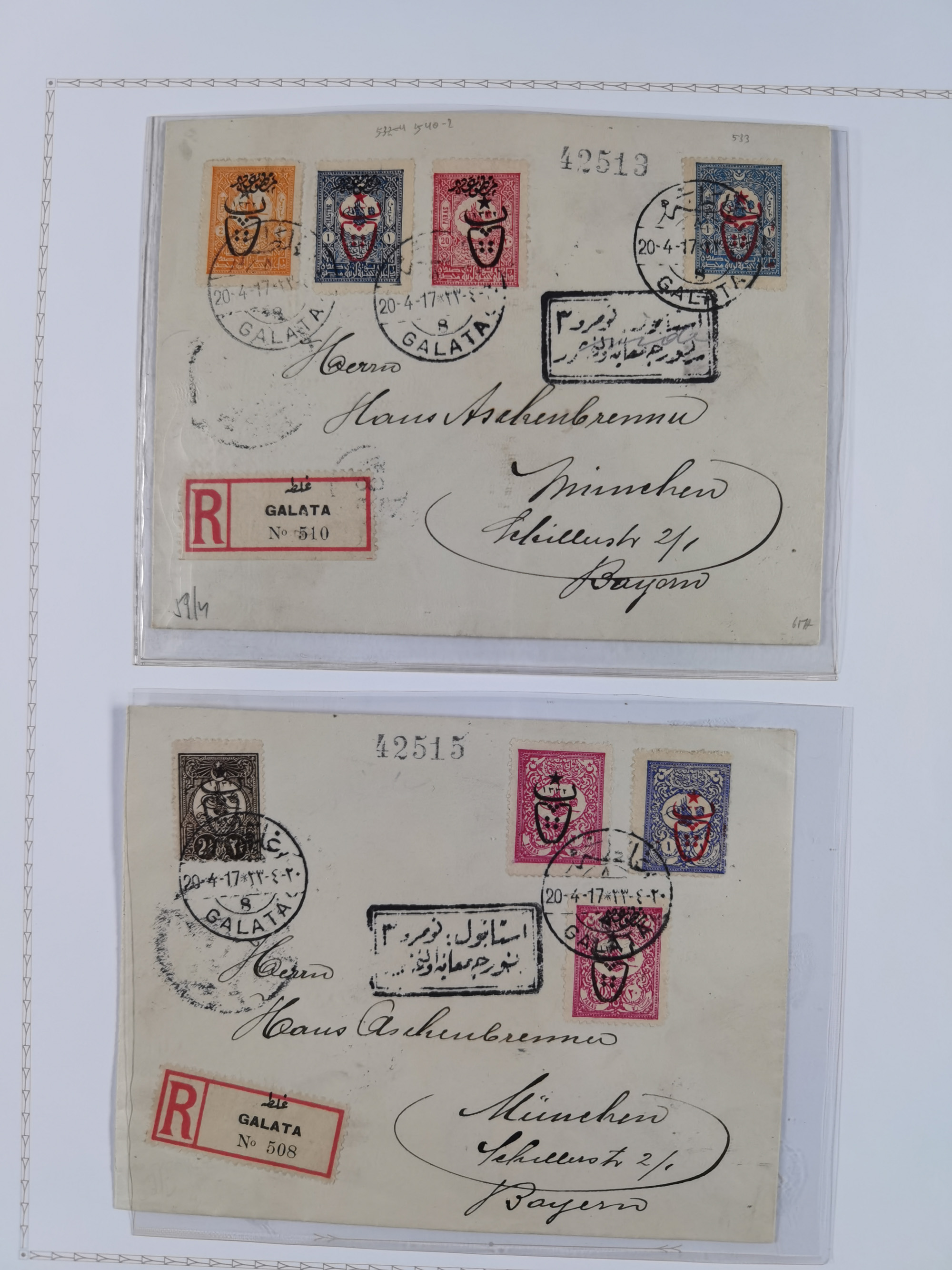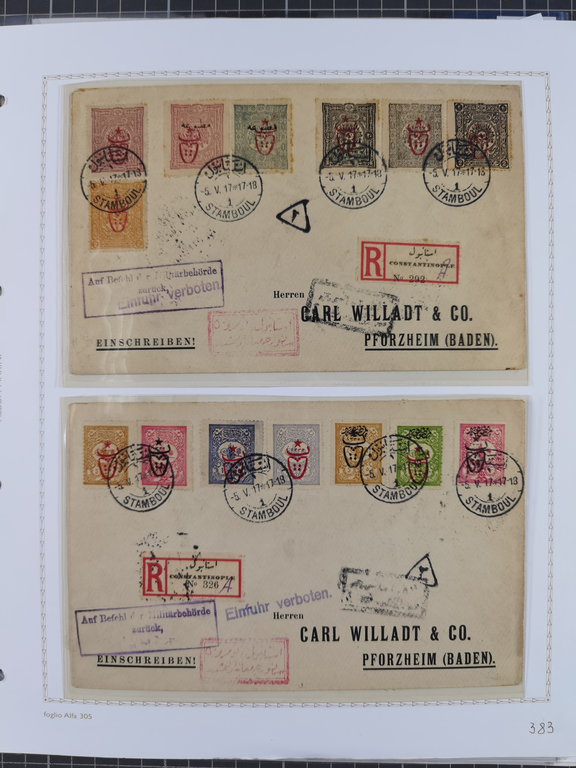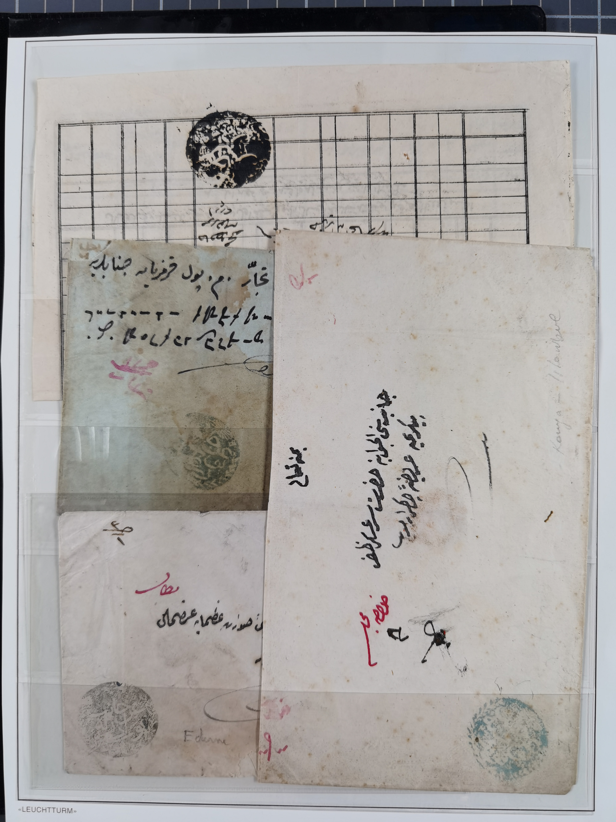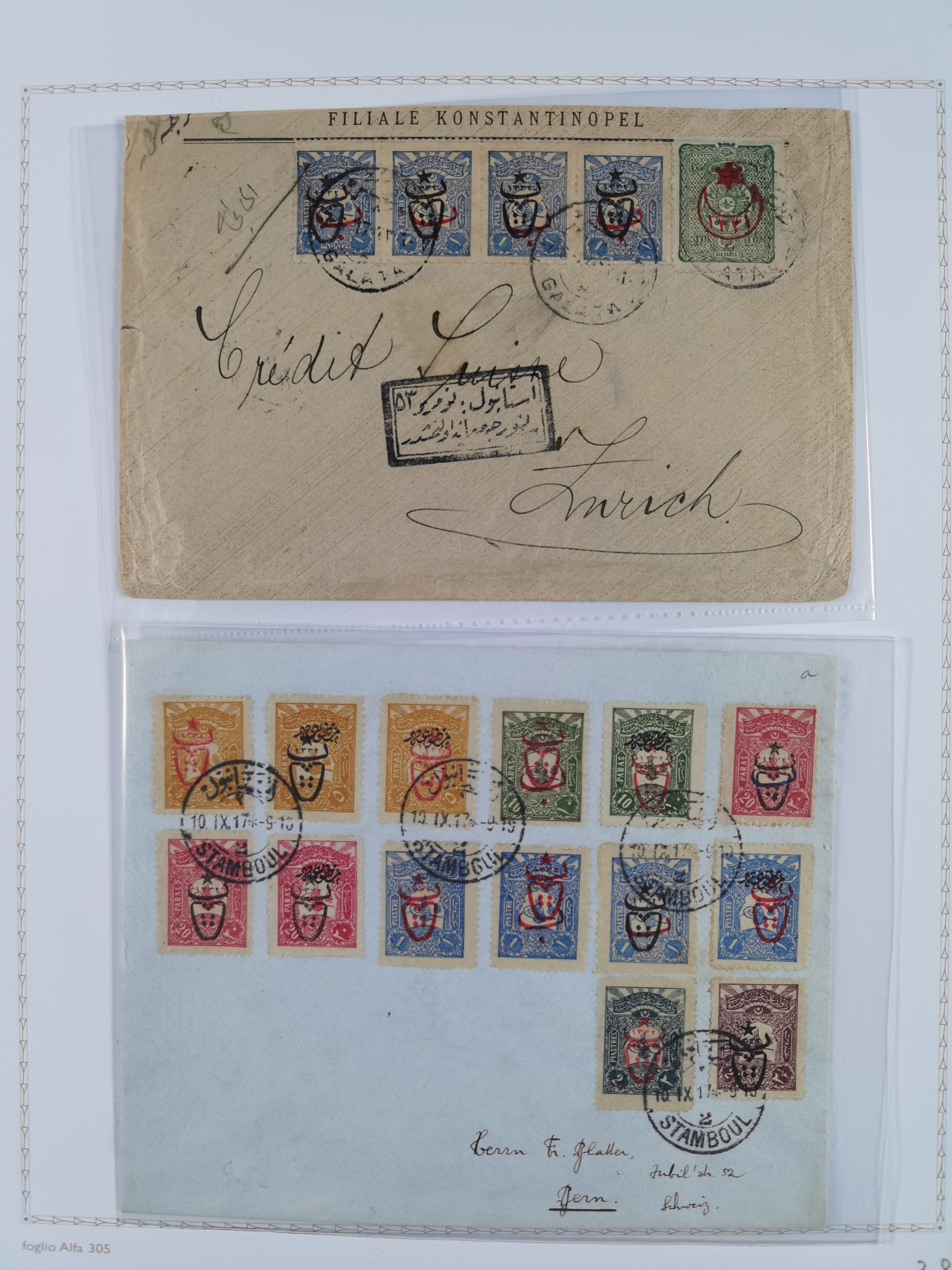 1851/1912, delightful exhibit collection with 37 covers and cards, covering the Ottoman, Italian and French Offices in Tripoli including the consular postal services, many better usages with 1851 entire letter from Livorno via Marseilles and Malta to Tripoli de Barberia, 1881 envelope from “TRIPOLI DI BARBERIA” to Livorno with Italian Levant 5c. and 10 c. (x2) tied by mute “annulo a rombi”, official envelope headed “R. CONSOLATO D´ITALIA” and on reverse its large seal handstamp, 1893 envelope to Constantinople with French Sage adhesives with pearled cds “TRIPOLI BARBARIE 14 FEVR 93” in mixed franking with Turkey 1 pi. adhesive (opened for display), etc.; except for the occasional fault in overall very good condition. An alluring specialist assembly, neatly mounted and described on album pages