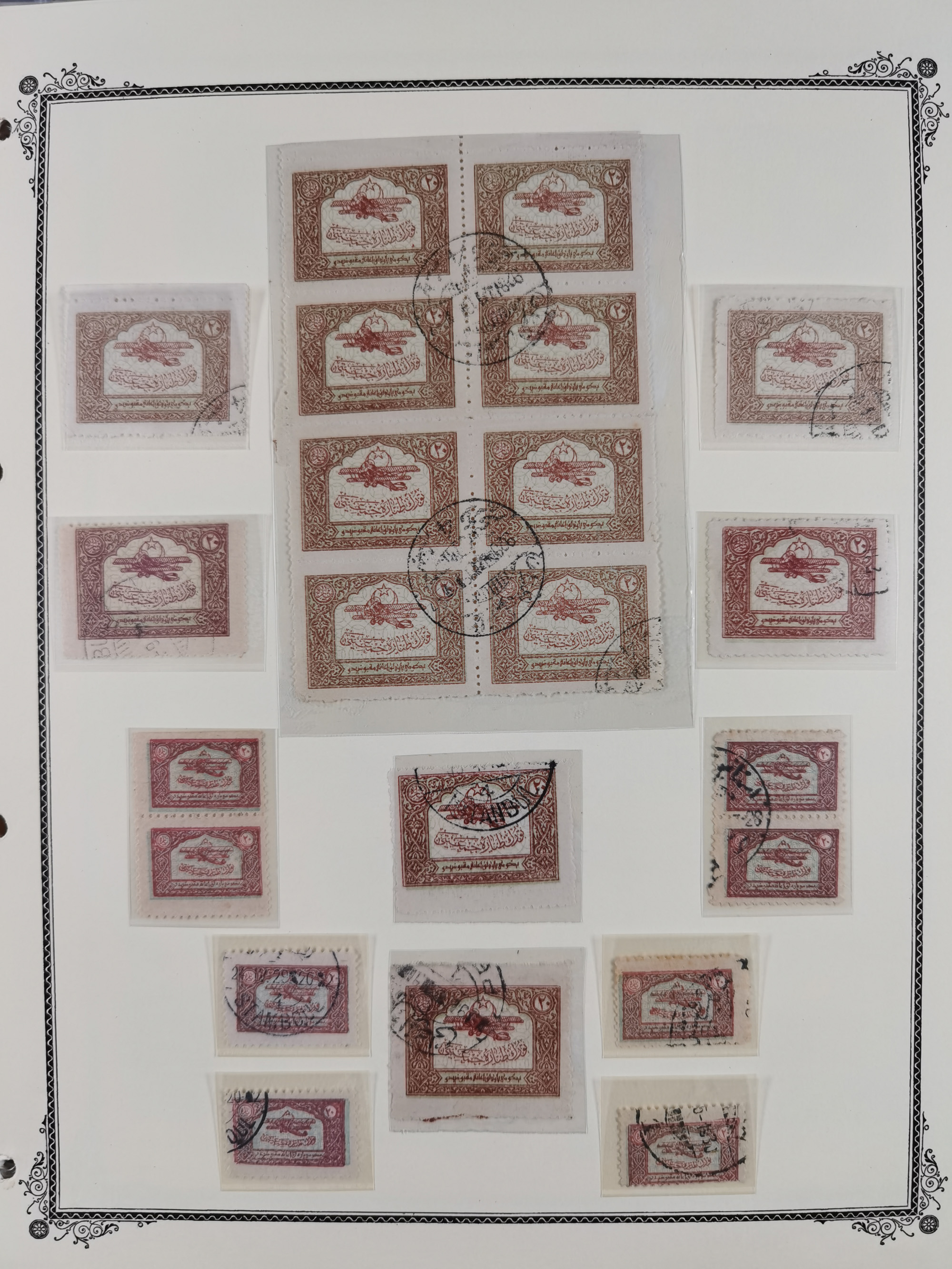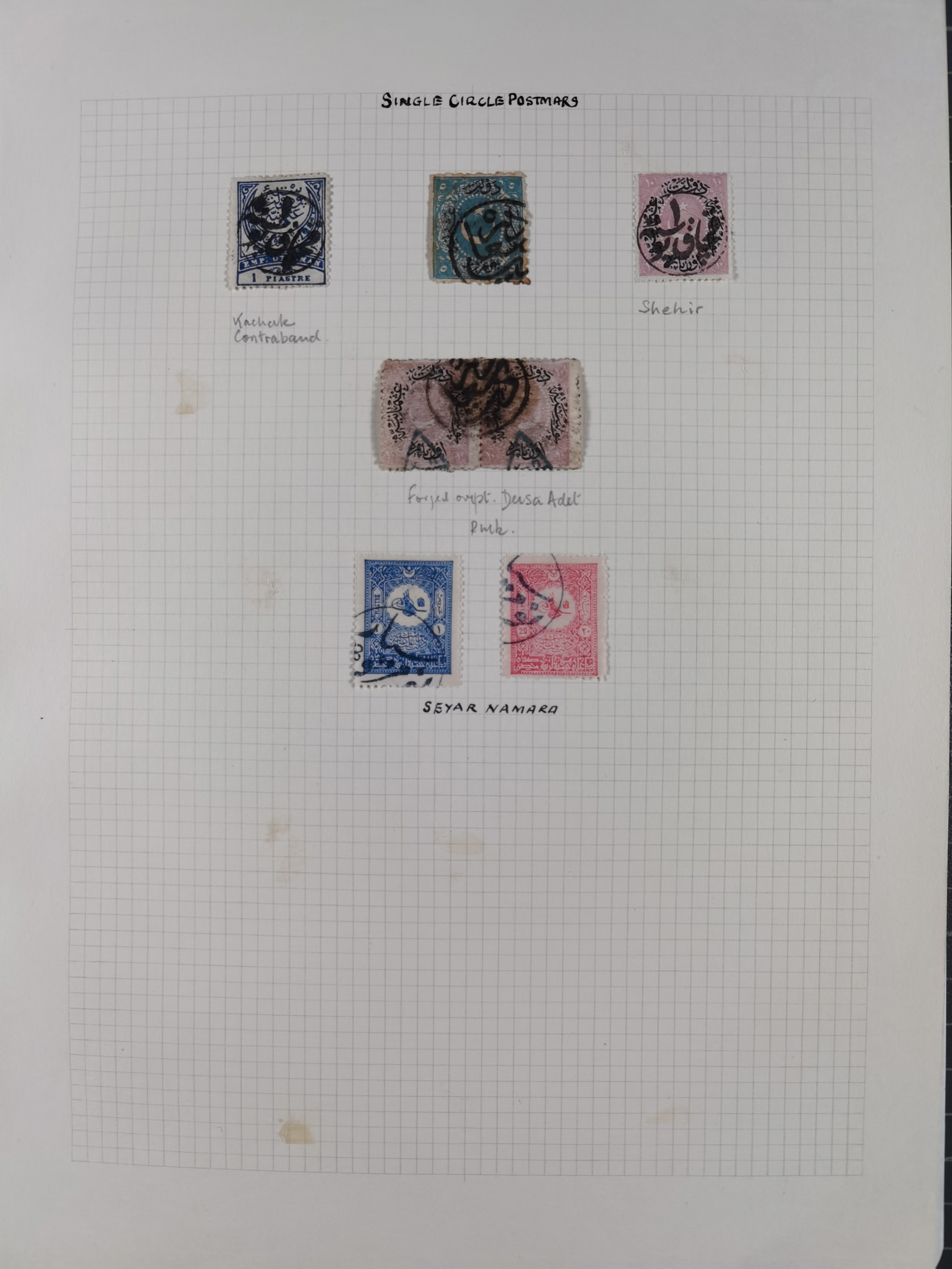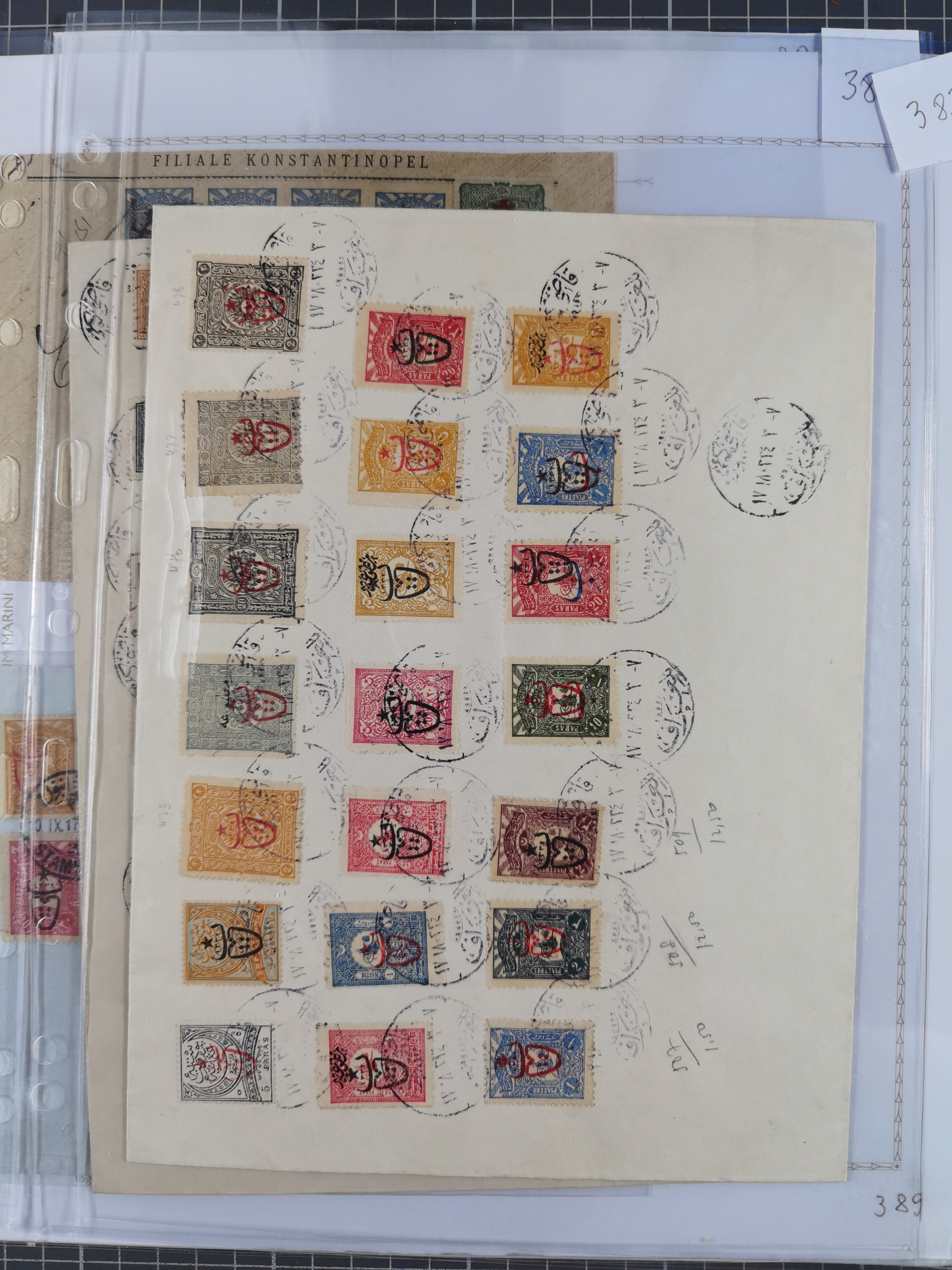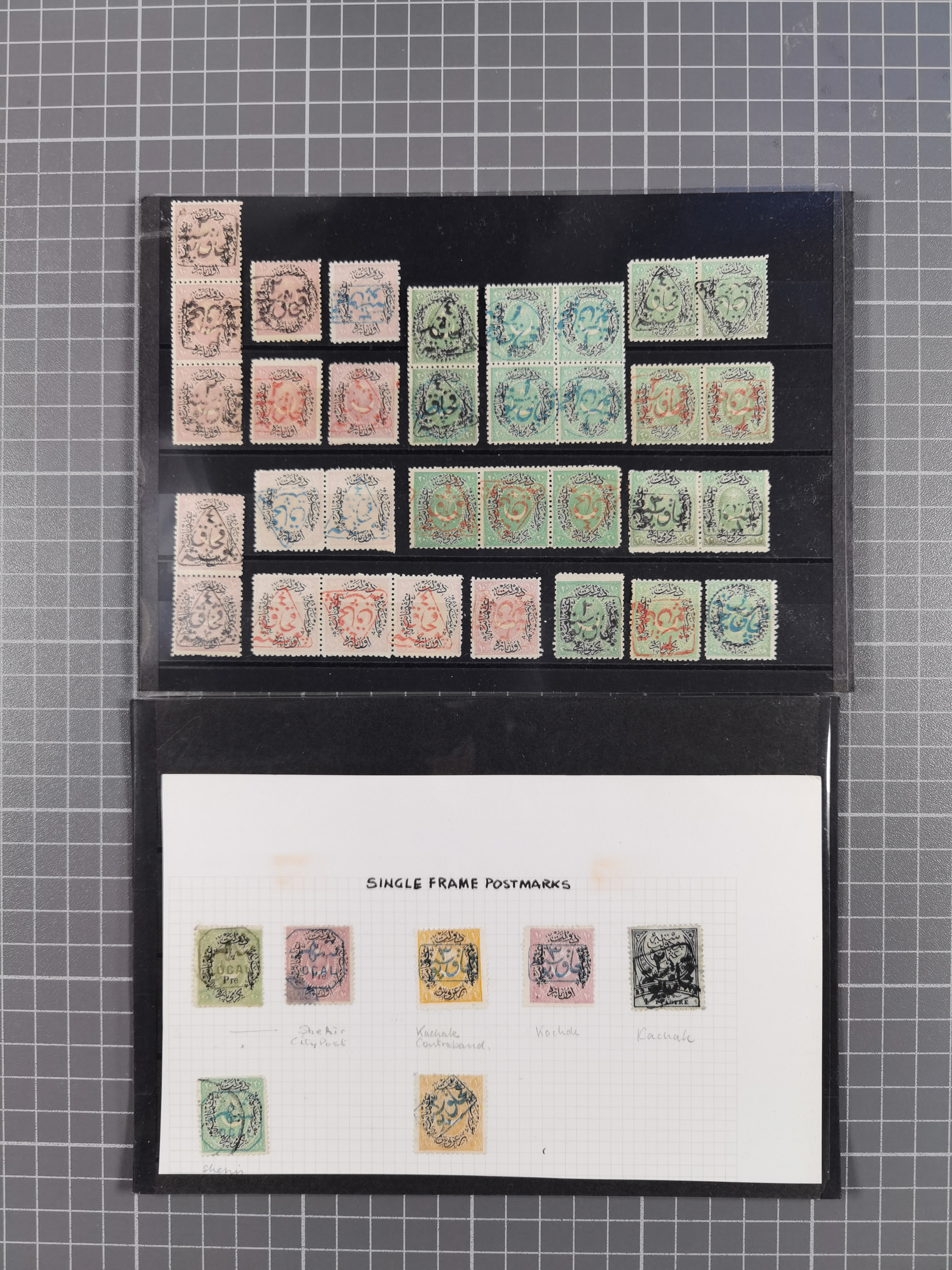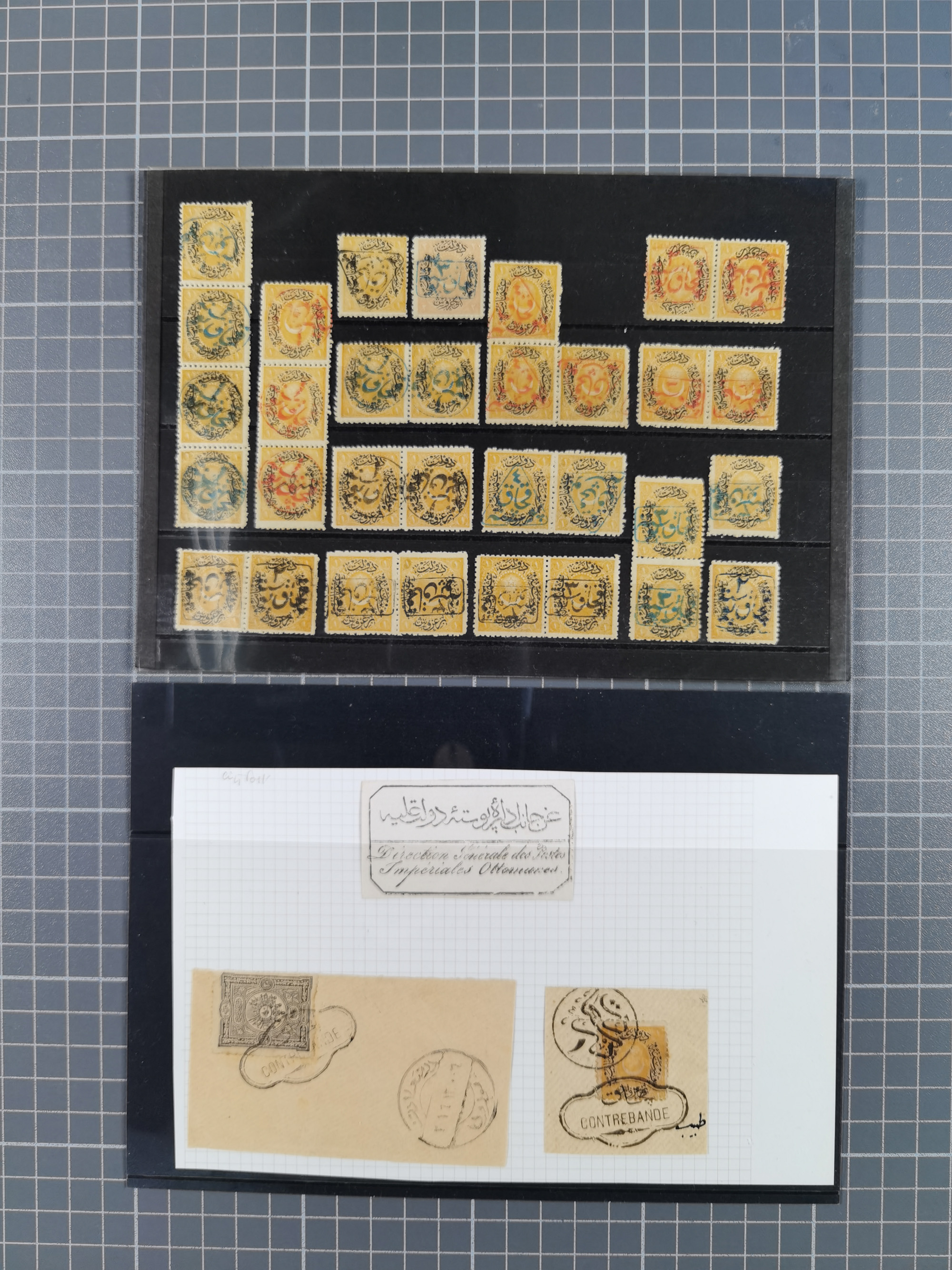1865/1980 (ca.), Collection of mostly excellent copies of the “Duloz” issues with nice and clear cancellations in a very lovingly designed album, 1 pia. yellow 1871 corner margin block of 15, ‘Arabkir’ on 1875 block of nine, ship cancels ‘Vapur’ and numeral railway marks, 1, 2, 3 and 6 of Smyrna Aidin railway. Lost territories with clear cancellations of Irak, Bulgaria, Greece with islands, Lebanon & Palestine, Albania and Yugoslawia, nice pieces and multiples, neatly in two albums, plus 22 Duloz envelopes. Coles & Walker handbooks Part 1, 2 and 4.