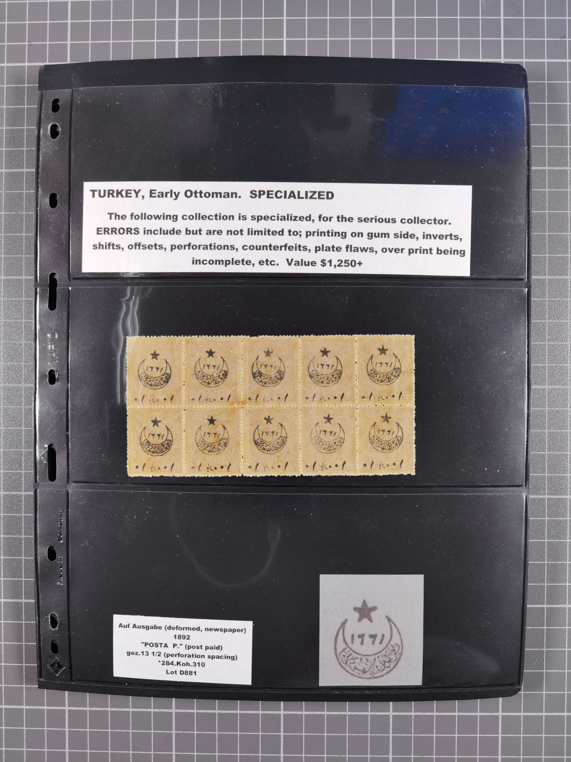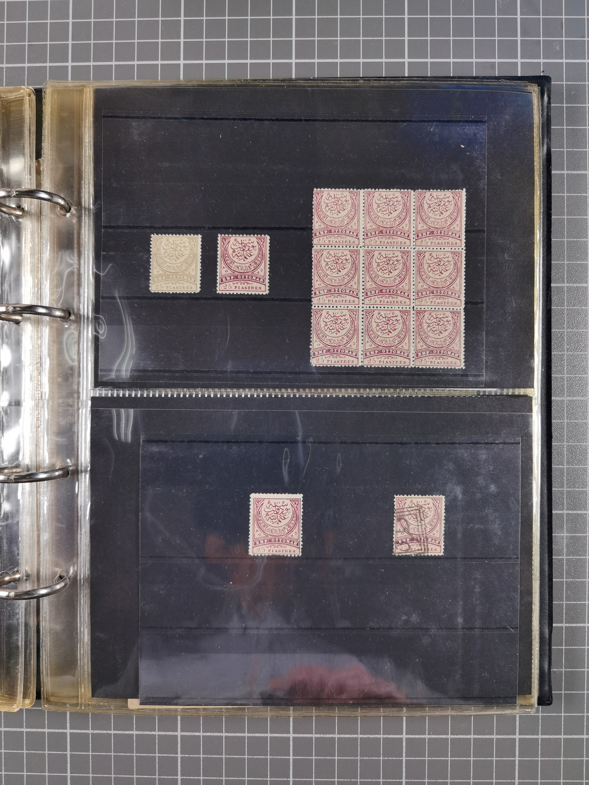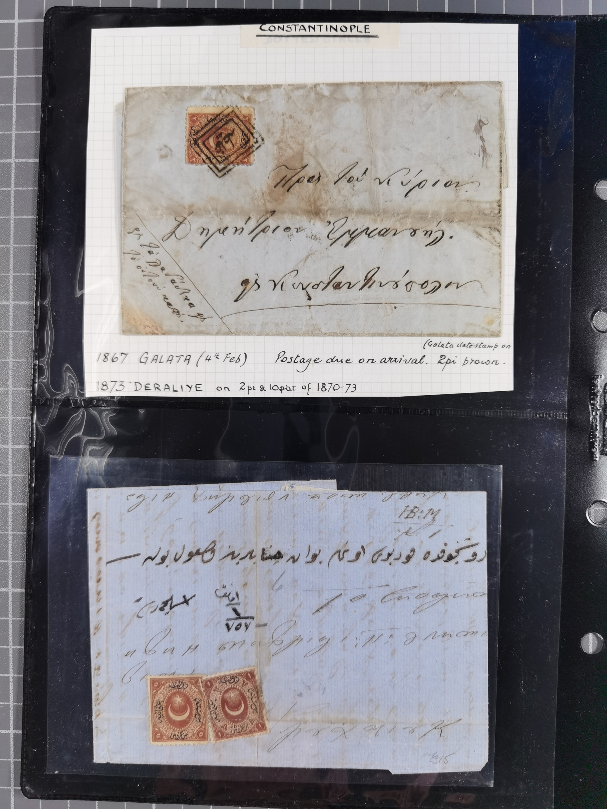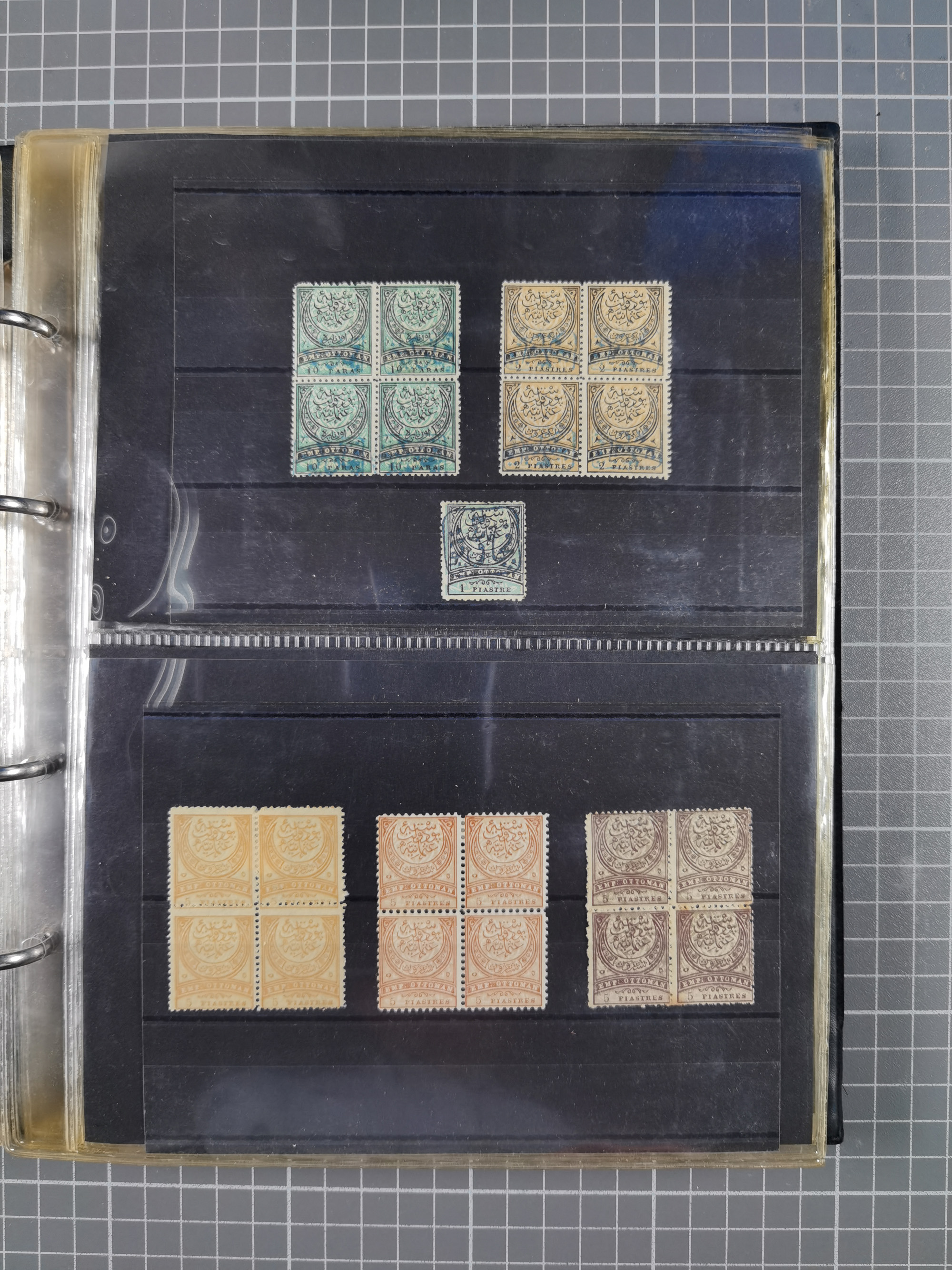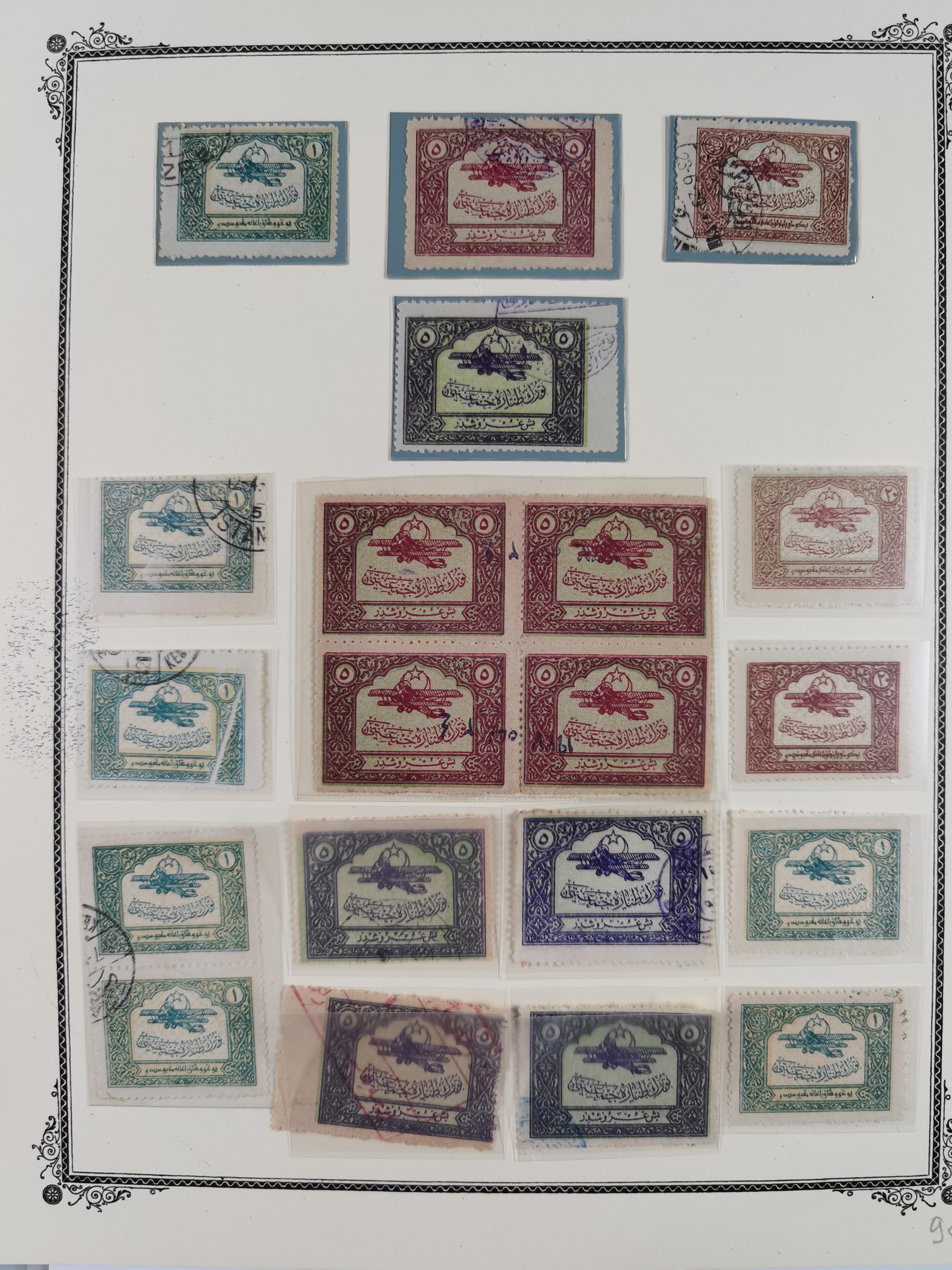 1865/1980 (ca.), Collection of mostly excellent copies of the “Duloz” issues with nice and clear cancellations in a very lovingly designed album, 1 pia. yellow 1871 corner margin block of 15, ‘Arabkir’ on 1875 block of nine, ship cancels ‘Vapur’ and numeral railway marks, 1, 2, 3 and 6 of Smyrna Aidin railway. Lost territories with clear cancellations of Irak, Bulgaria, Greece with islands, Lebanon & Palestine, Albania and Yugoslawia, nice pieces and multiples, neatly in two albums, plus 22 Duloz envelopes. Coles & Walker handbooks Part 1, 2 and 4.