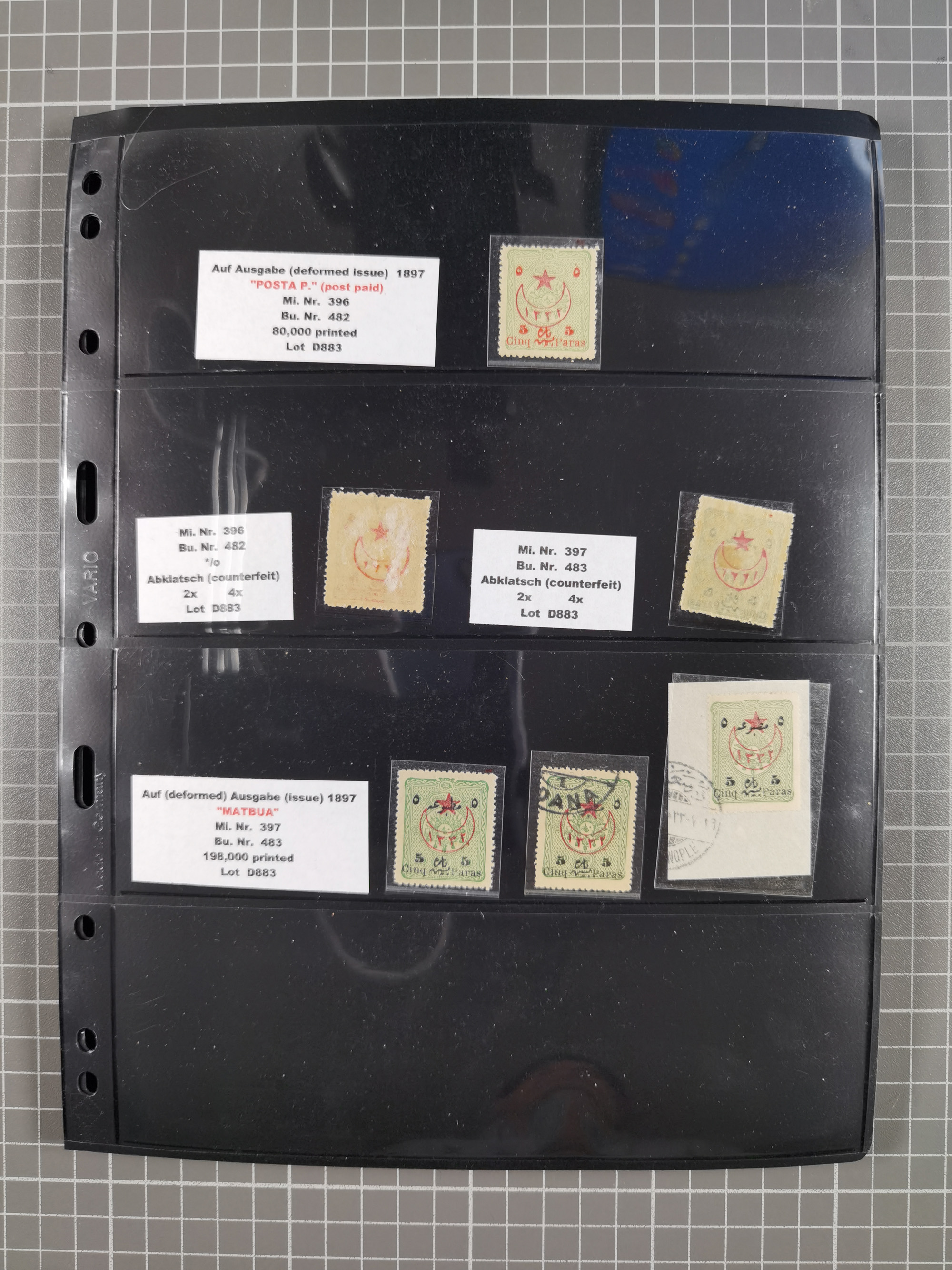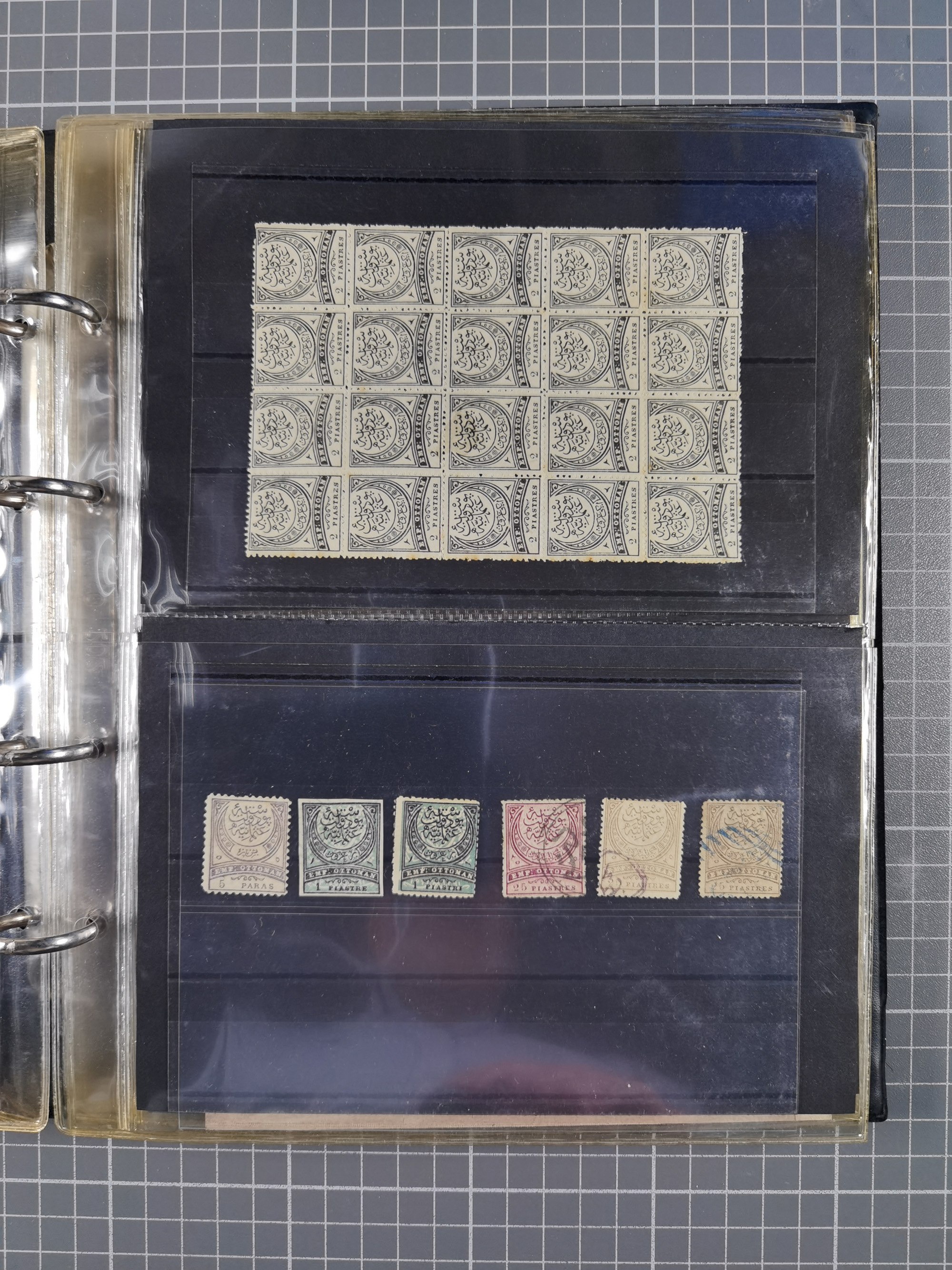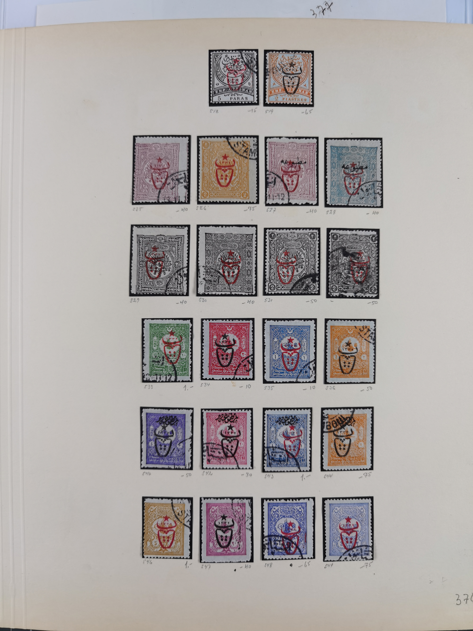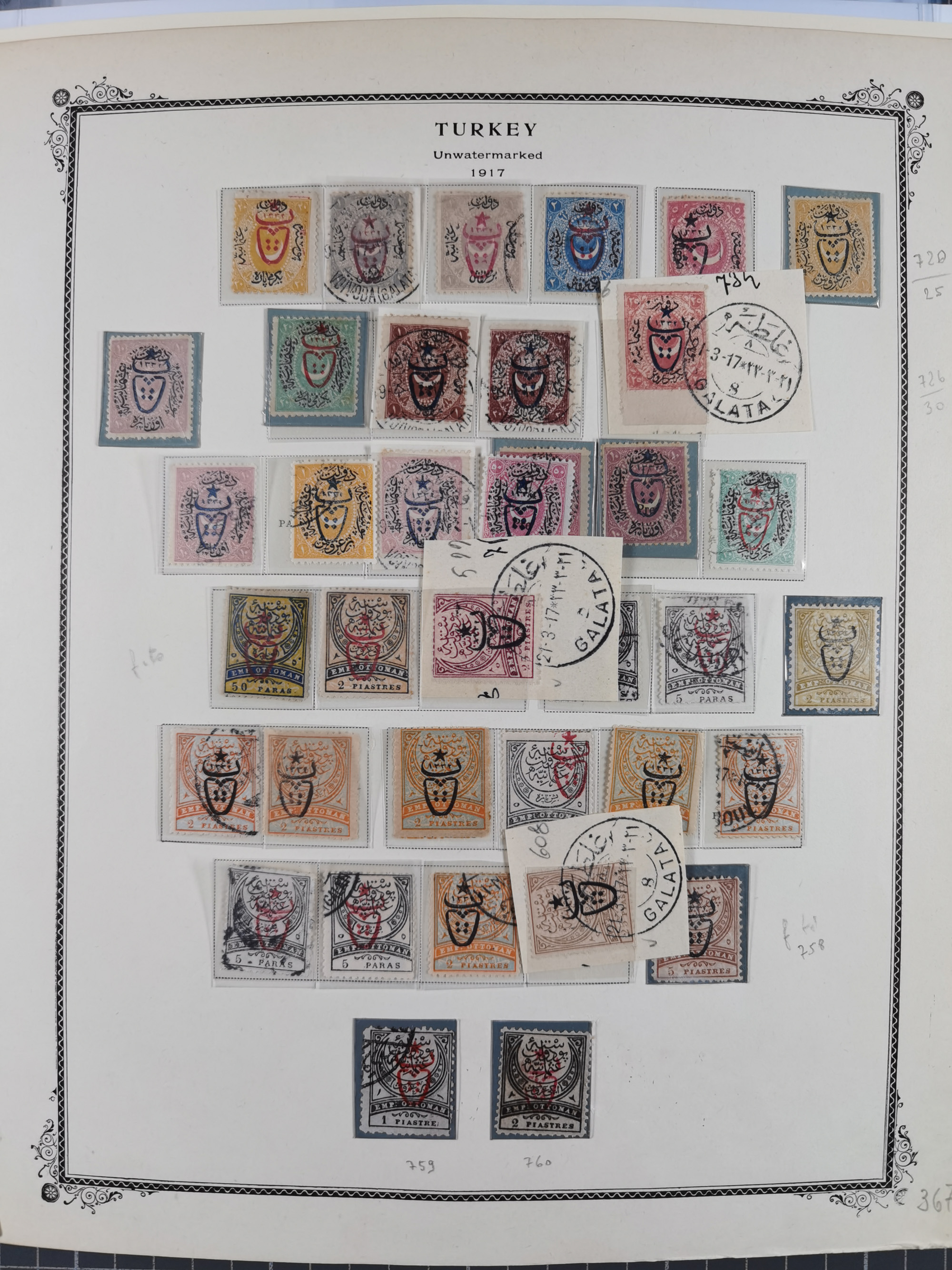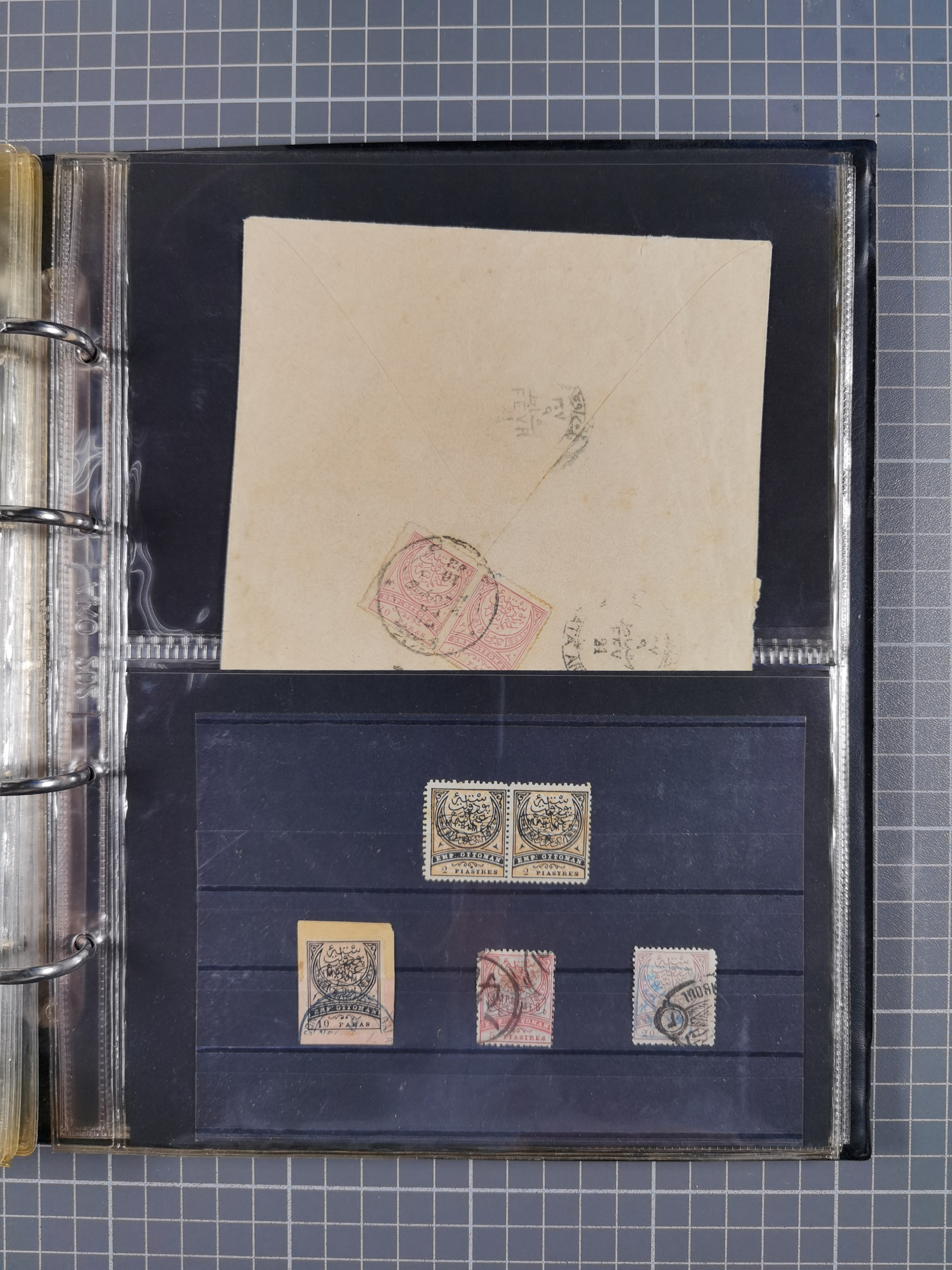 1865/1980 (ca.), Collection of mostly excellent copies of the “Duloz” issues with nice and clear cancellations in a very lovingly designed album, 1 pia. yellow 1871 corner margin block of 15, ‘Arabkir’ on 1875 block of nine, ship cancels ‘Vapur’ and numeral railway marks, 1, 2, 3 and 6 of Smyrna Aidin railway. Lost territories with clear cancellations of Irak, Bulgaria, Greece with islands, Lebanon & Palestine, Albania and Yugoslawia, nice pieces and multiples, neatly in two albums, plus 22 Duloz envelopes. Coles & Walker handbooks Part 1, 2 and 4.