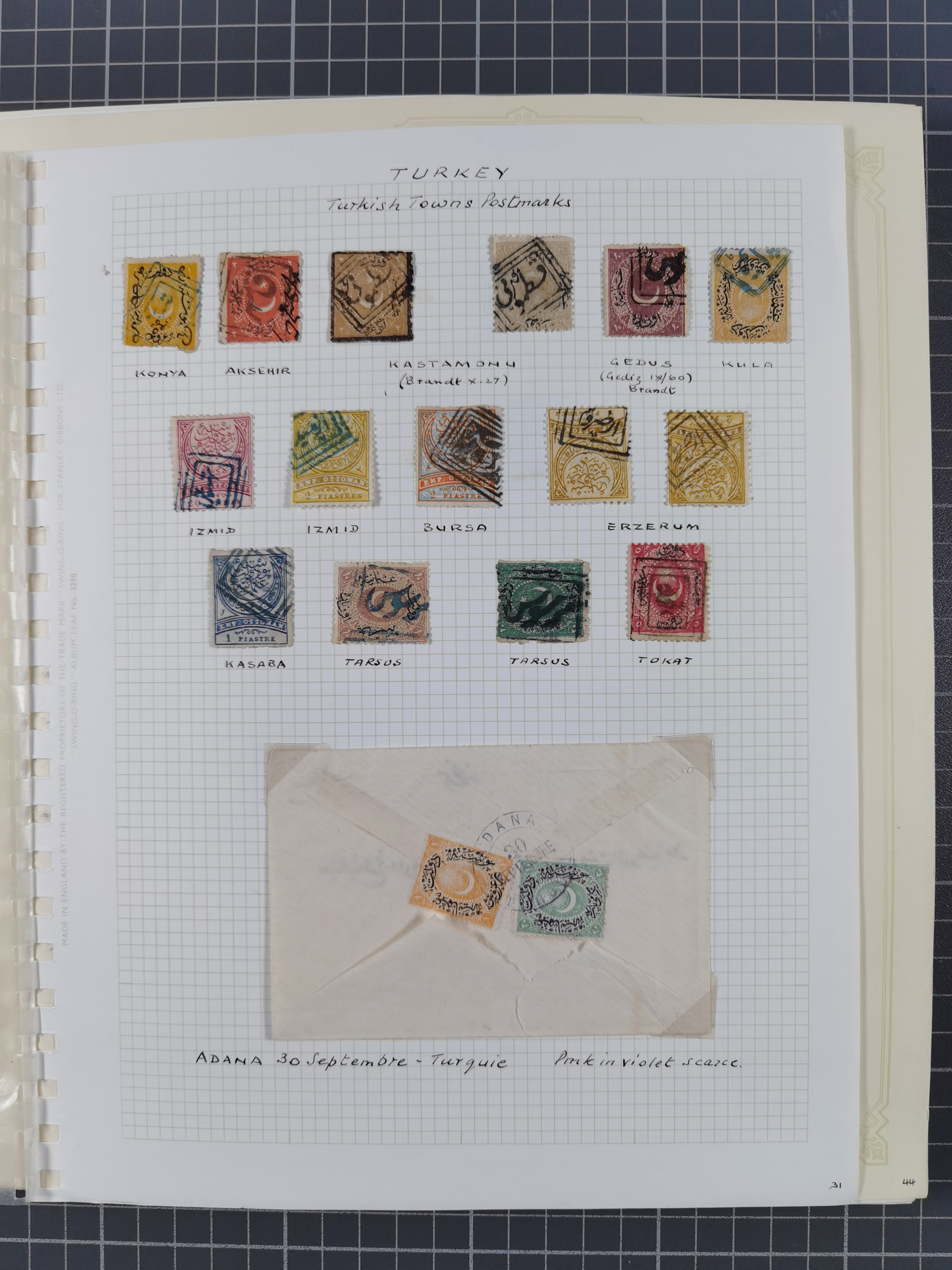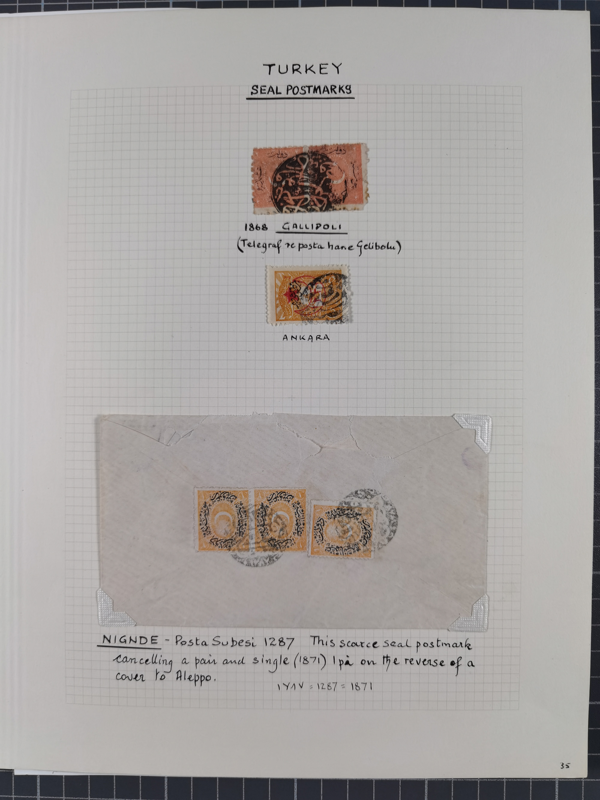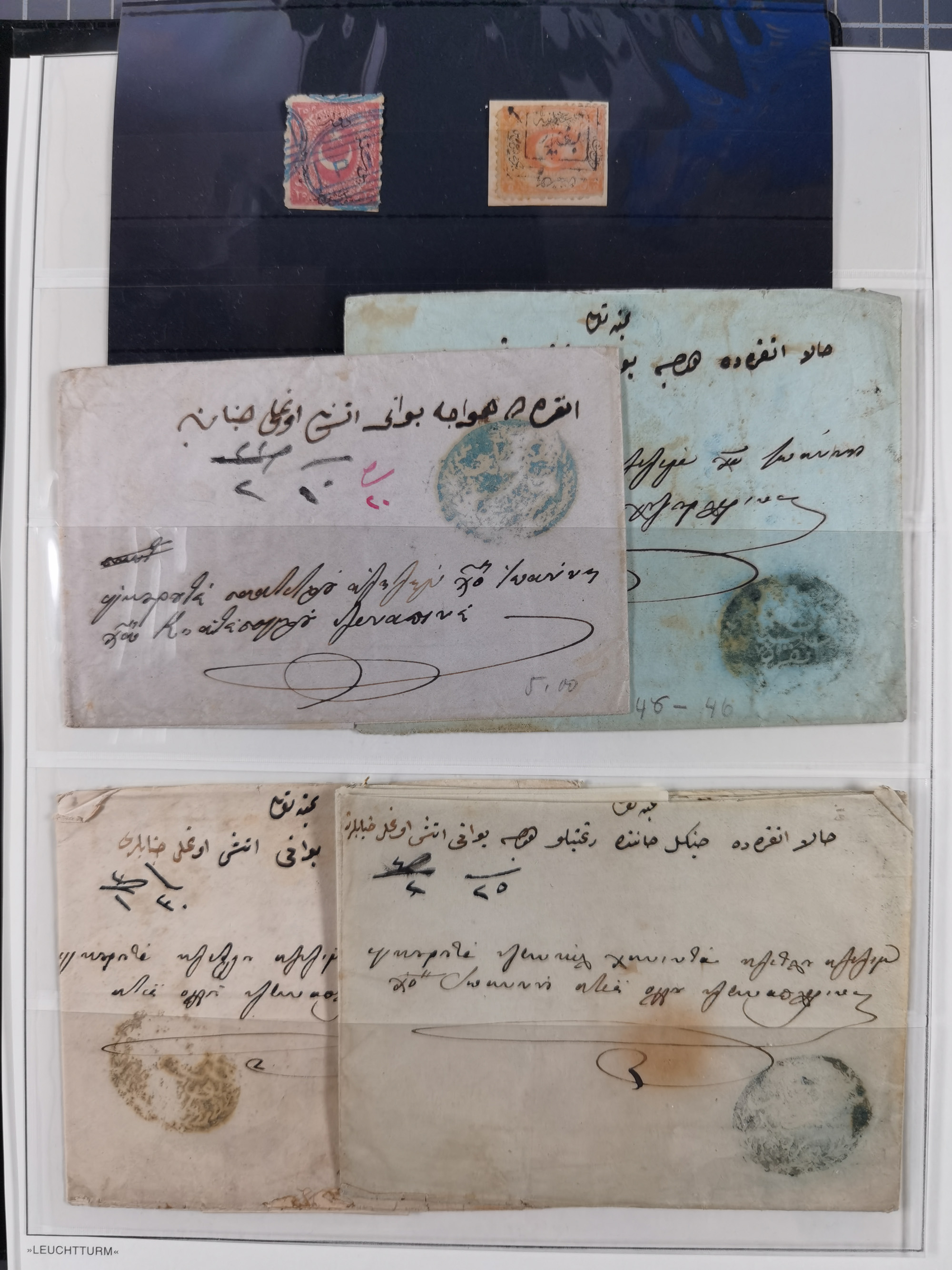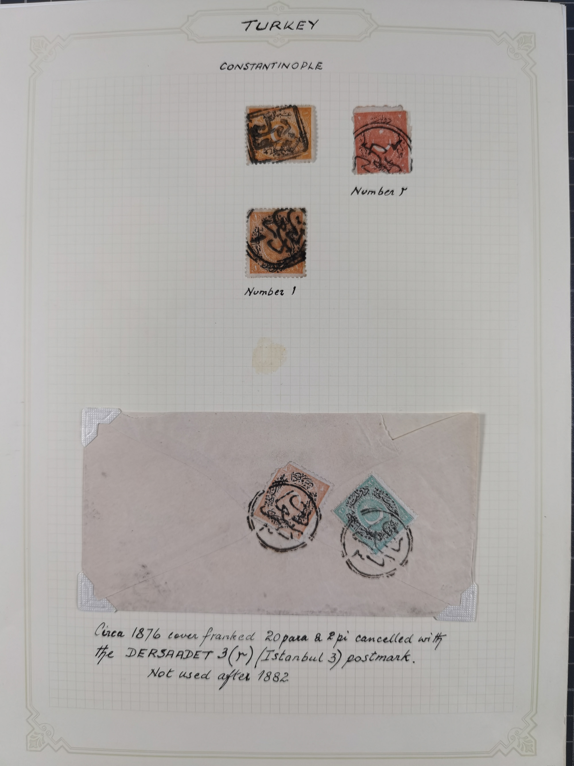 1840/1918, "ALL ARABIC CANCELLATIONS COLLECTION" on old selfmade album pages according to Brandt & Ceylan Types, starting pre-philatelic period with covers from Uskub, Konia, Bursa, Edirne and Ankara. Including 7 Duloz covers with cancellations of Nigde Posta Subesi 1287 (negativ type), Adana Turquie, Dersaadet 3 etc. and 25 pia. single stamps cancelled Bagdad 1865 and P.I.O. 1871, over 150 stamps with clear town cancellations, three postcards with arabic type cancellations of Eskishehir and Edirne Rüstem Pasha Hani, few different, but mainly fine.
