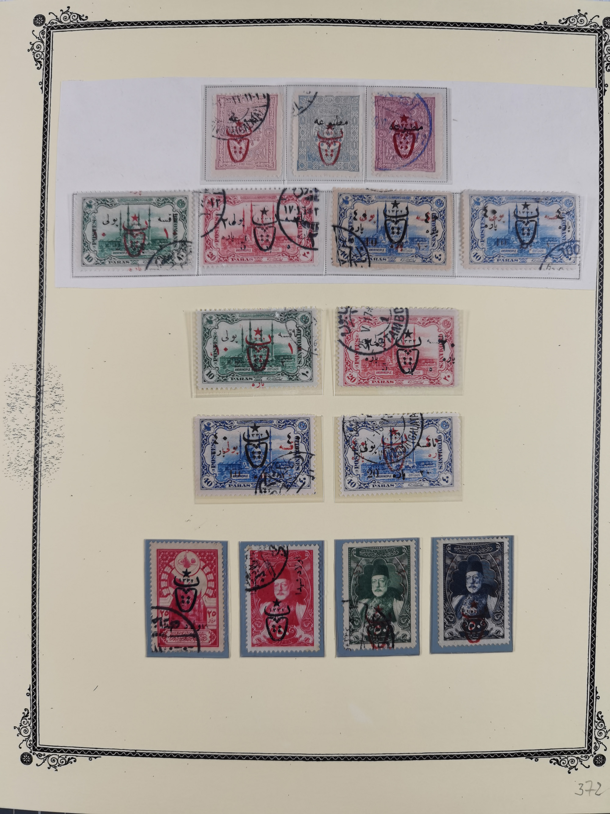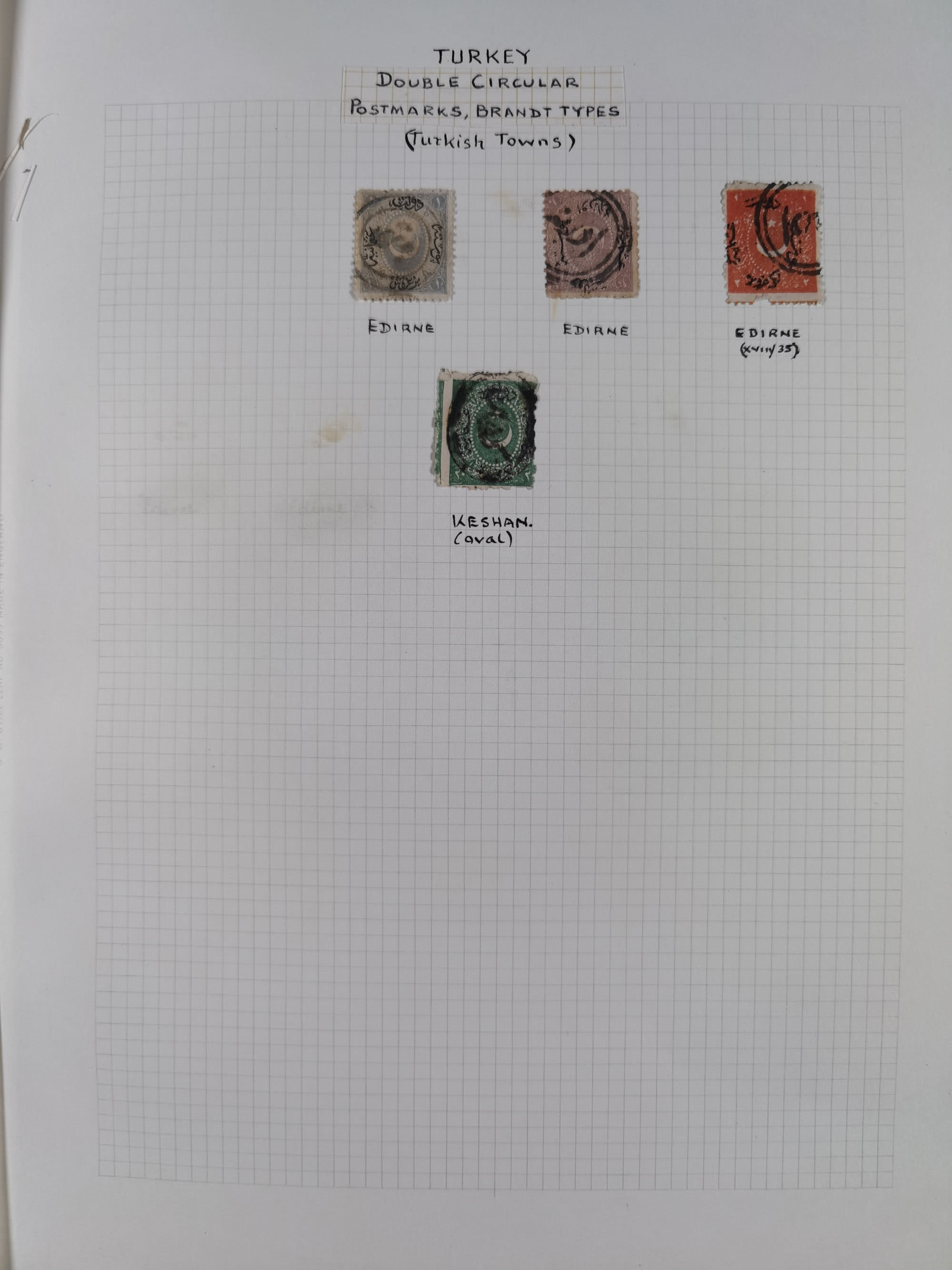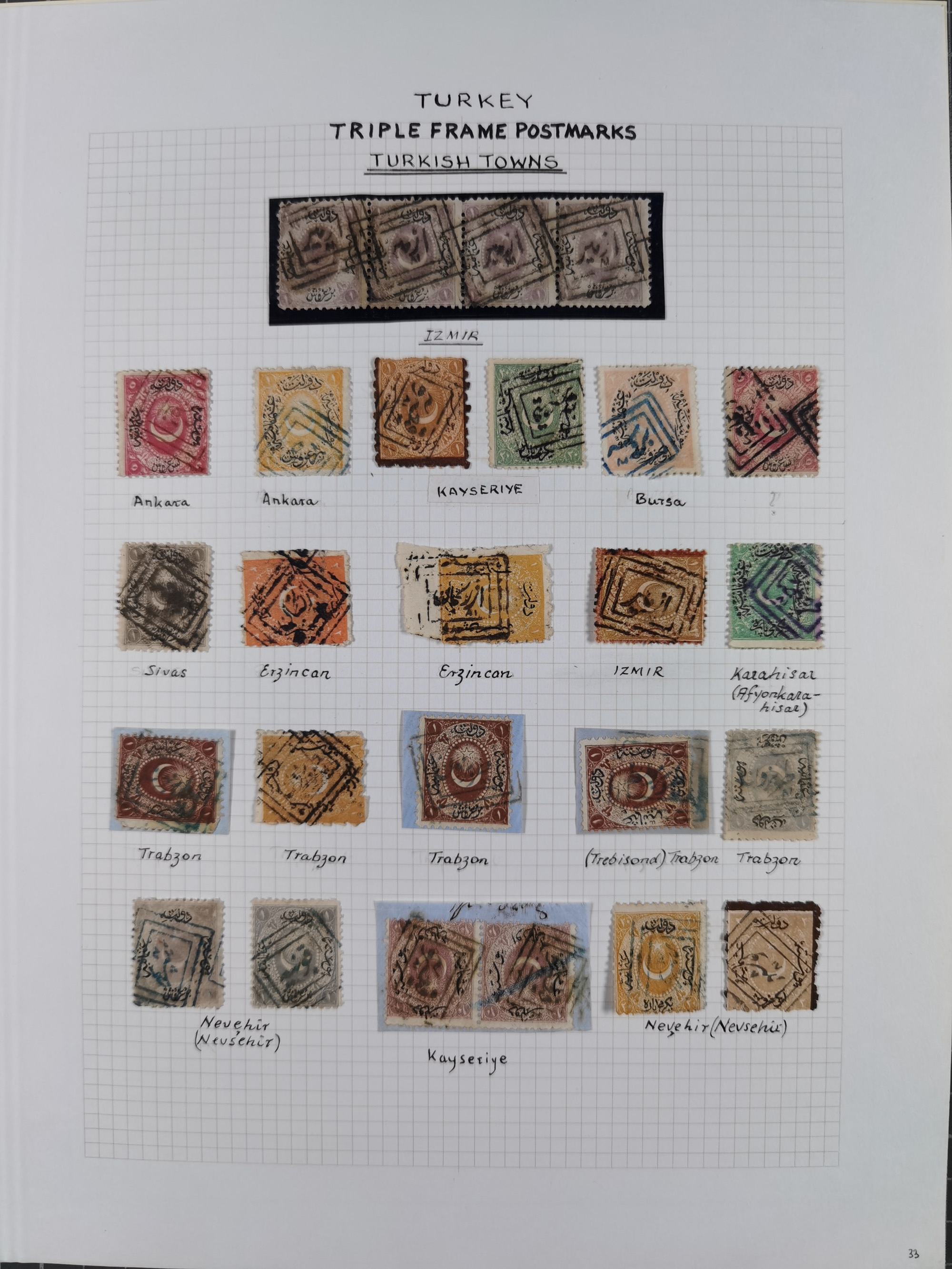1840/1918, "ALL ARABIC CANCELLATIONS COLLECTION" on old selfmade album pages according to Brandt & Ceylan Types, starting pre-philatelic period with covers from Uskub, Konia, Bursa, Edirne and Ankara. Including 7 Duloz covers with cancellations of Nigde Posta Subesi 1287 (negativ type), Adana Turquie, Dersaadet 3 etc. and 25 pia. single stamps cancelled Bagdad 1865 and P.I.O. 1871, over 150 stamps with clear town cancellations, three postcards with arabic type cancellations of Eskishehir and Edirne Rüstem Pasha Hani, few different, but mainly fine.
